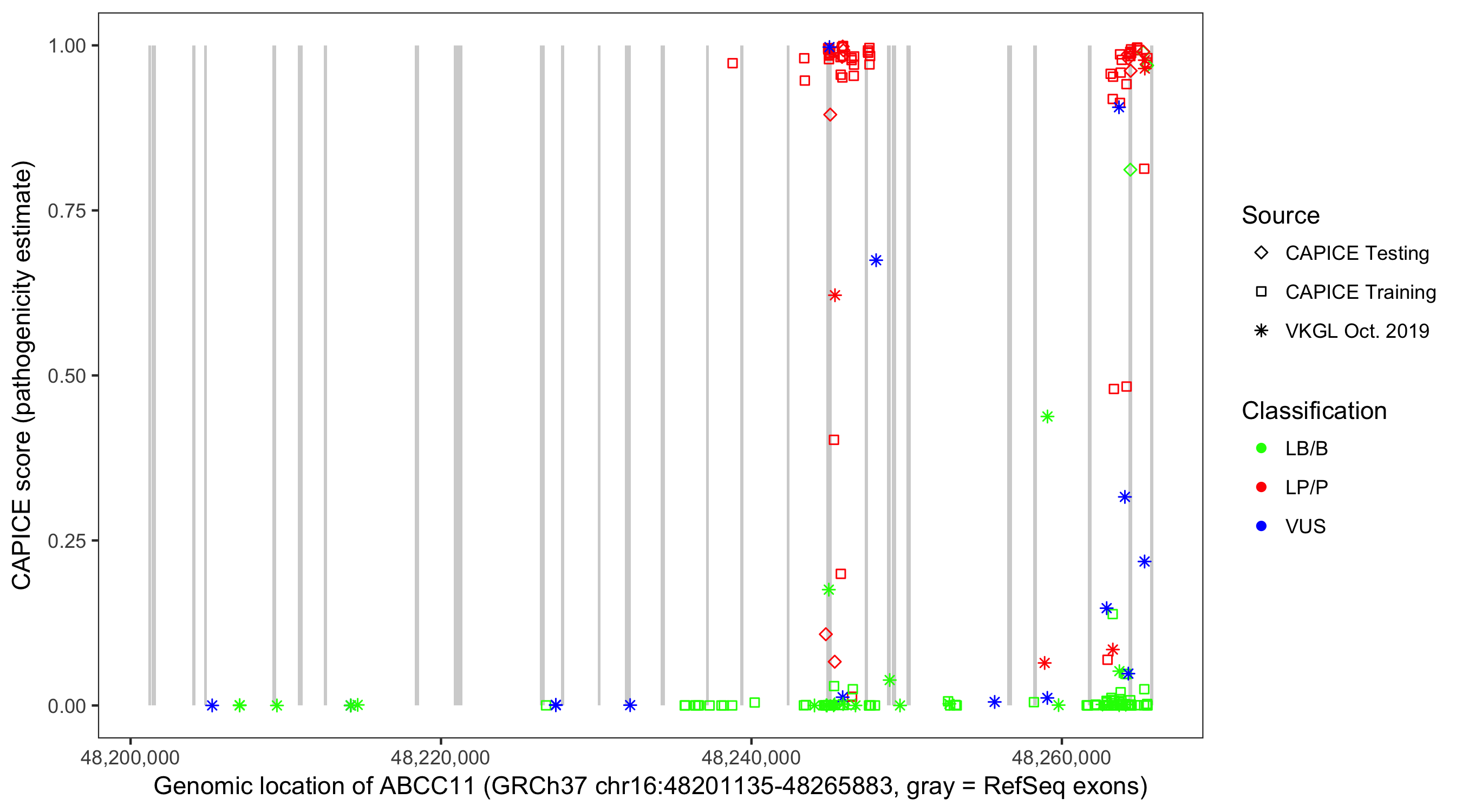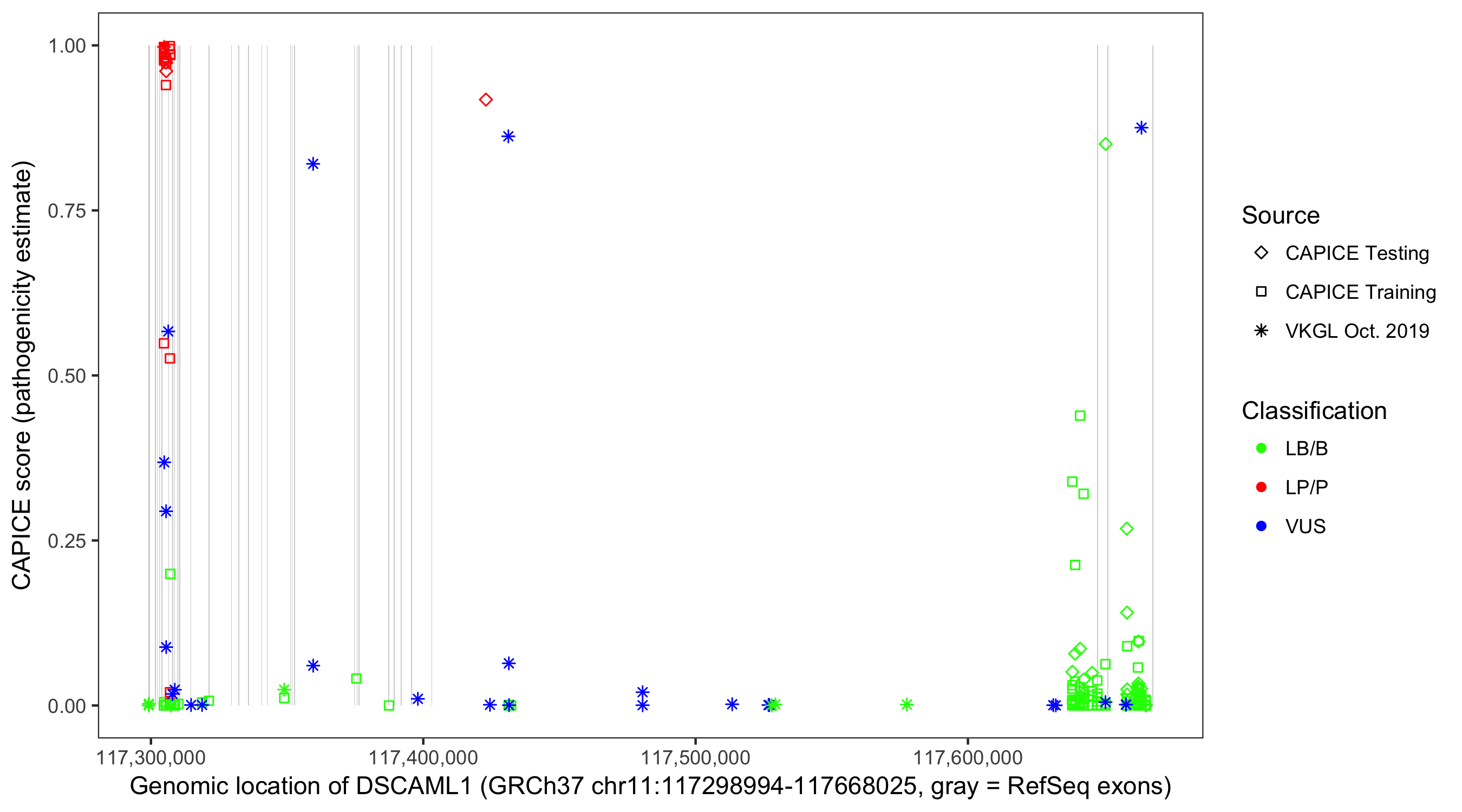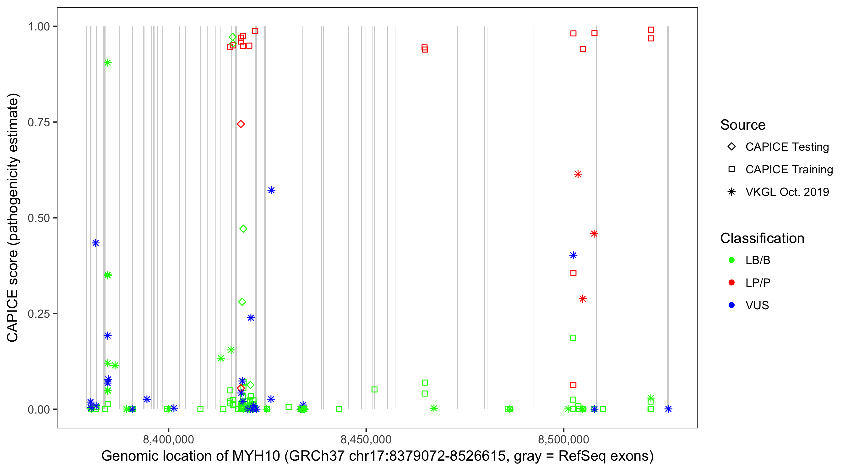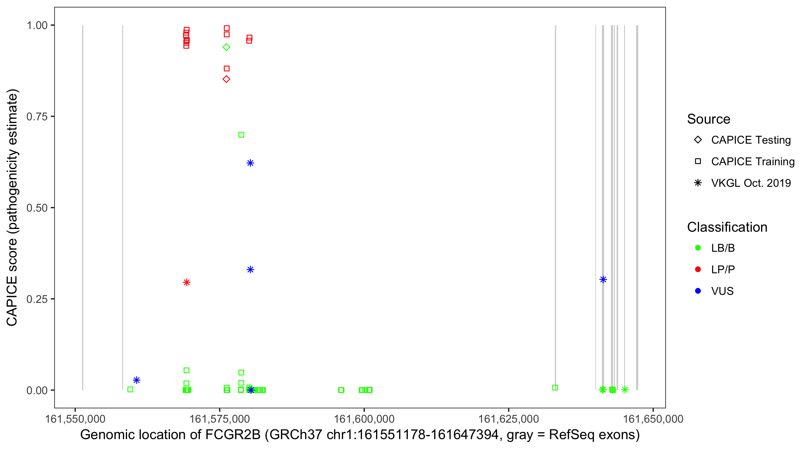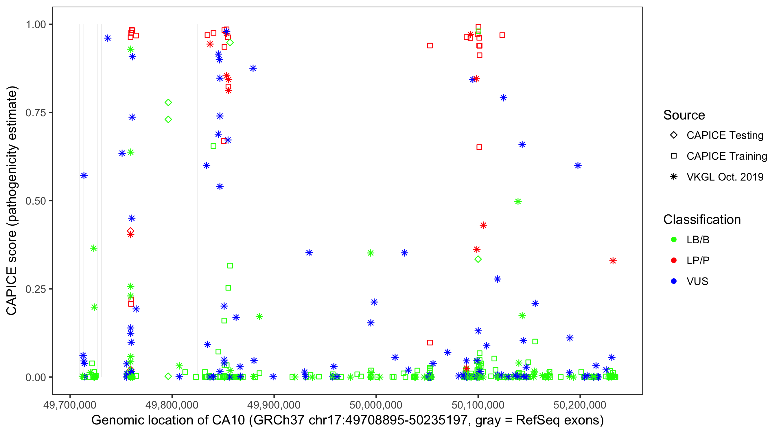 Shown are CAPICE train/test variants plus VKGL Oct 2019.