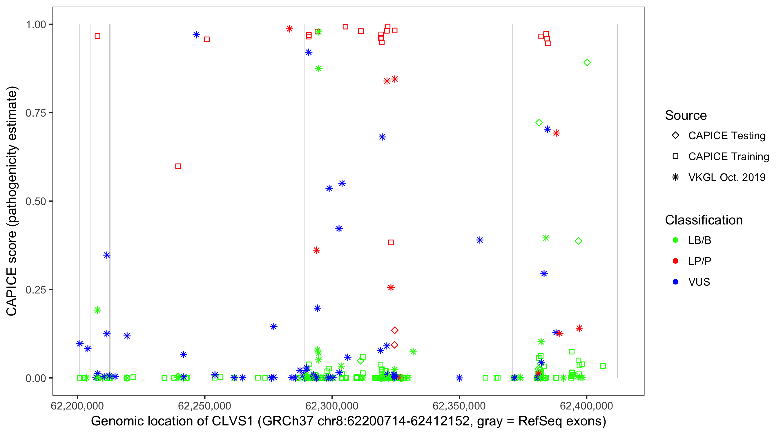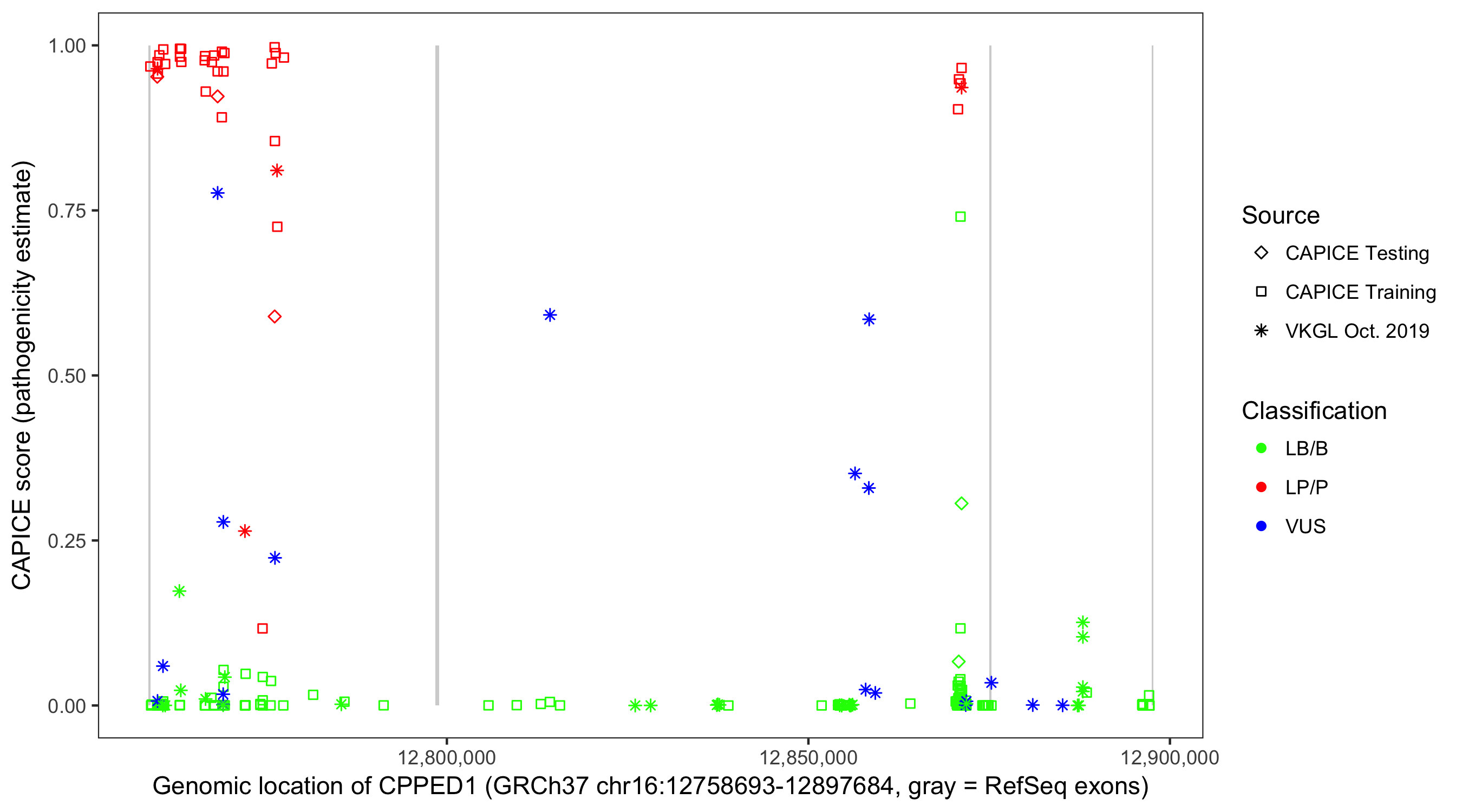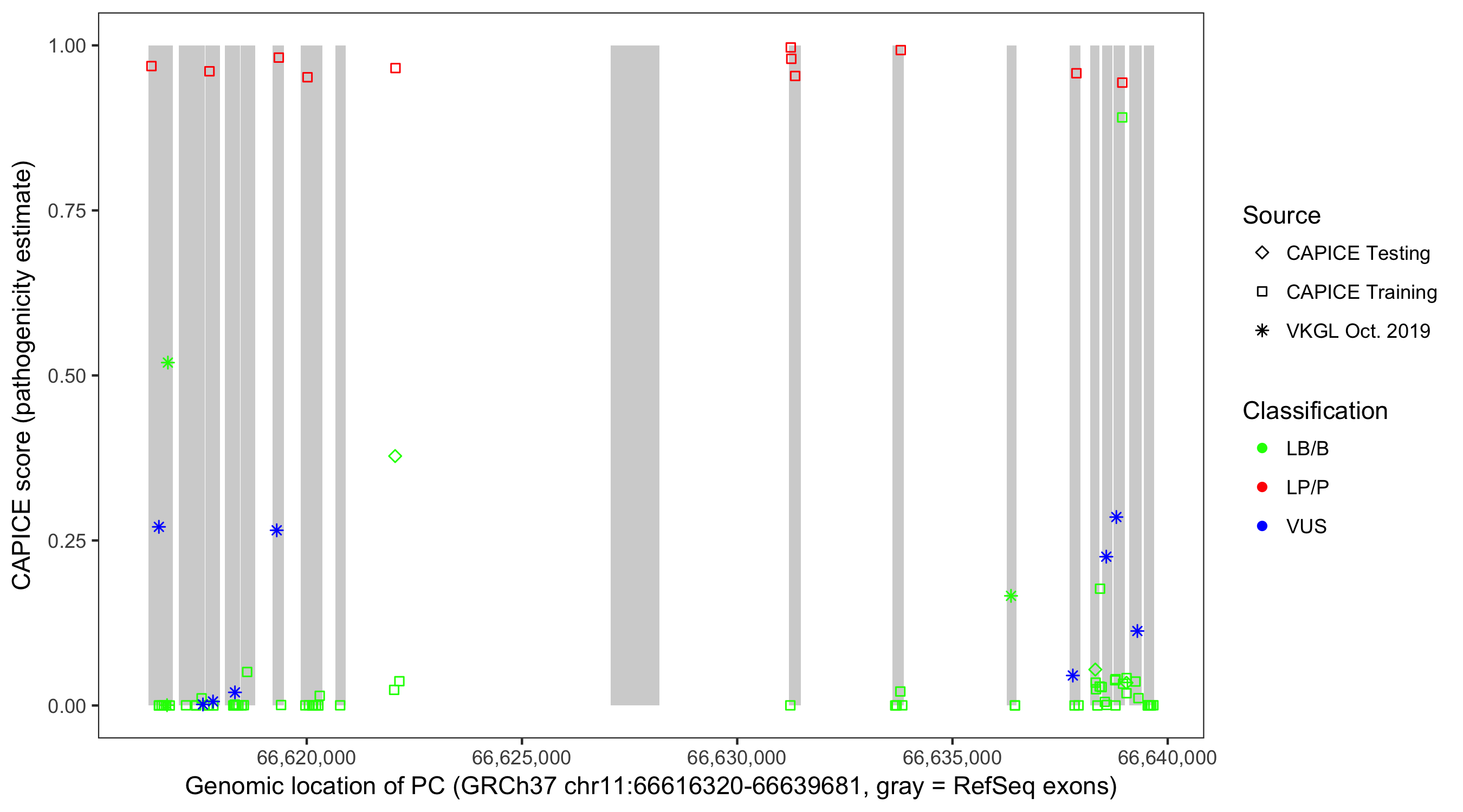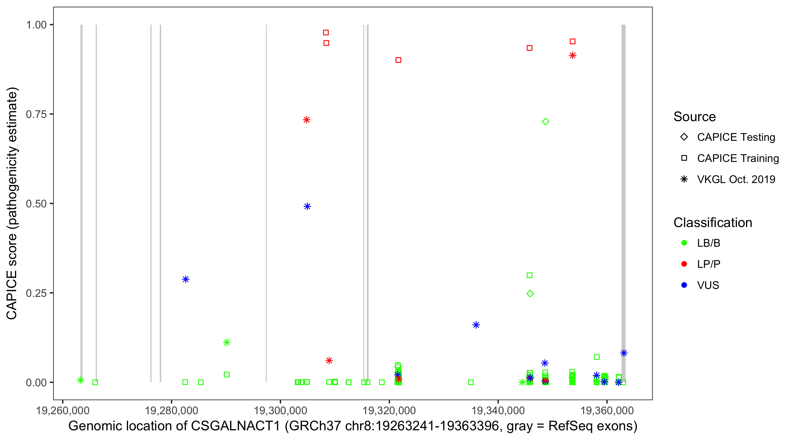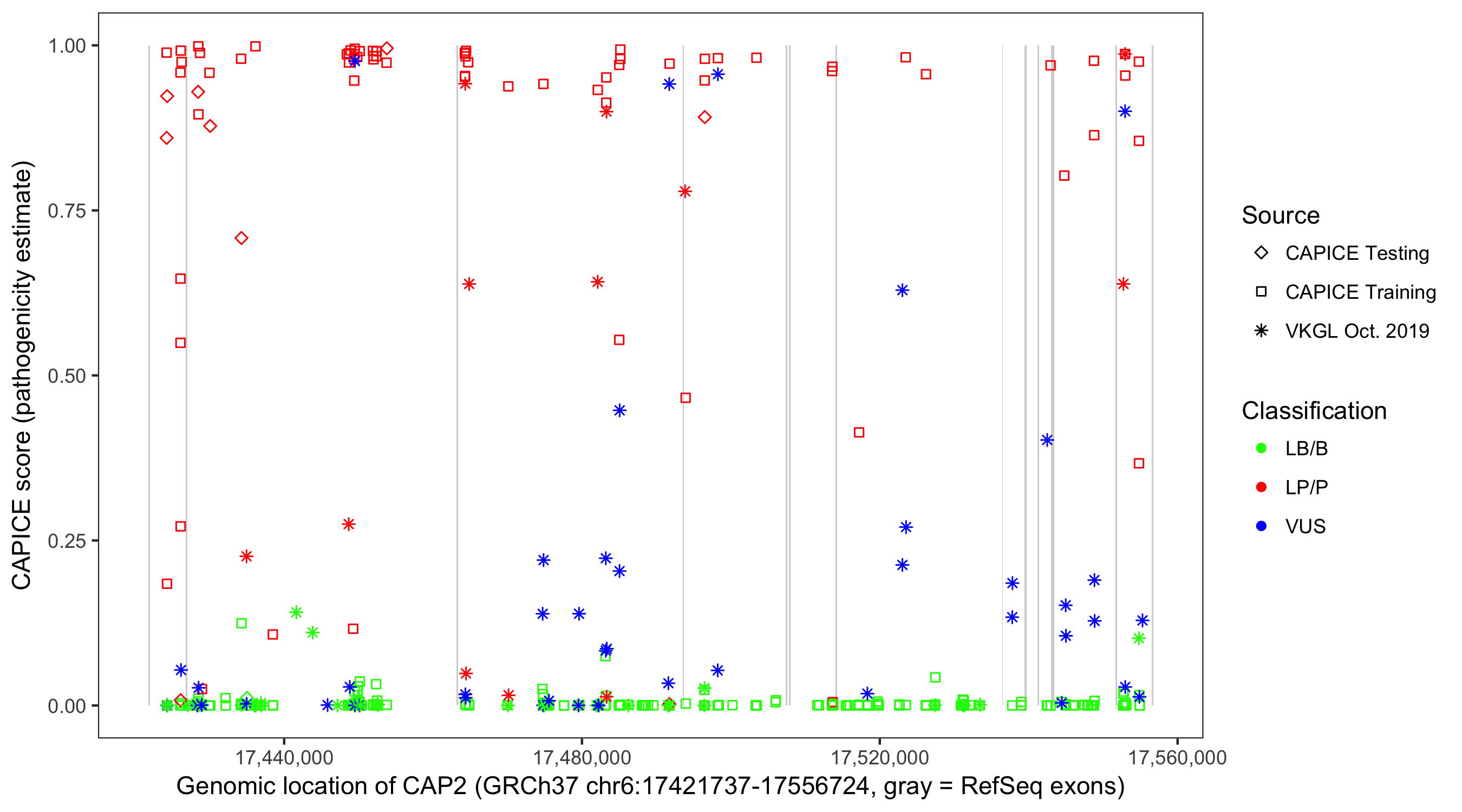 Shown are CAPICE train/test variants plus VKGL Oct 2019.