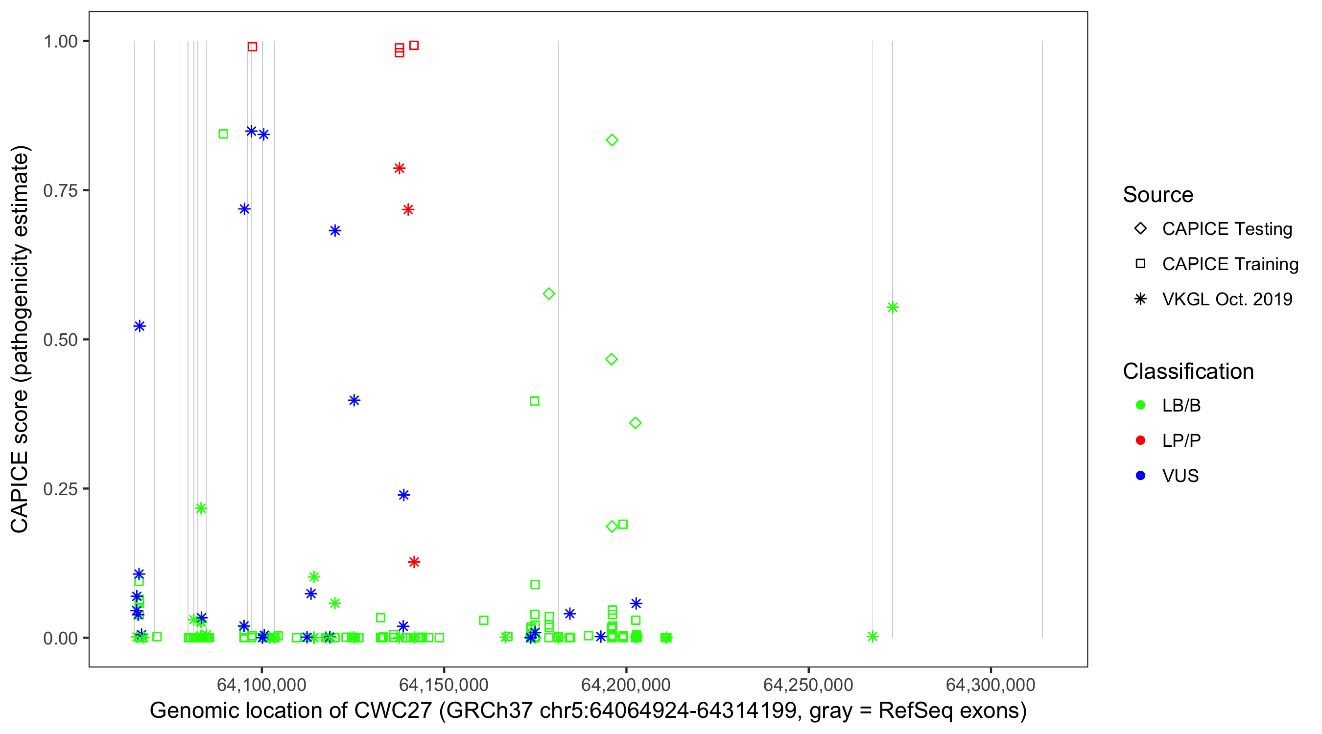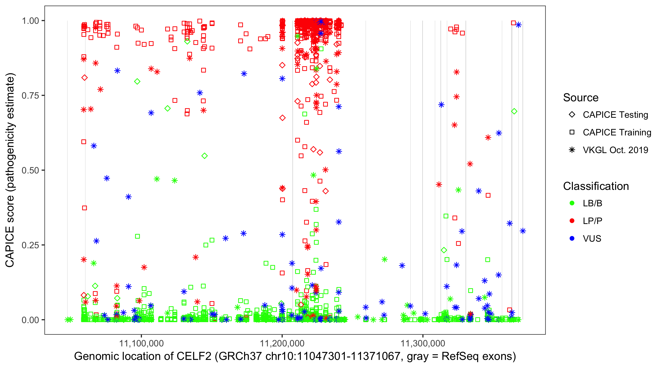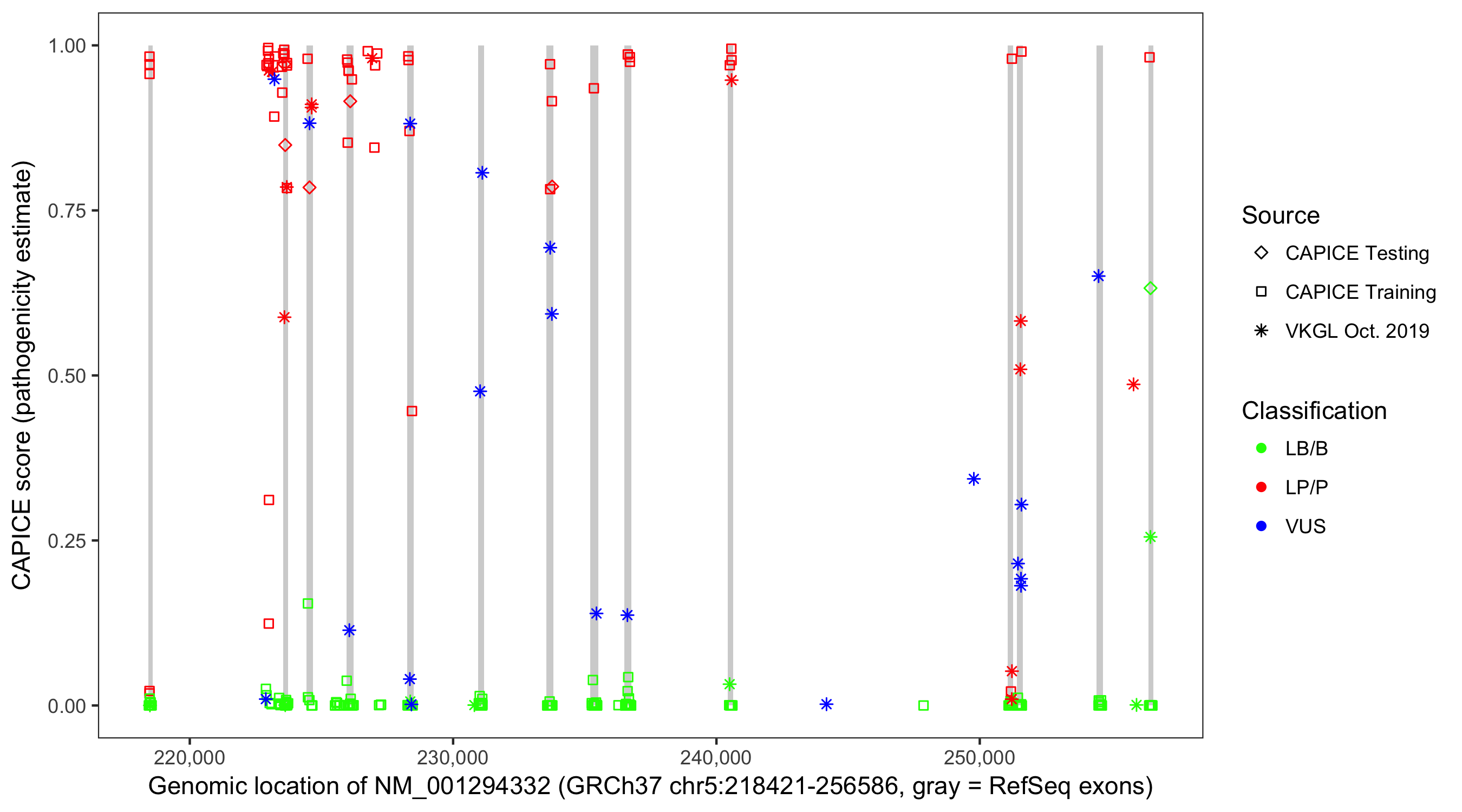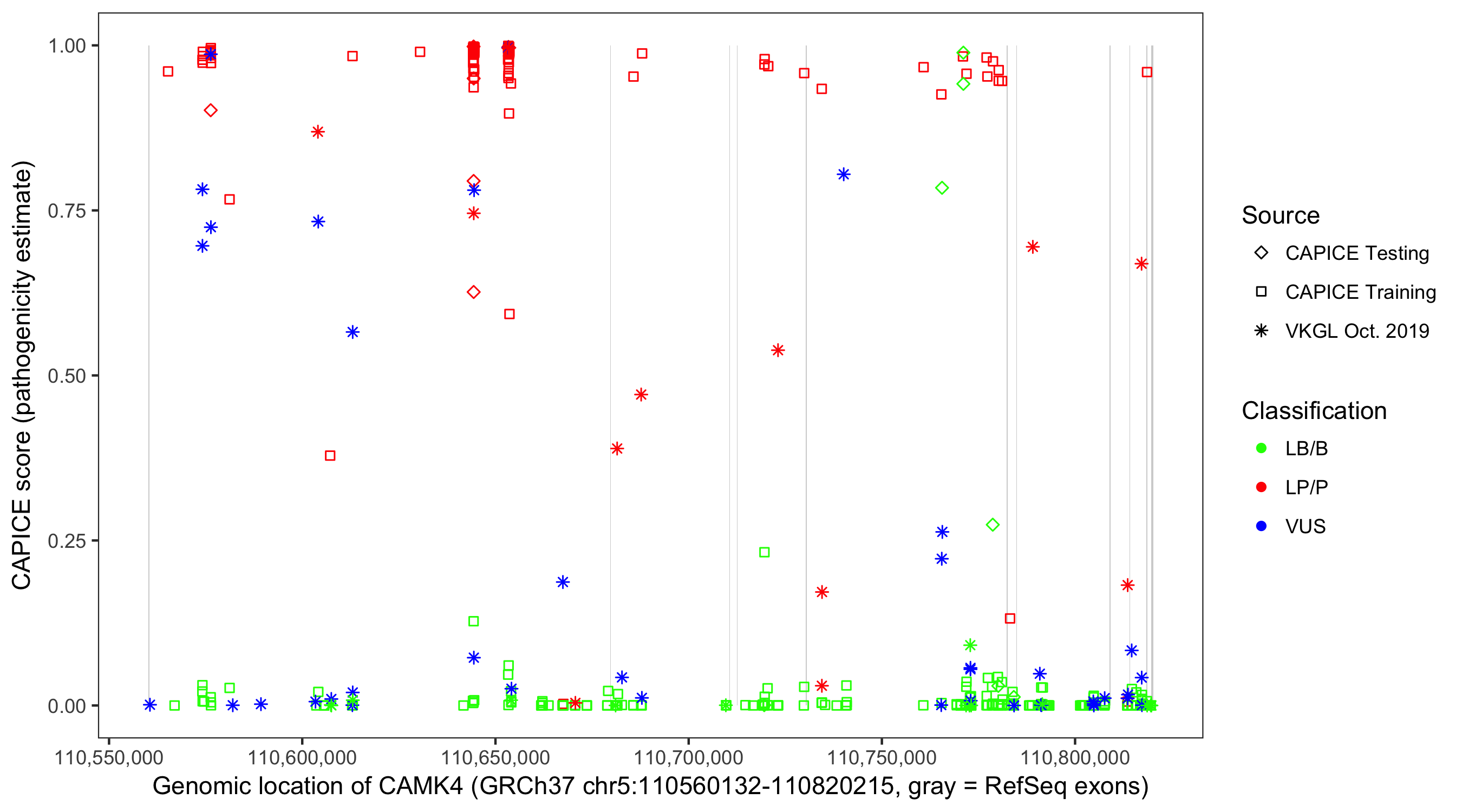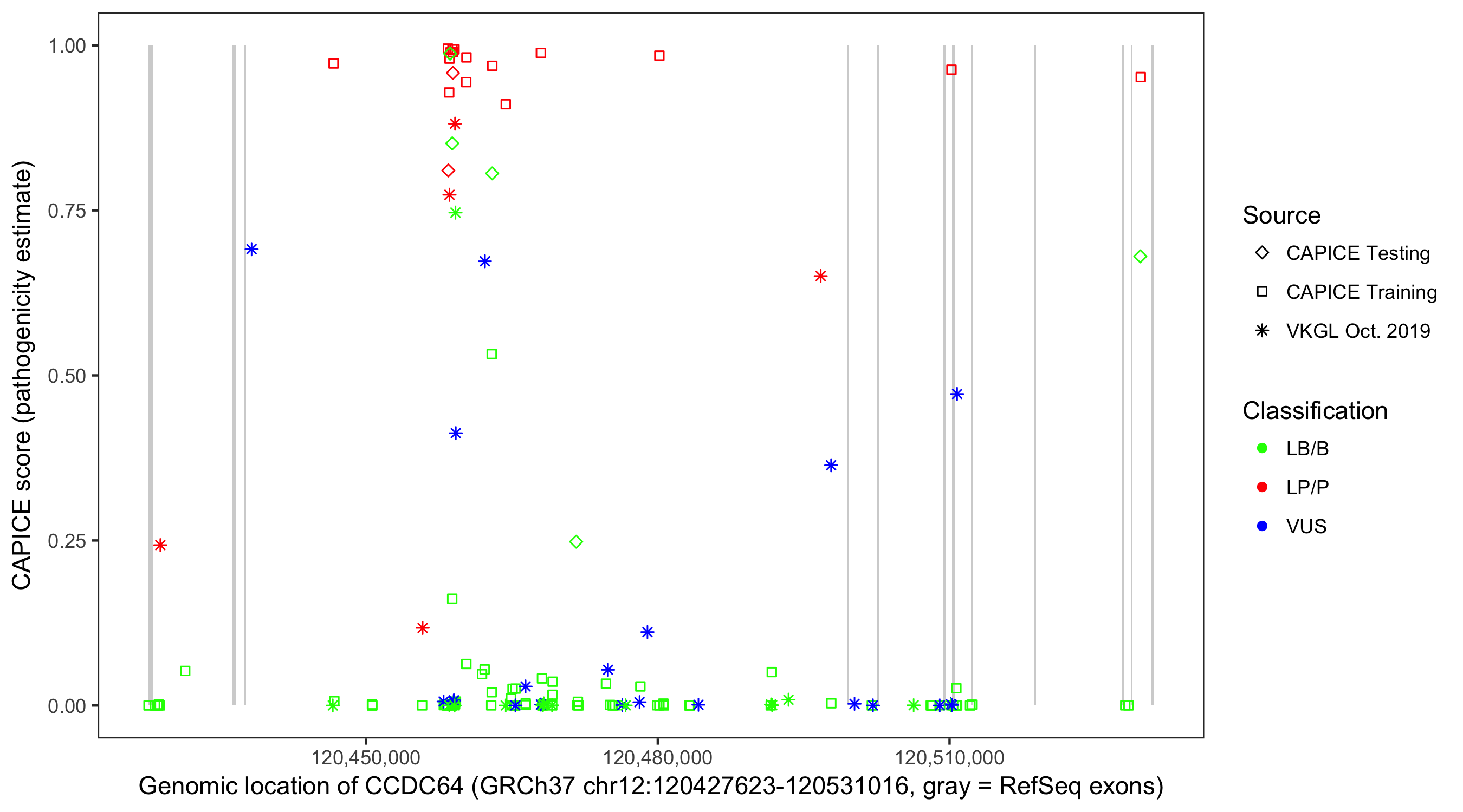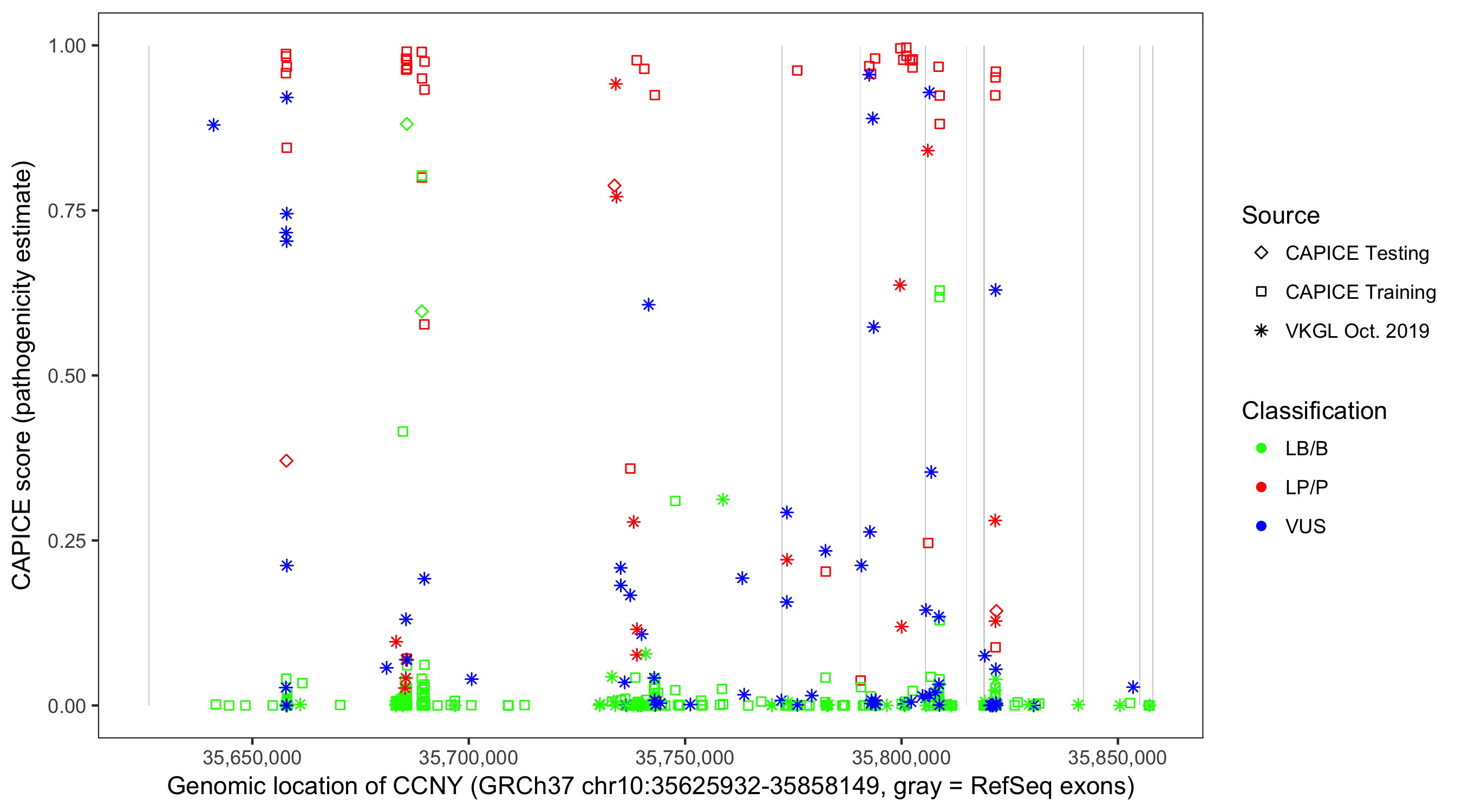 Shown are CAPICE train/test variants plus VKGL Oct 2019.