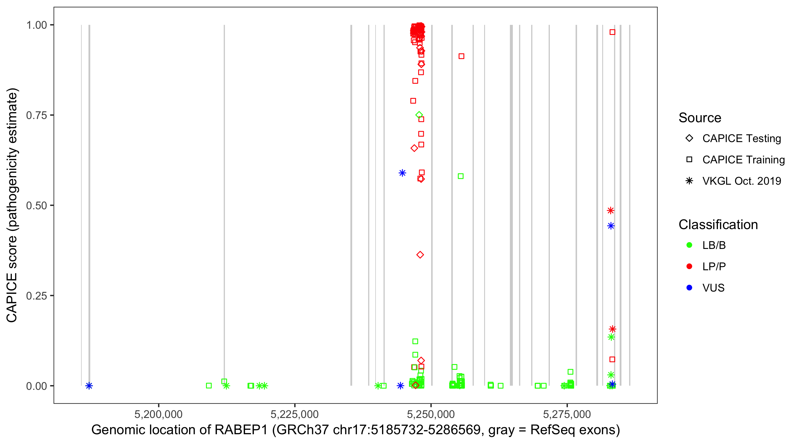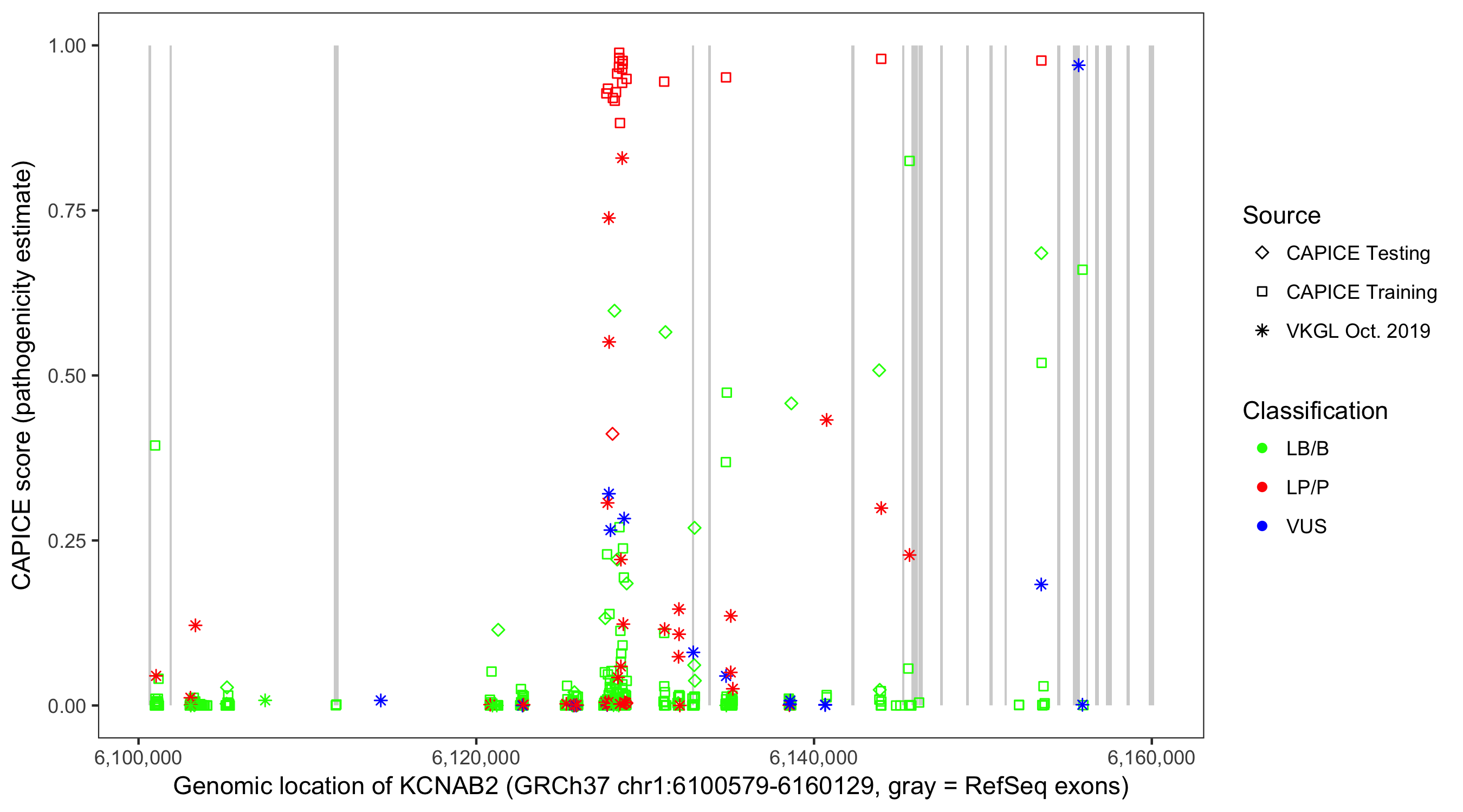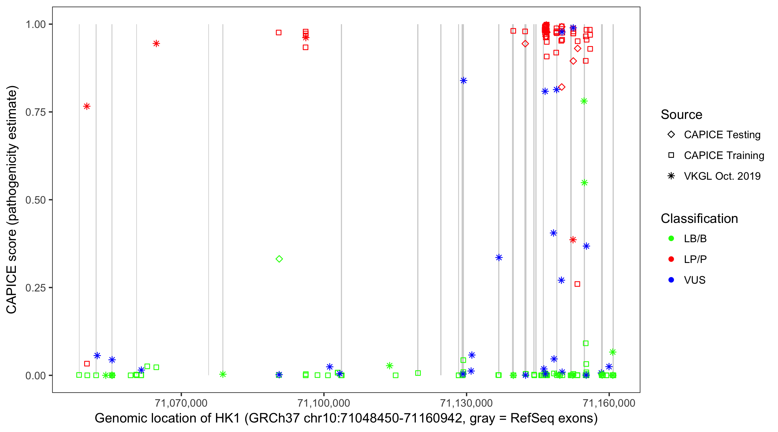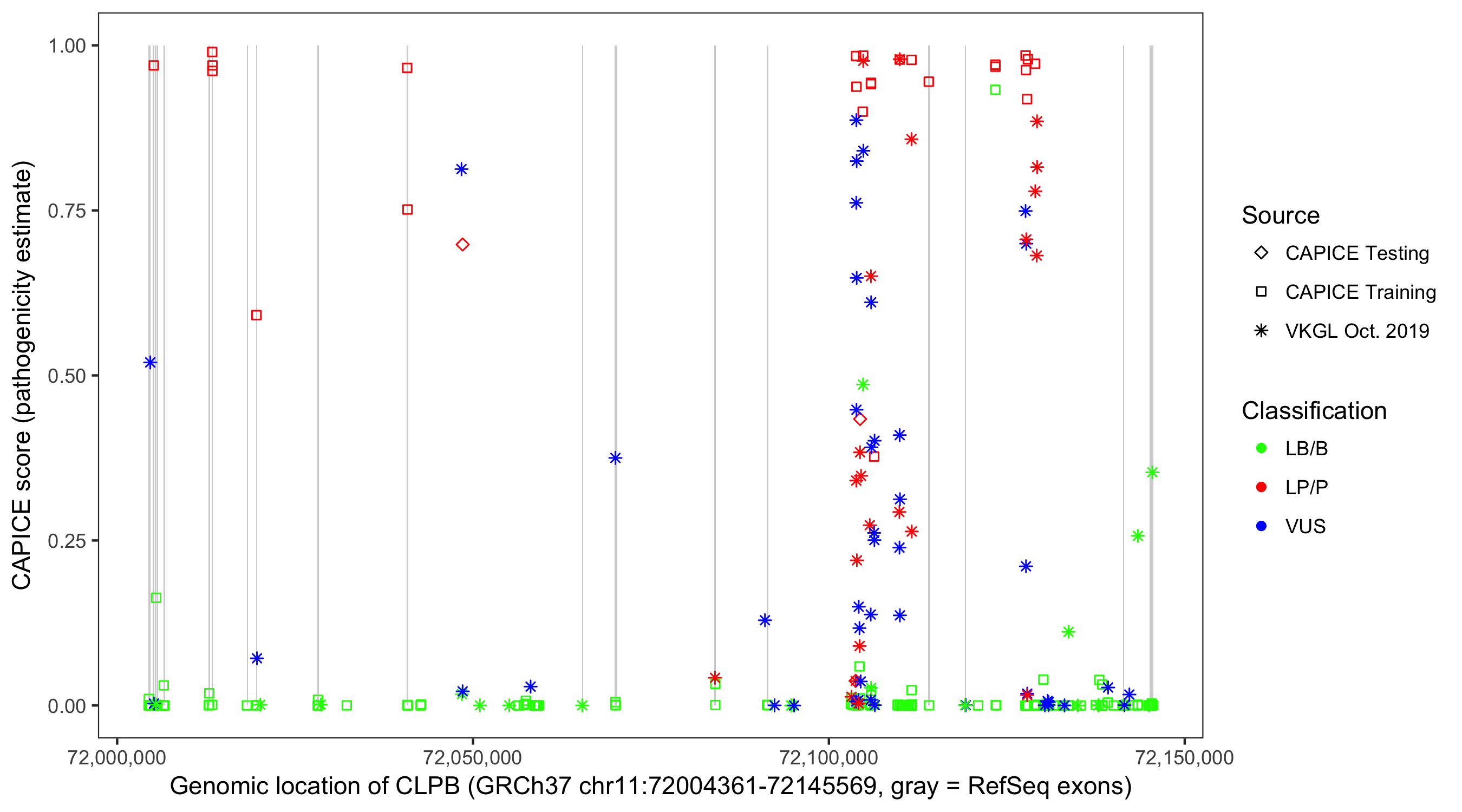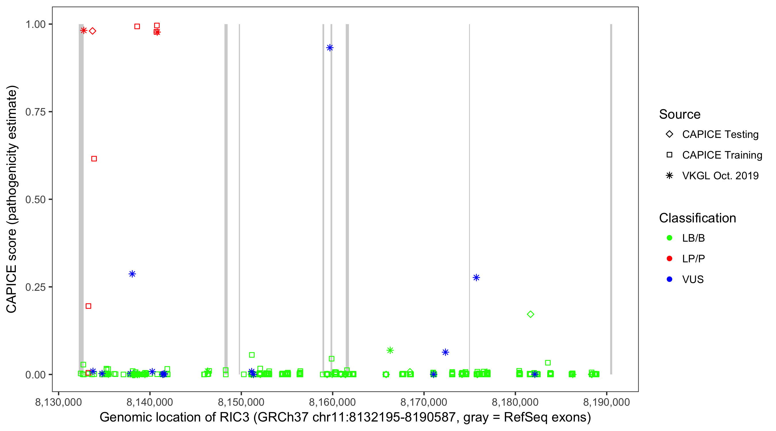 Shown are CAPICE train/test variants plus VKGL Oct 2019.