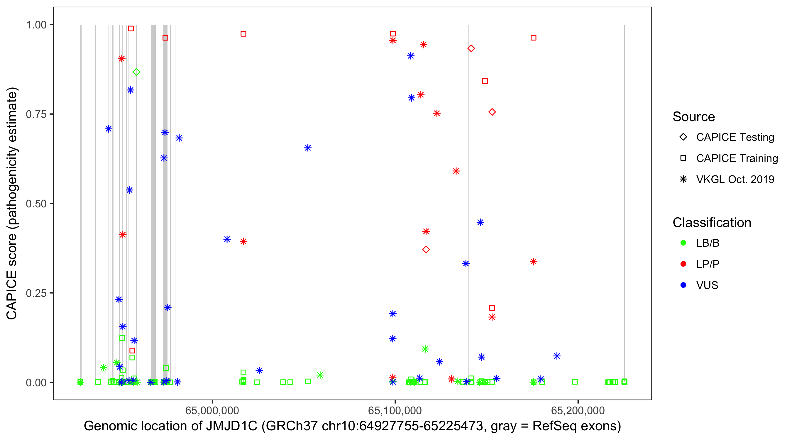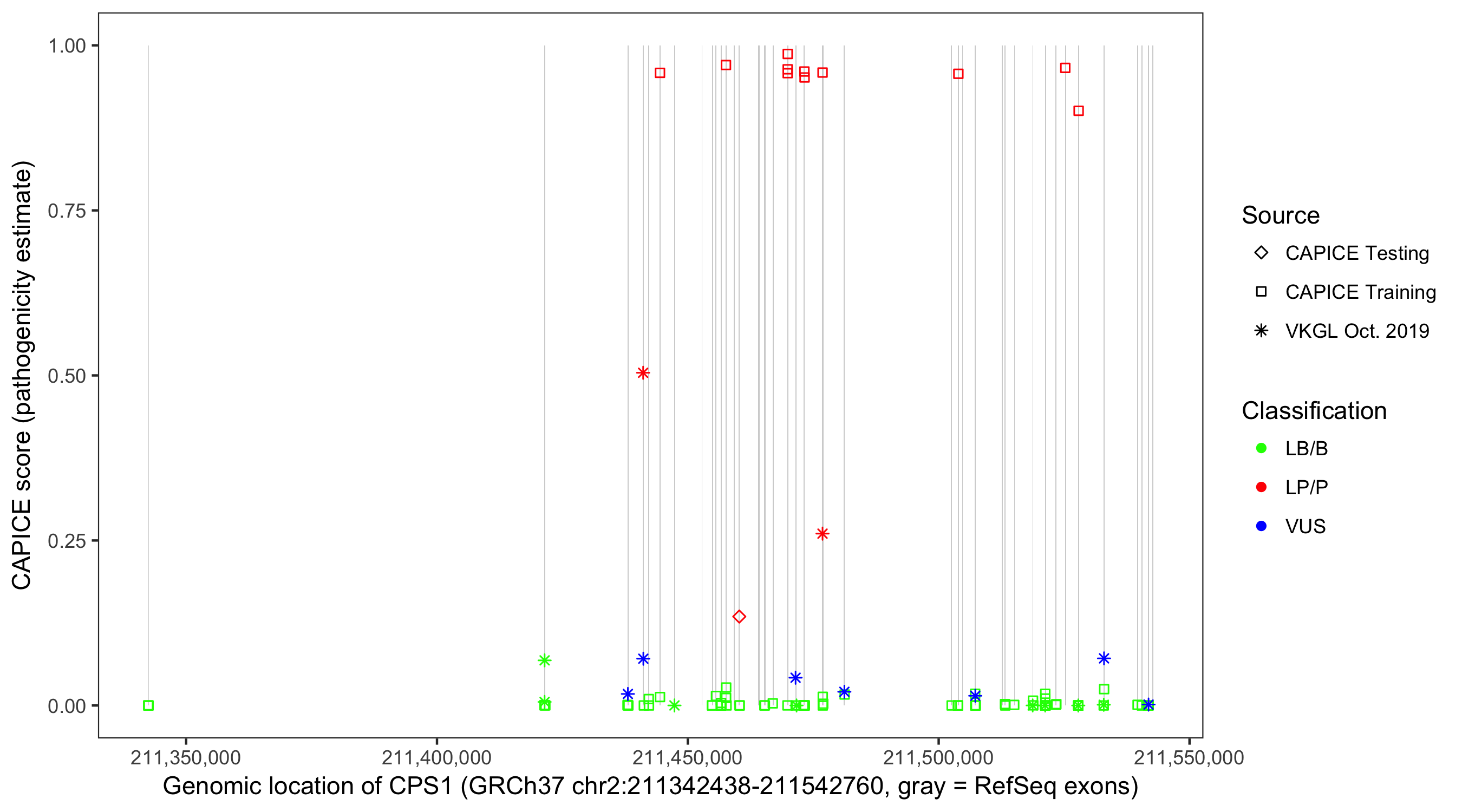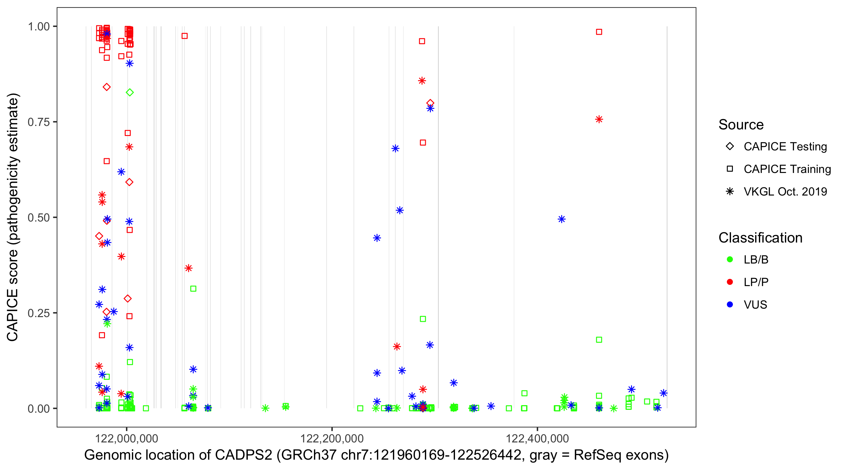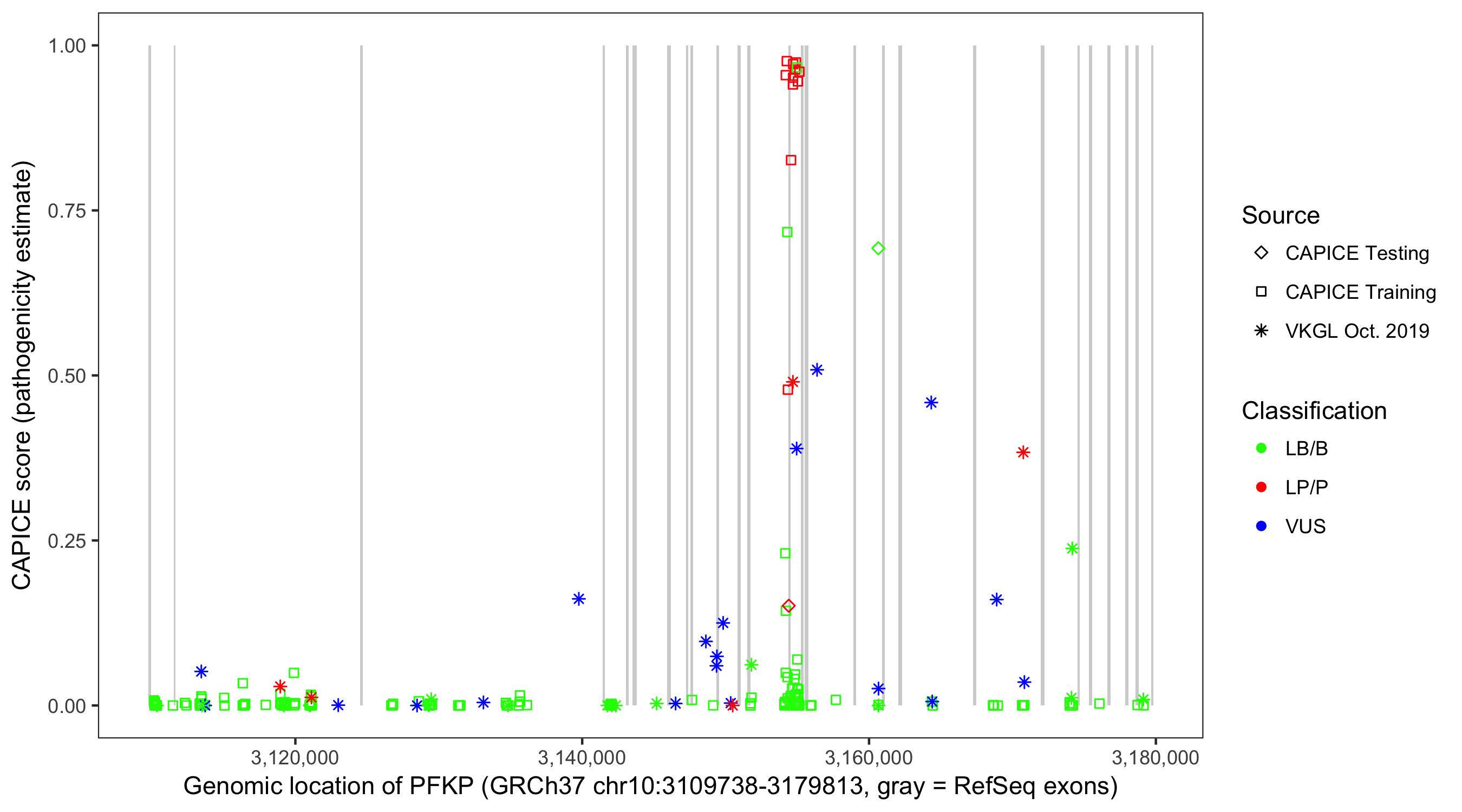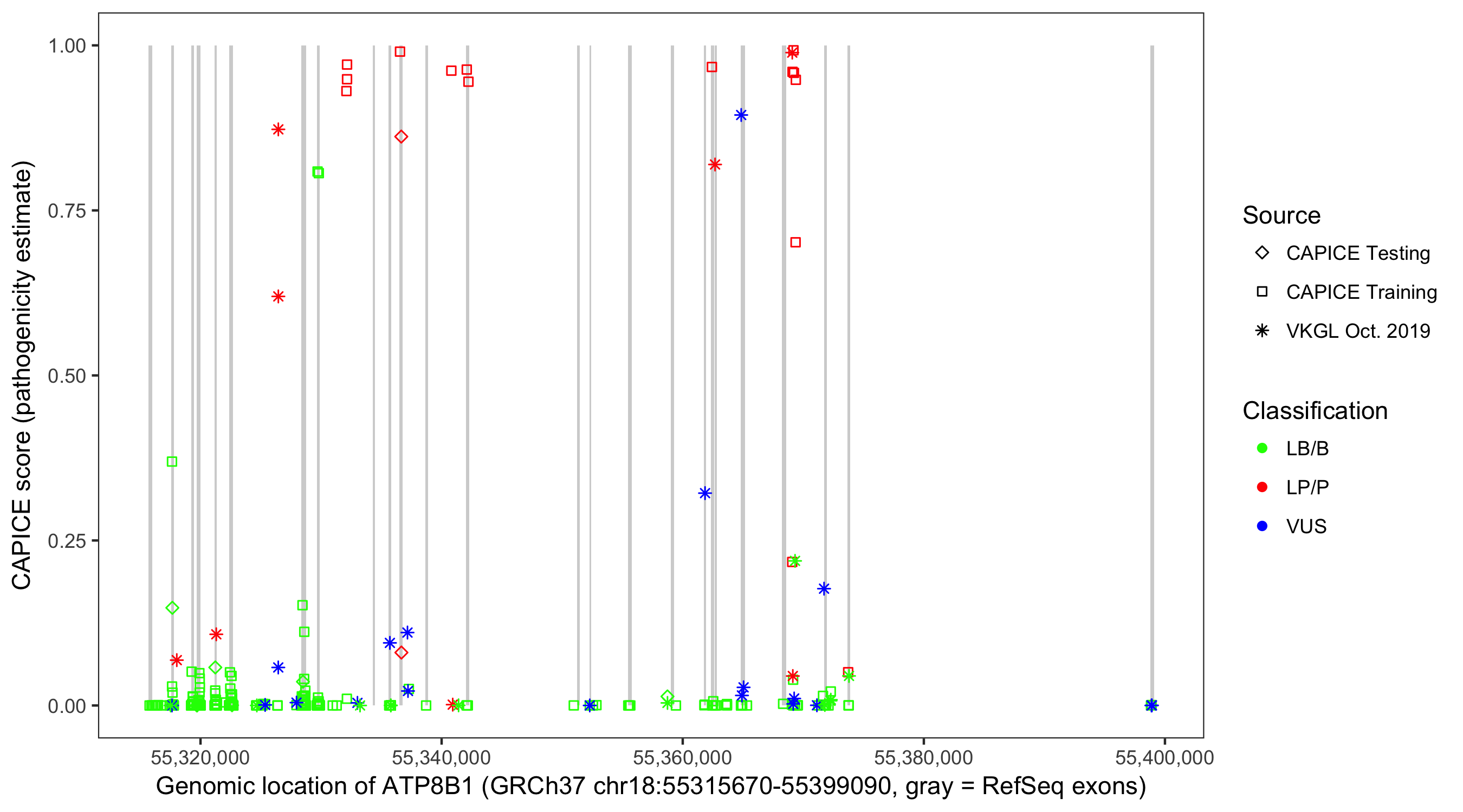 Shown are CAPICE train/test variants plus VKGL Oct 2019.