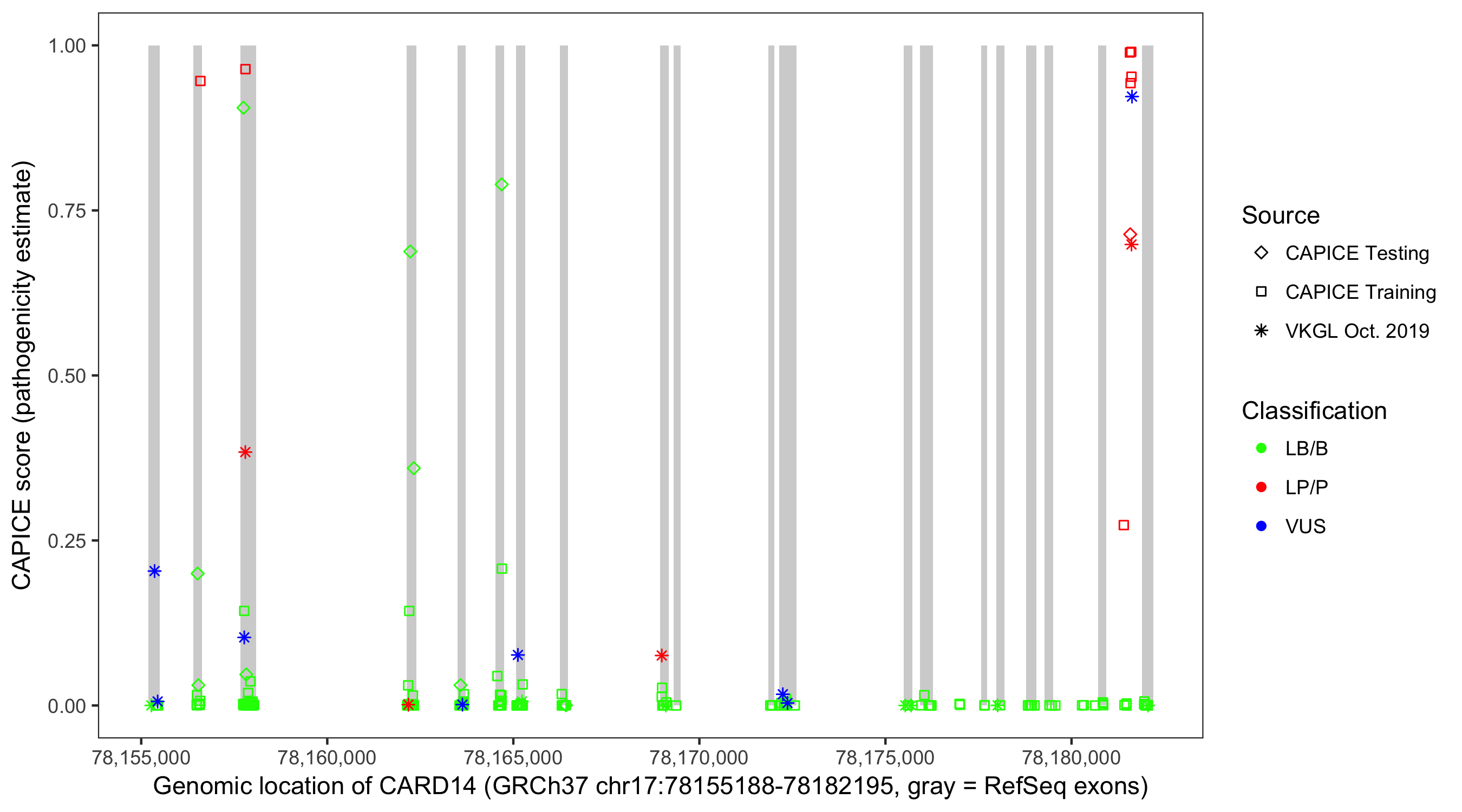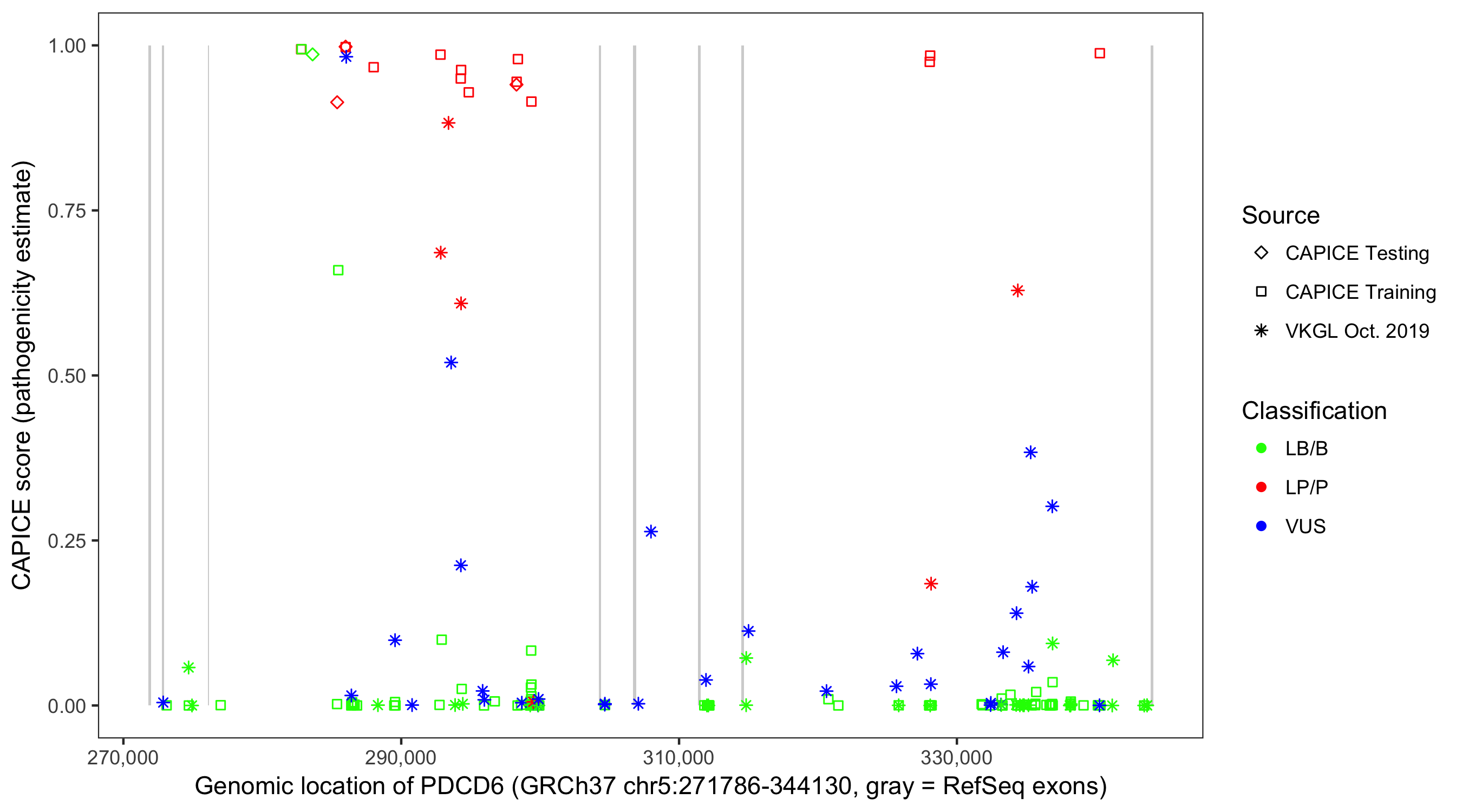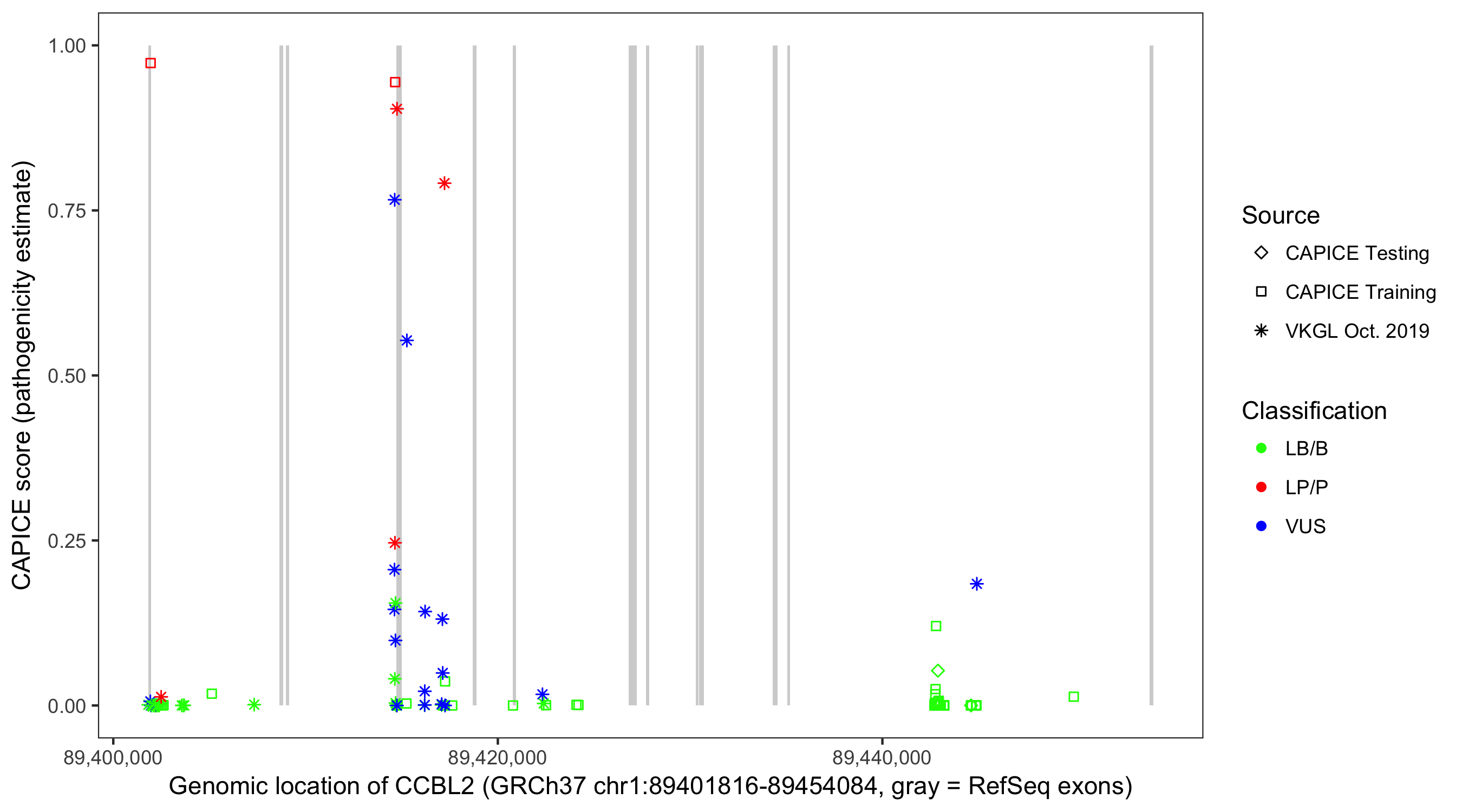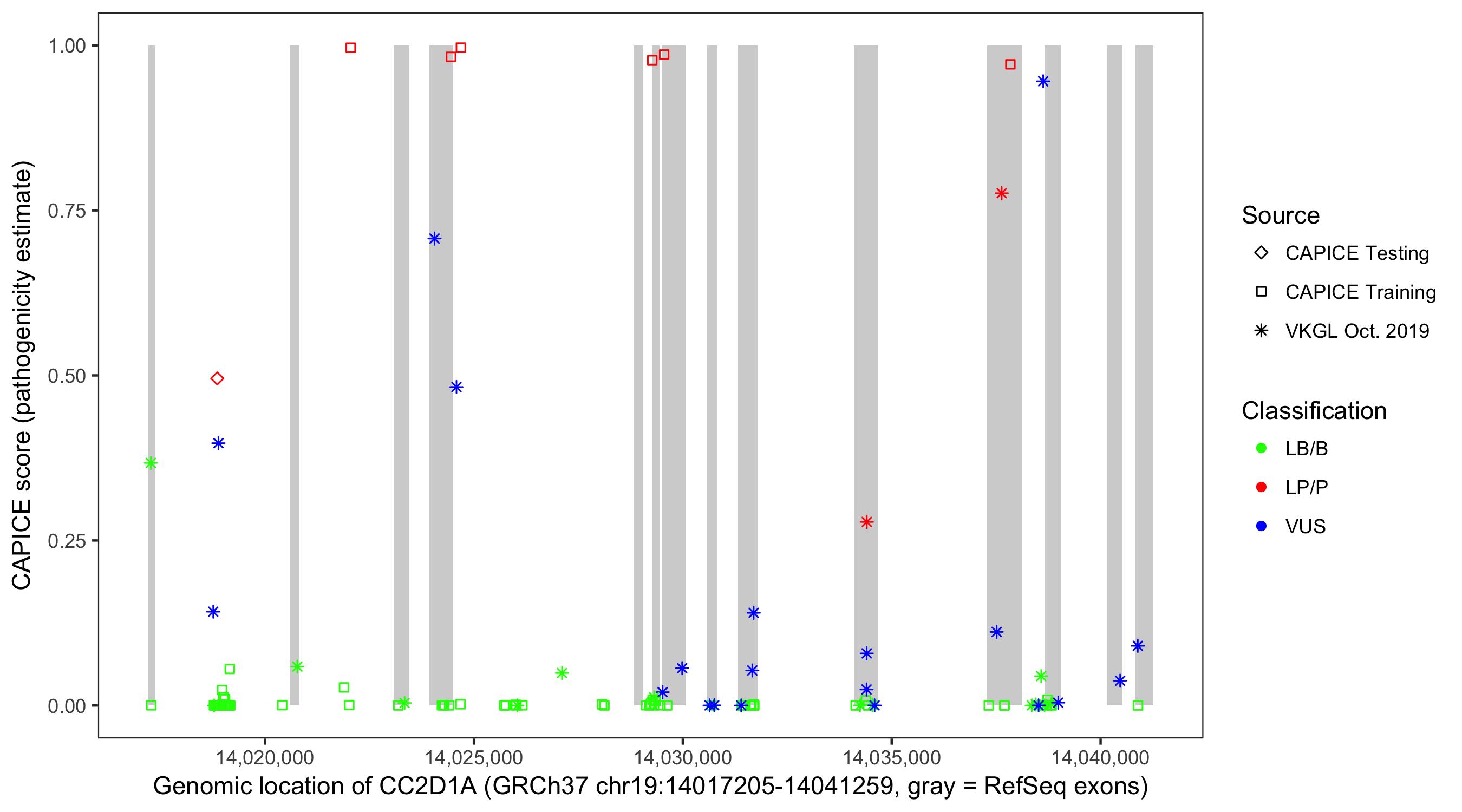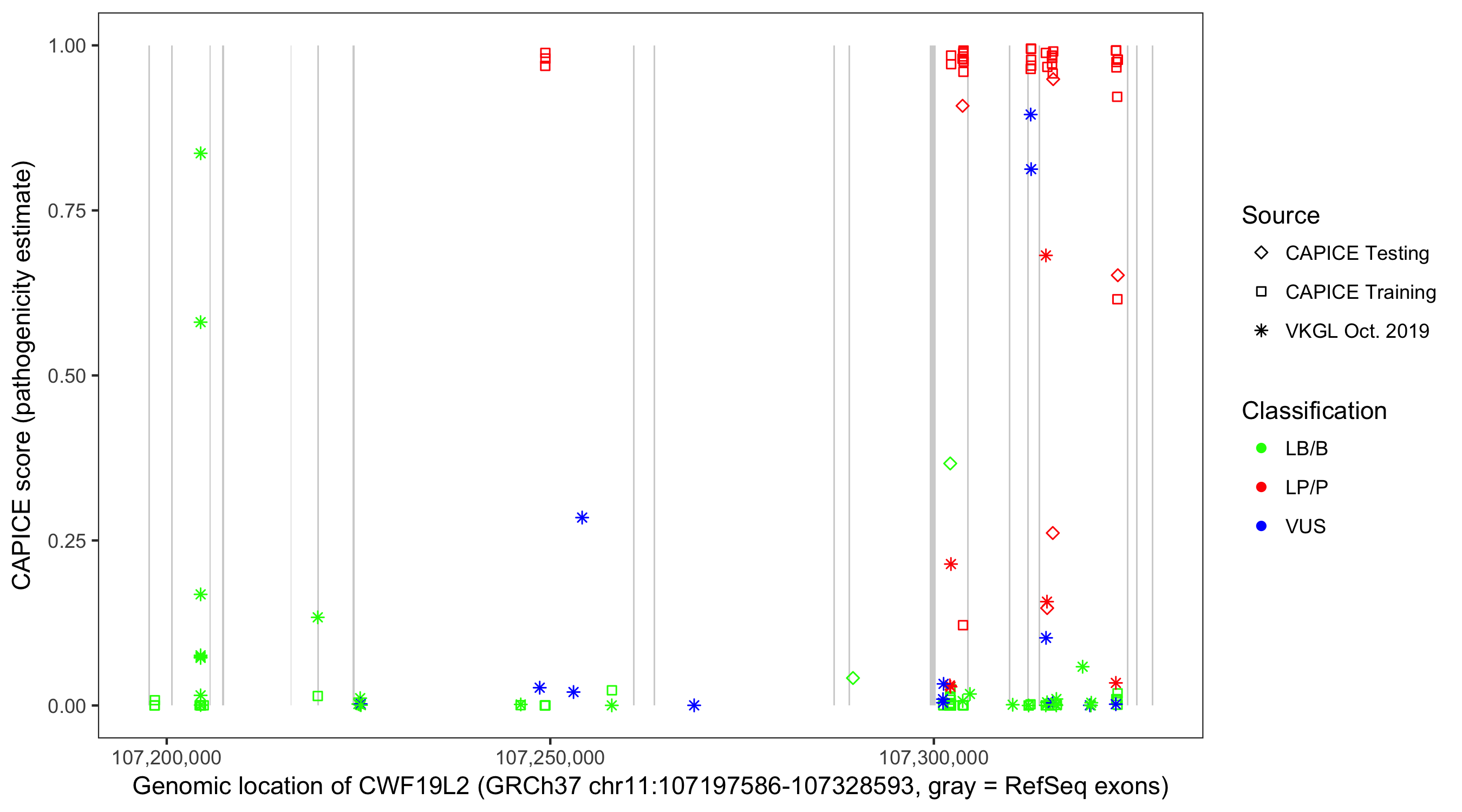 Shown are CAPICE train/test variants plus VKGL Oct 2019.