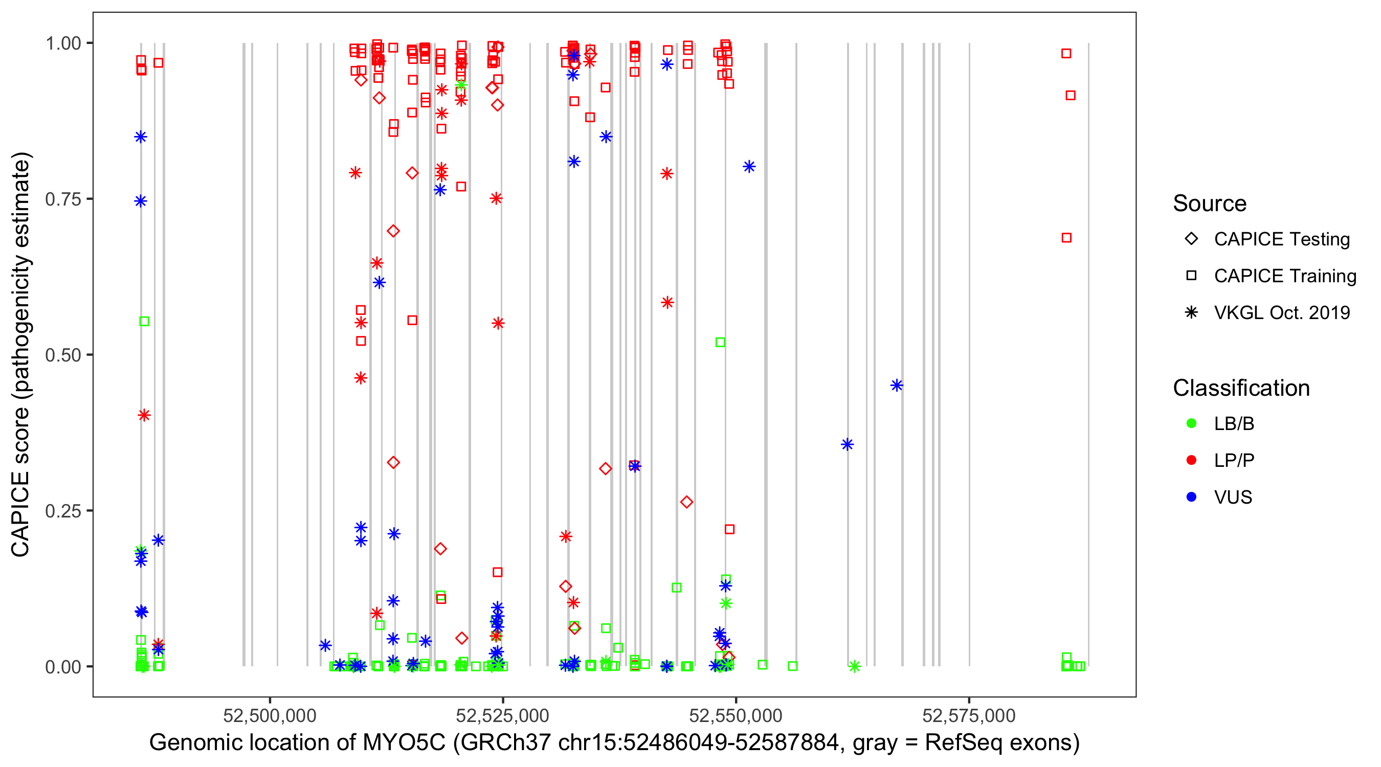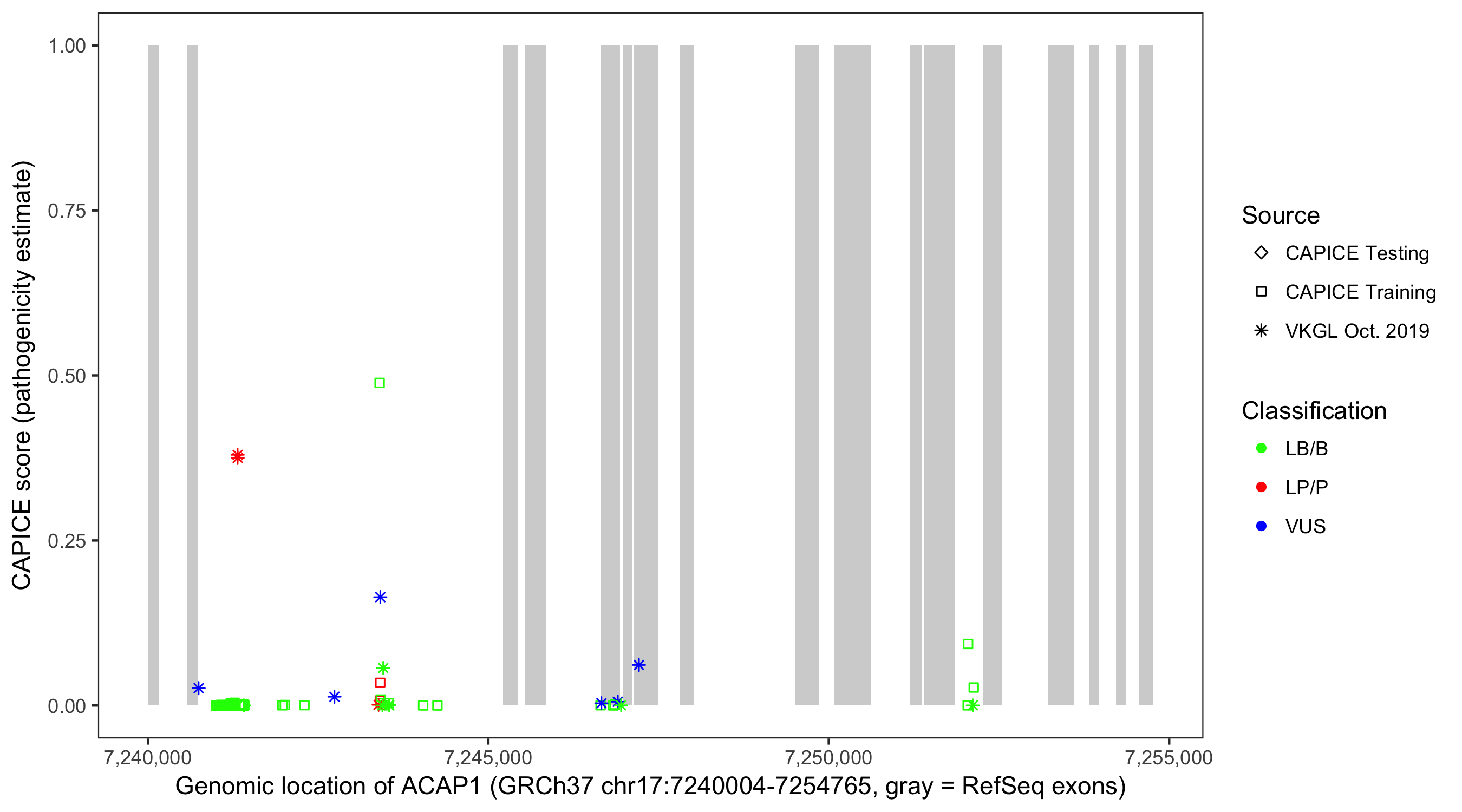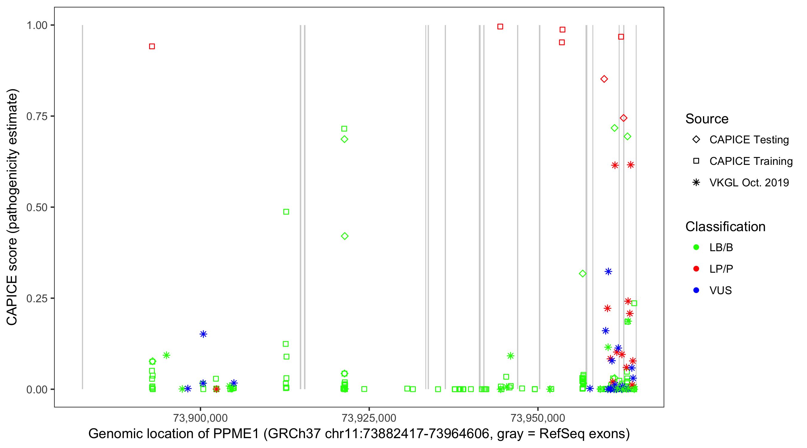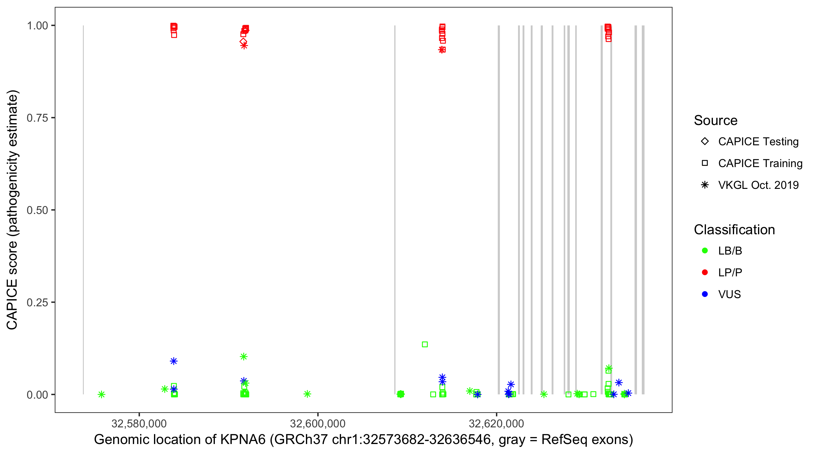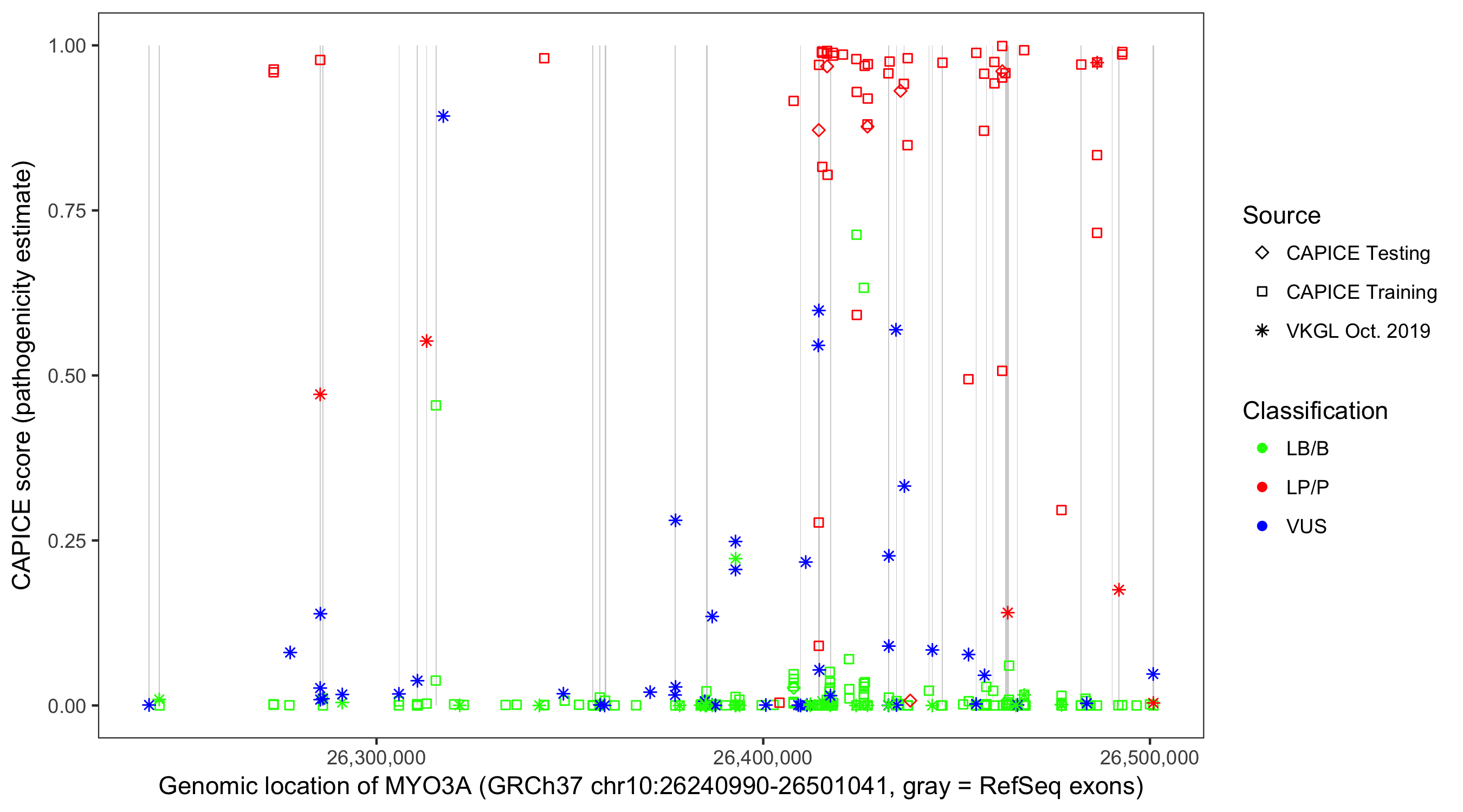 Shown are CAPICE train/test variants plus VKGL Oct 2019.