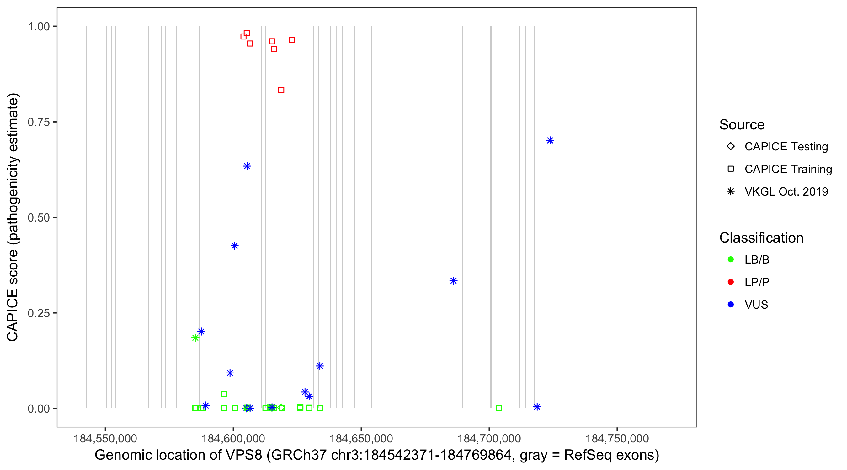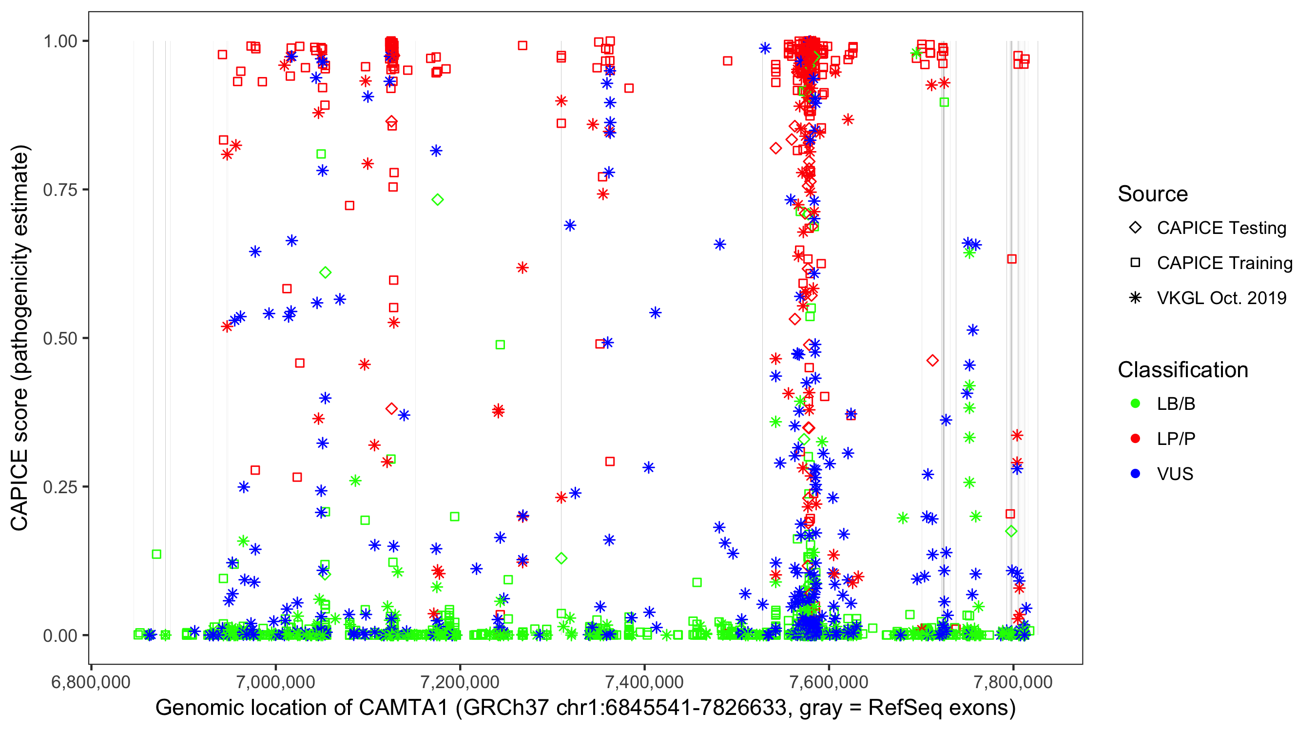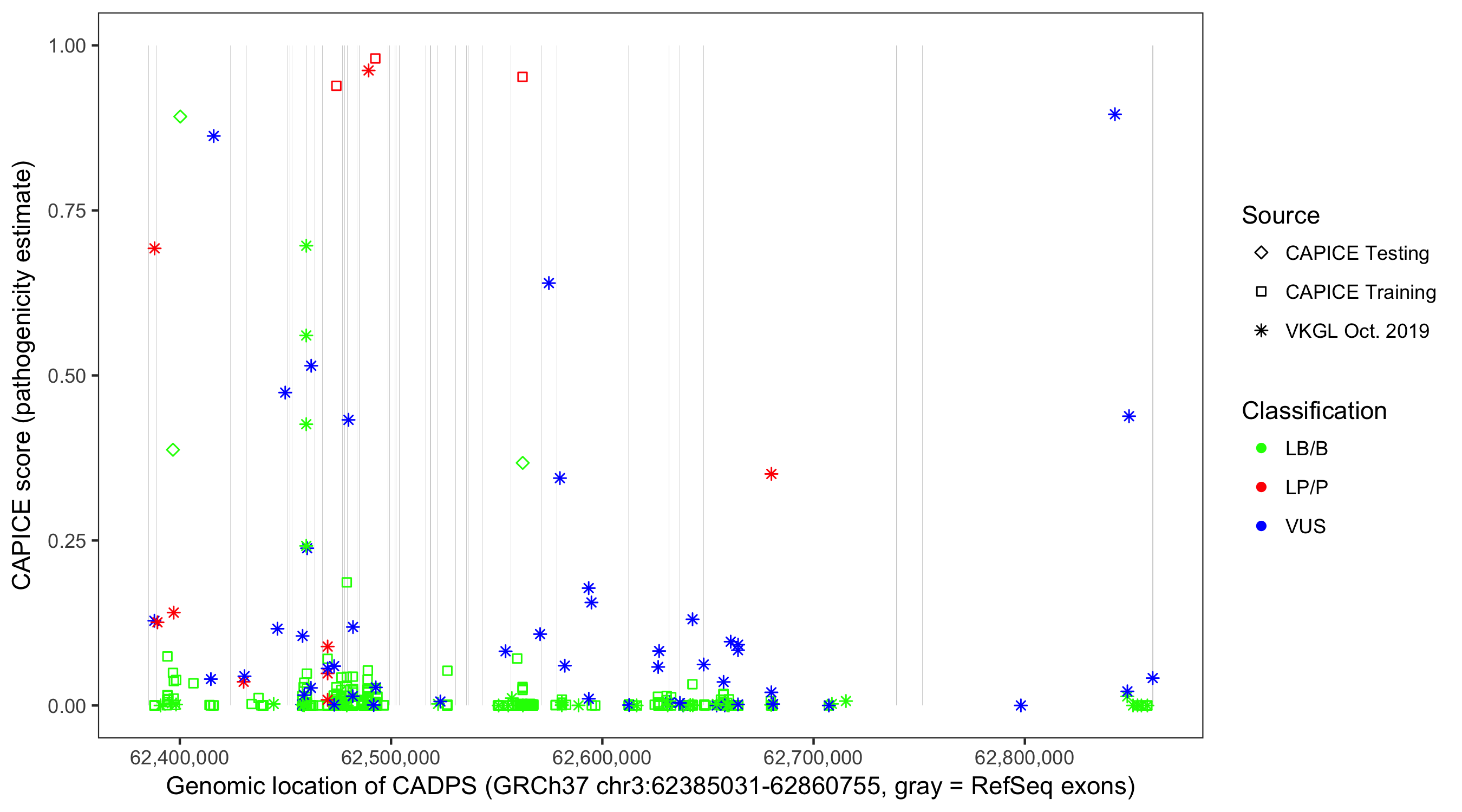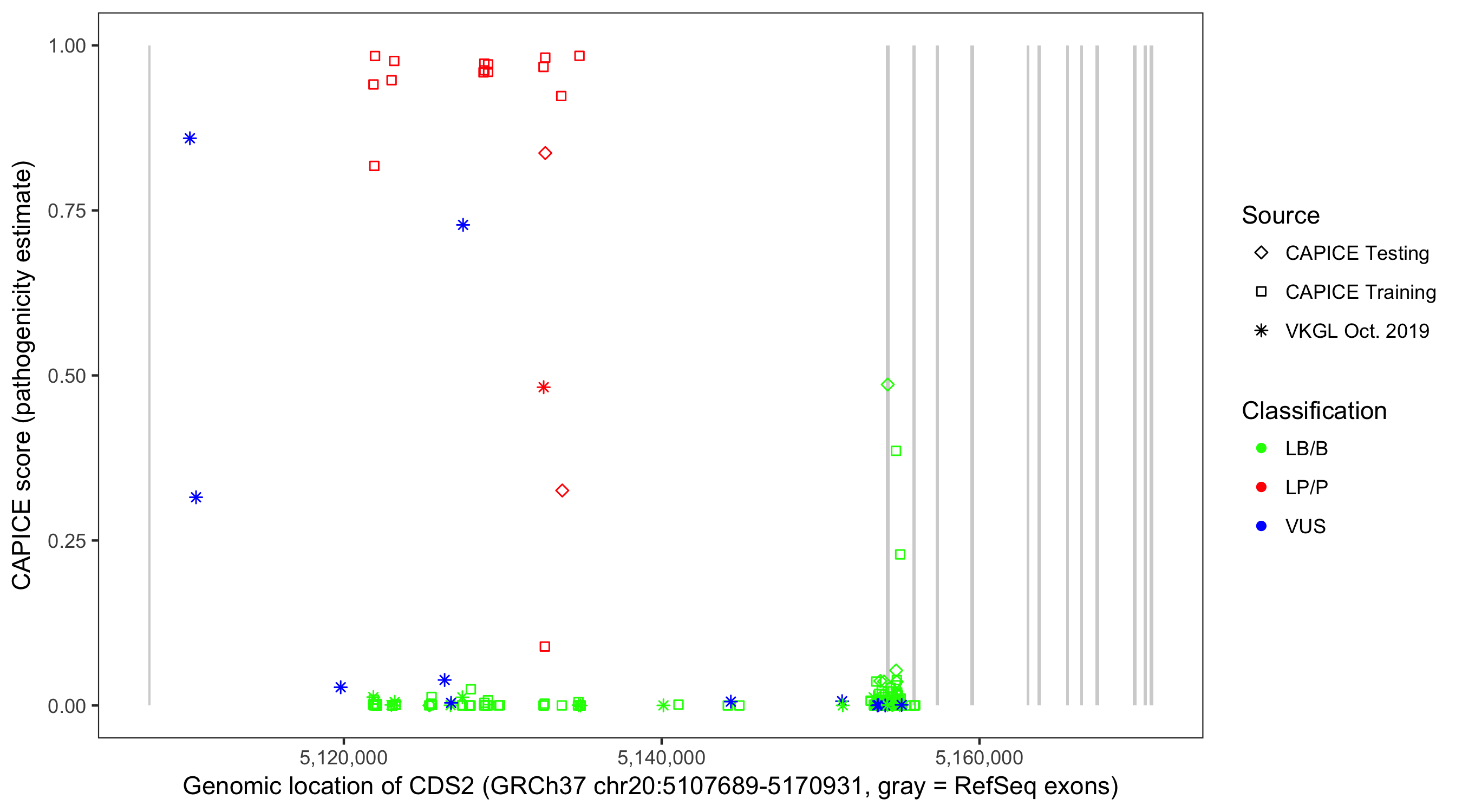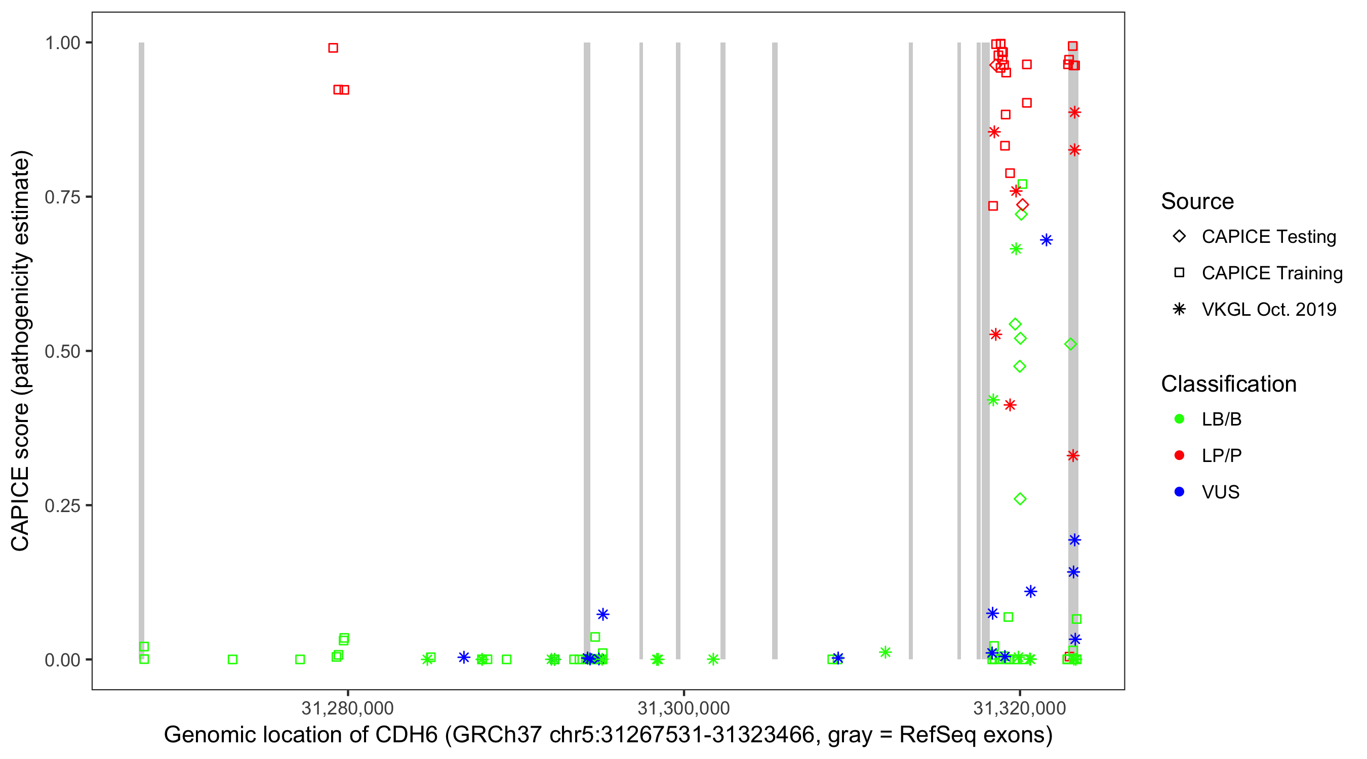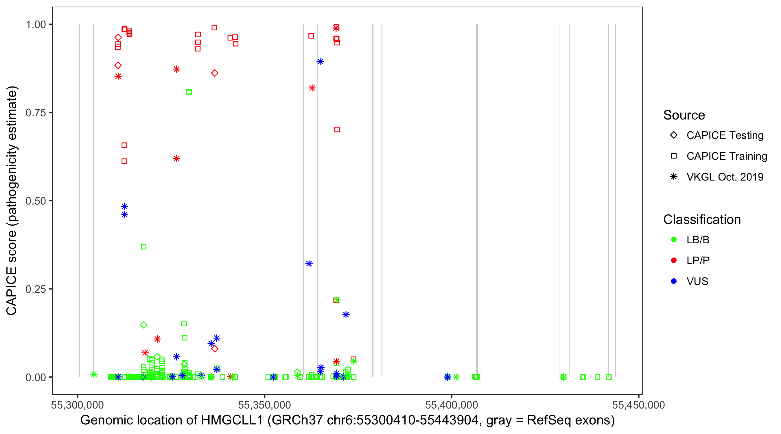 Shown are CAPICE train/test variants plus VKGL Oct 2019.