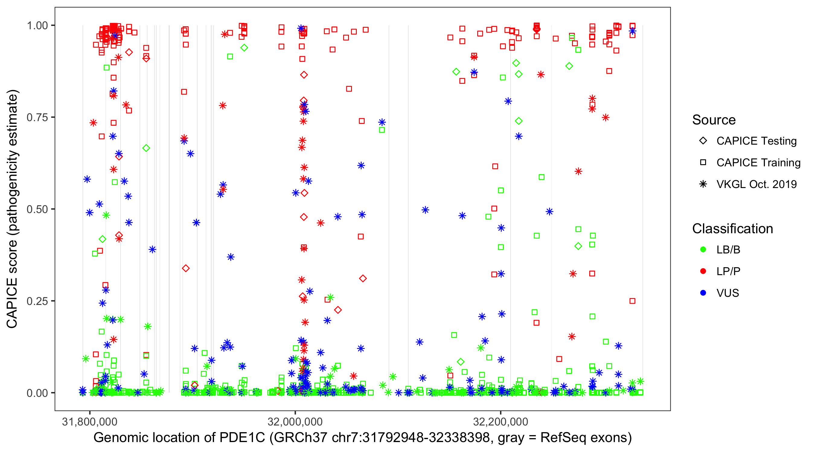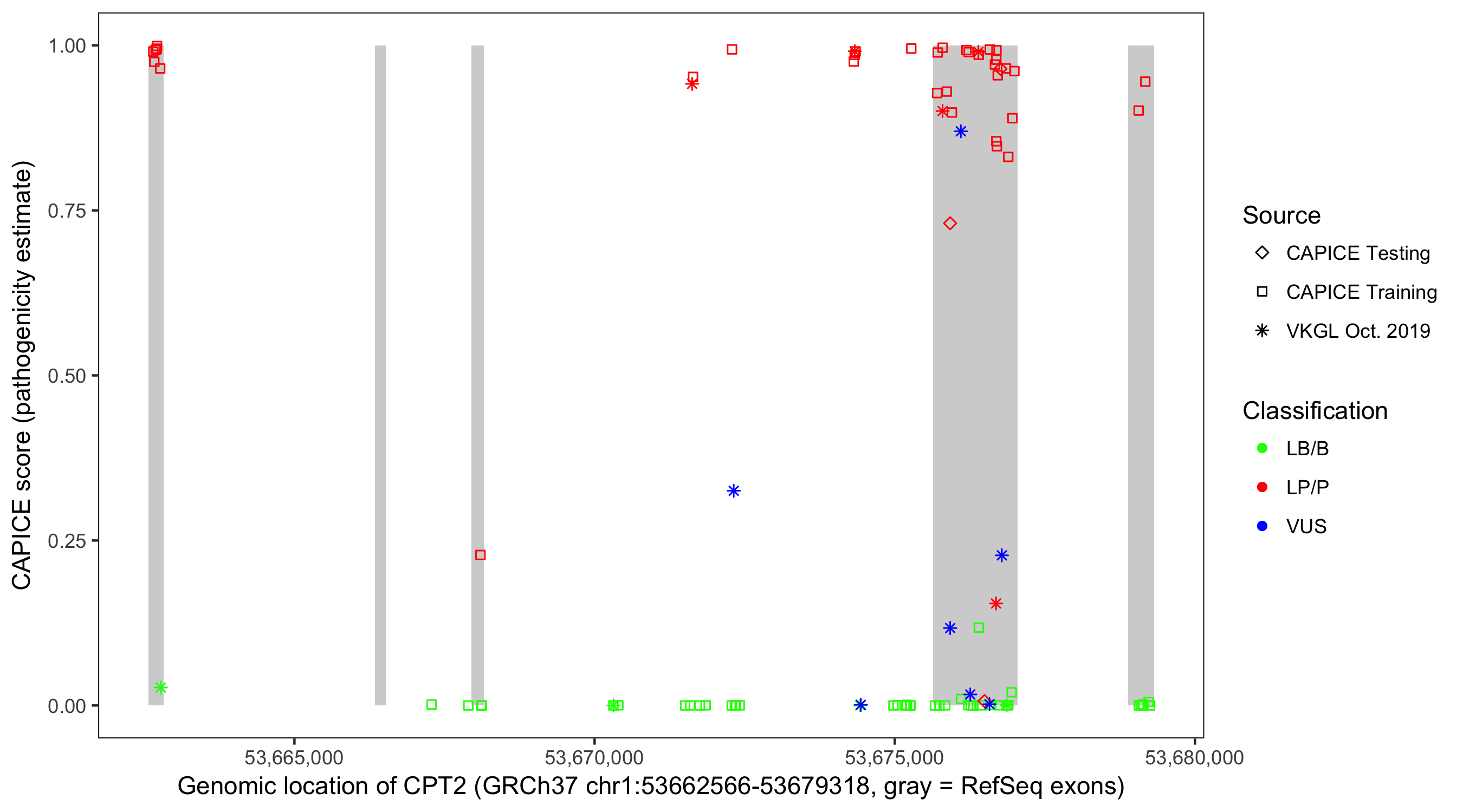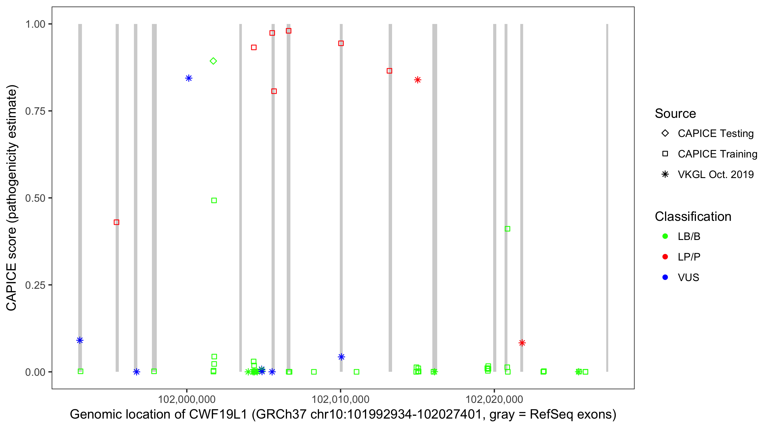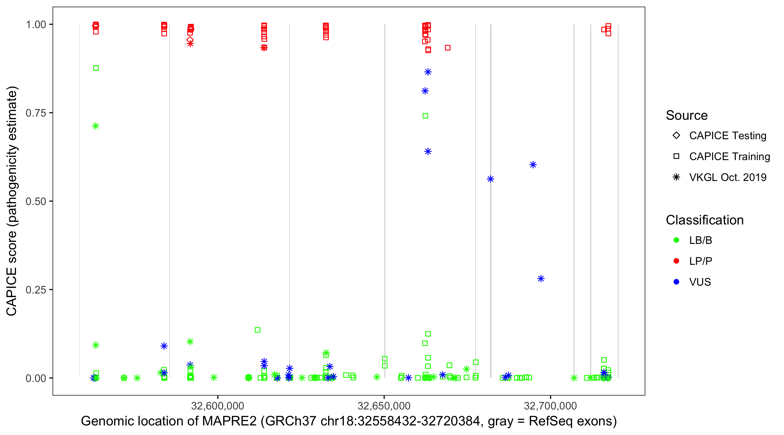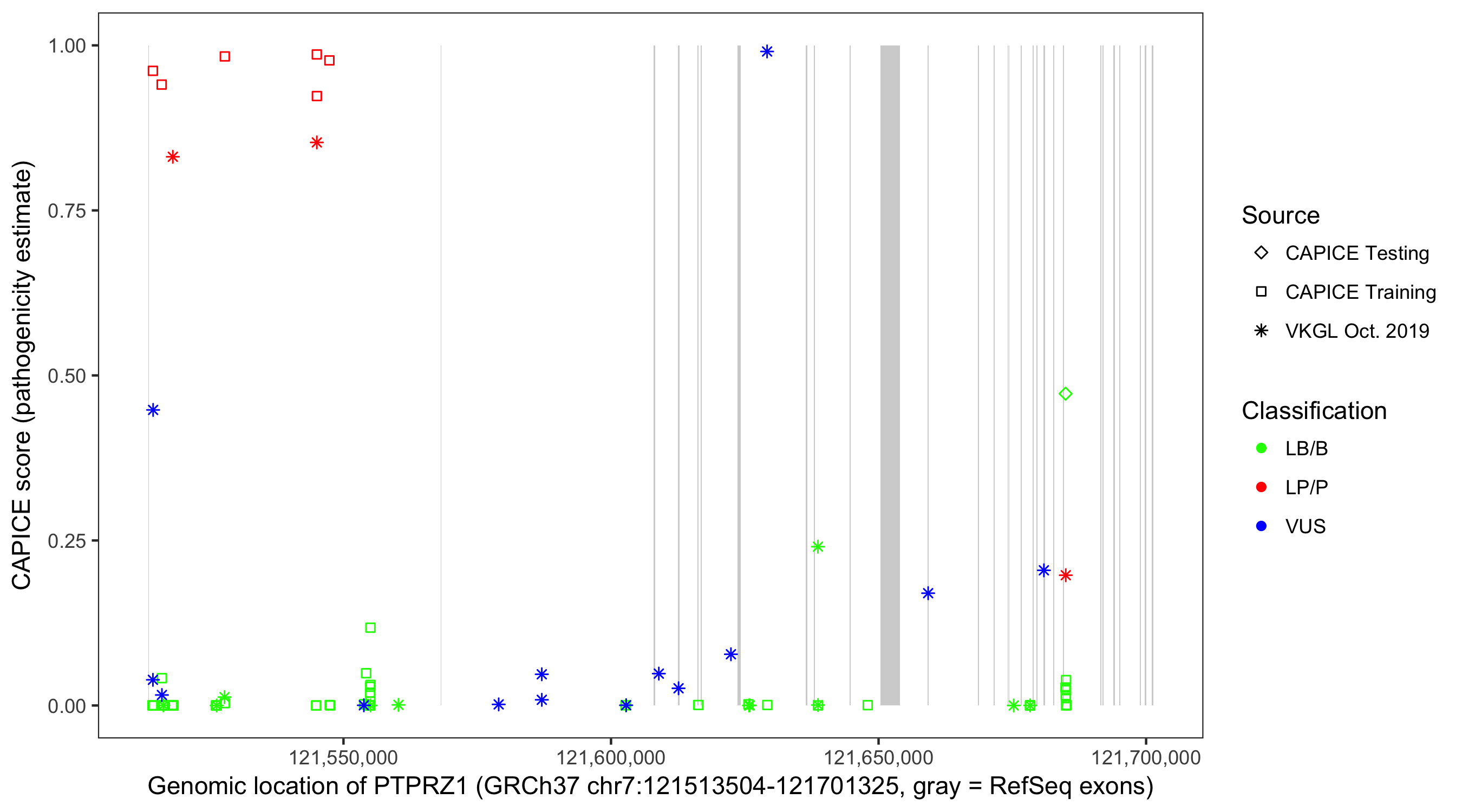 Shown are CAPICE train/test variants plus VKGL Oct 2019.