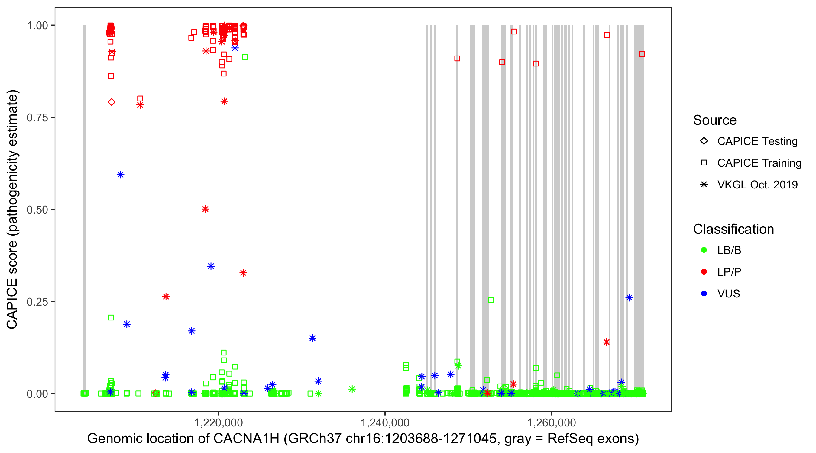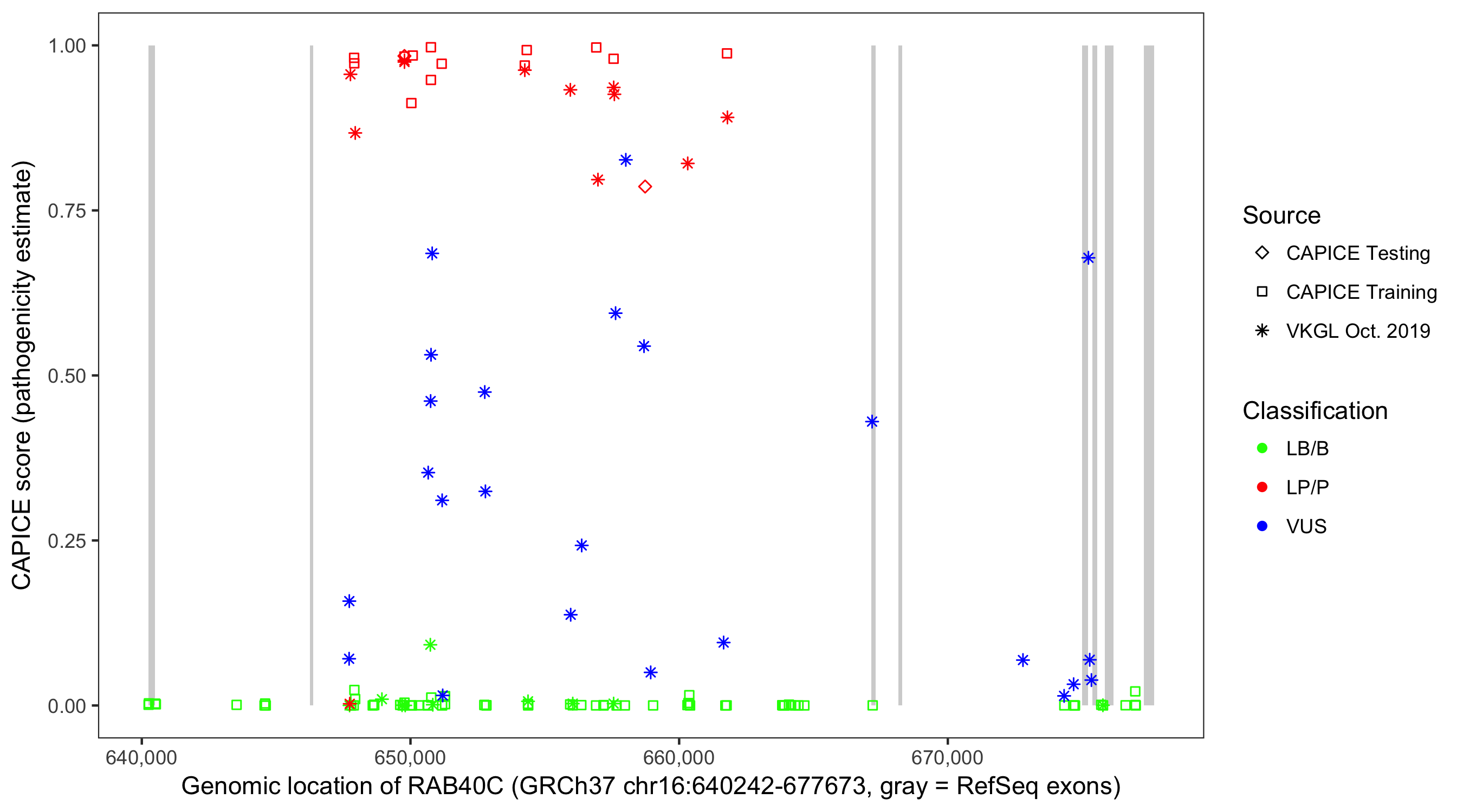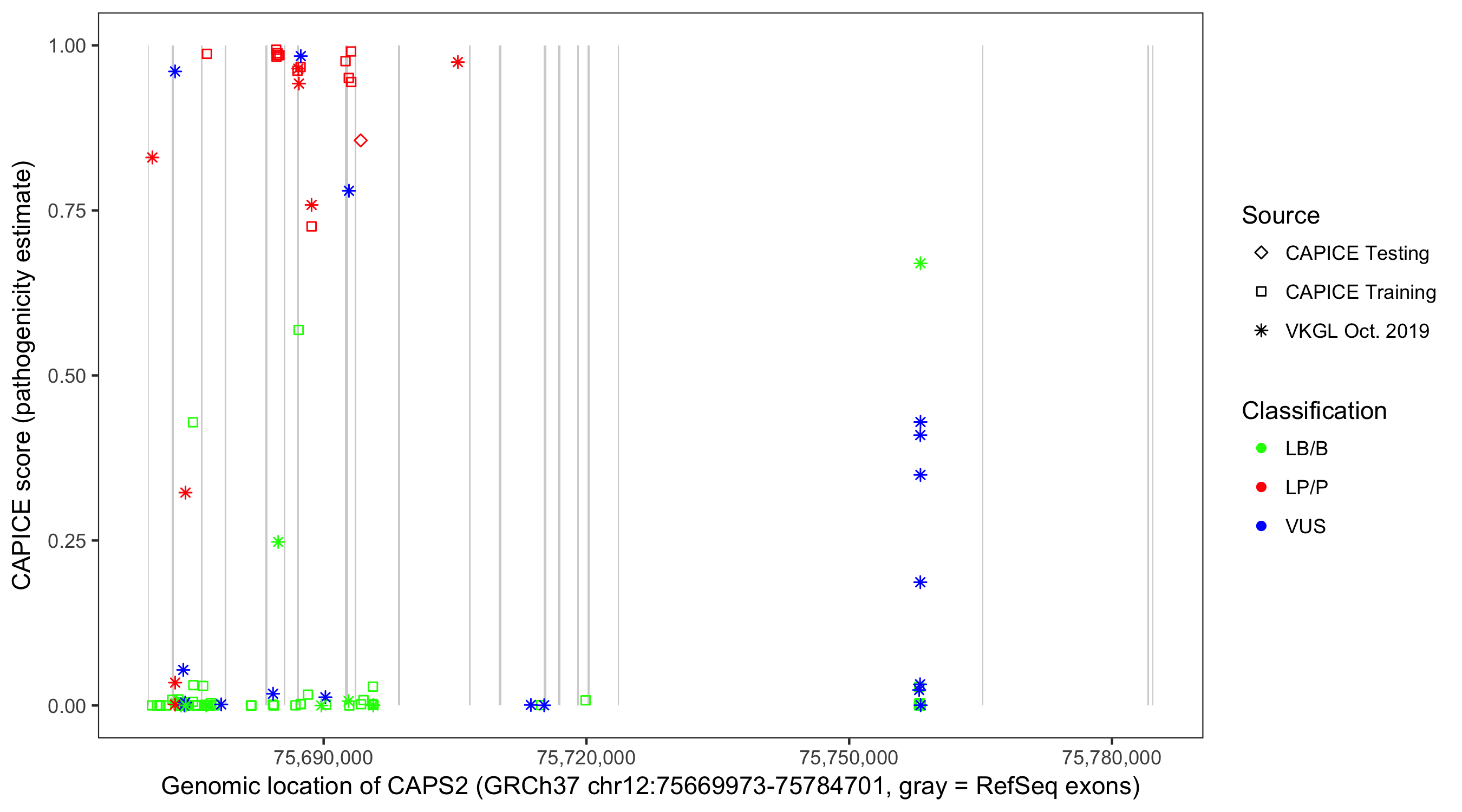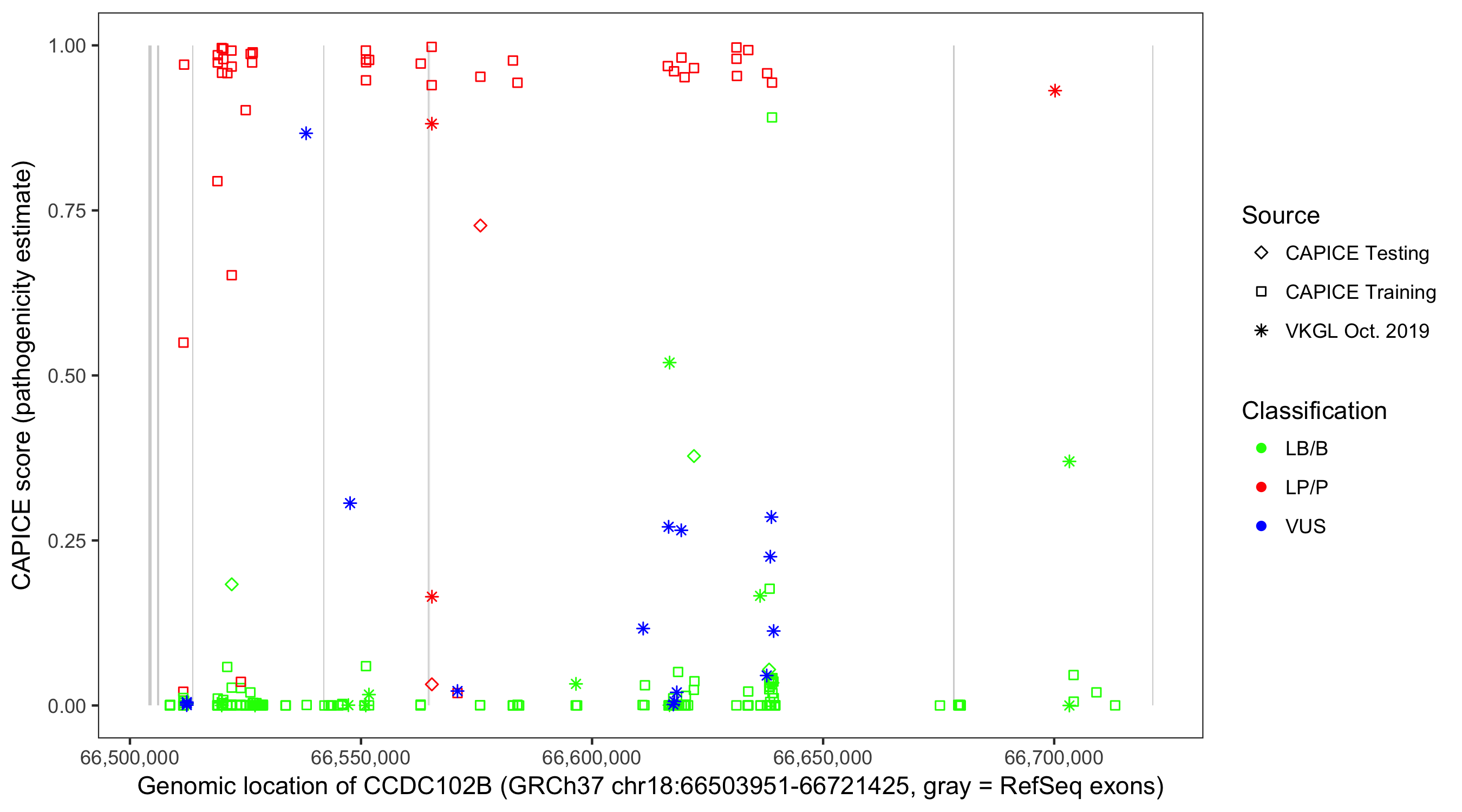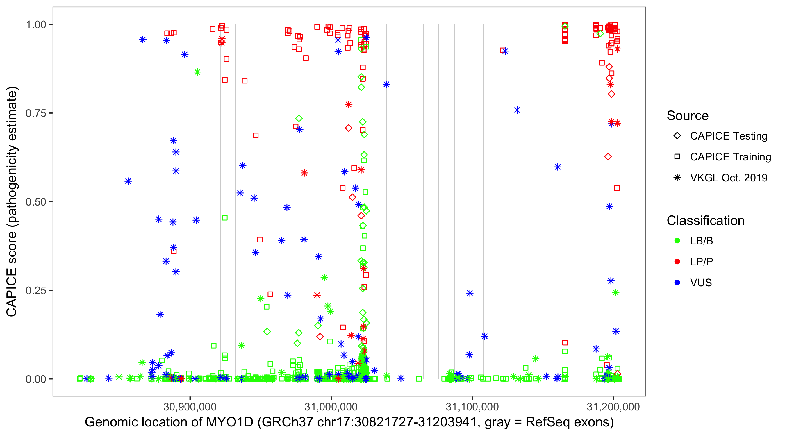Shown are CAPICE train/test variants plus VKGL Oct 2019.
