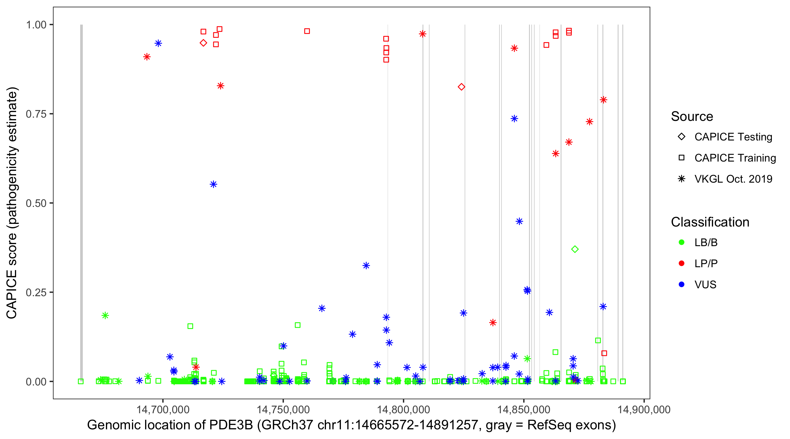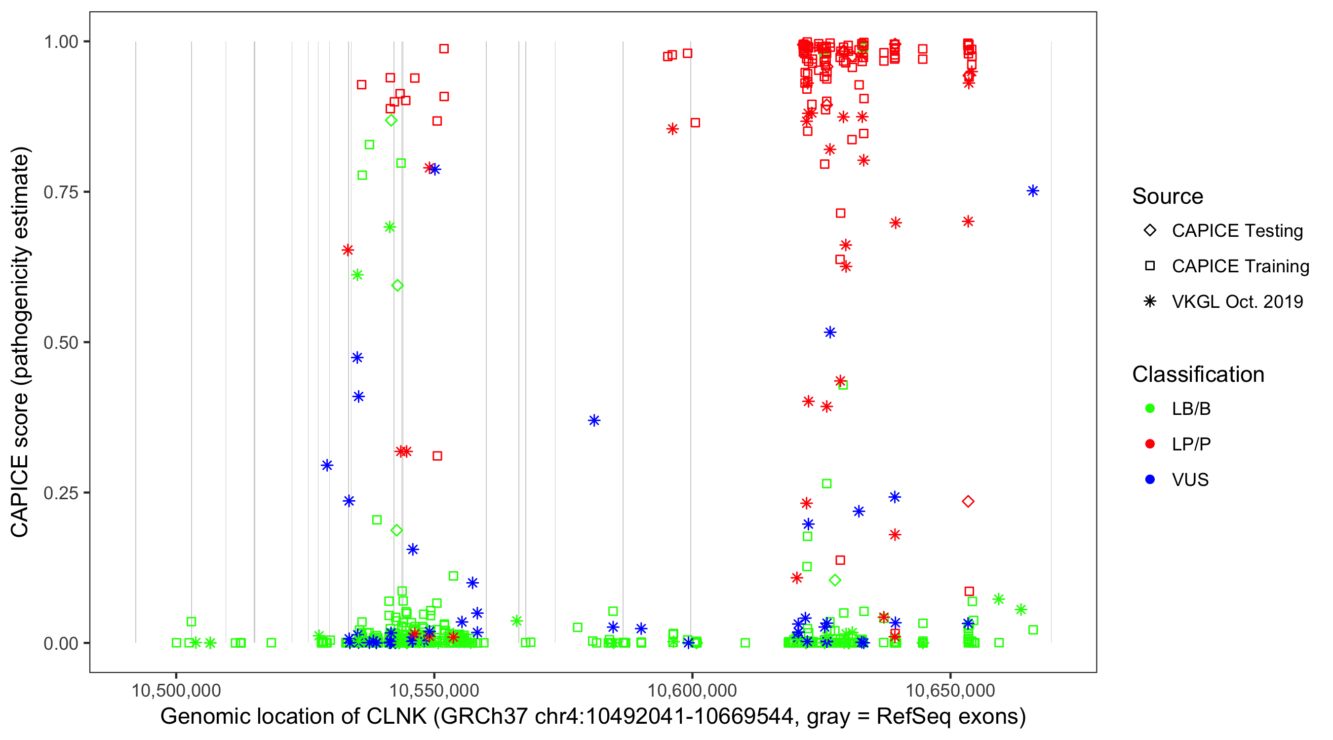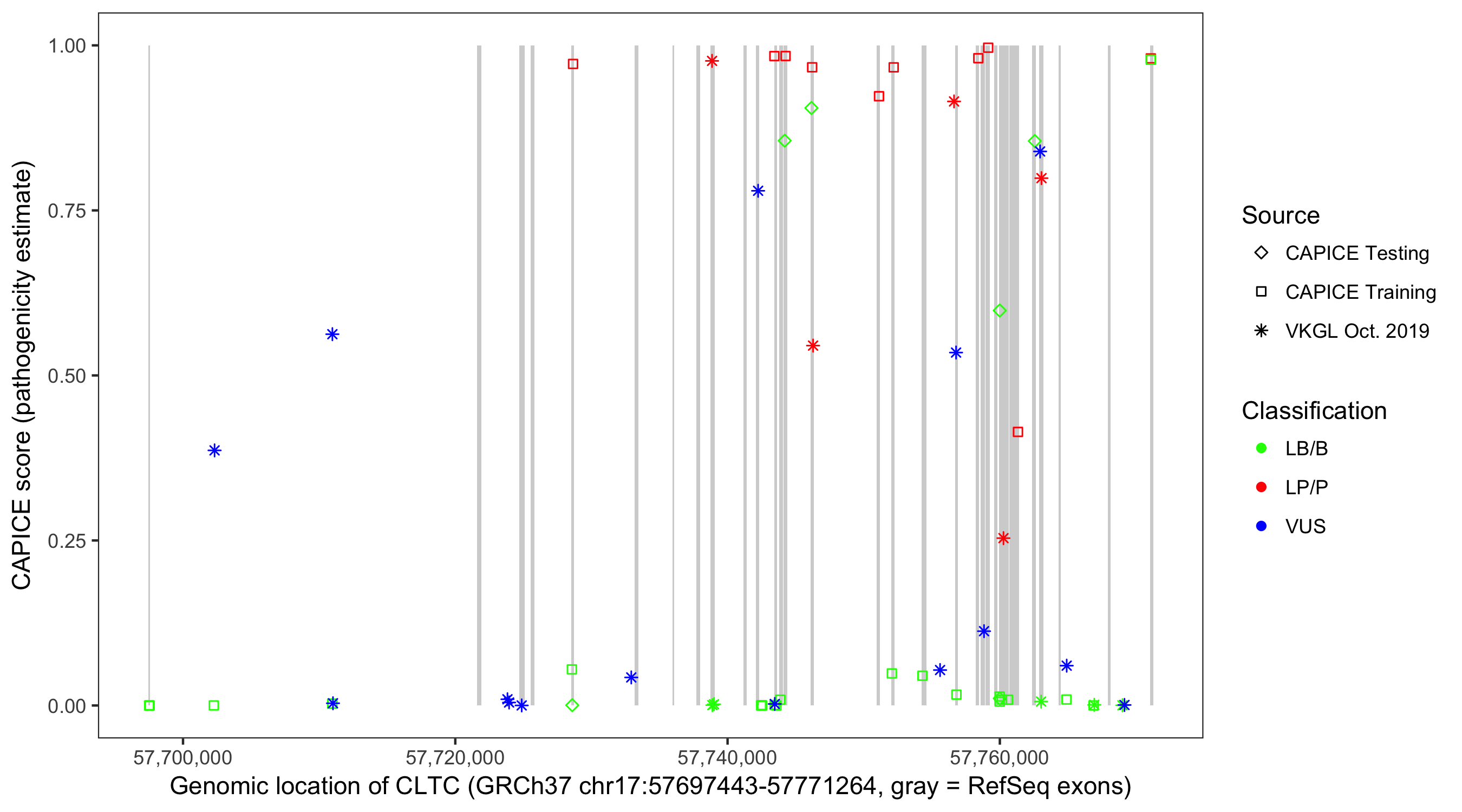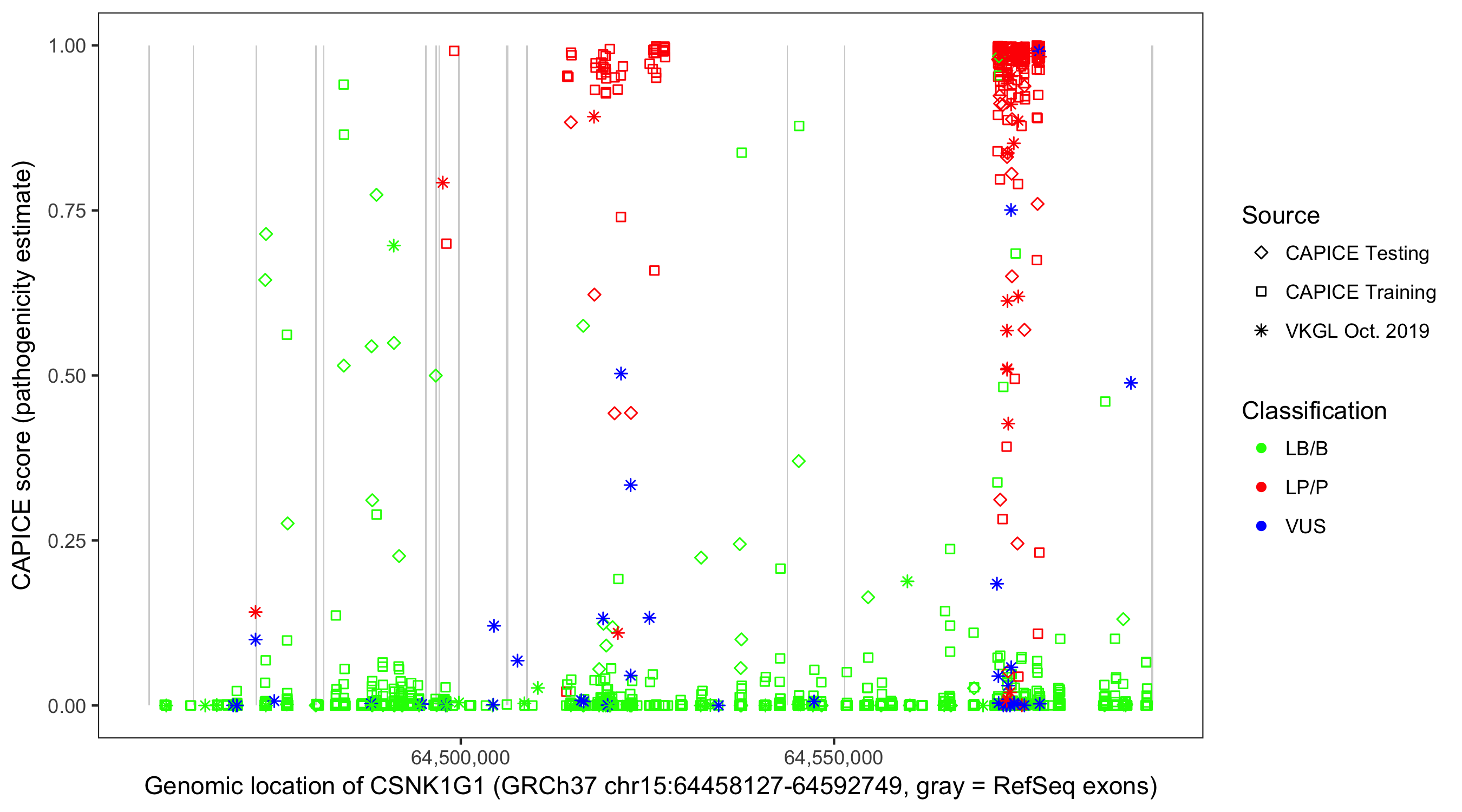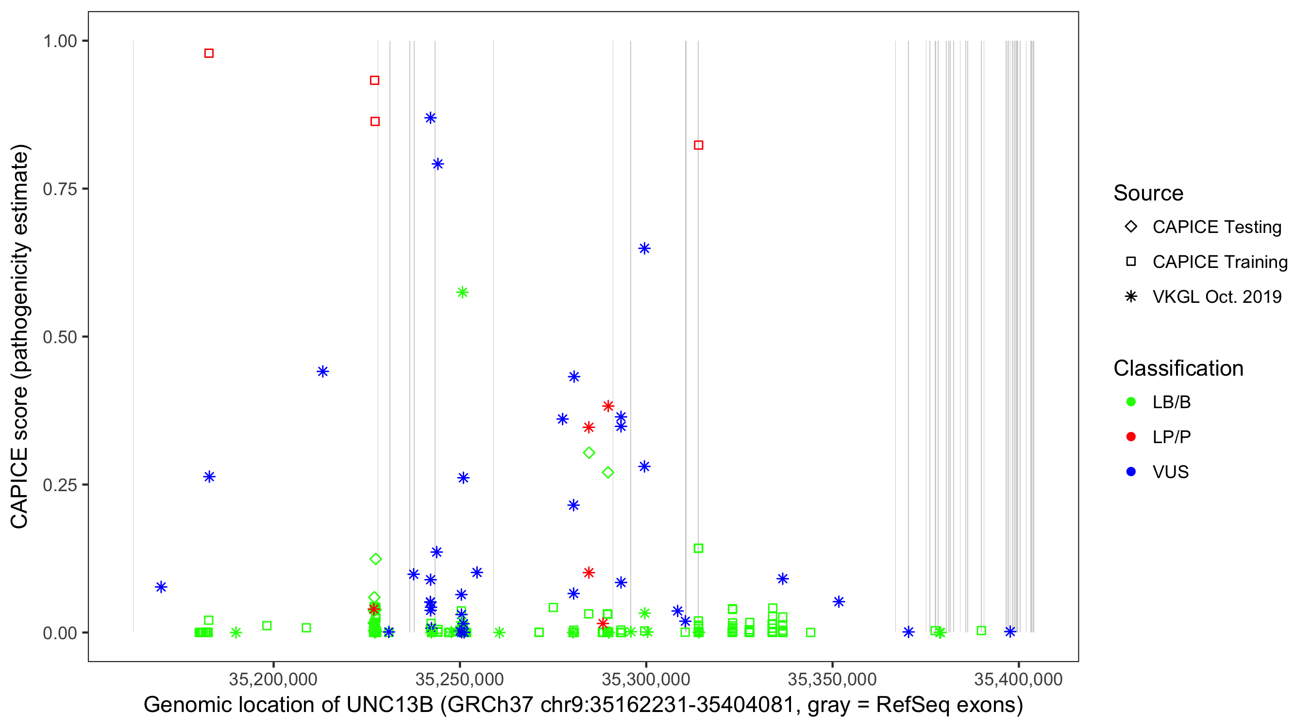 Shown are CAPICE train/test variants plus VKGL Oct 2019.