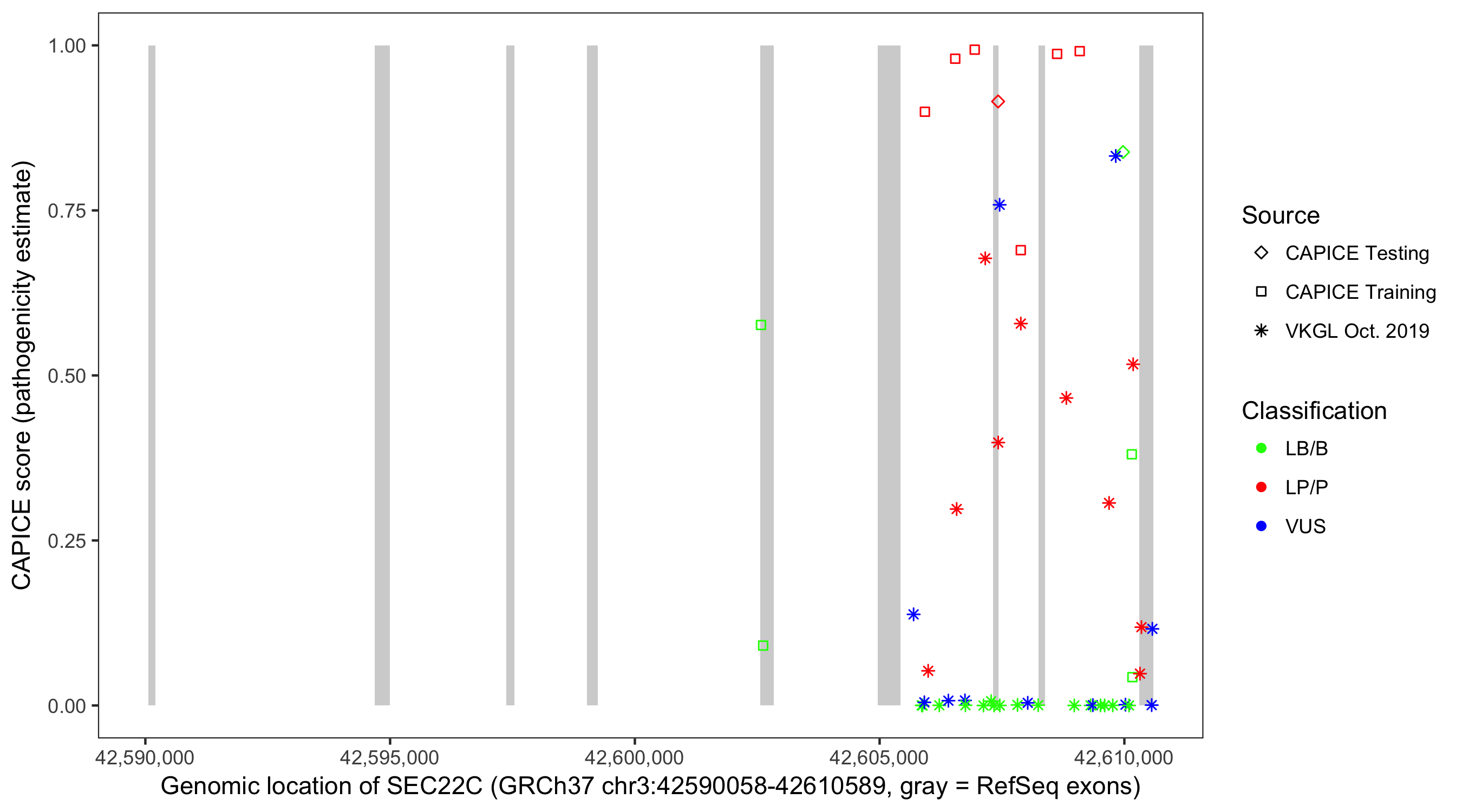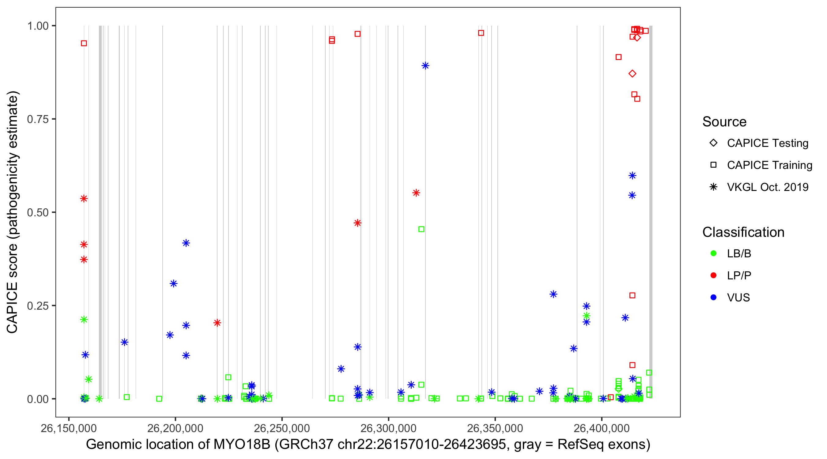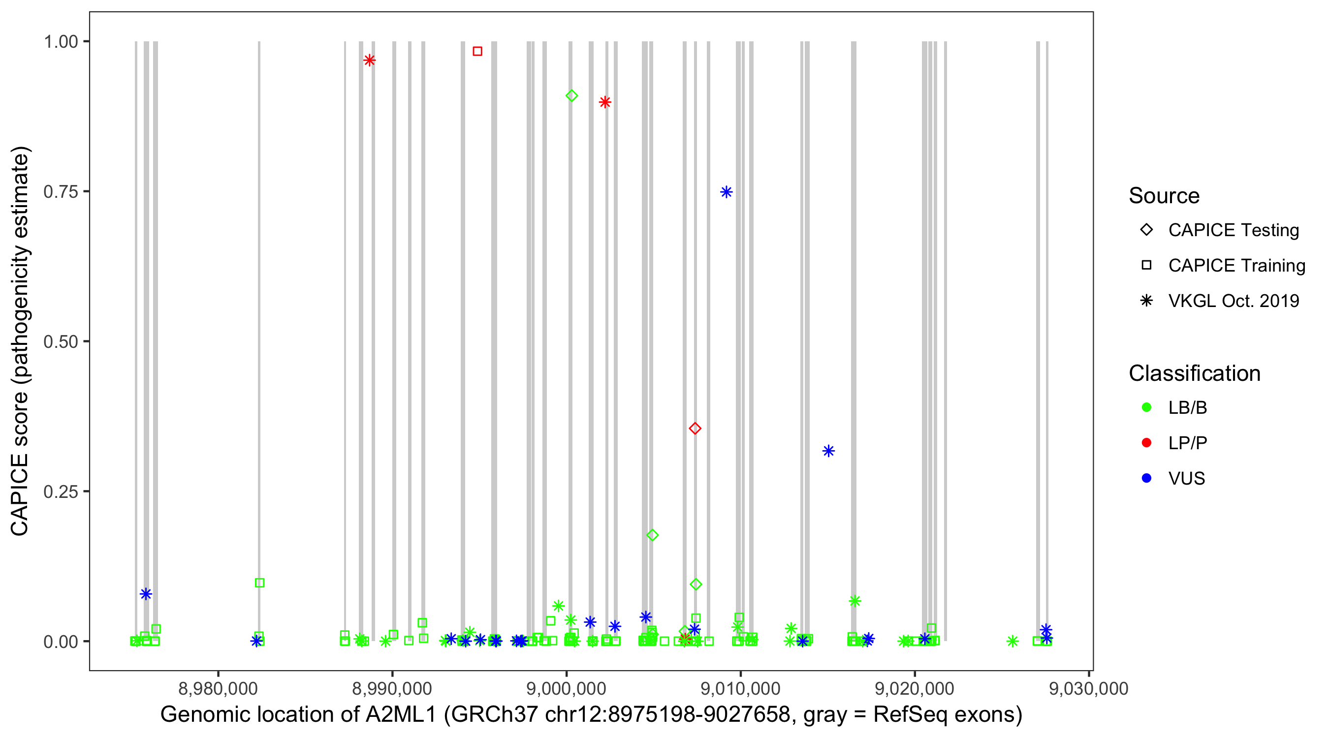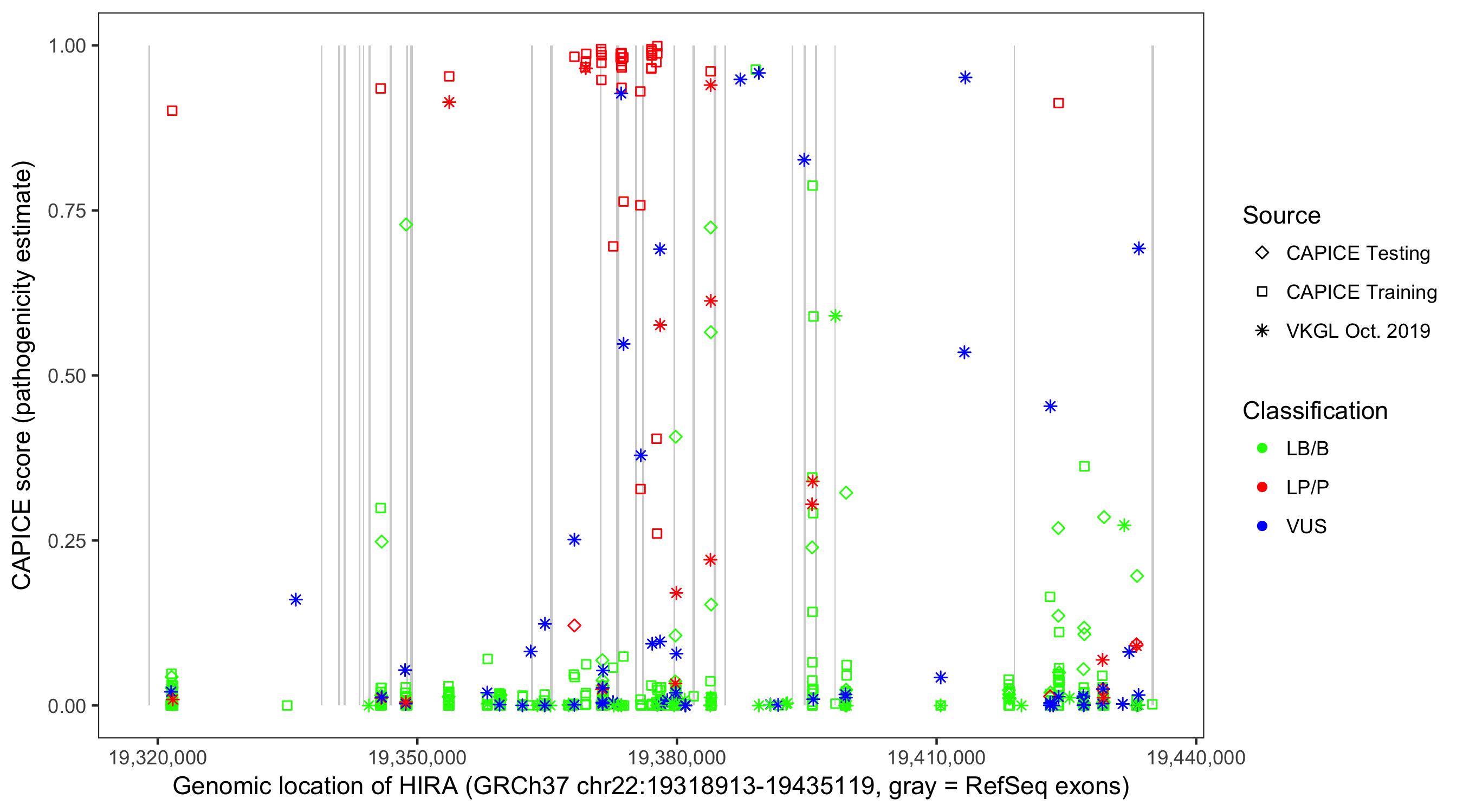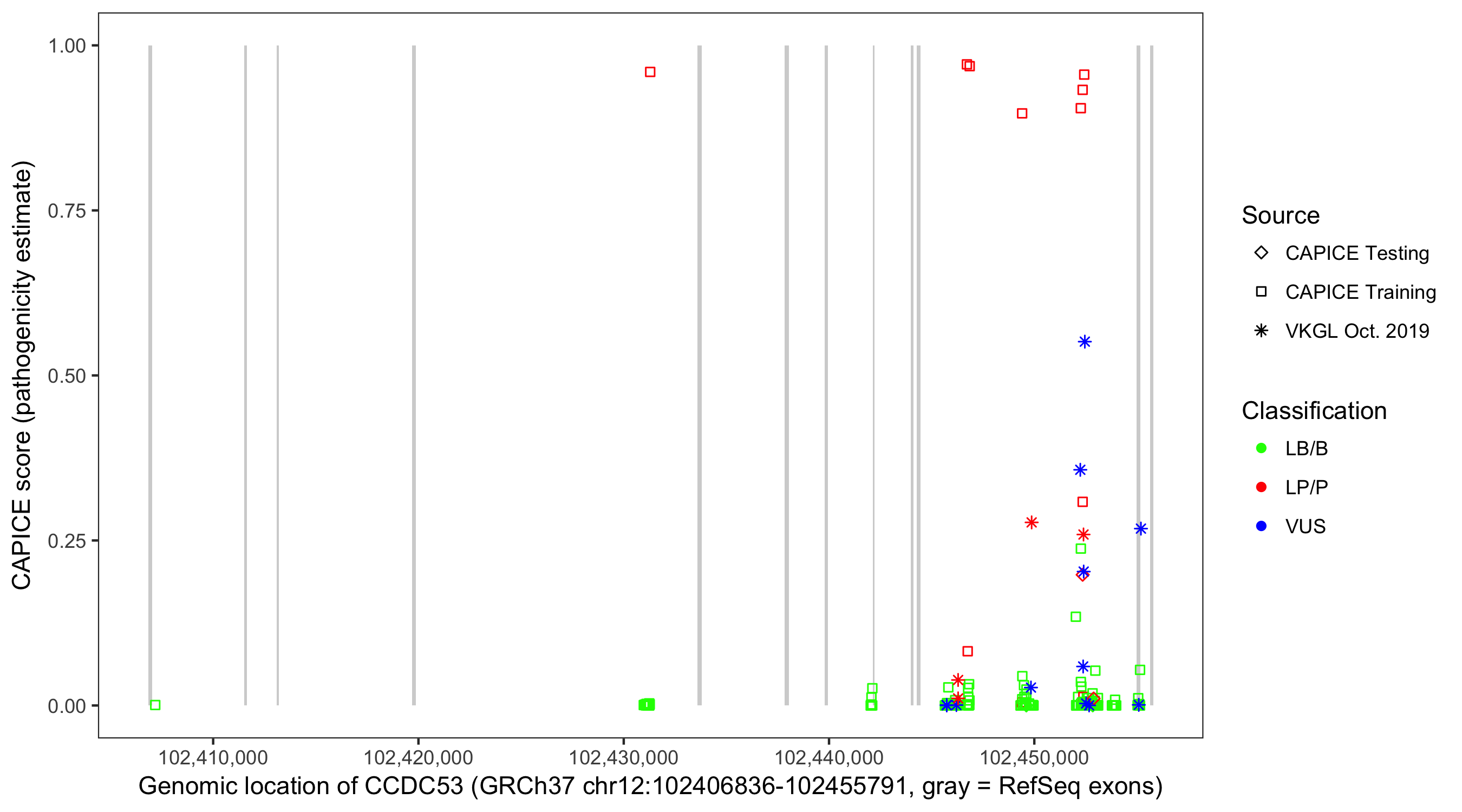 Shown are CAPICE train/test variants plus VKGL Oct 2019.