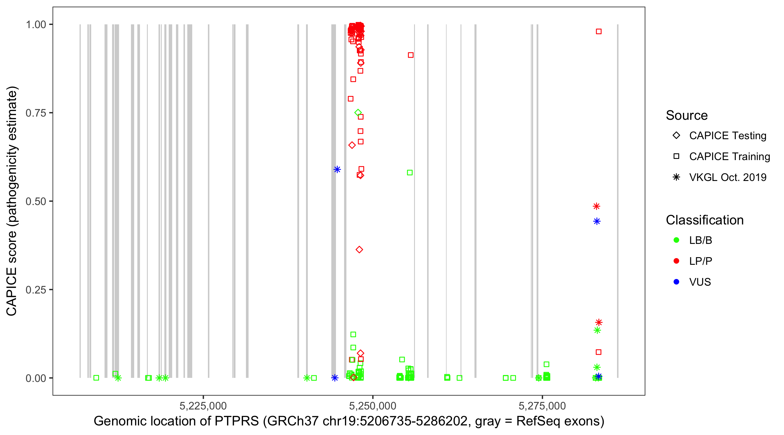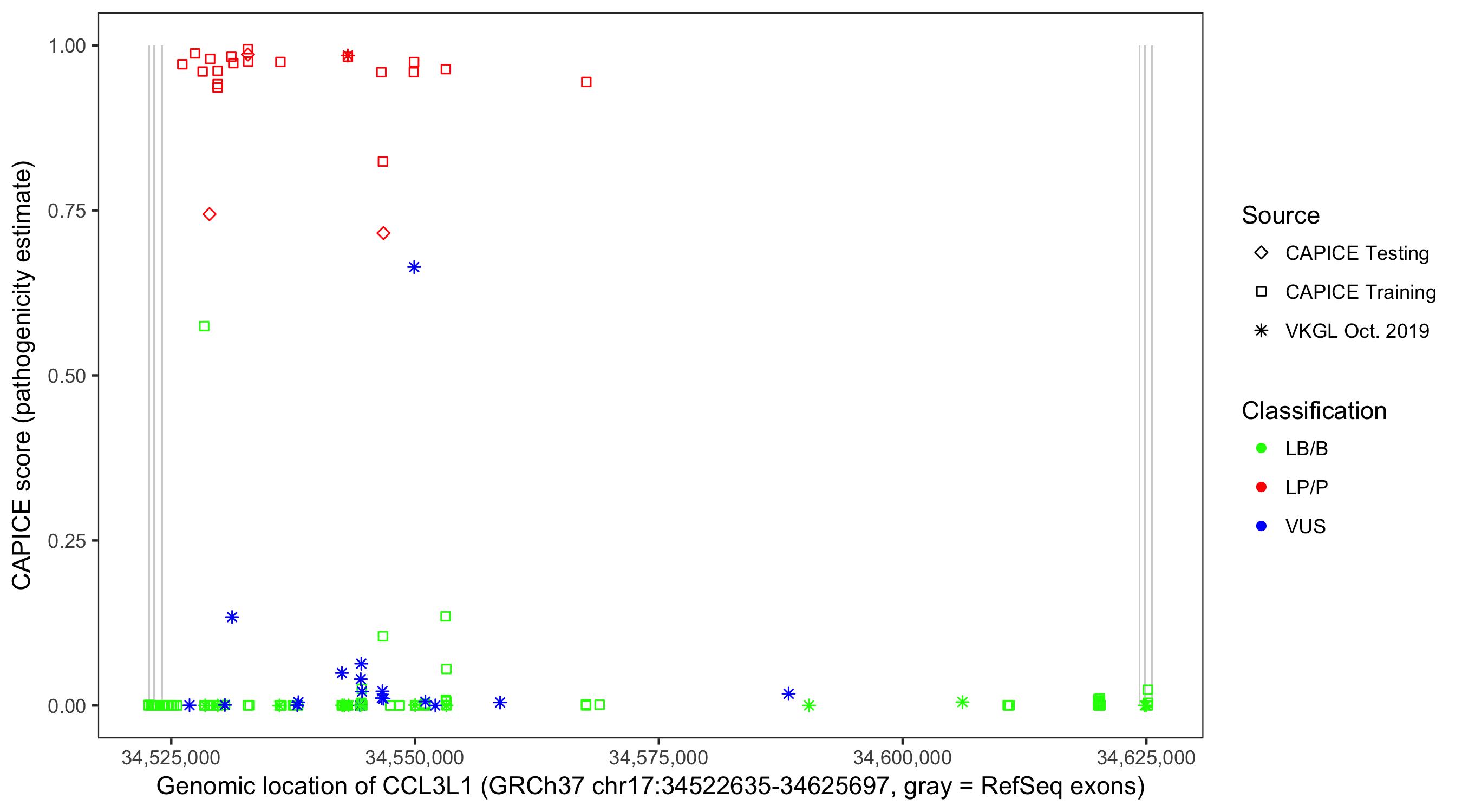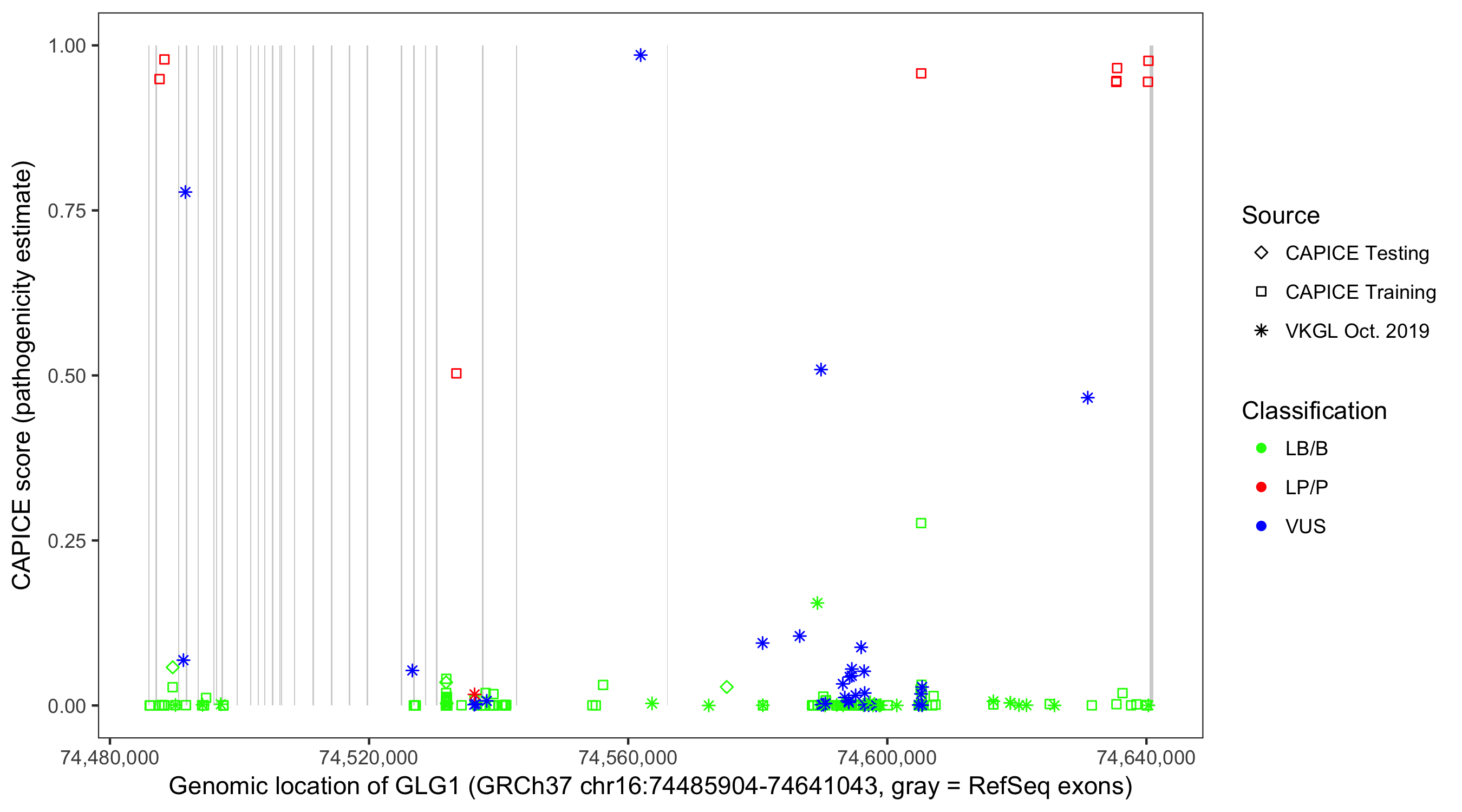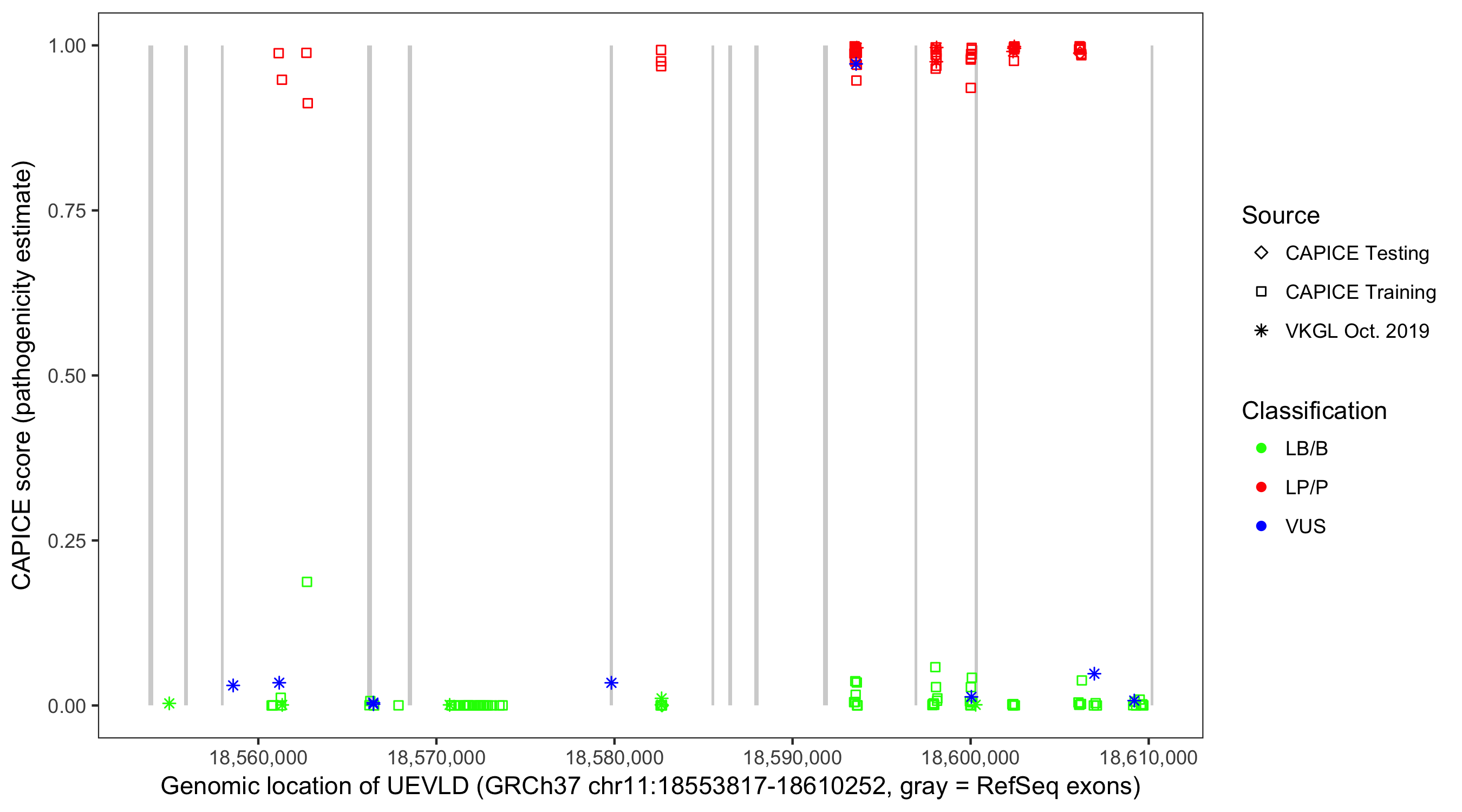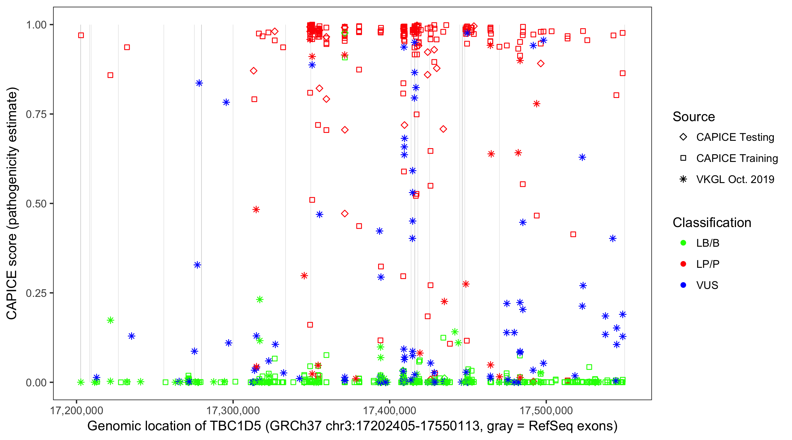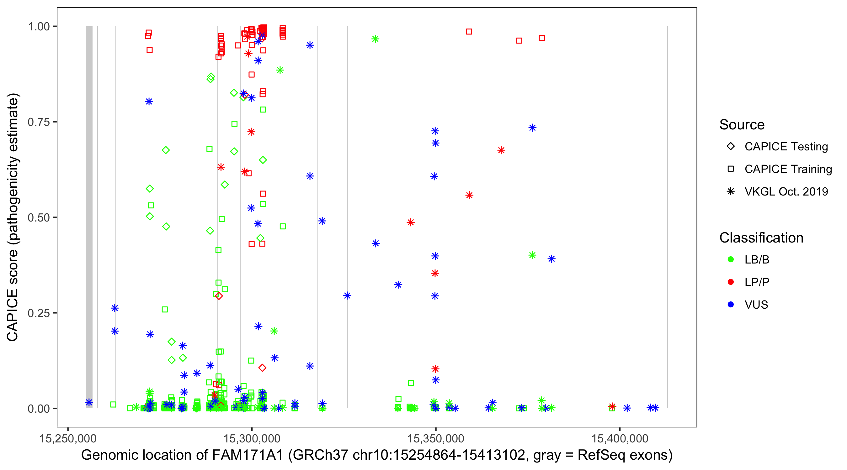 Shown are CAPICE train/test variants plus VKGL Oct 2019.