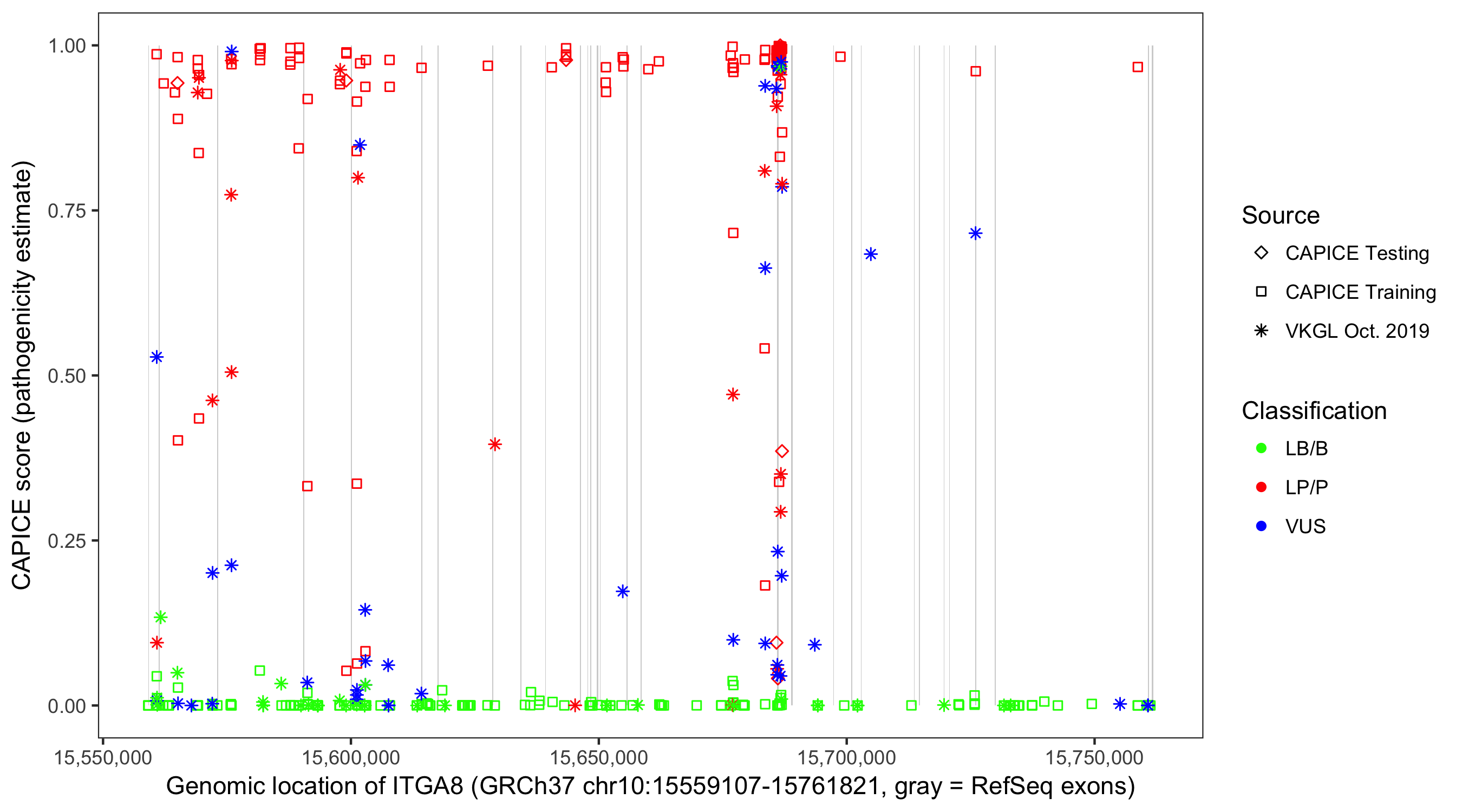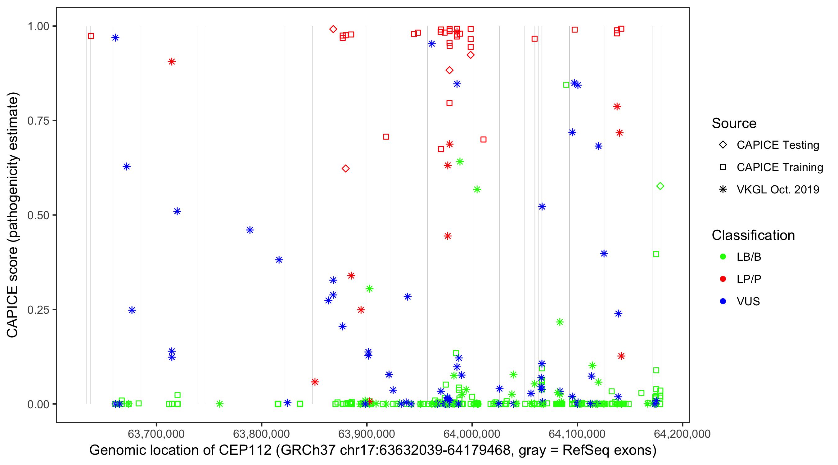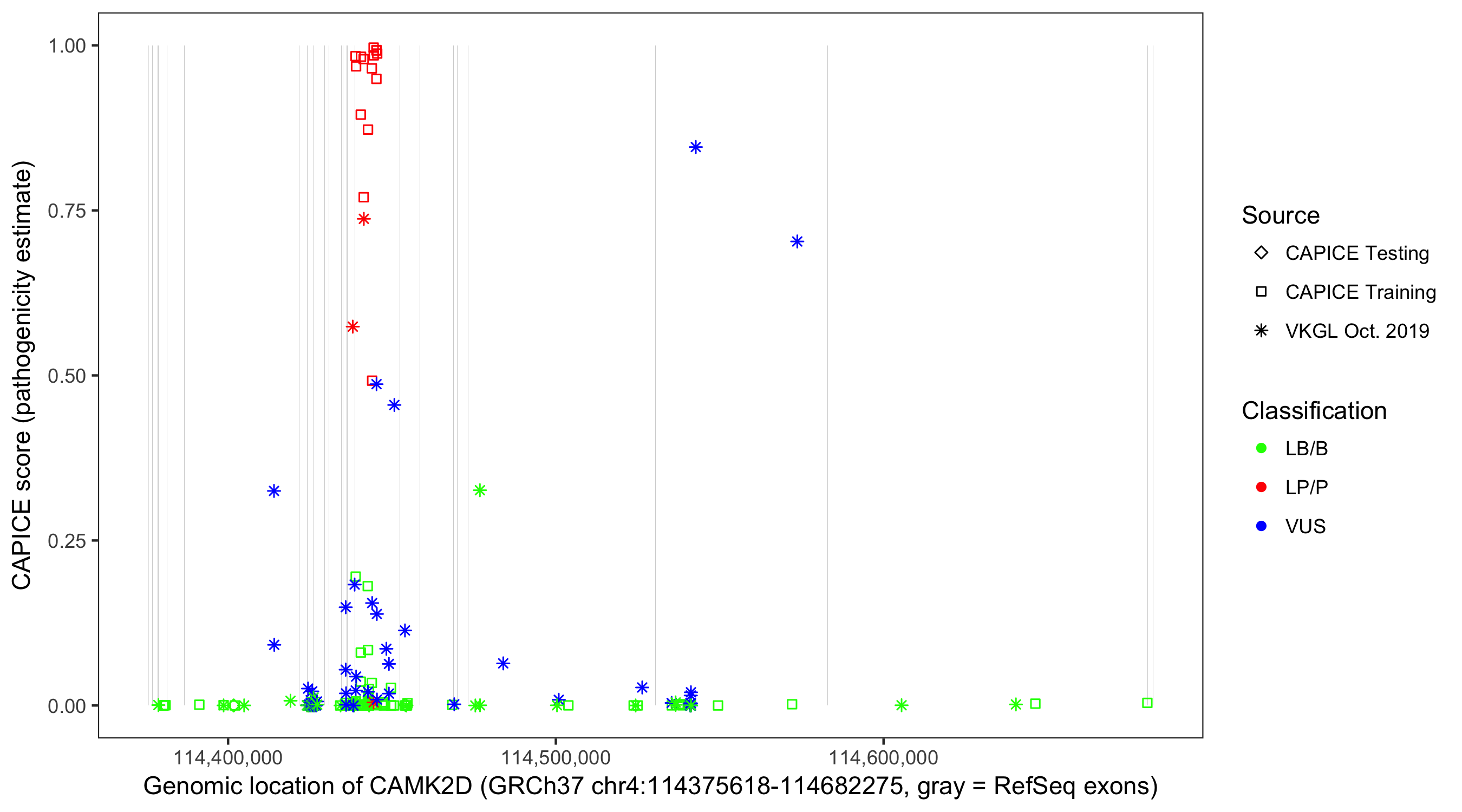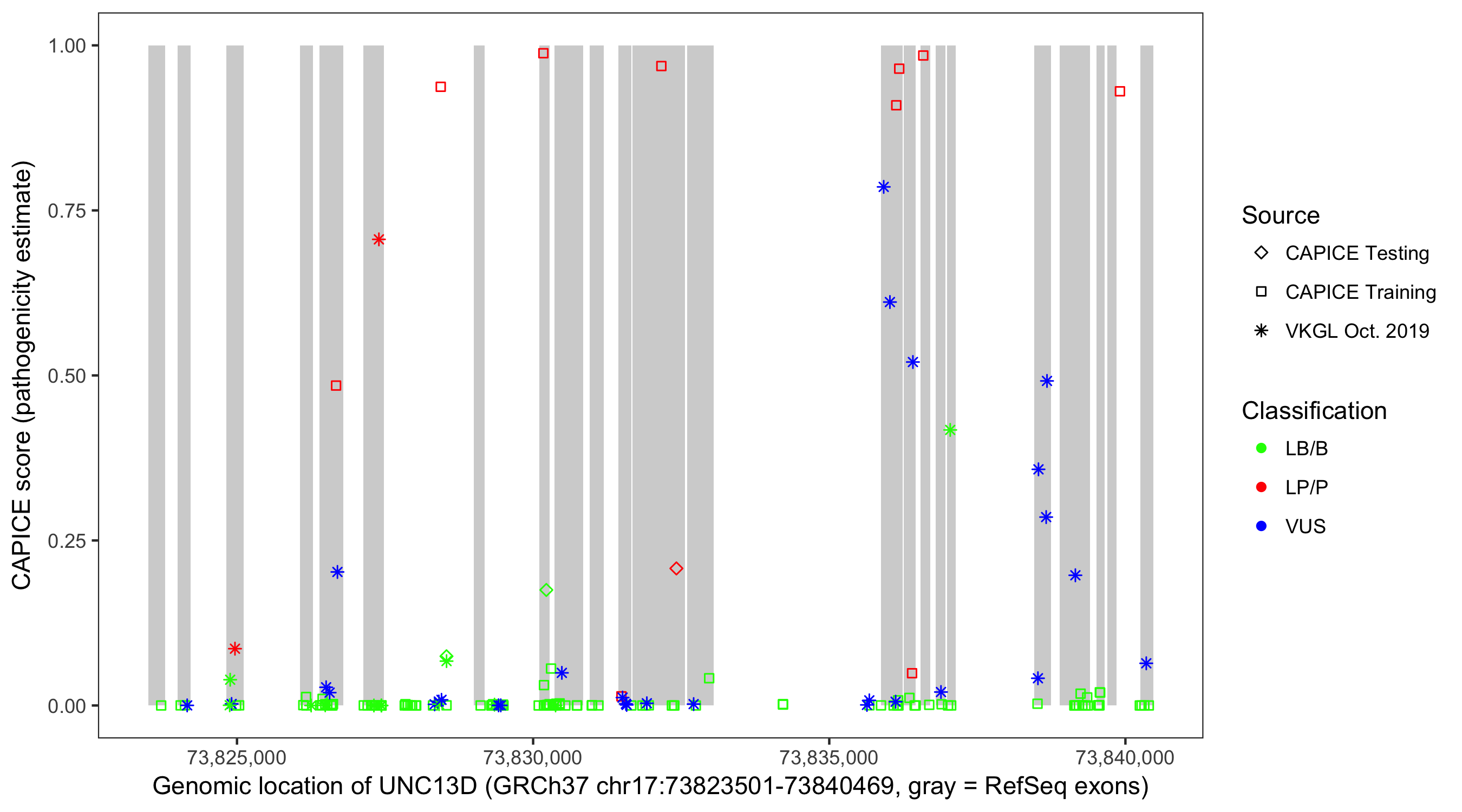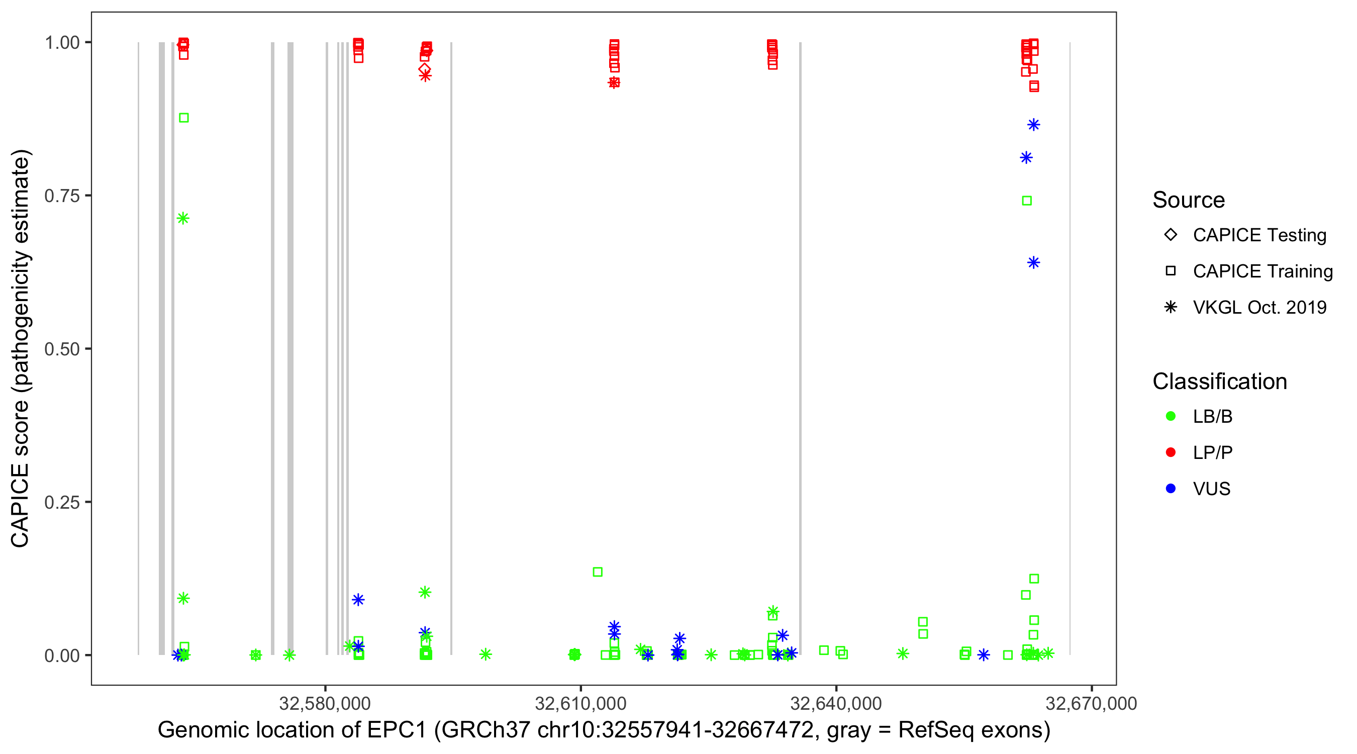 Shown are CAPICE train/test variants plus VKGL Oct 2019.