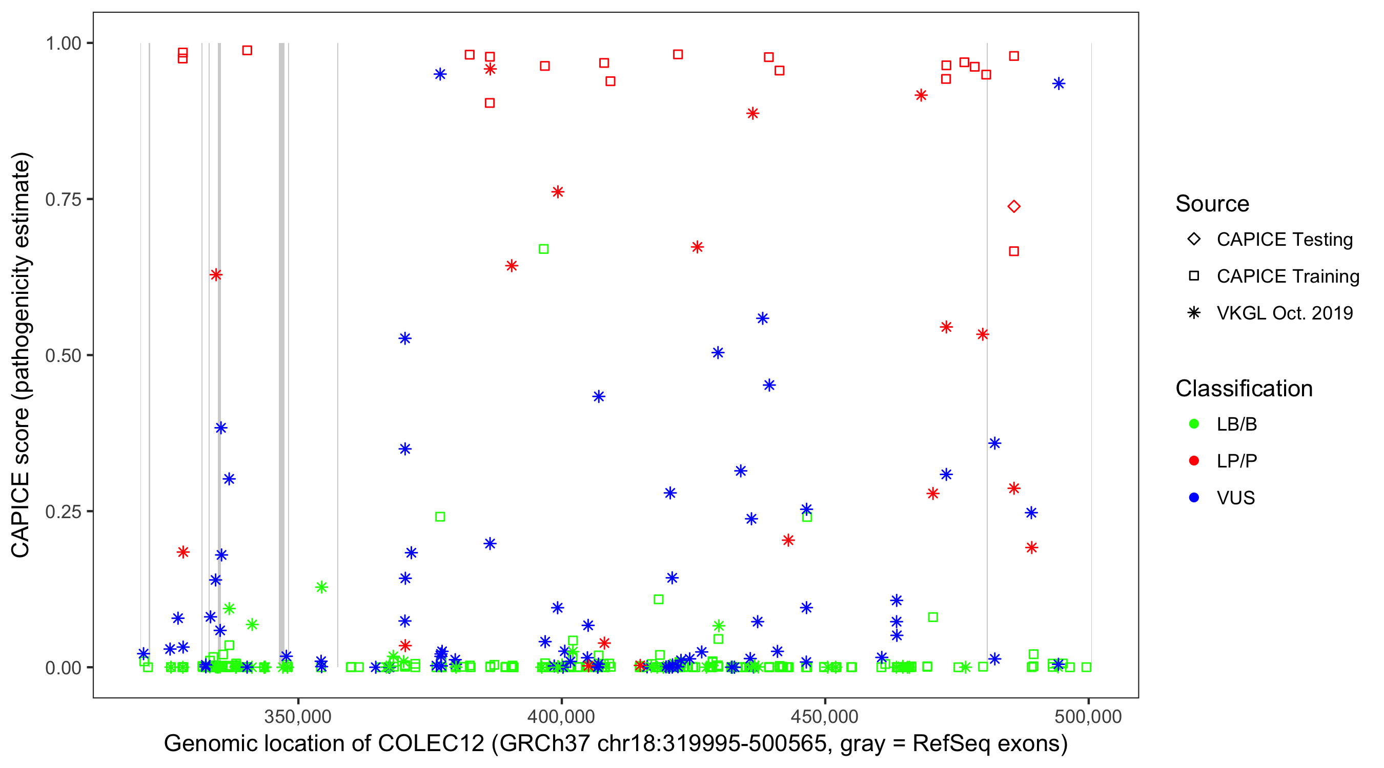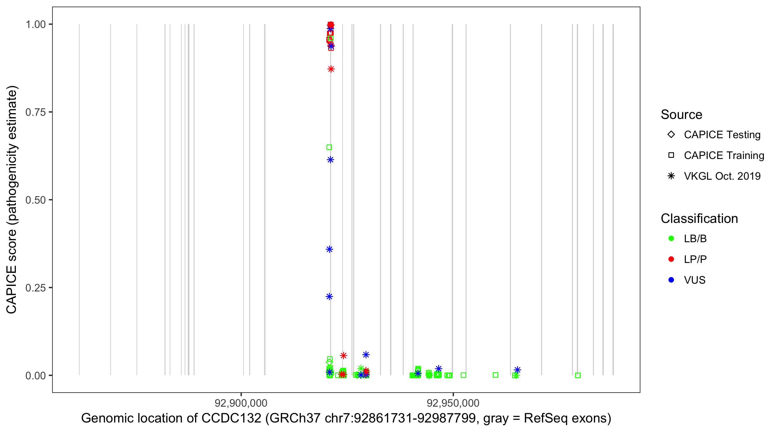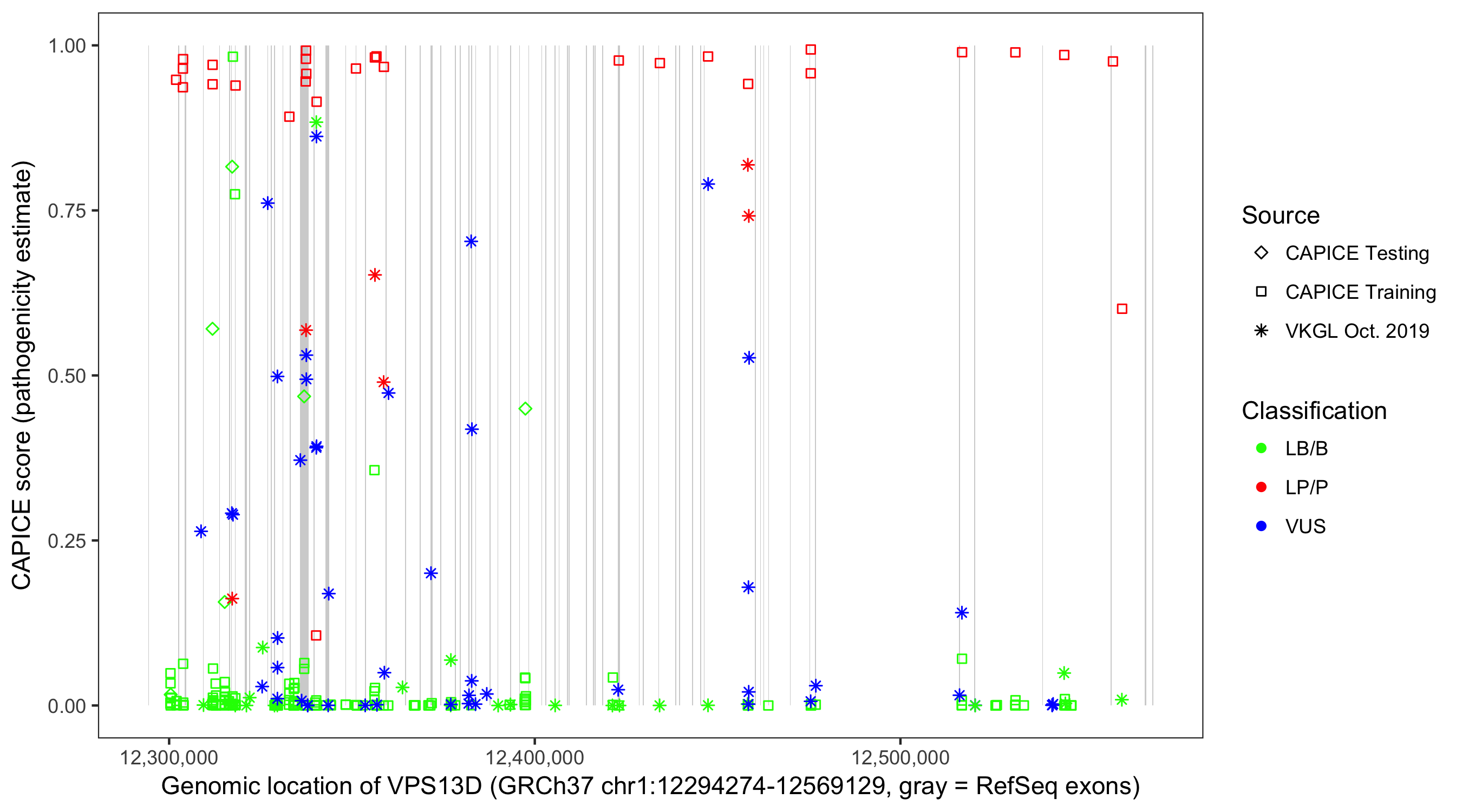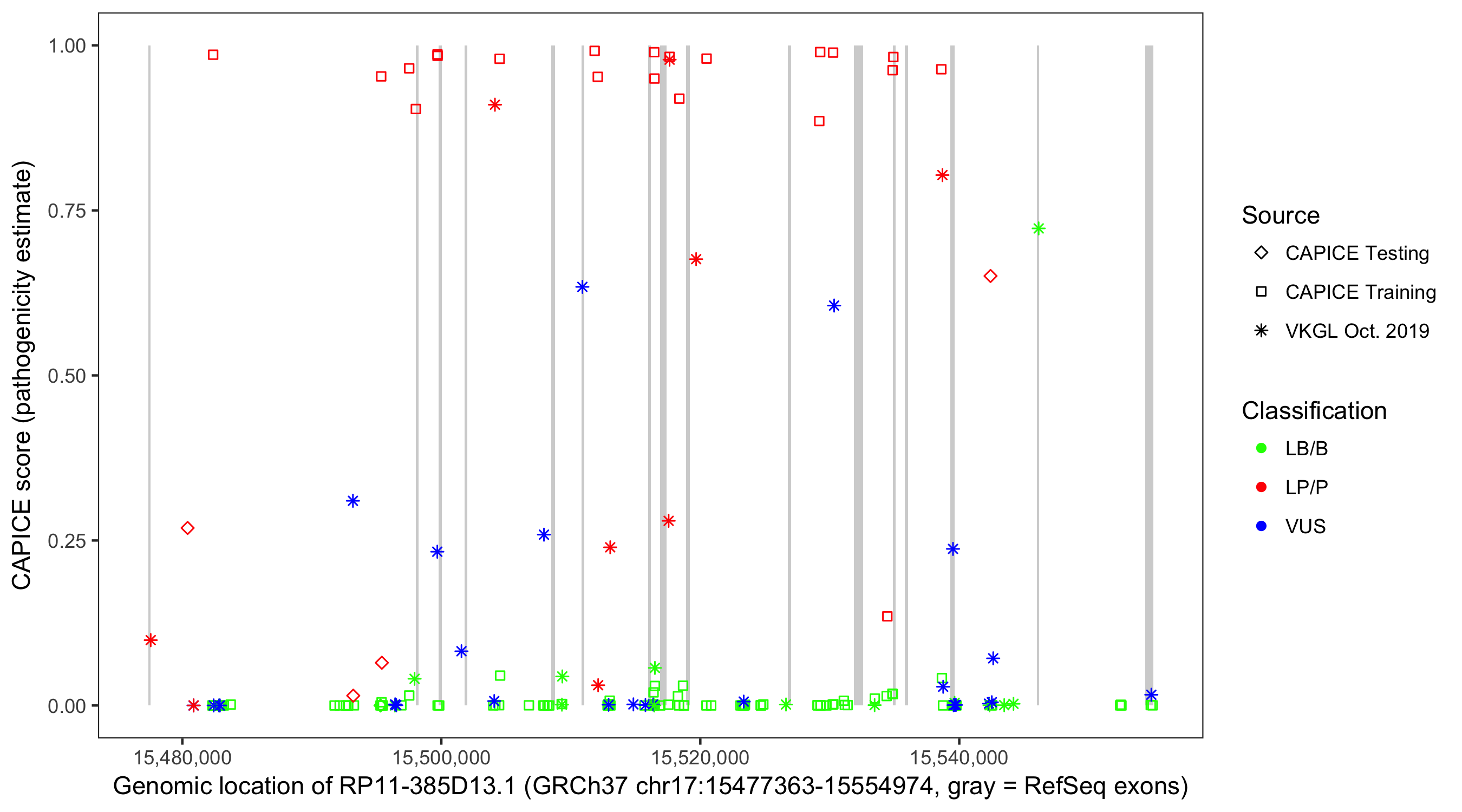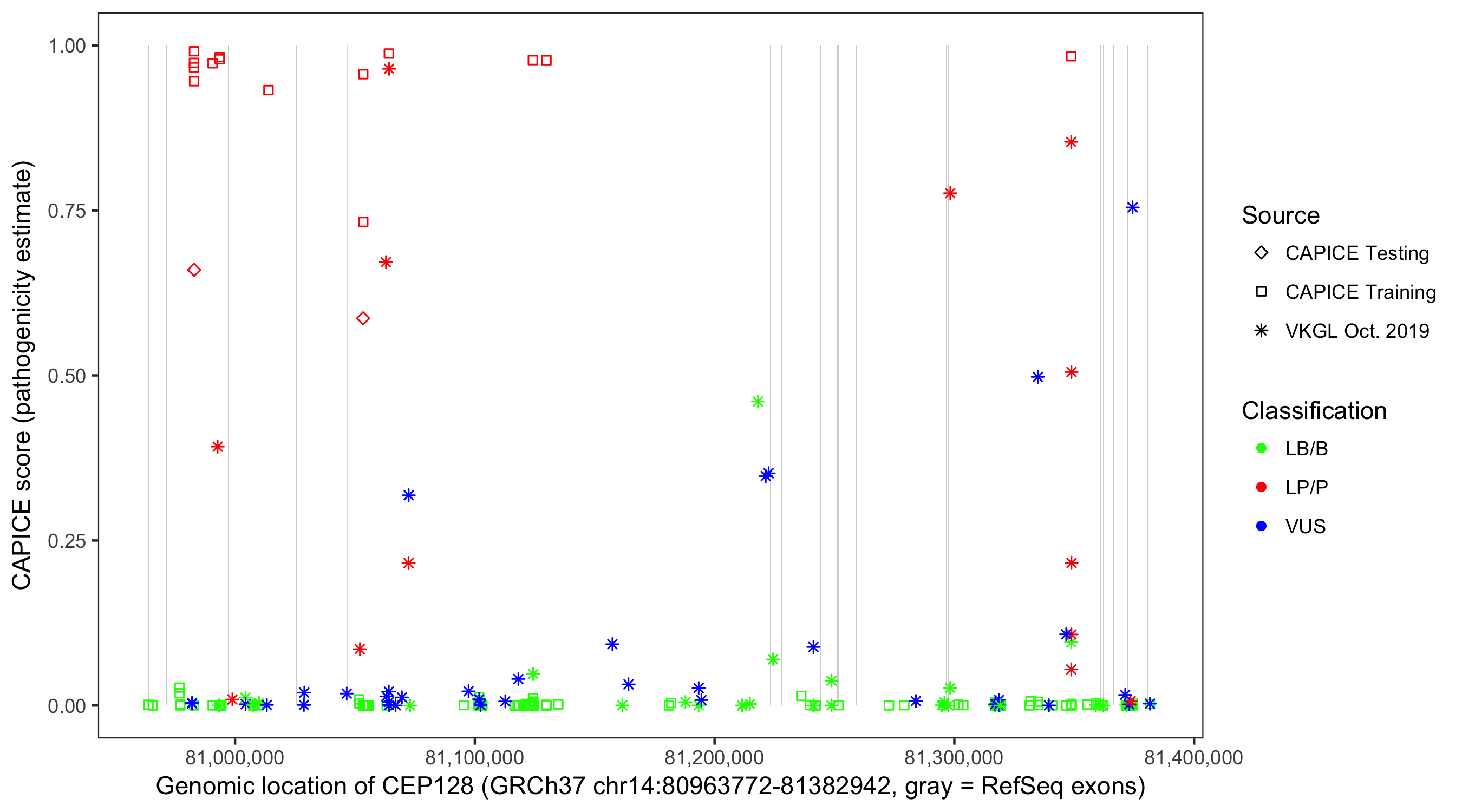 Shown are CAPICE train/test variants plus VKGL Oct 2019.