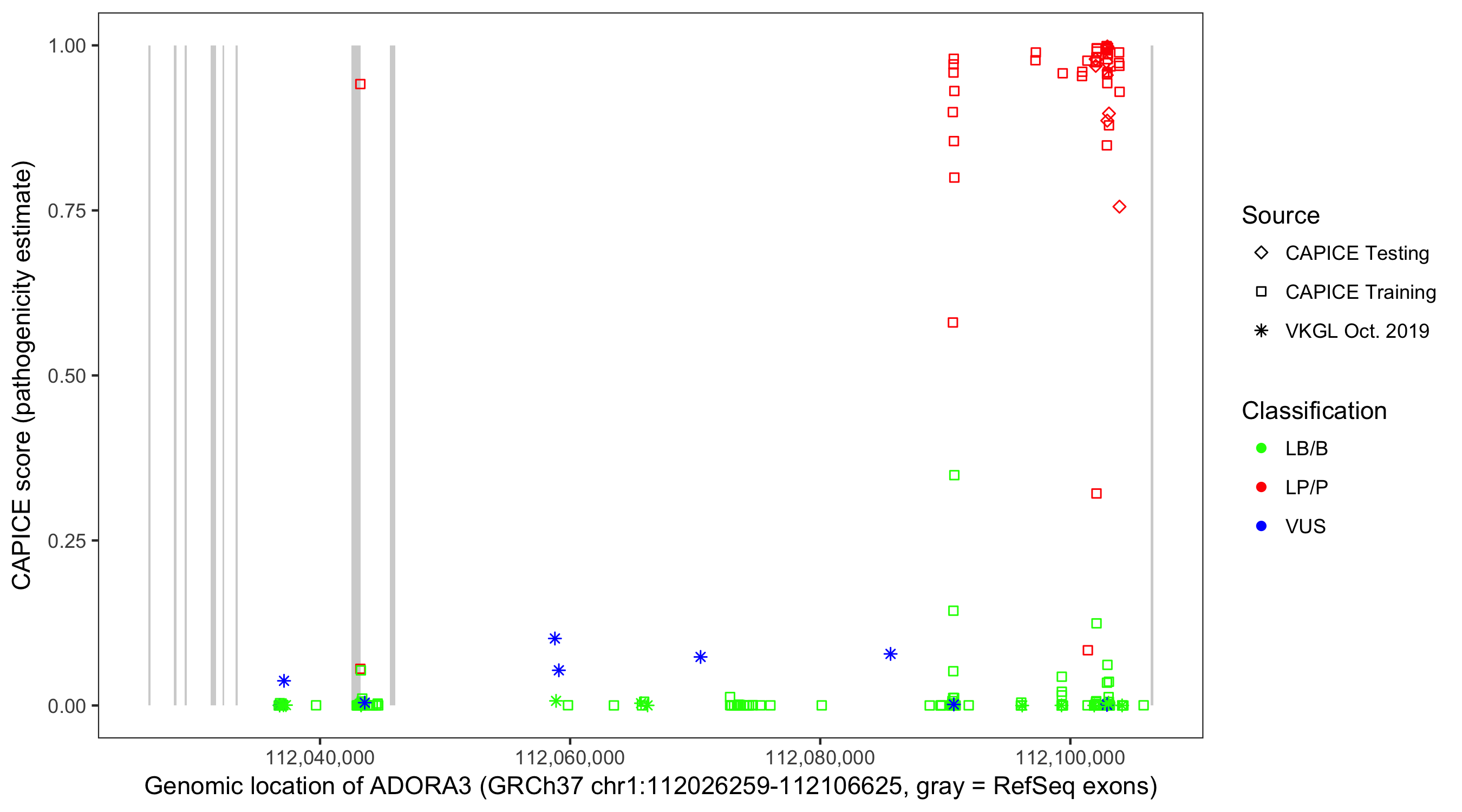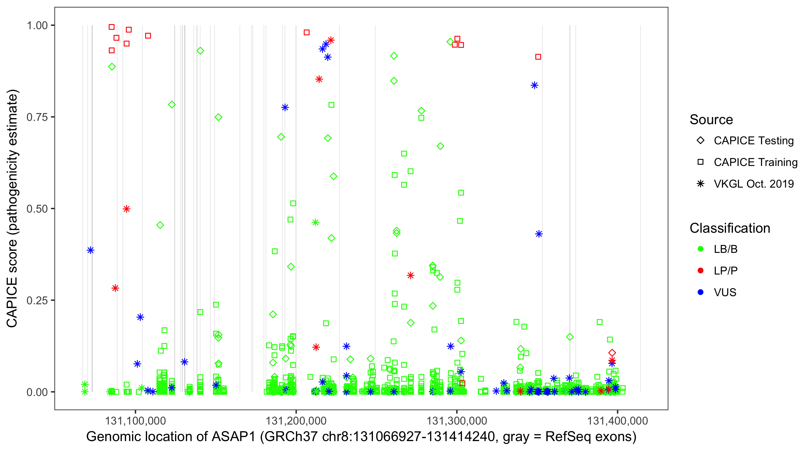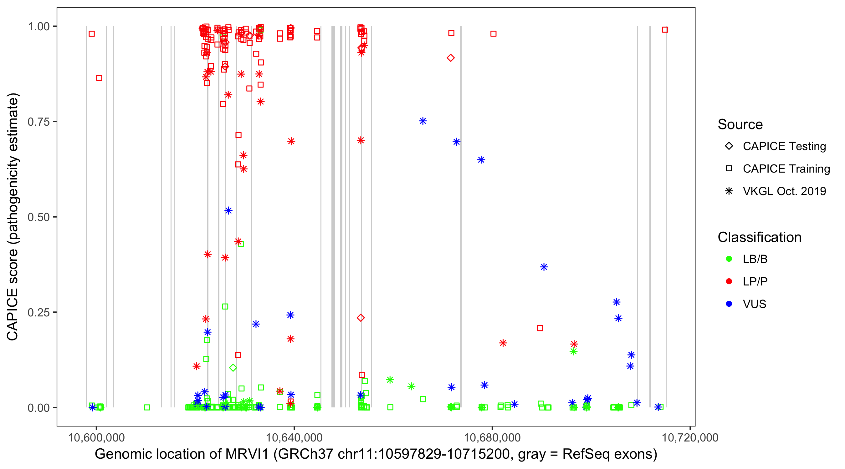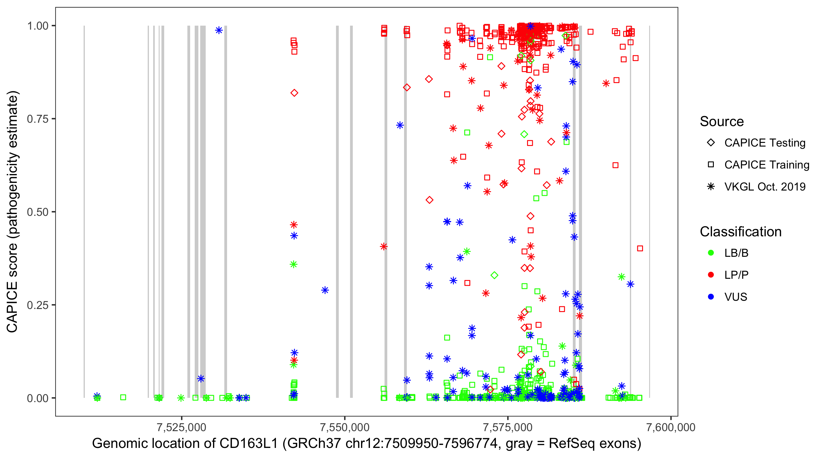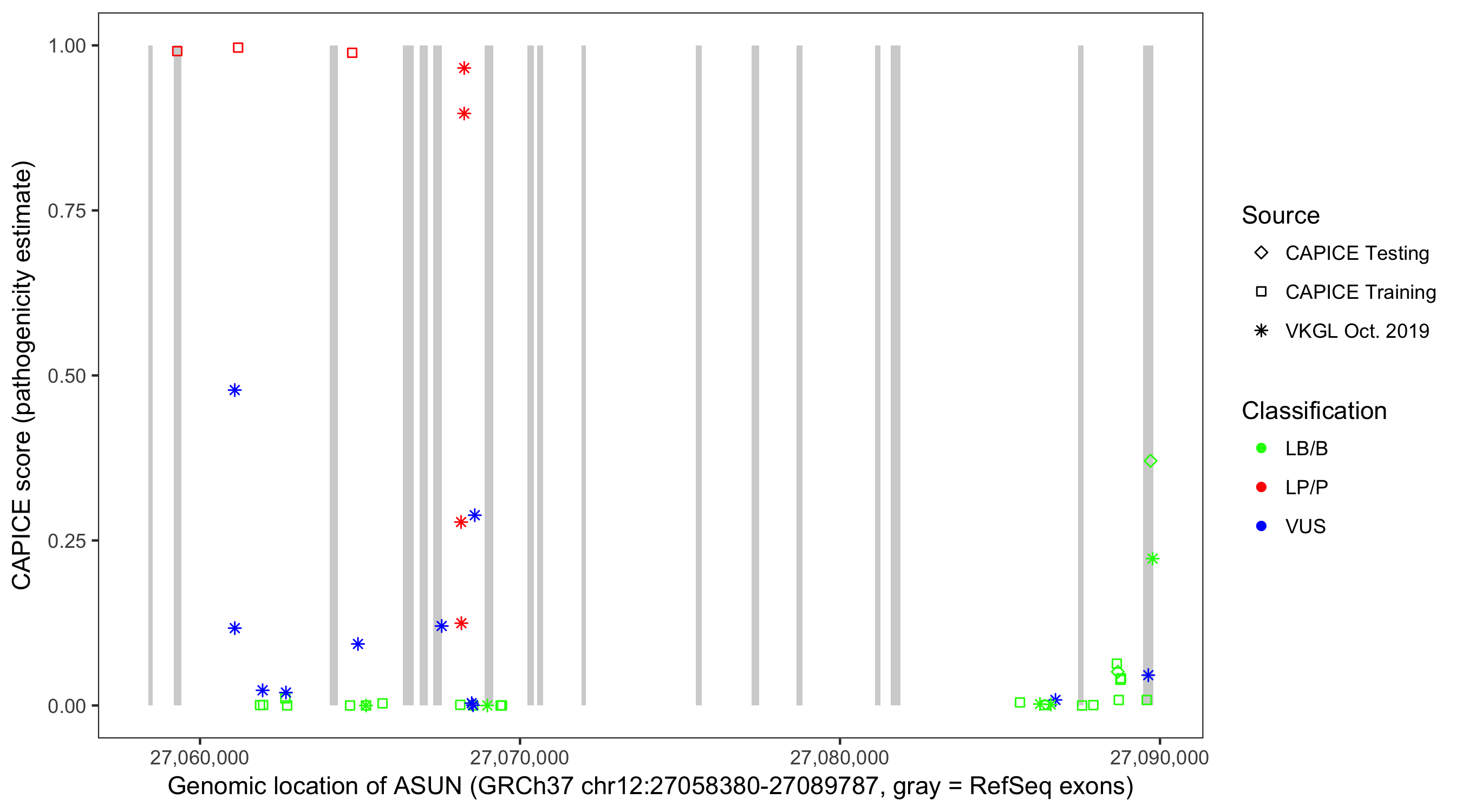 Shown are CAPICE train/test variants plus VKGL Oct 2019.