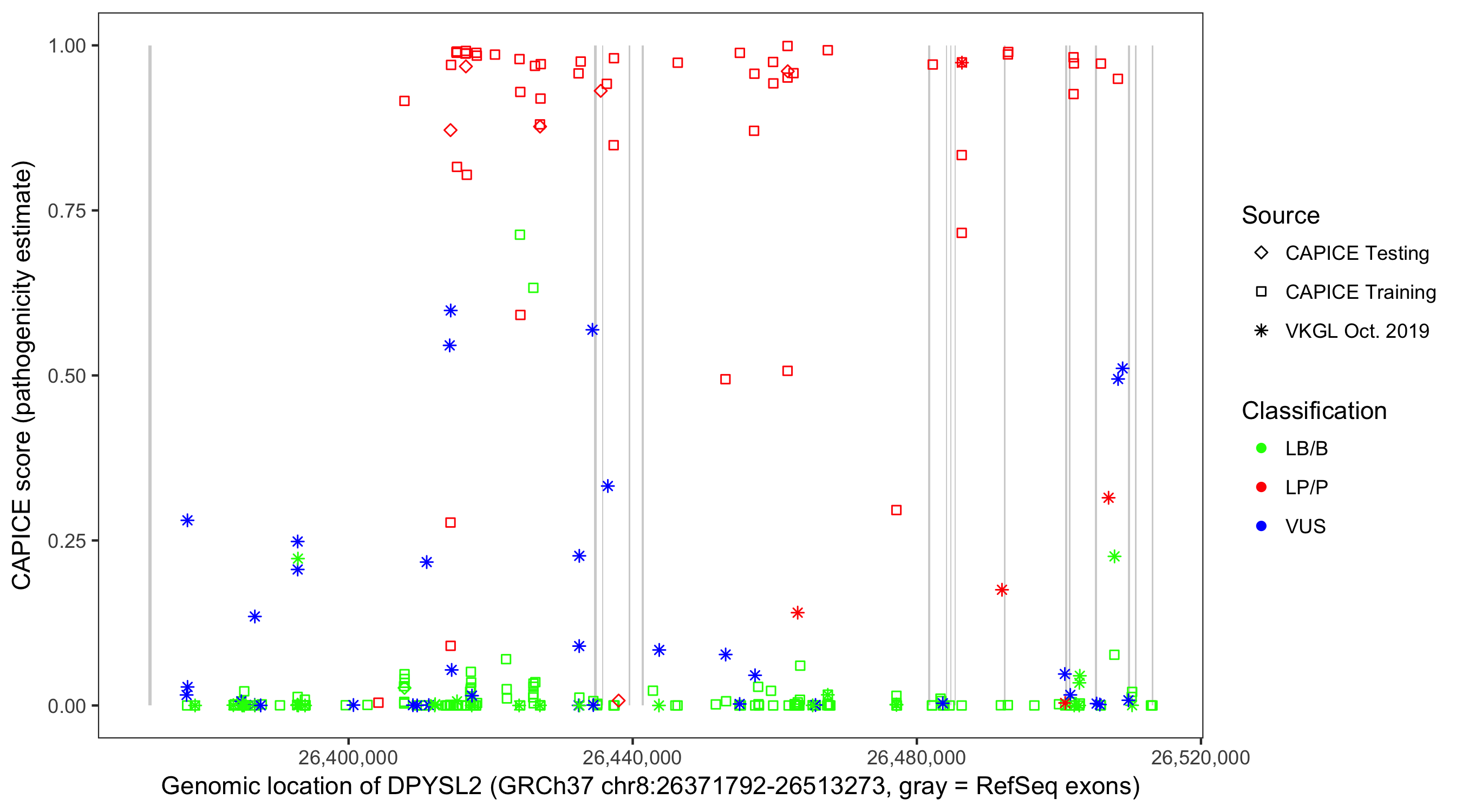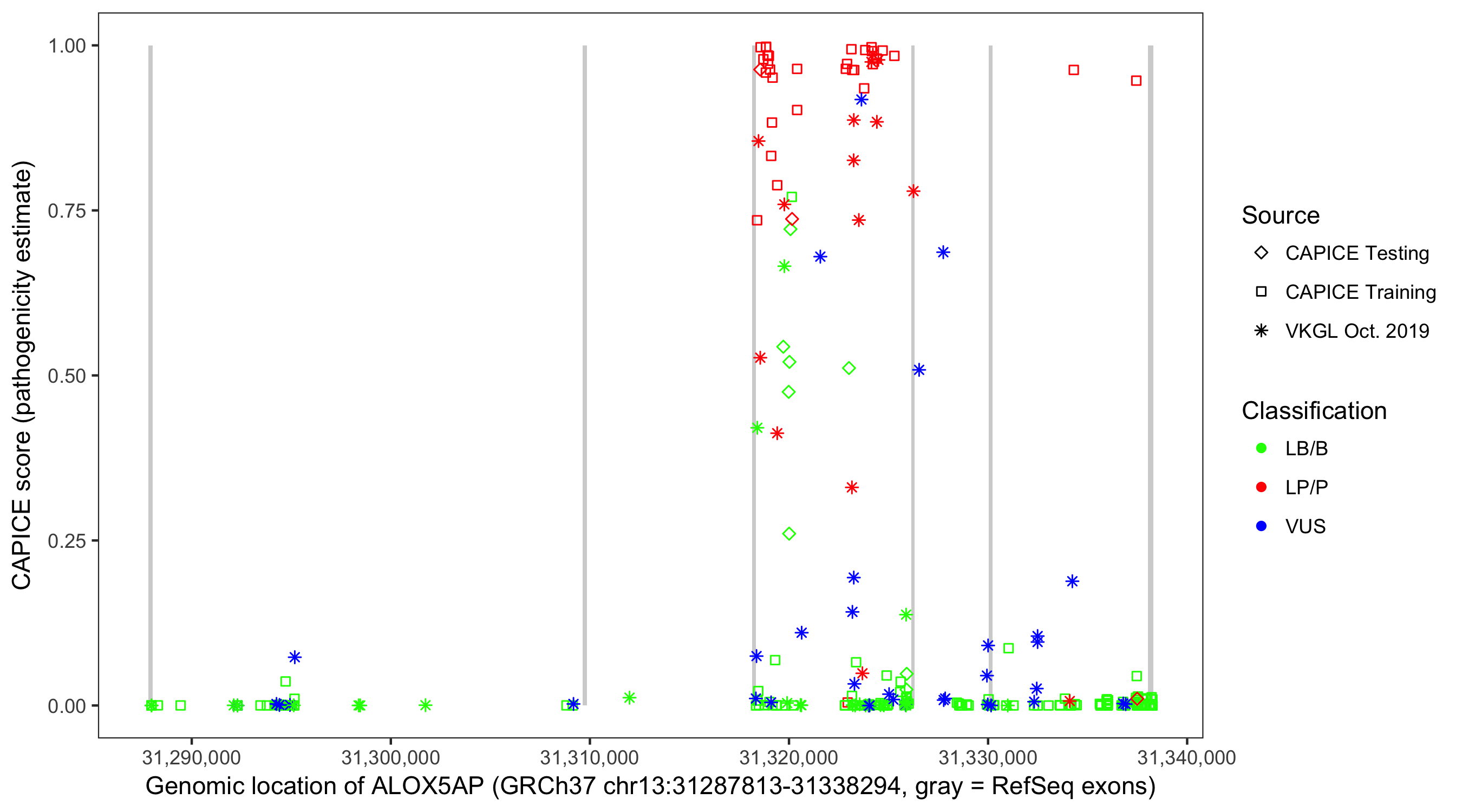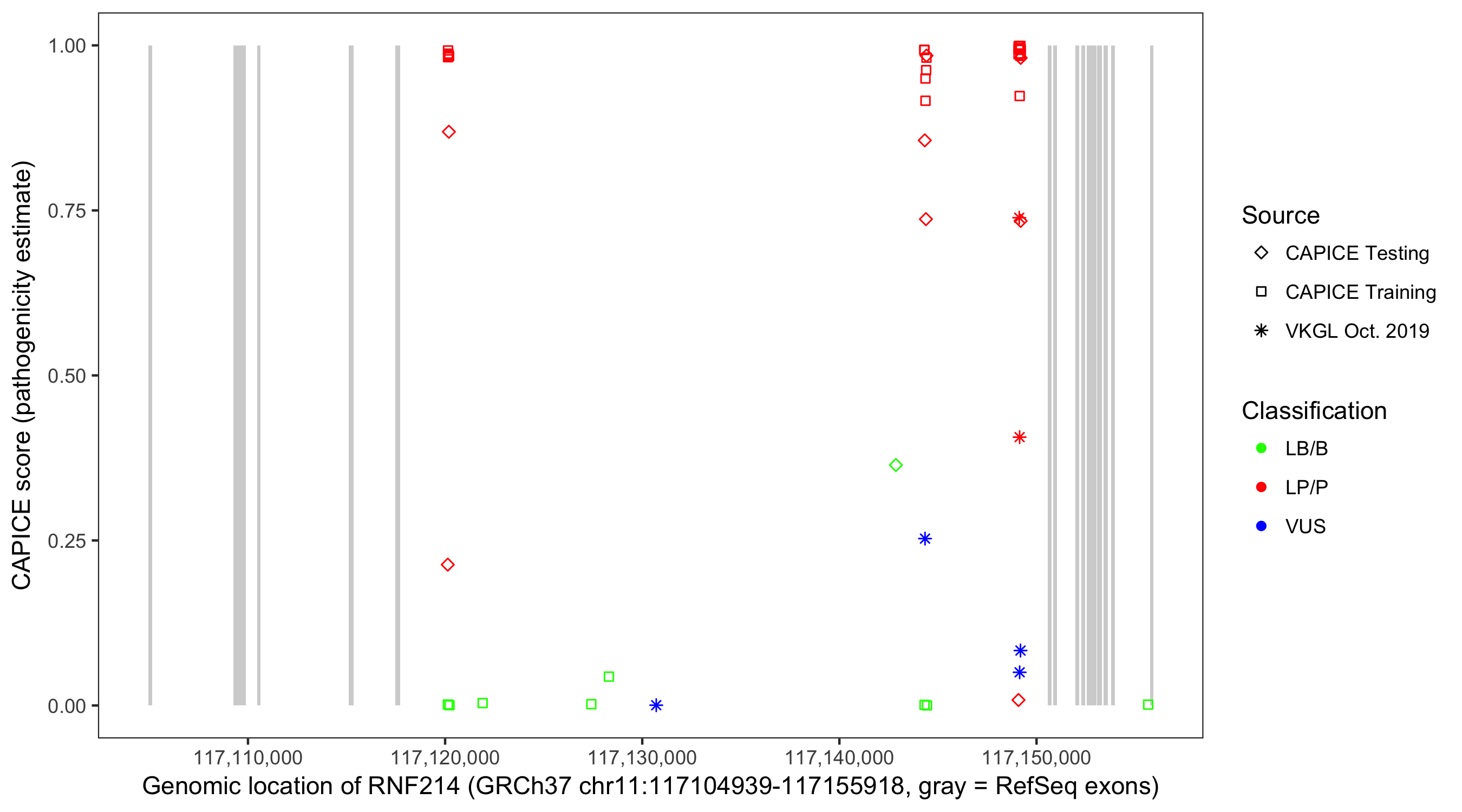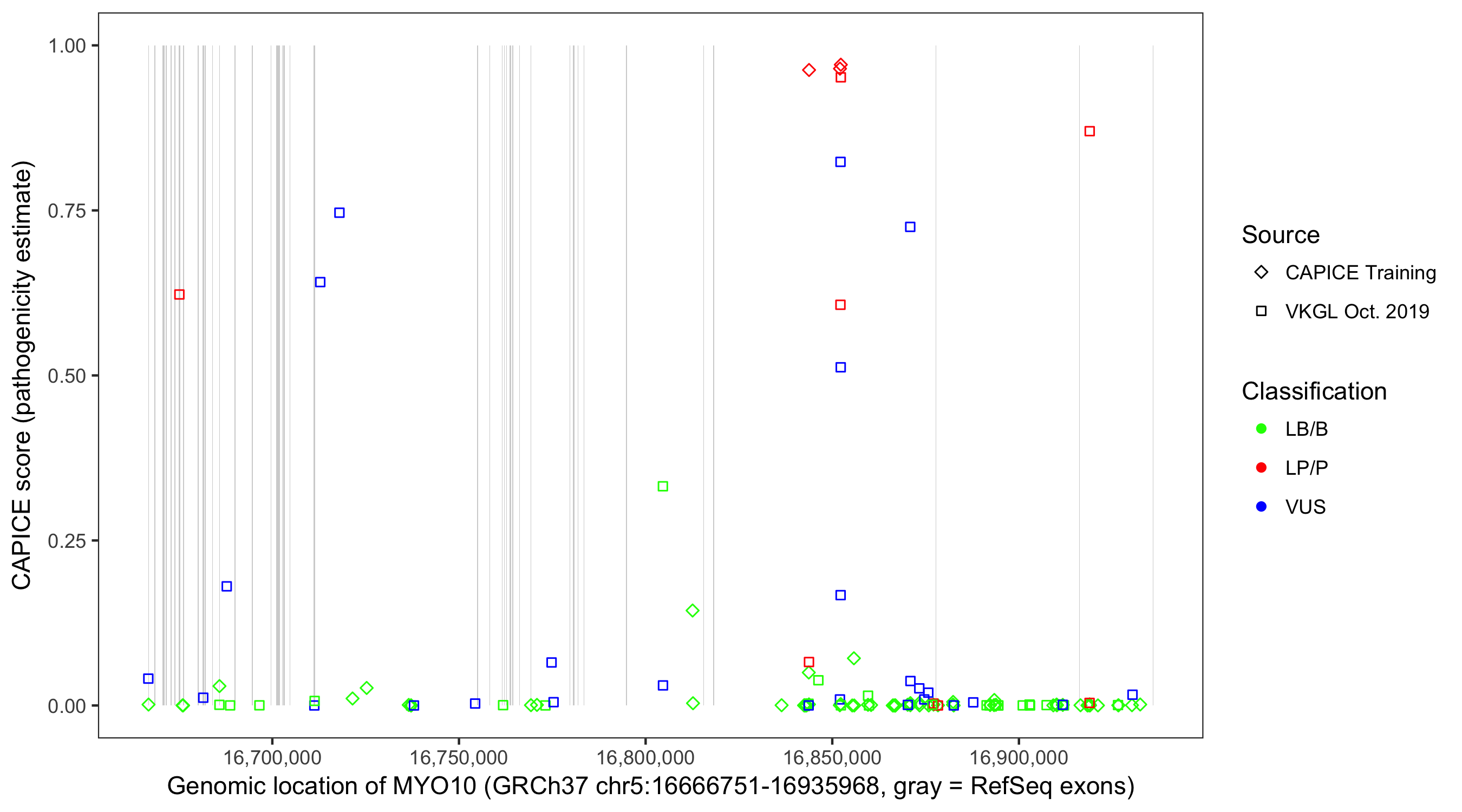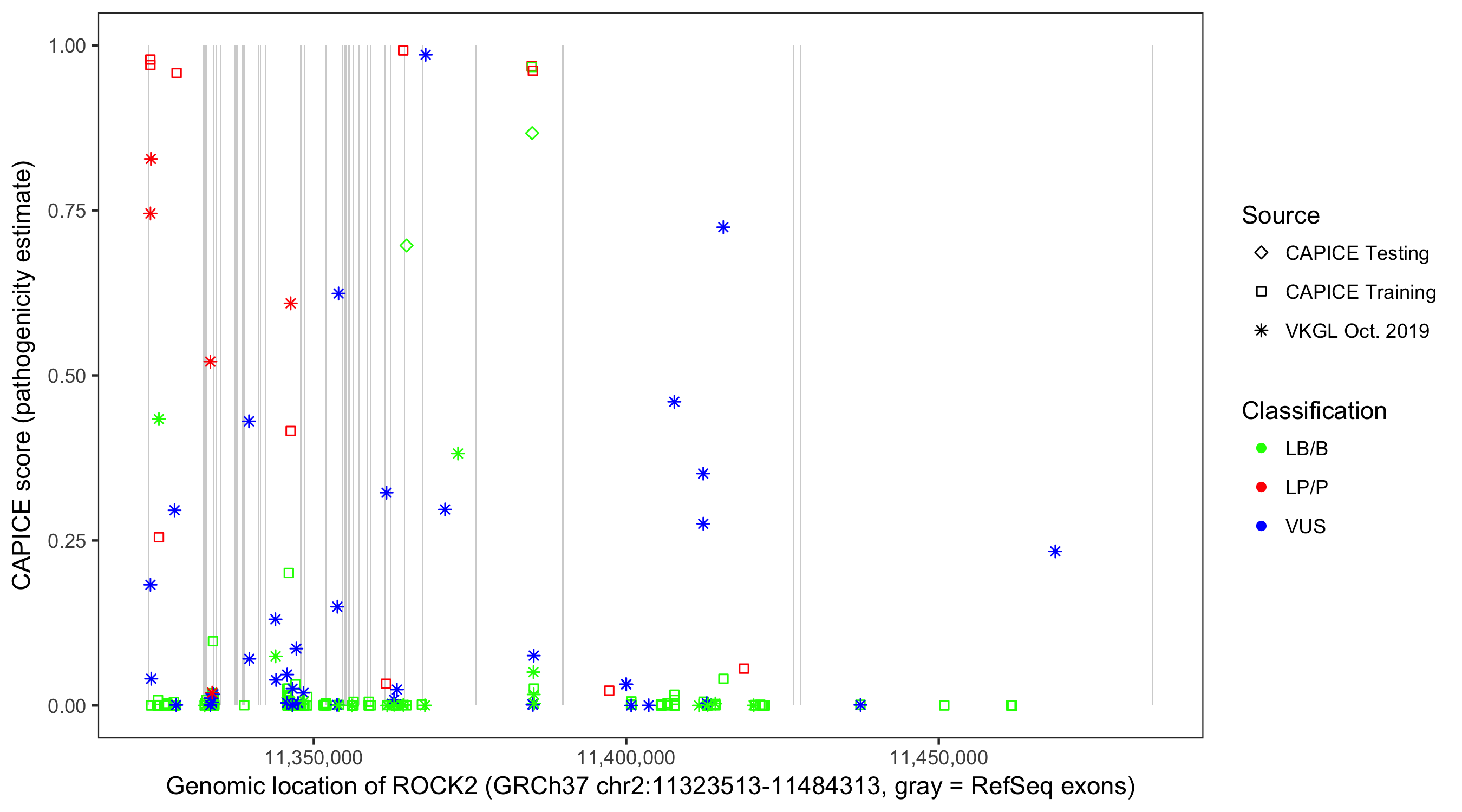 Shown are CAPICE train/test variants plus VKGL Oct 2019.