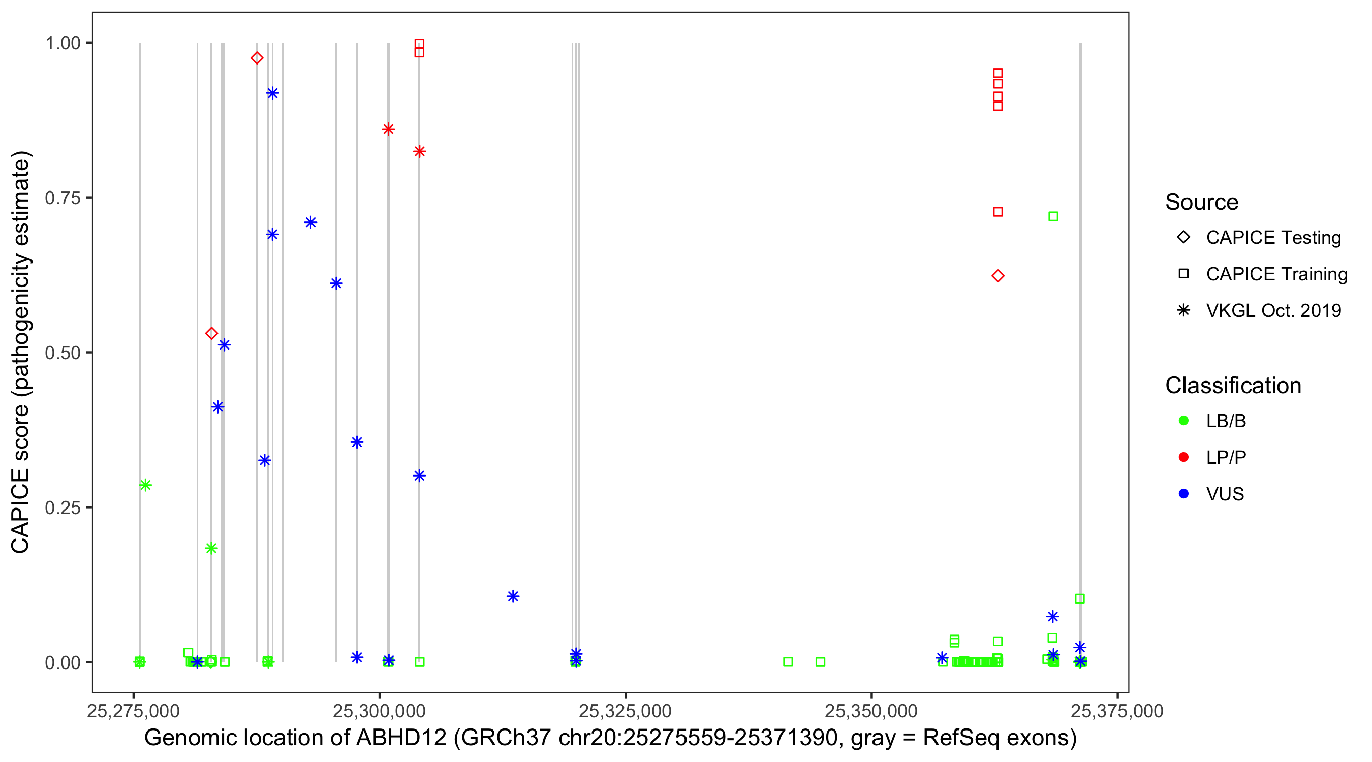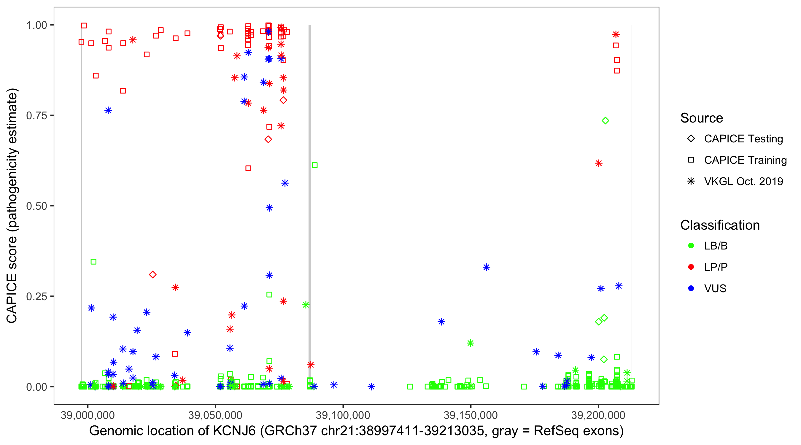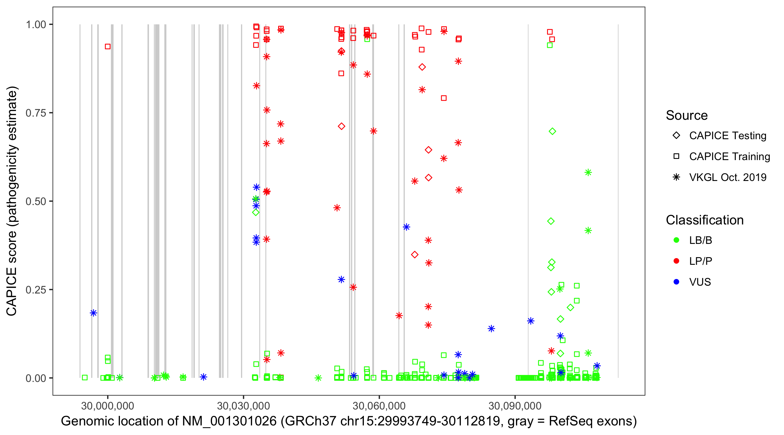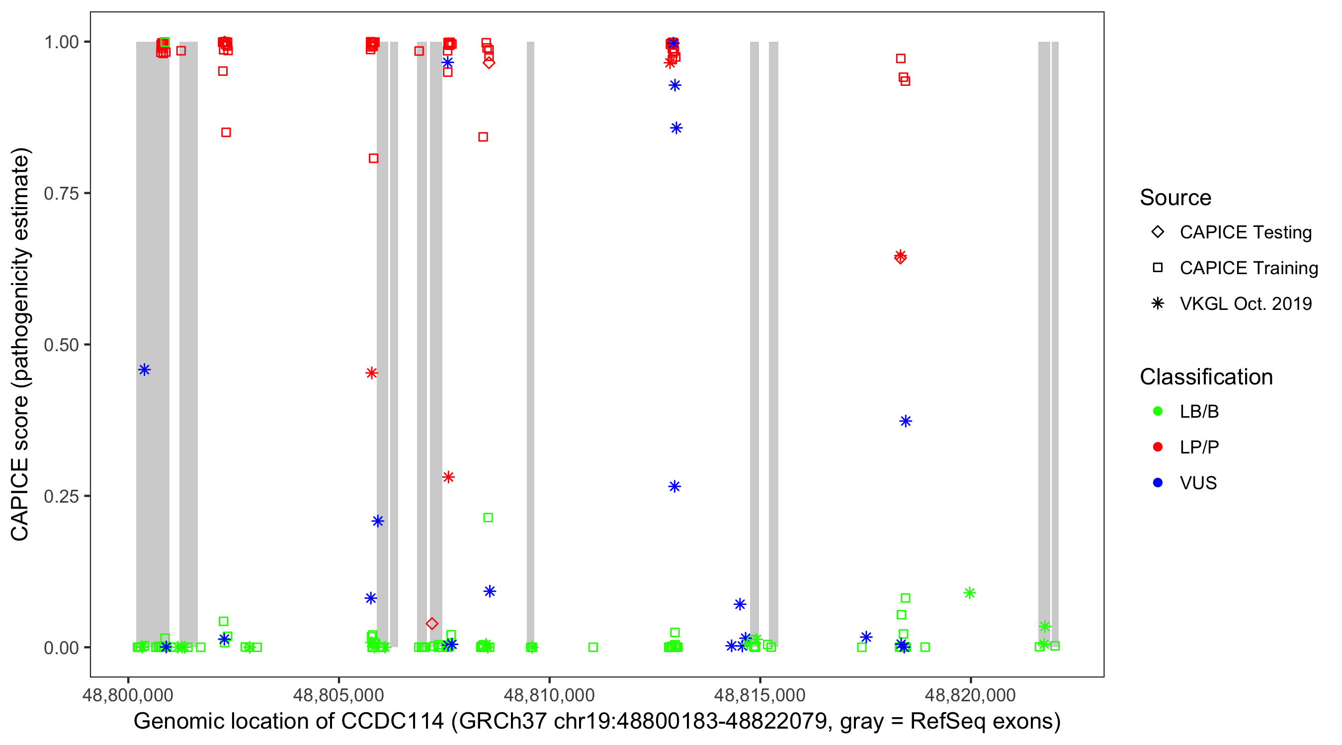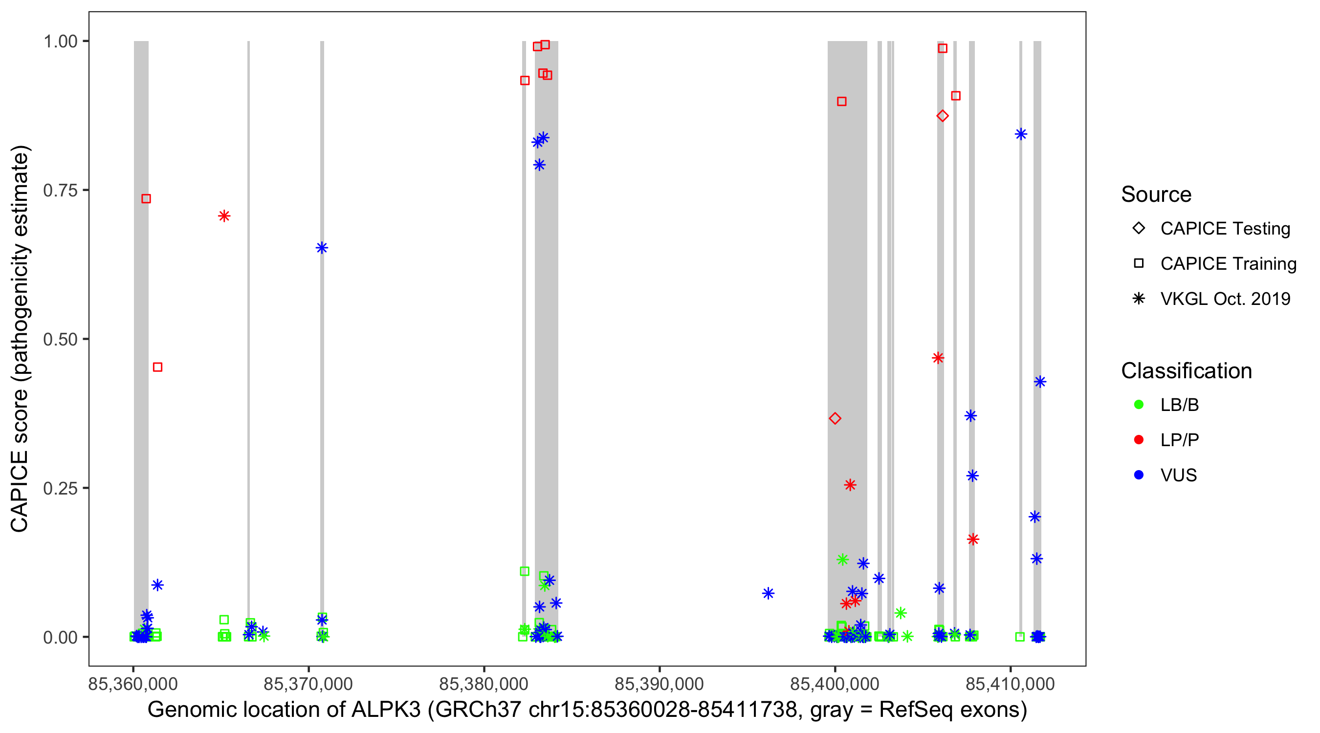 Shown are CAPICE train/test variants plus VKGL Oct 2019.