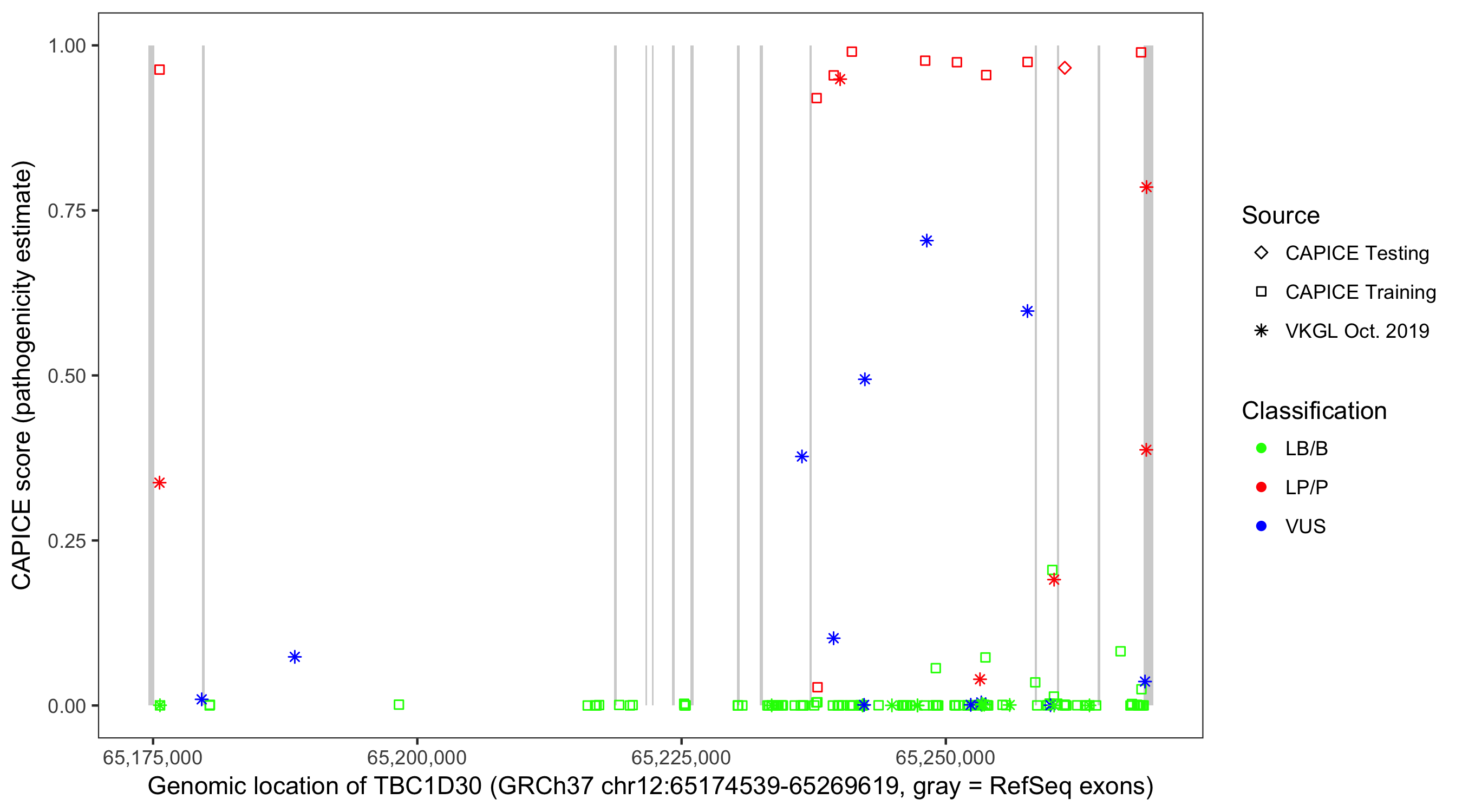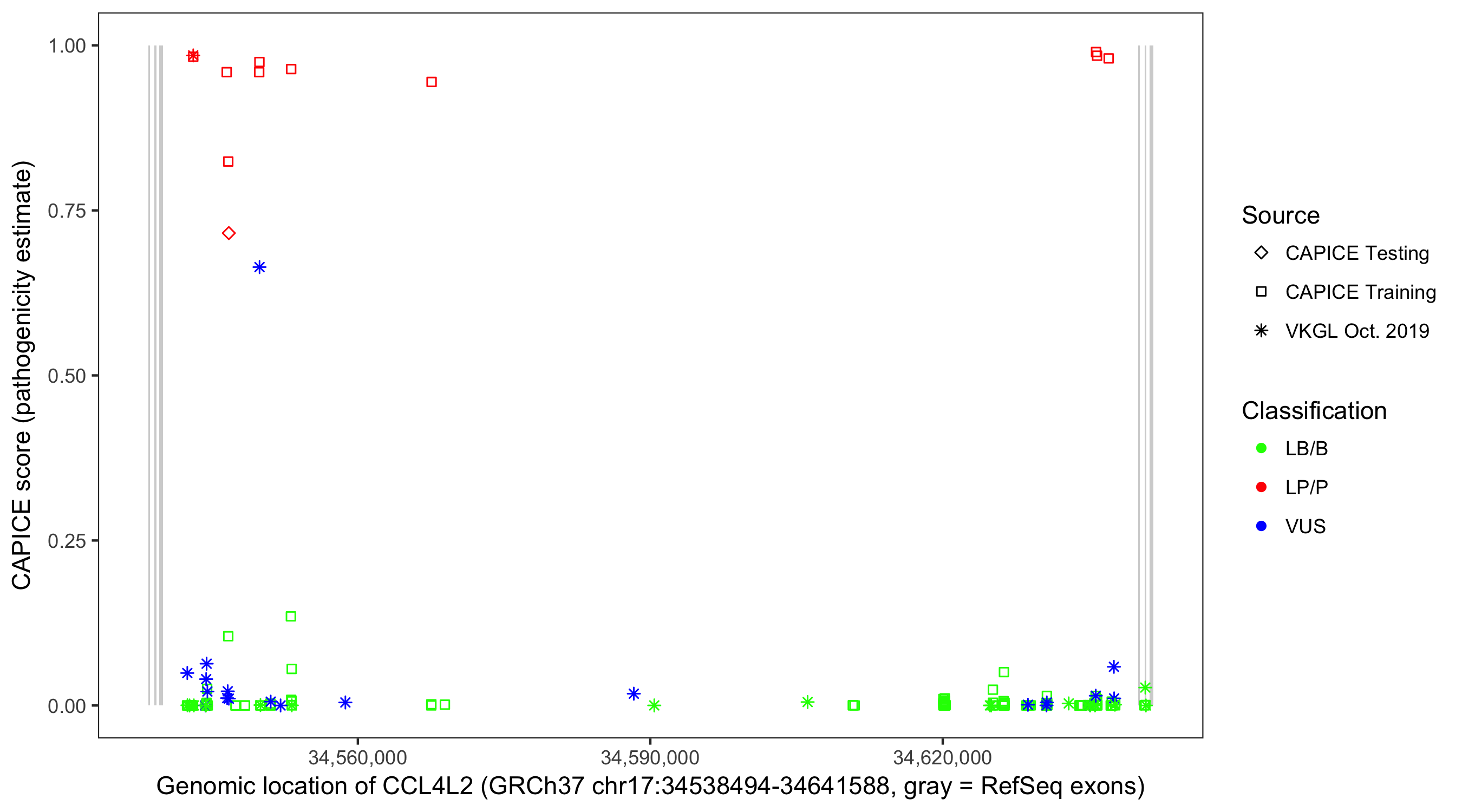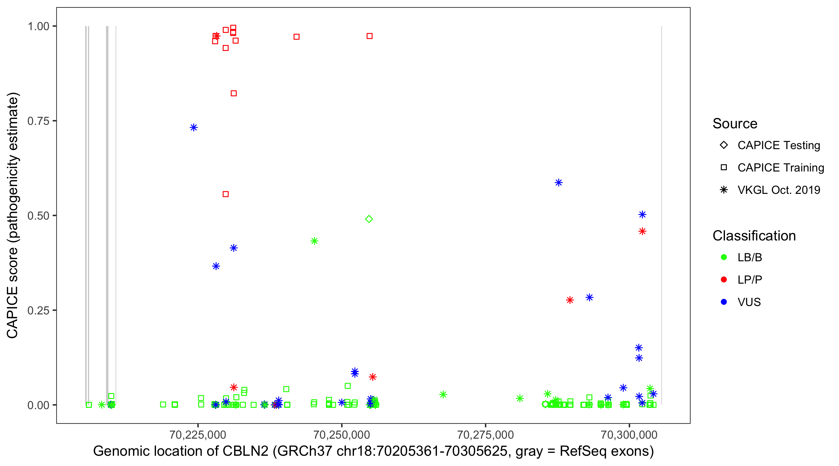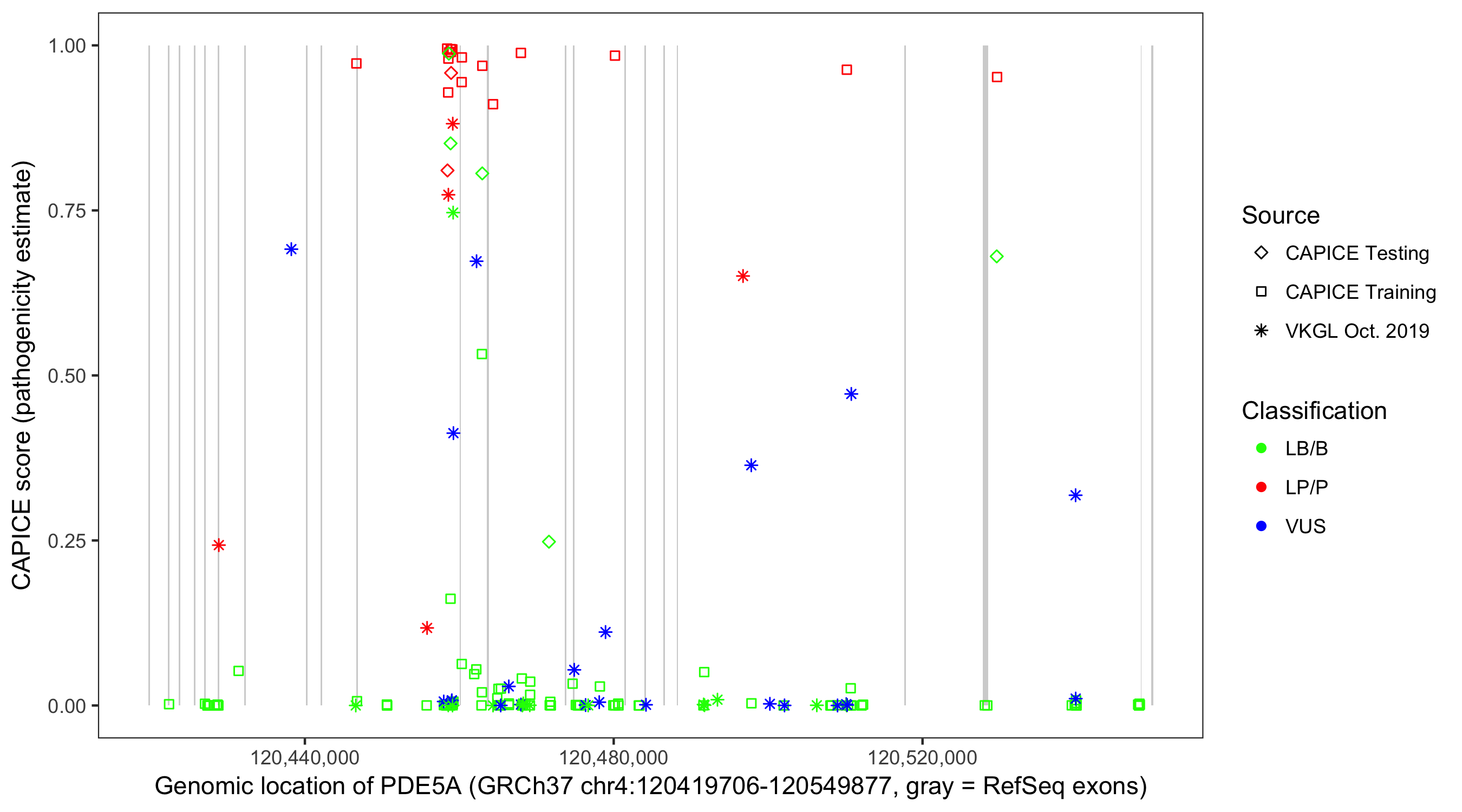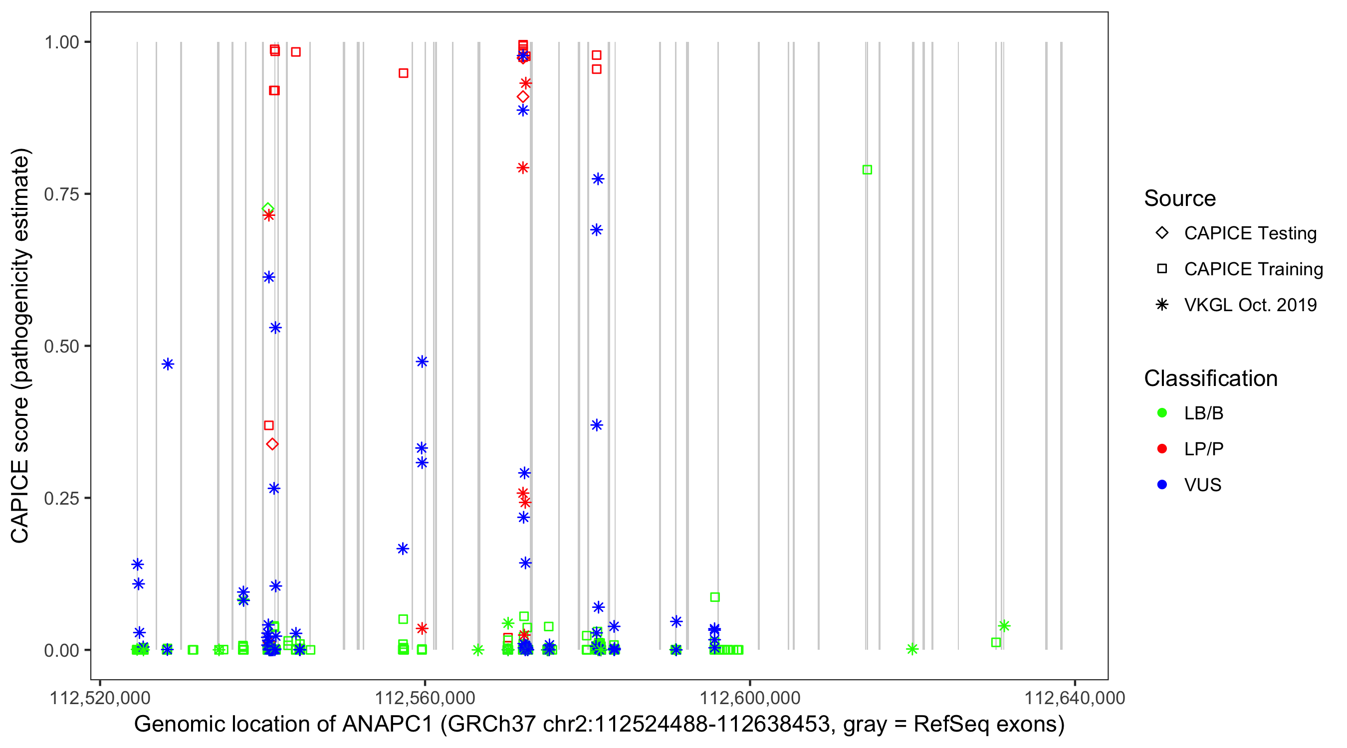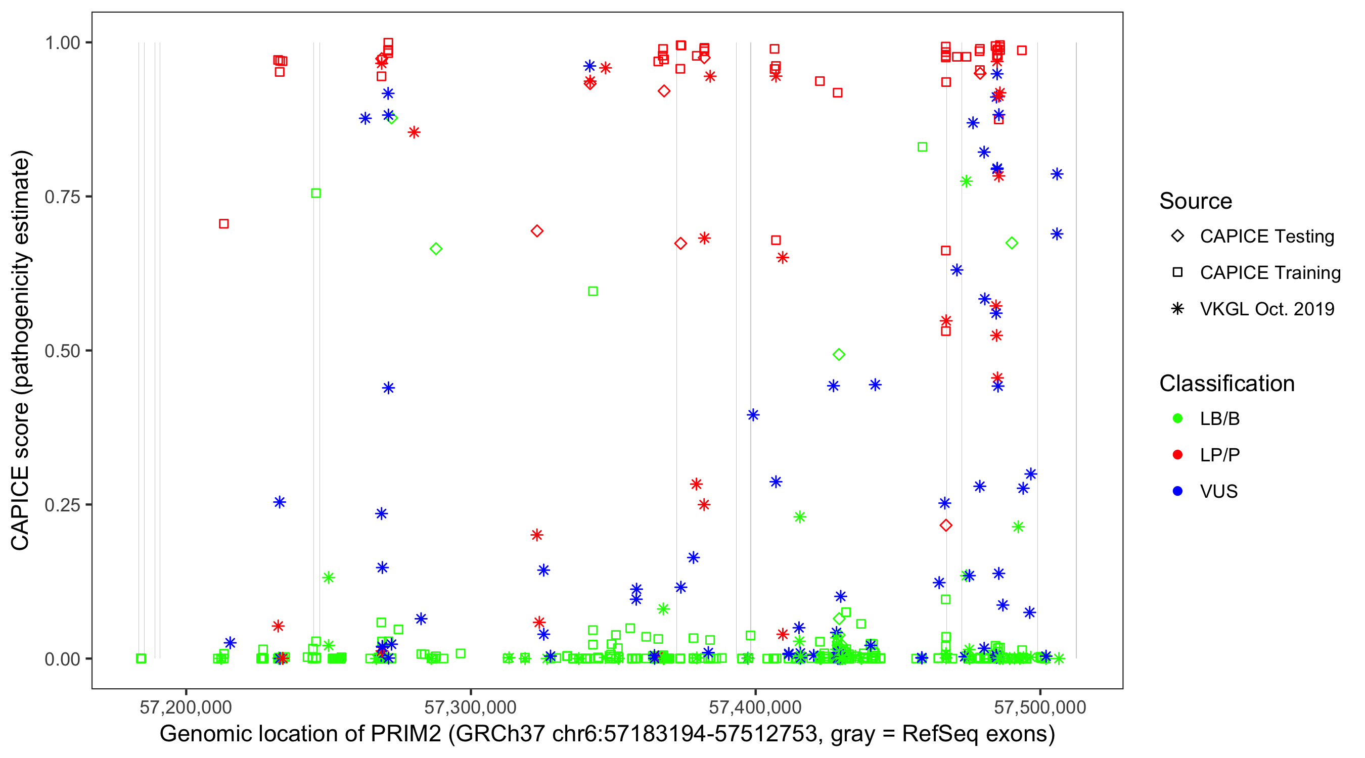 Shown are CAPICE train/test variants plus VKGL Oct 2019.