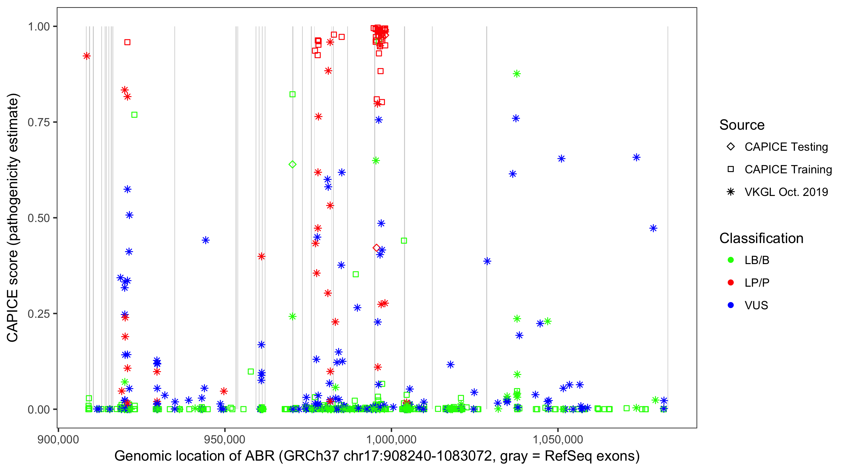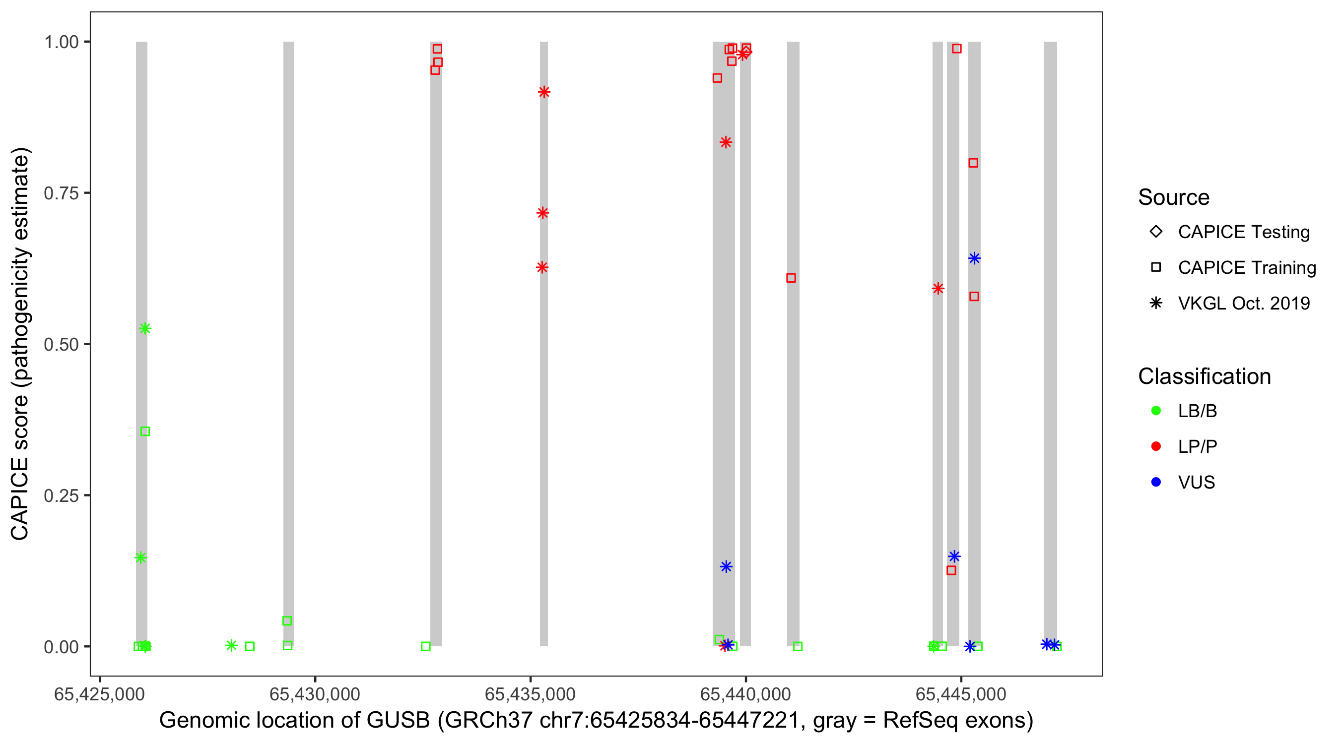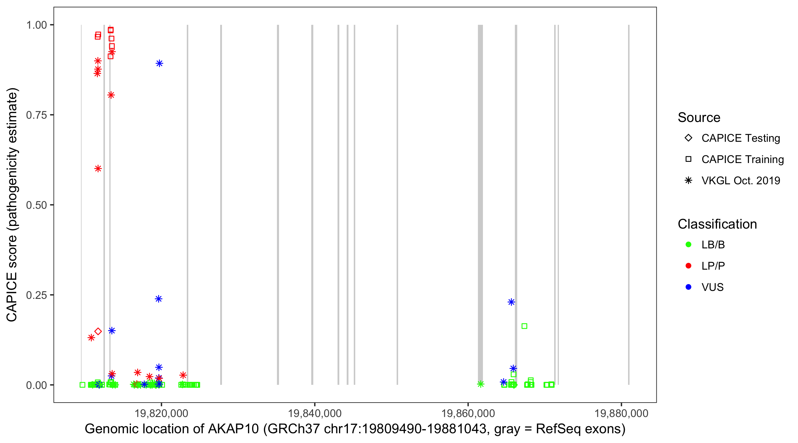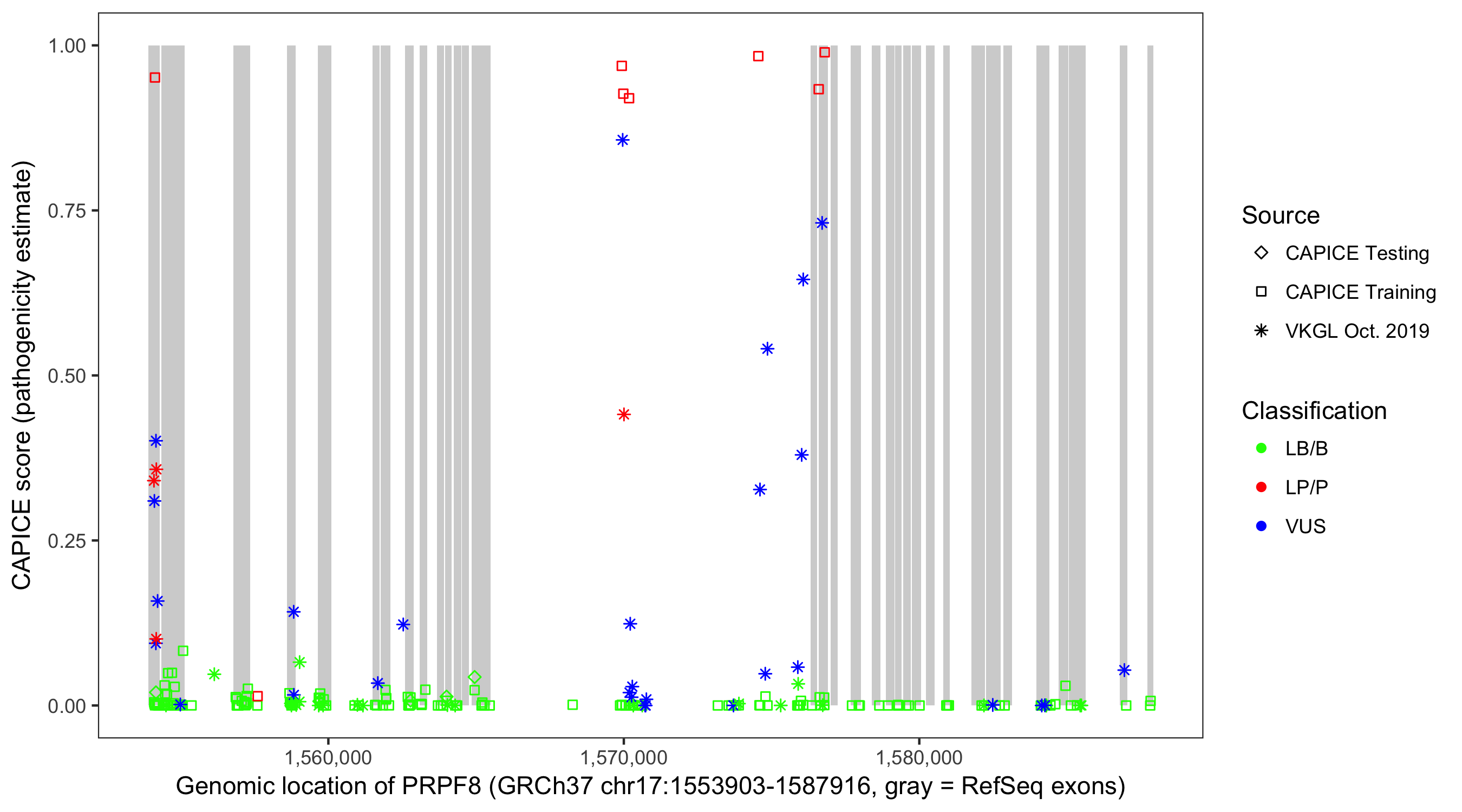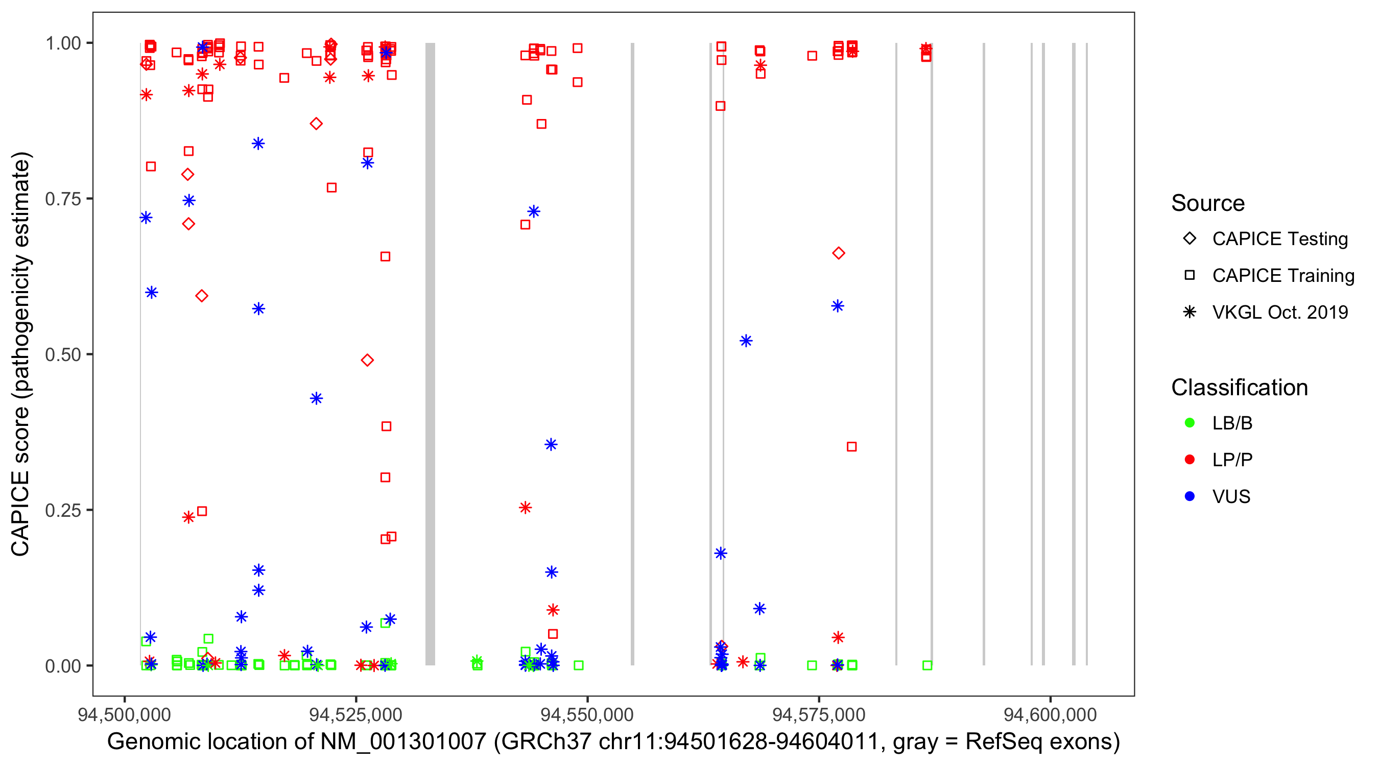 Shown are CAPICE train/test variants plus VKGL Oct 2019.
