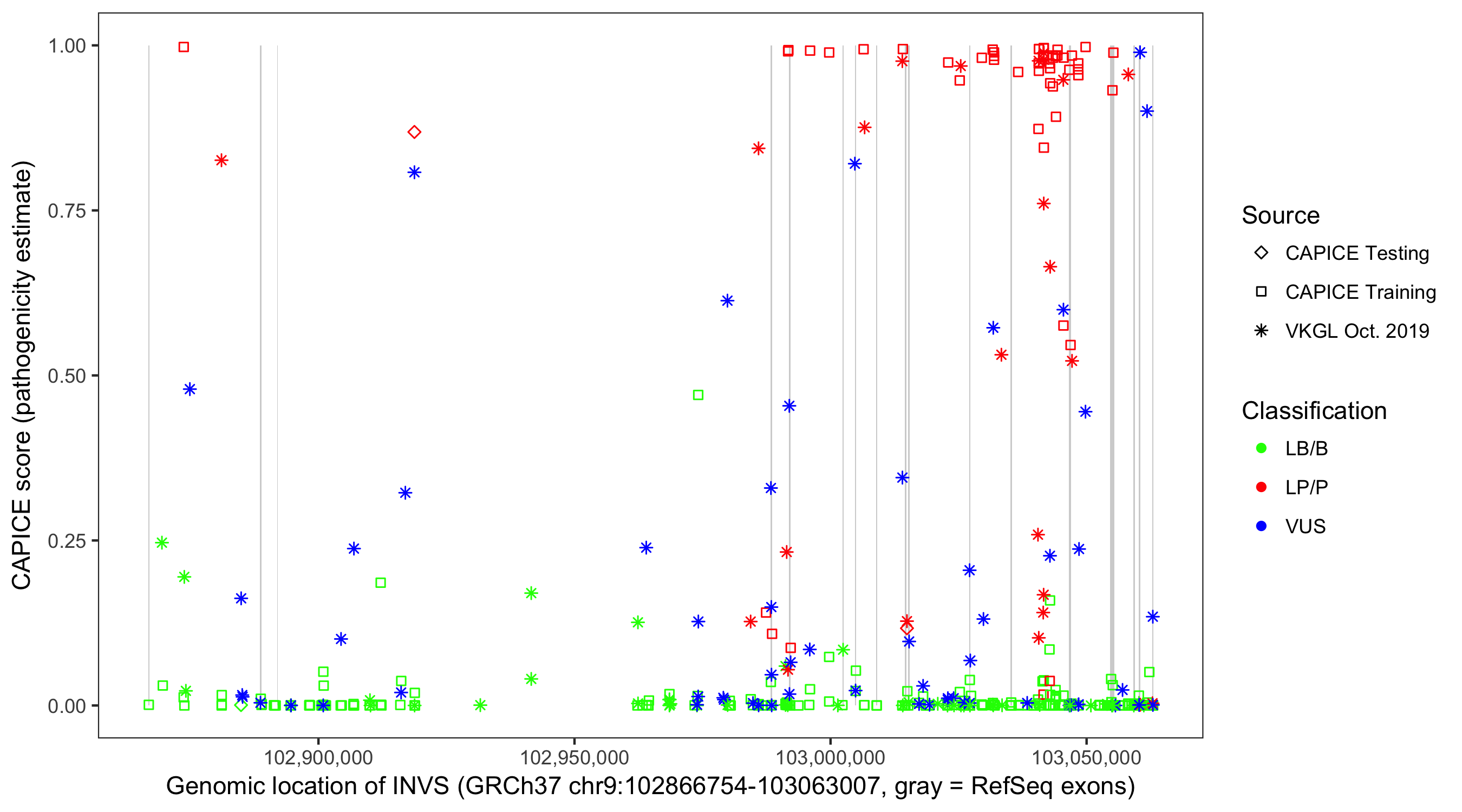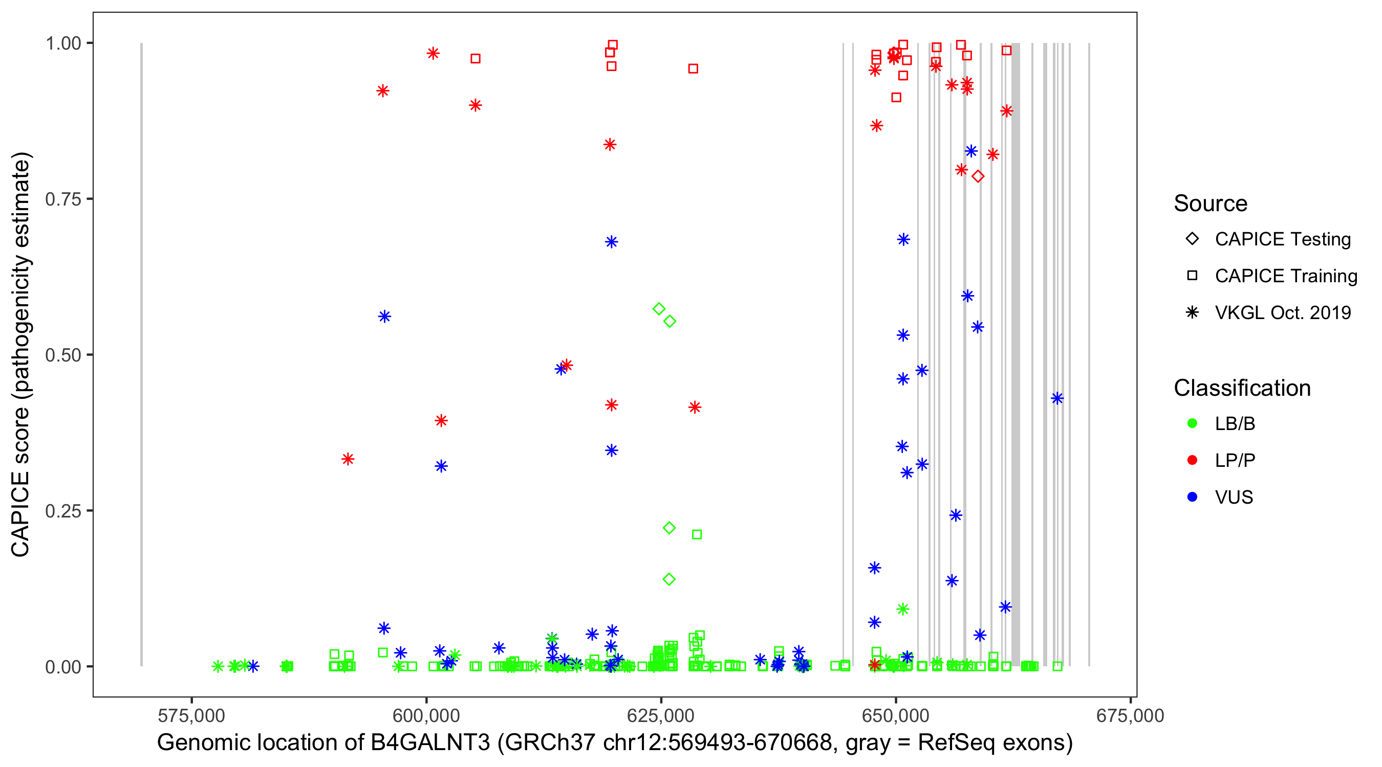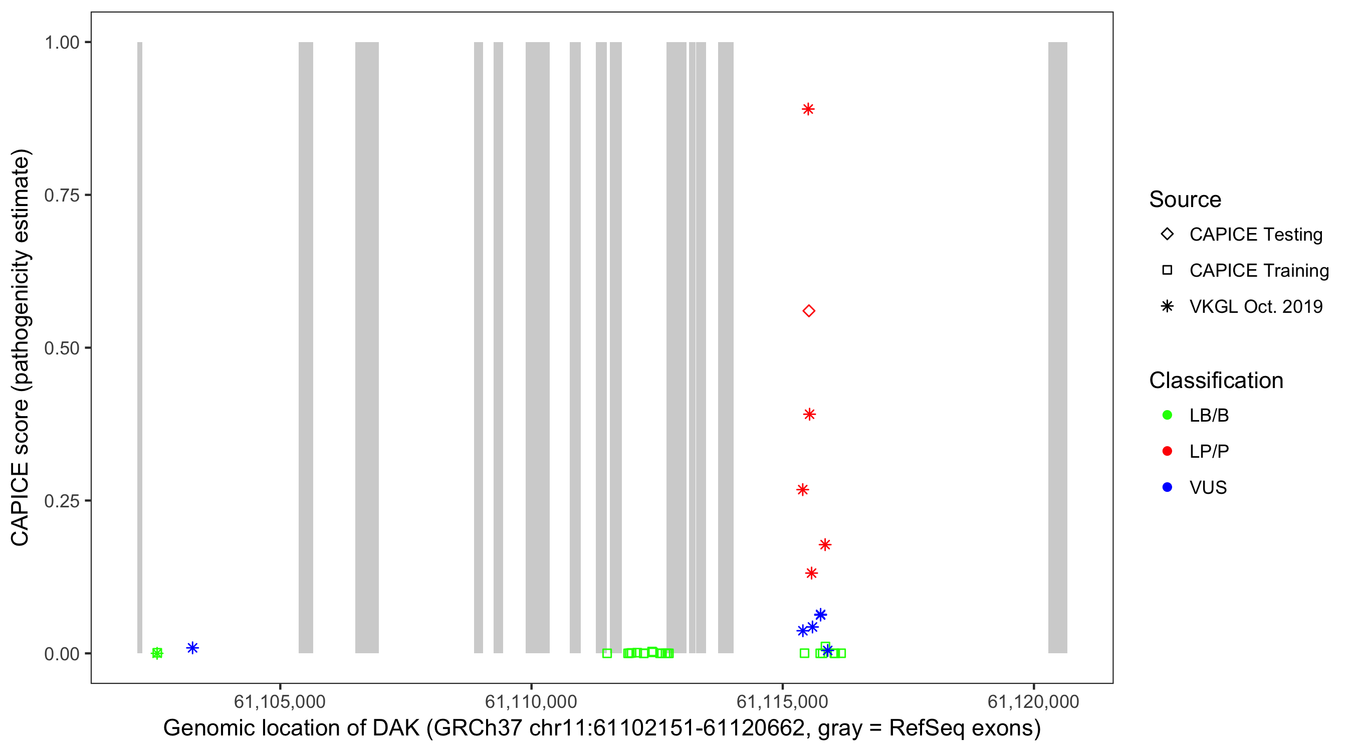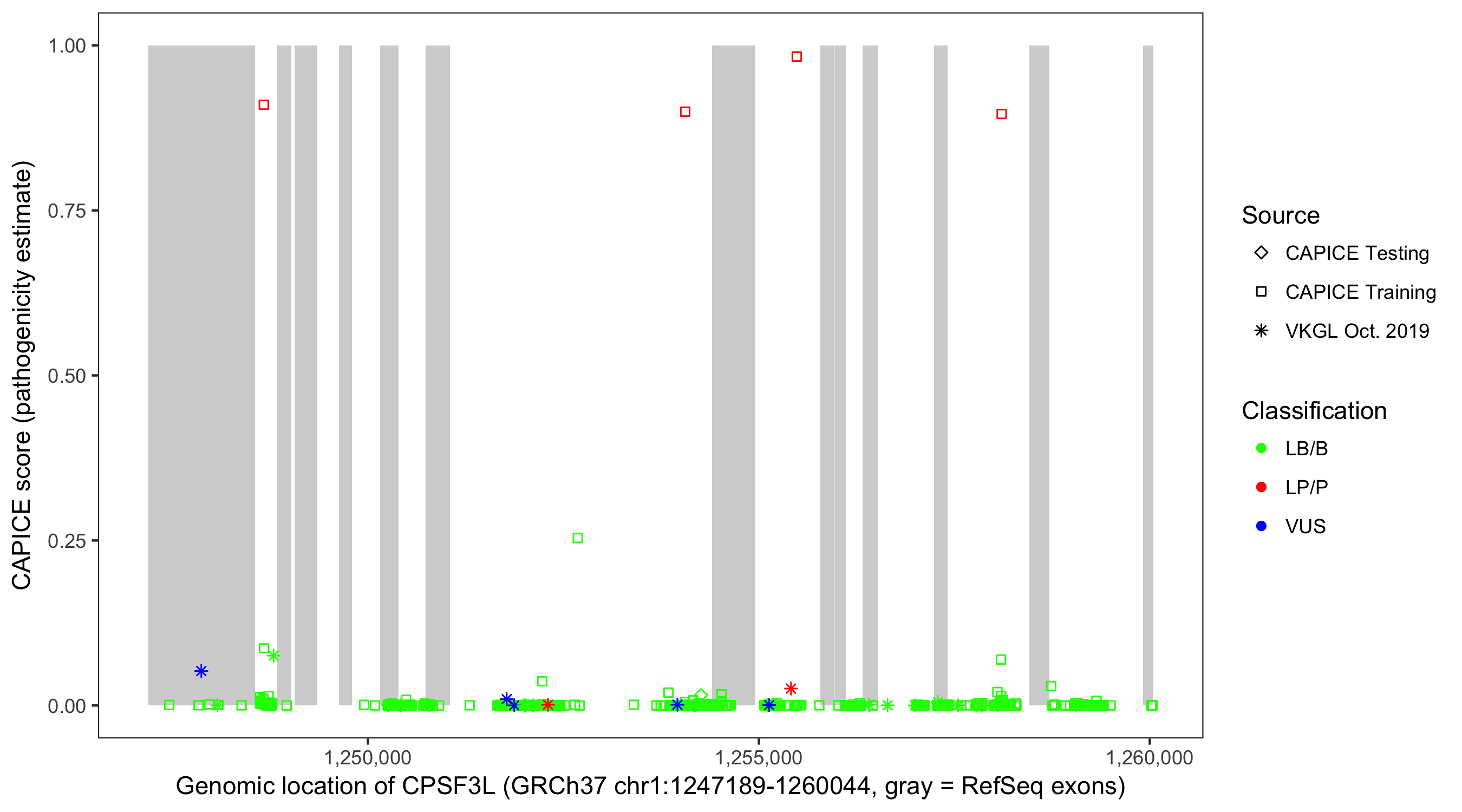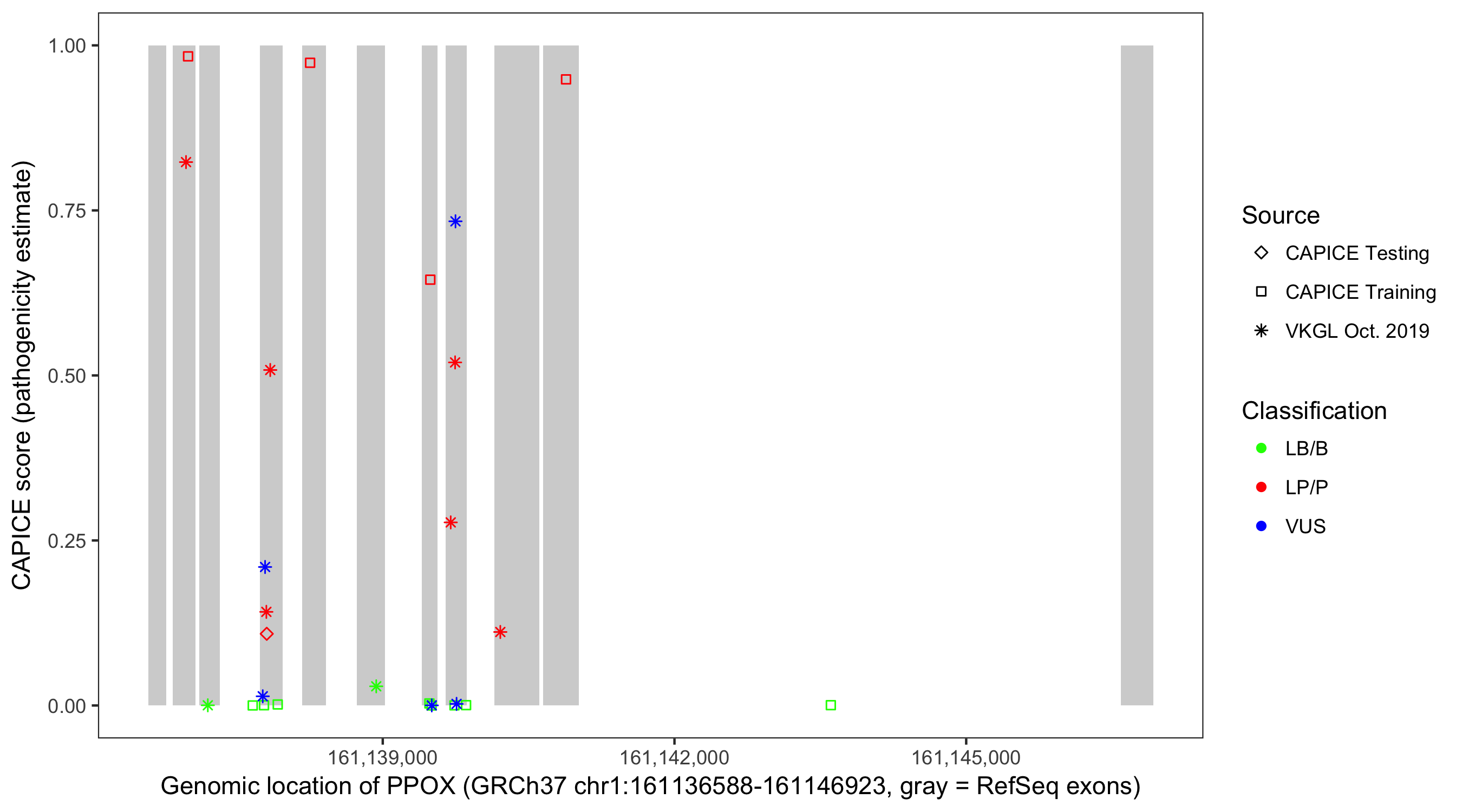 Shown are CAPICE train/test variants plus VKGL Oct 2019.
