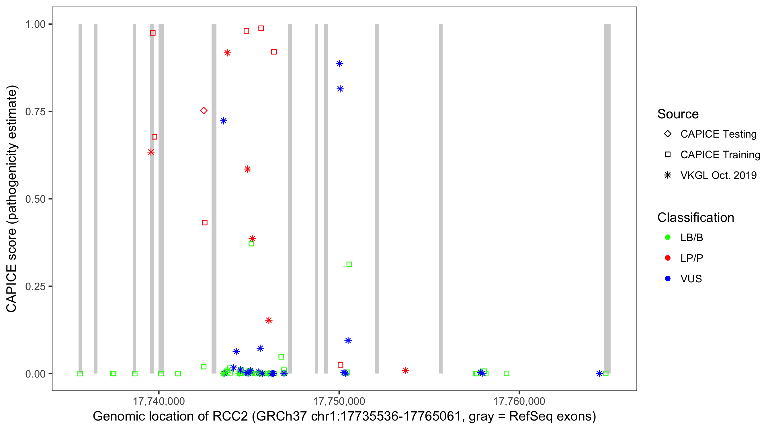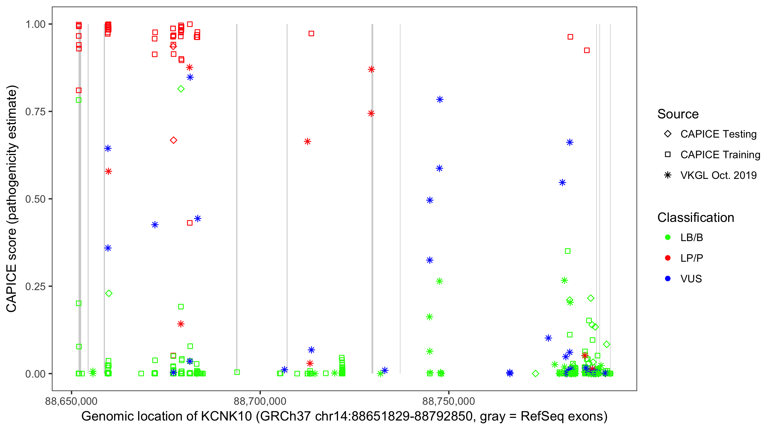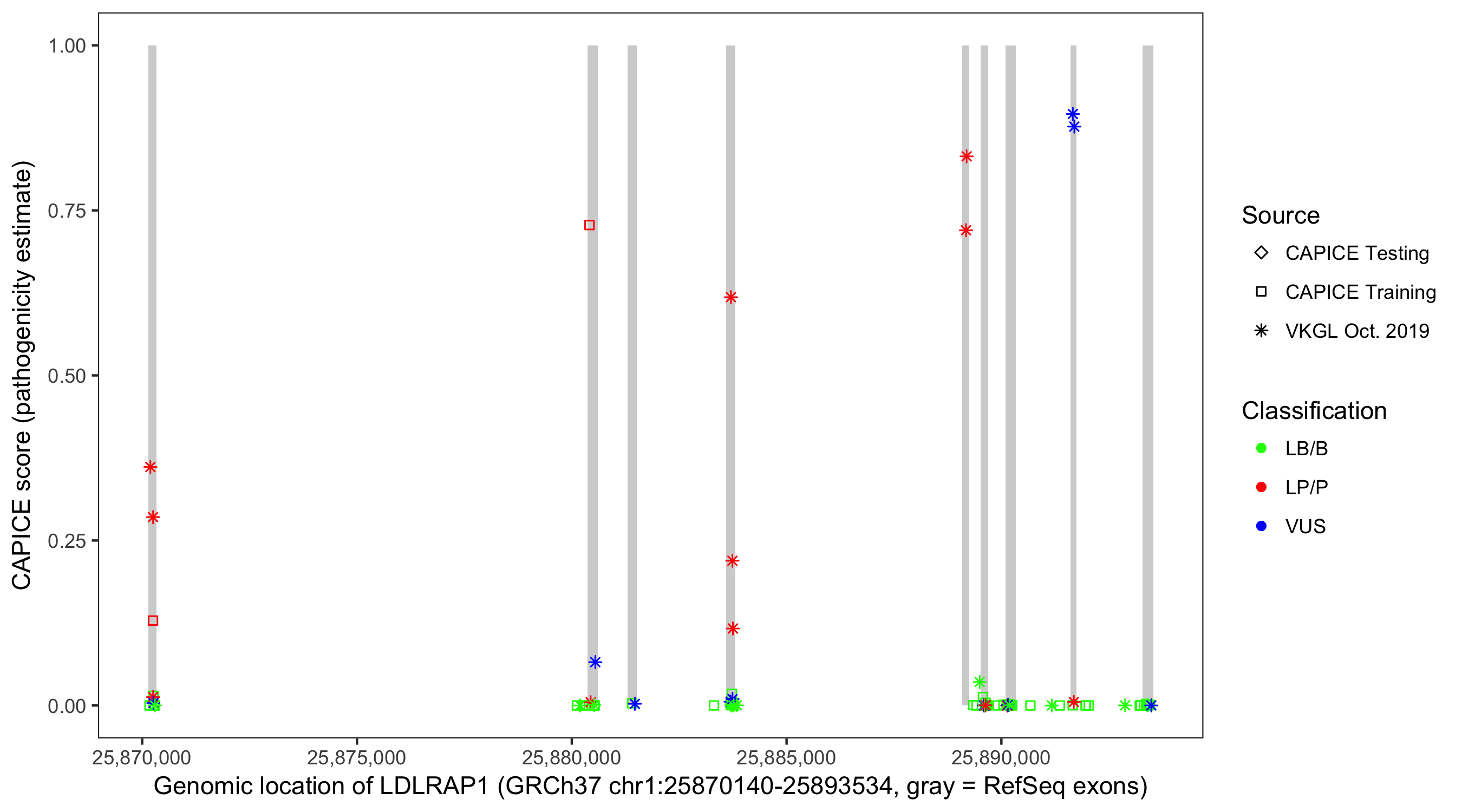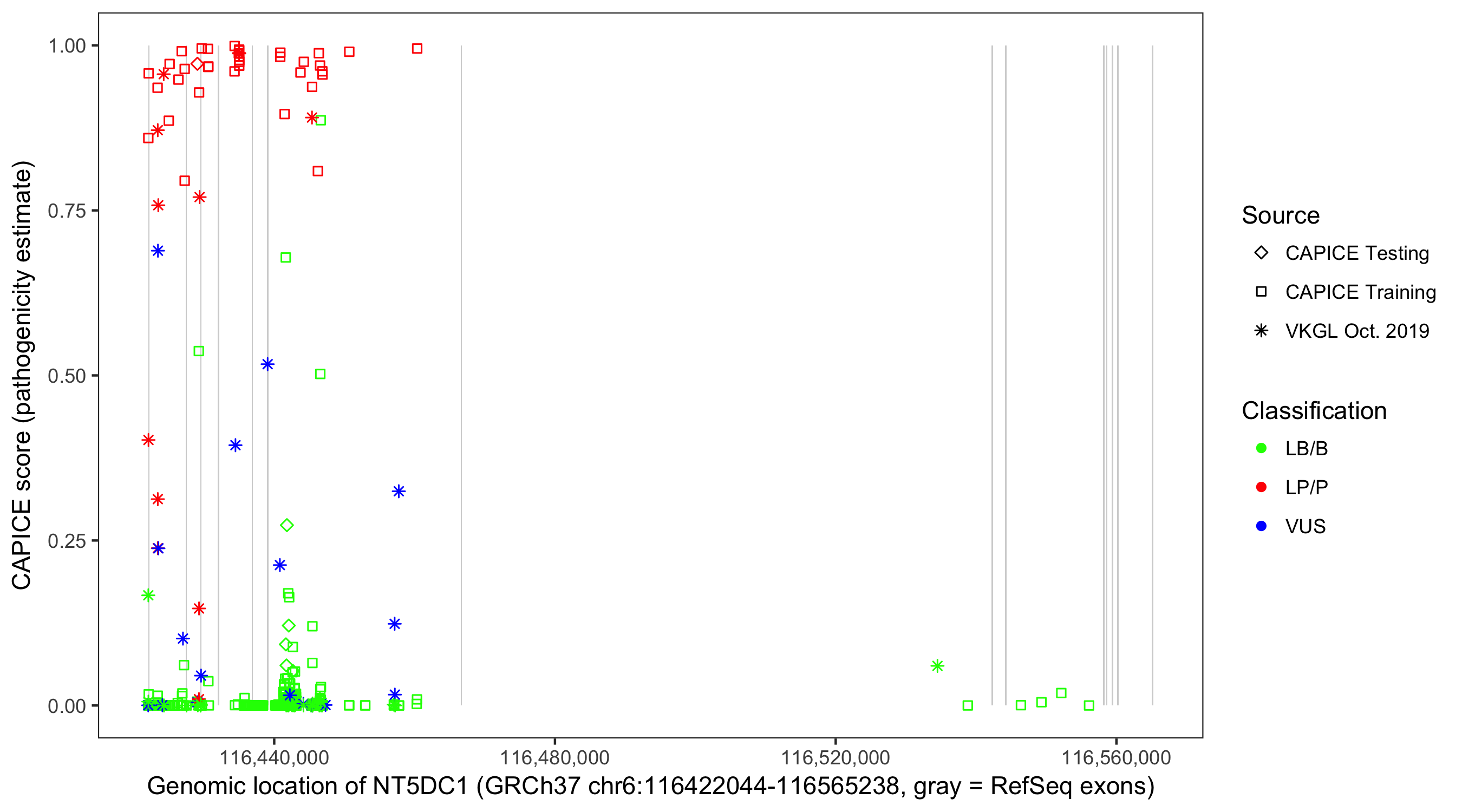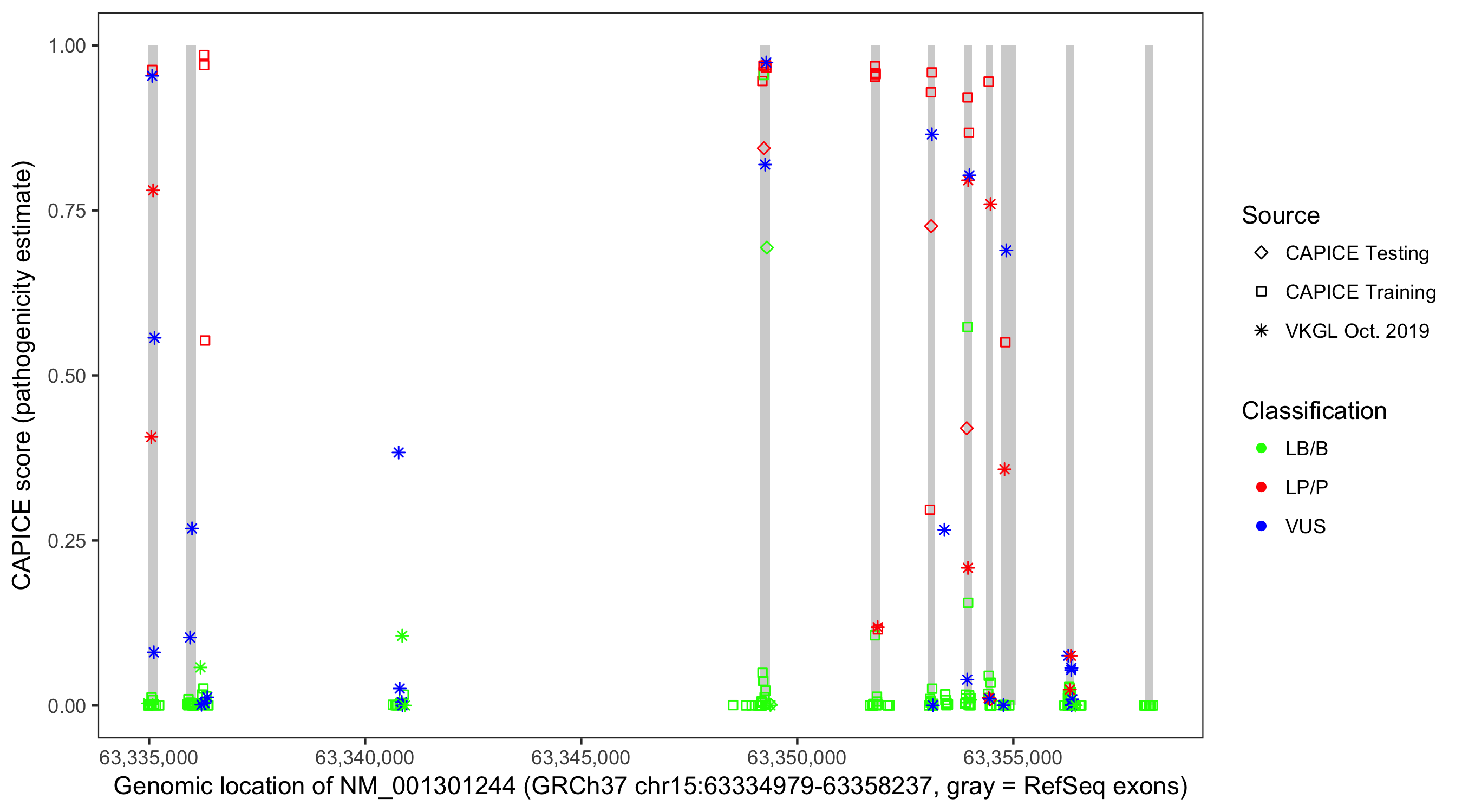 Shown are CAPICE train/test variants plus VKGL Oct 2019.