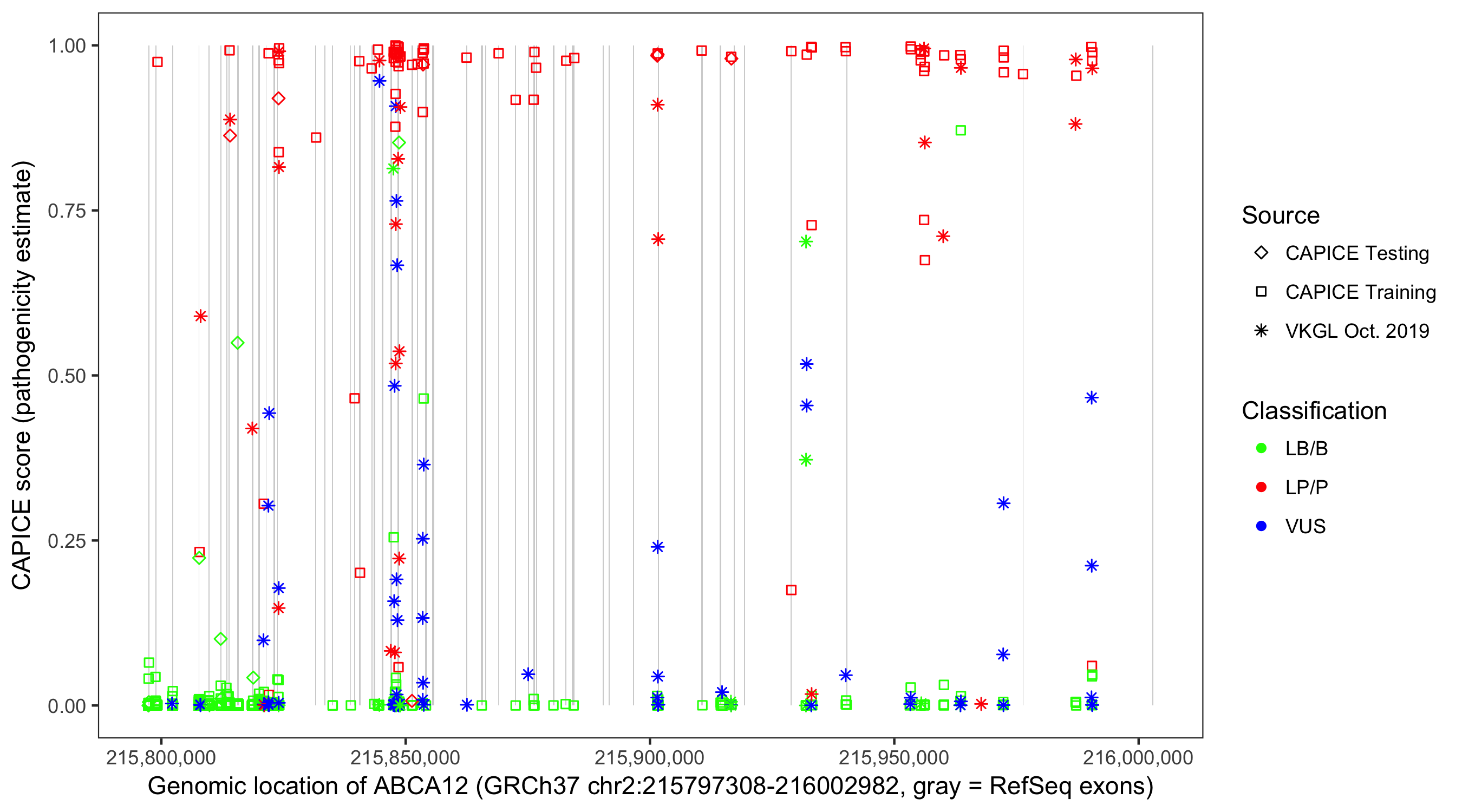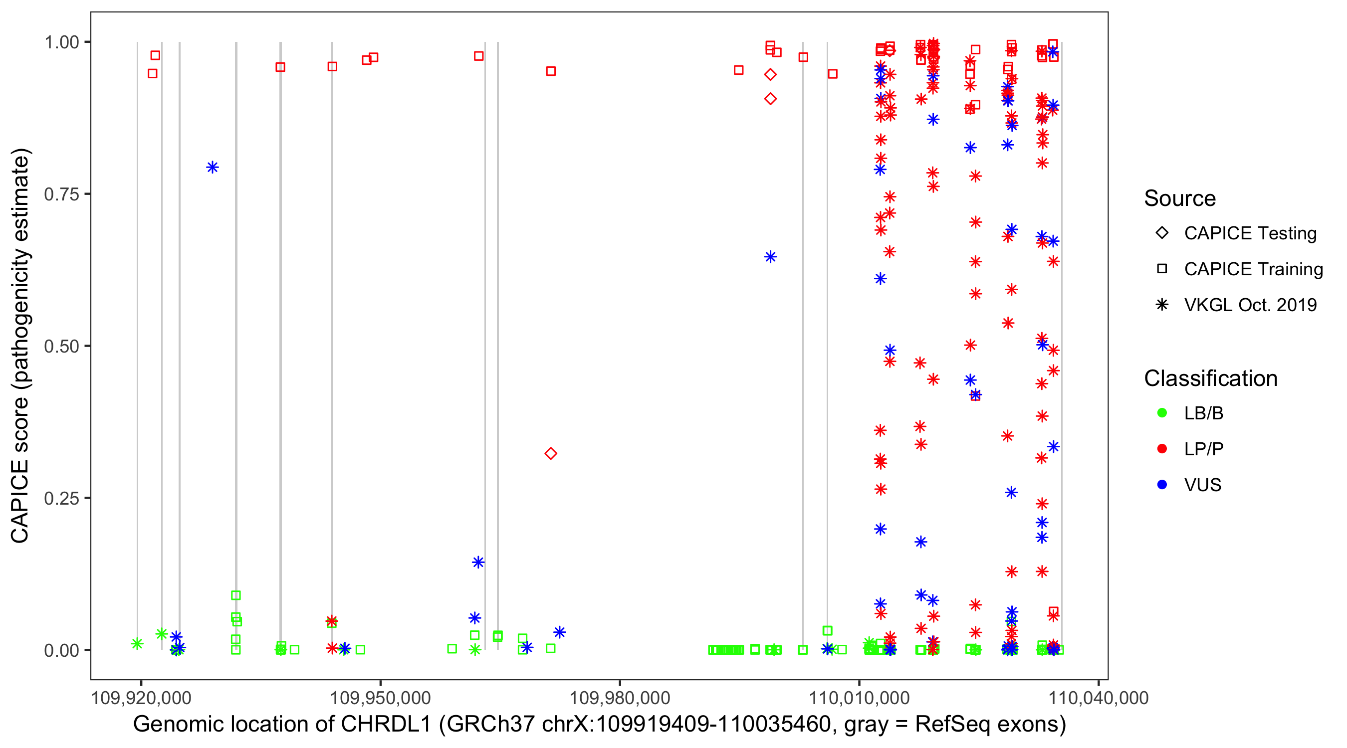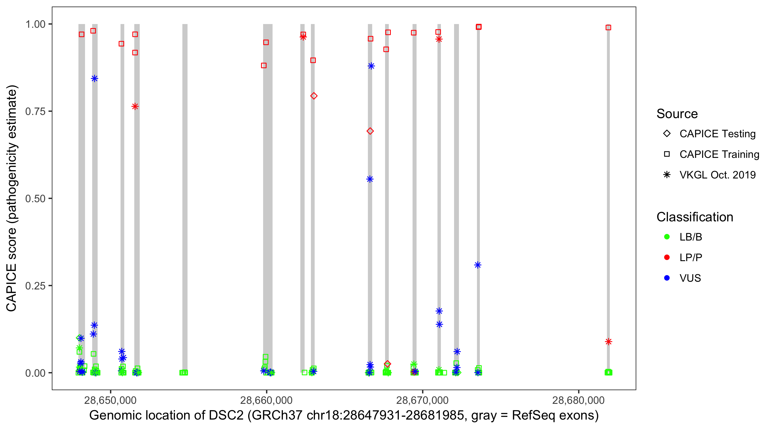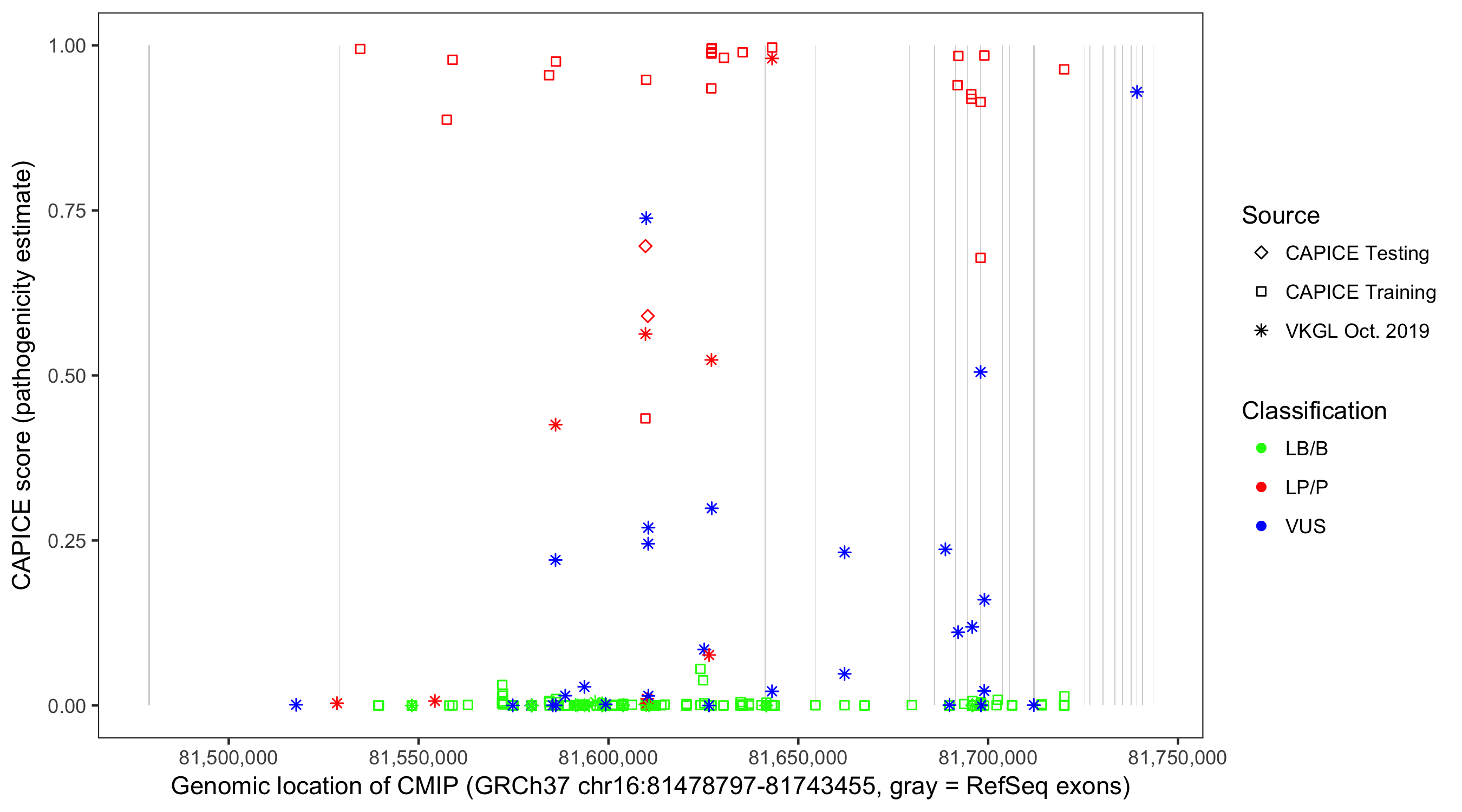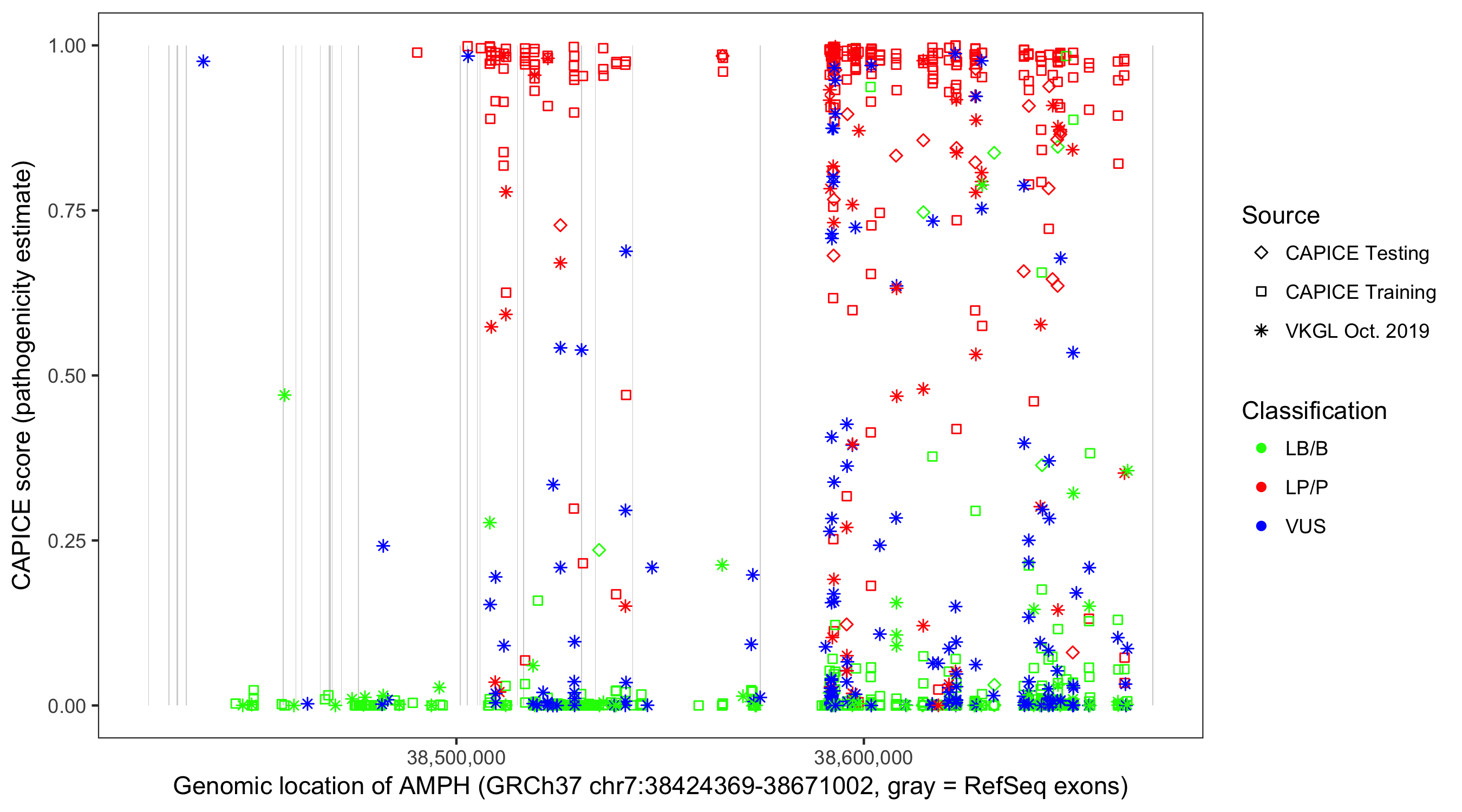 Shown are CAPICE train/test variants plus VKGL Oct 2019.