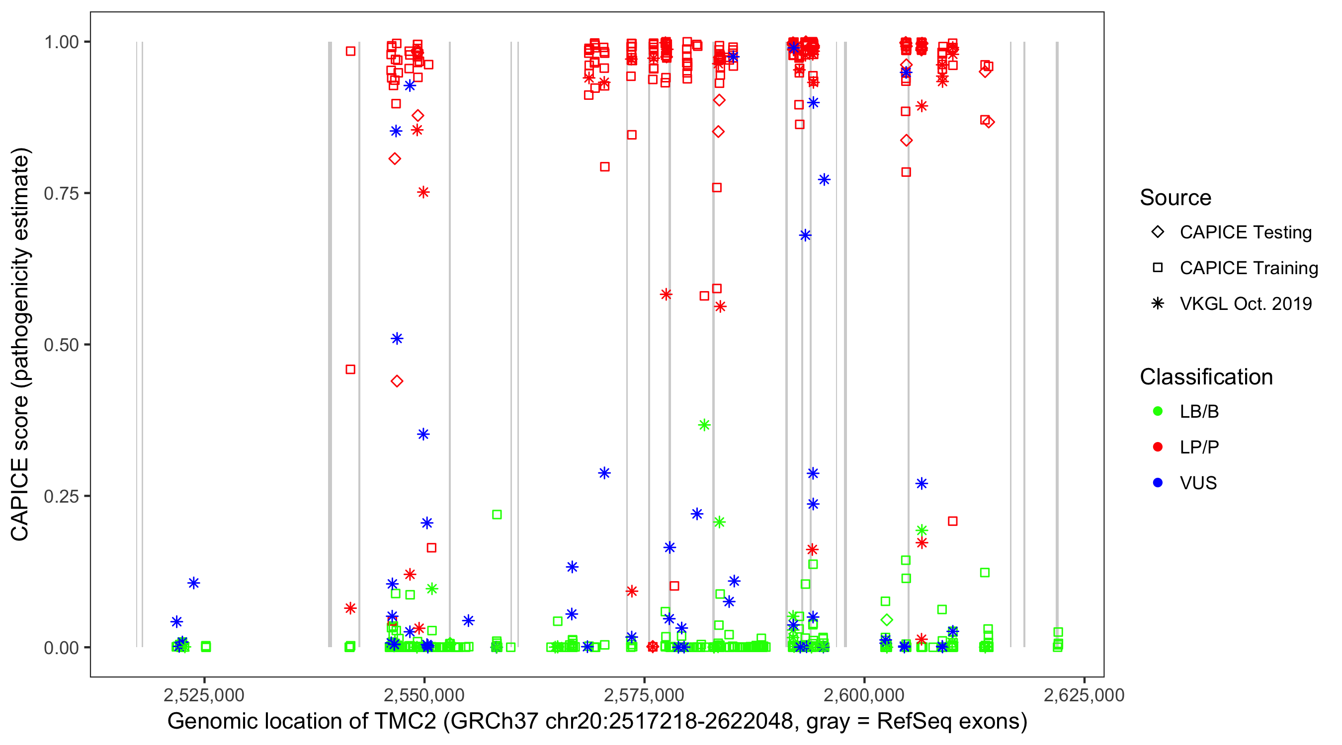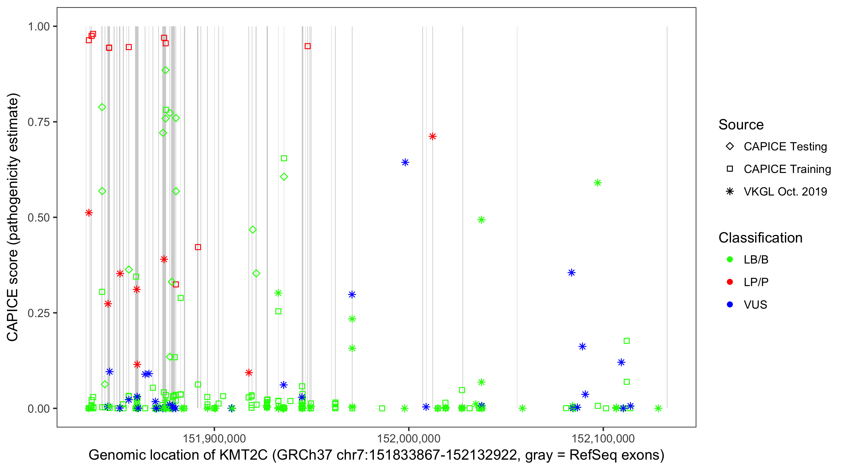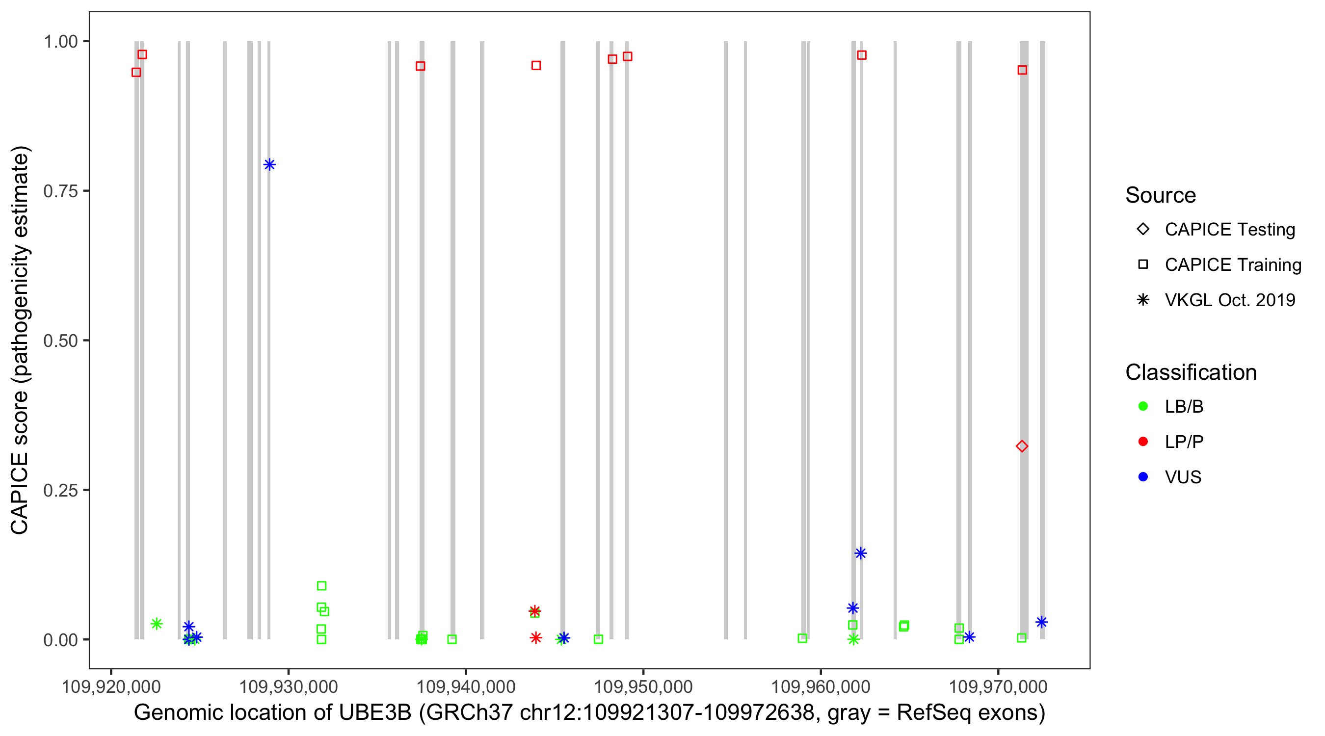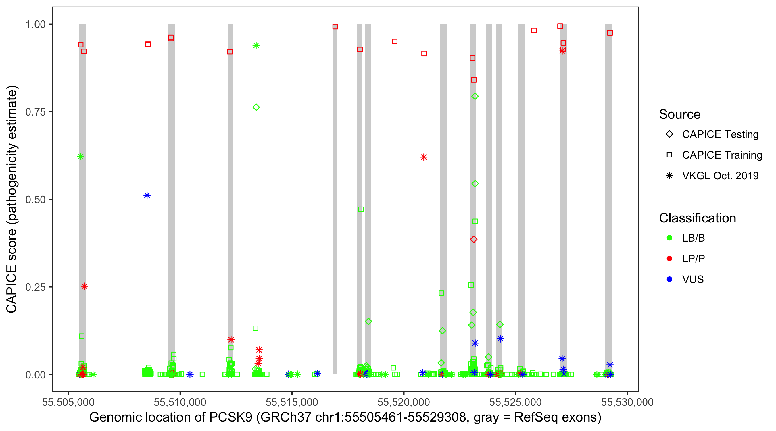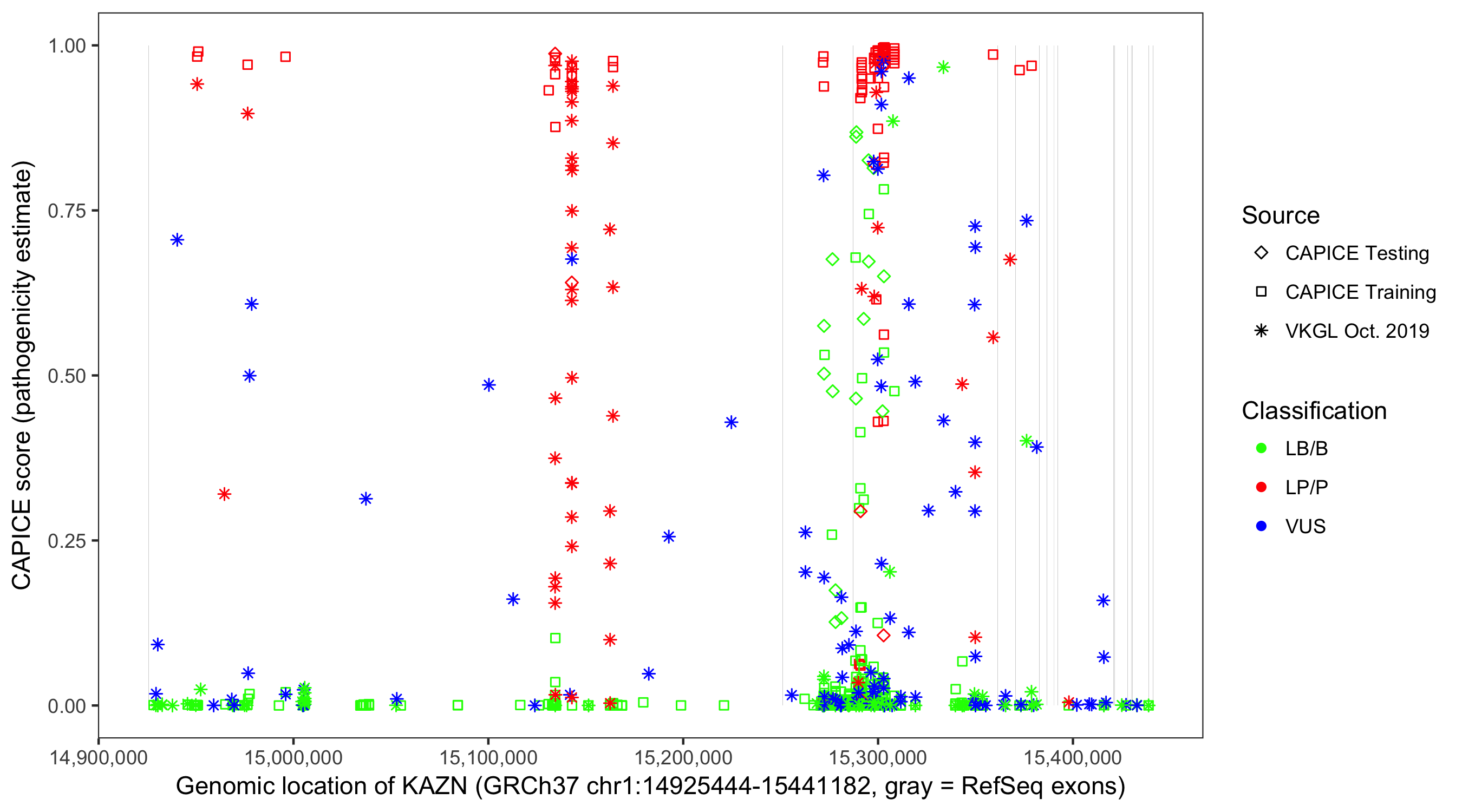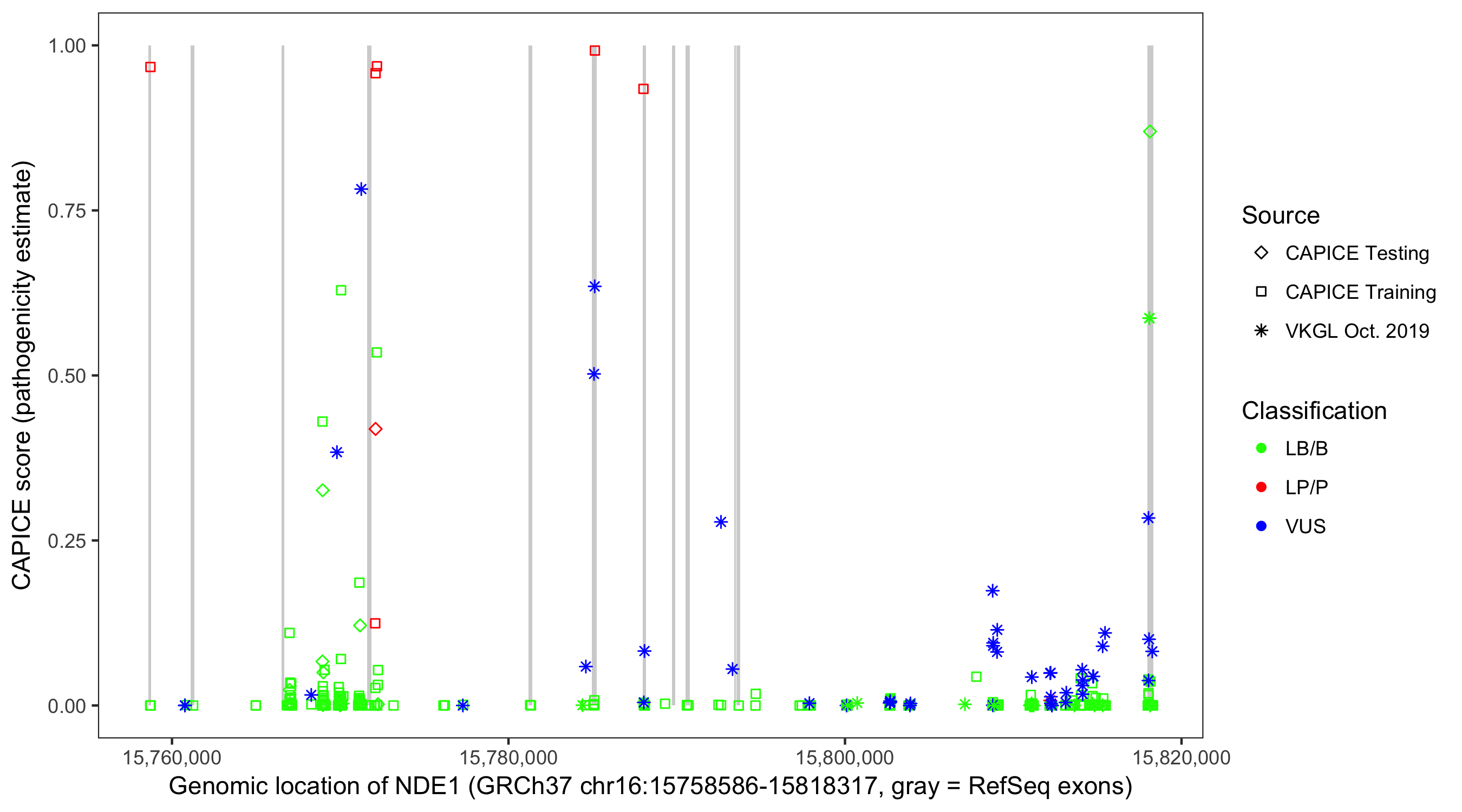 Shown are CAPICE train/test variants plus VKGL Oct 2019.