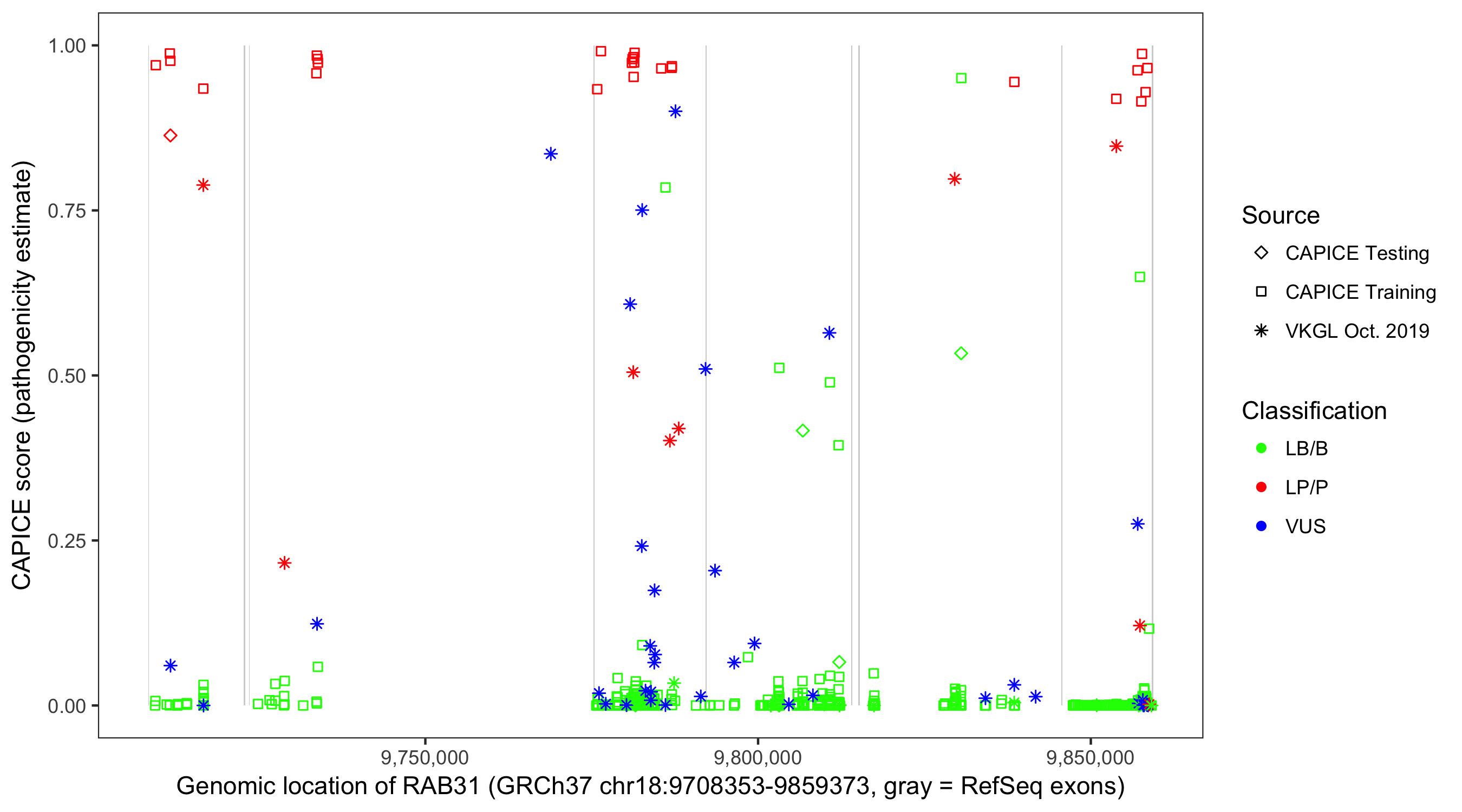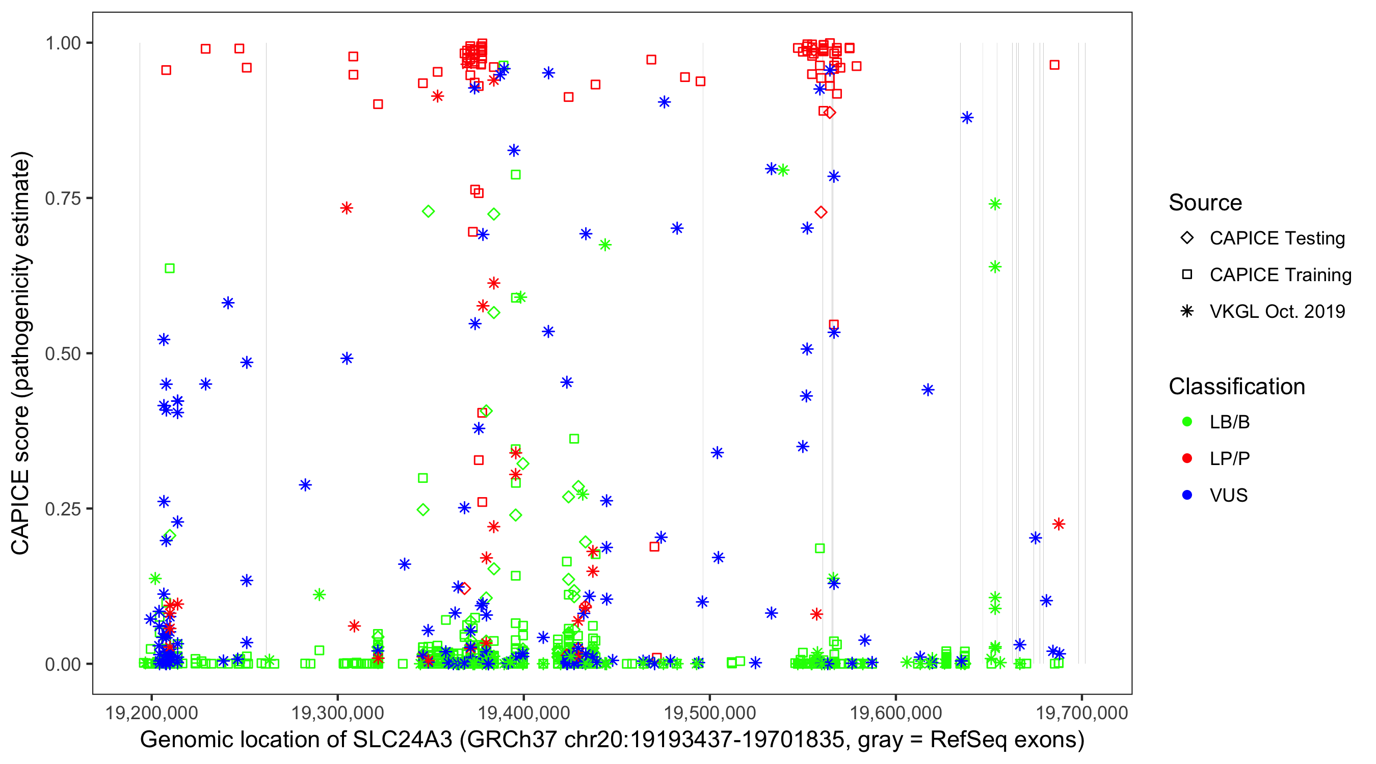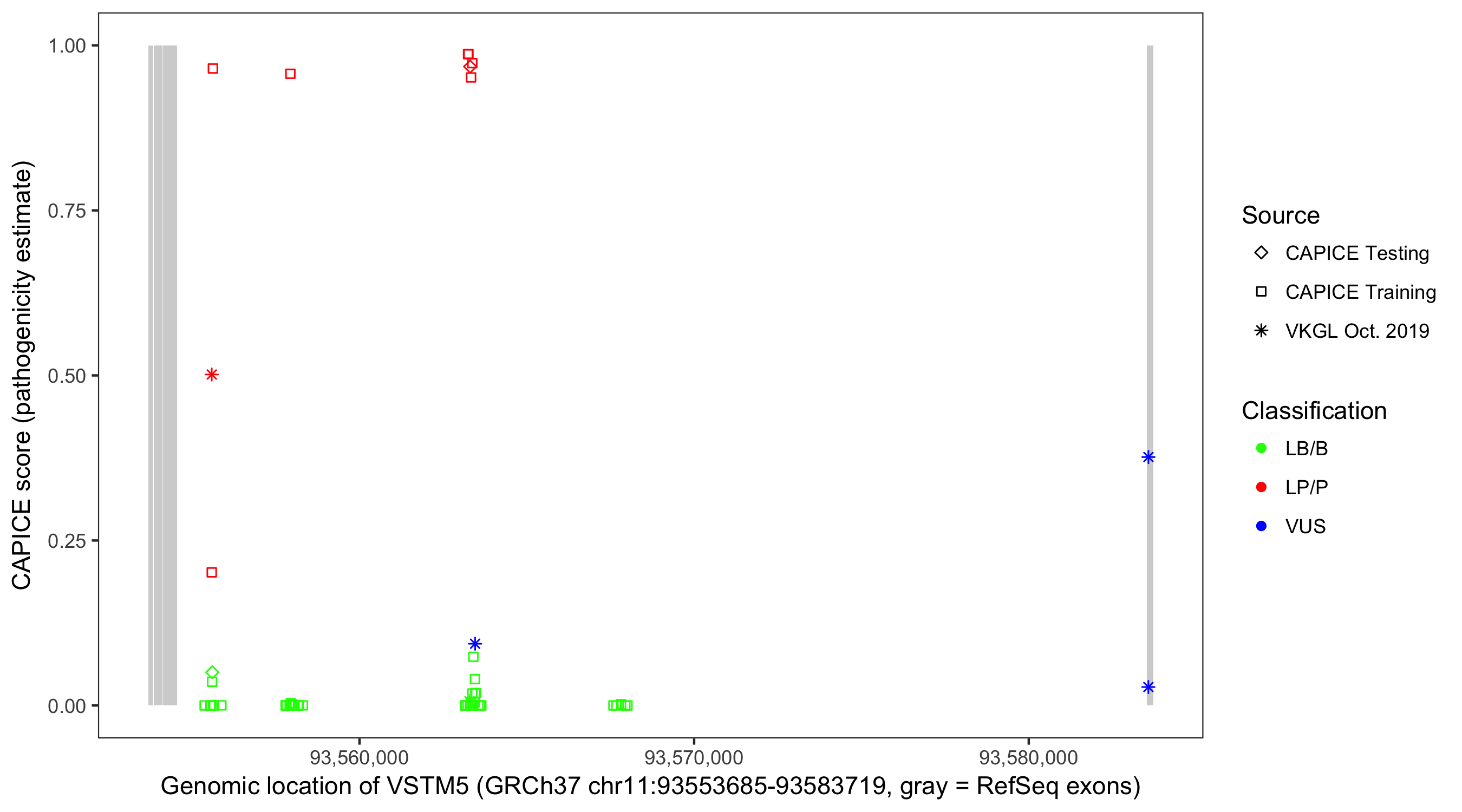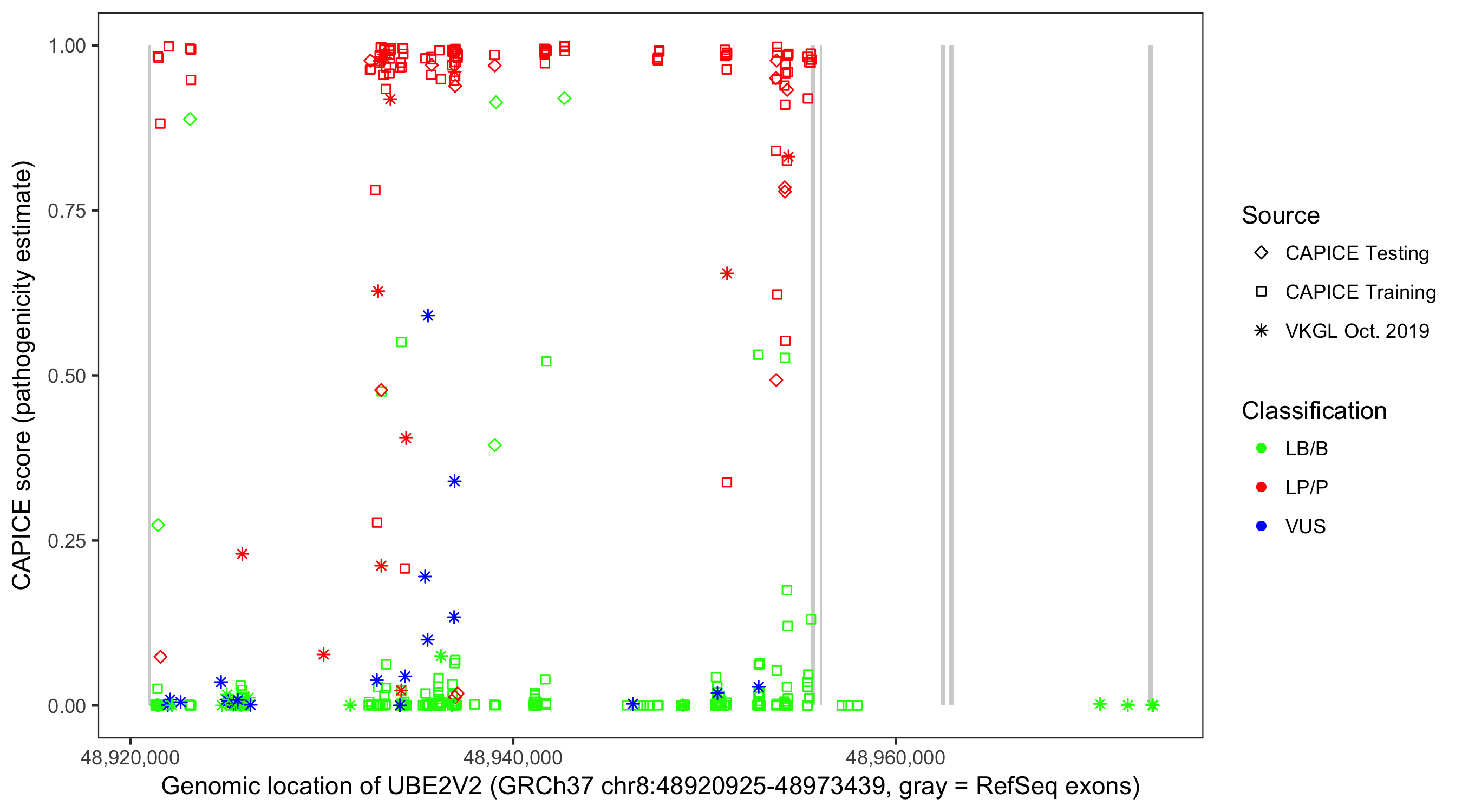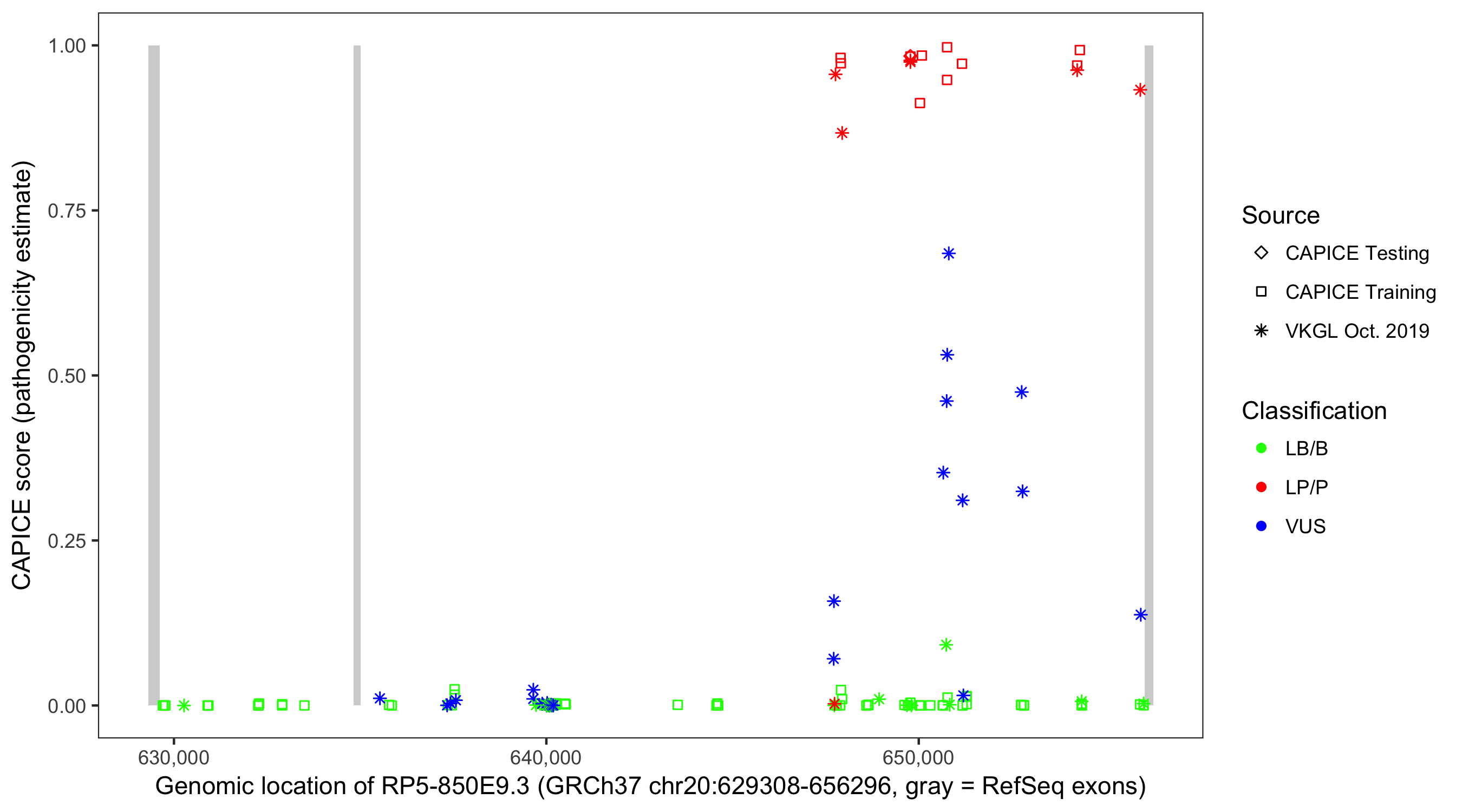 Shown are CAPICE train/test variants plus VKGL Oct 2019.