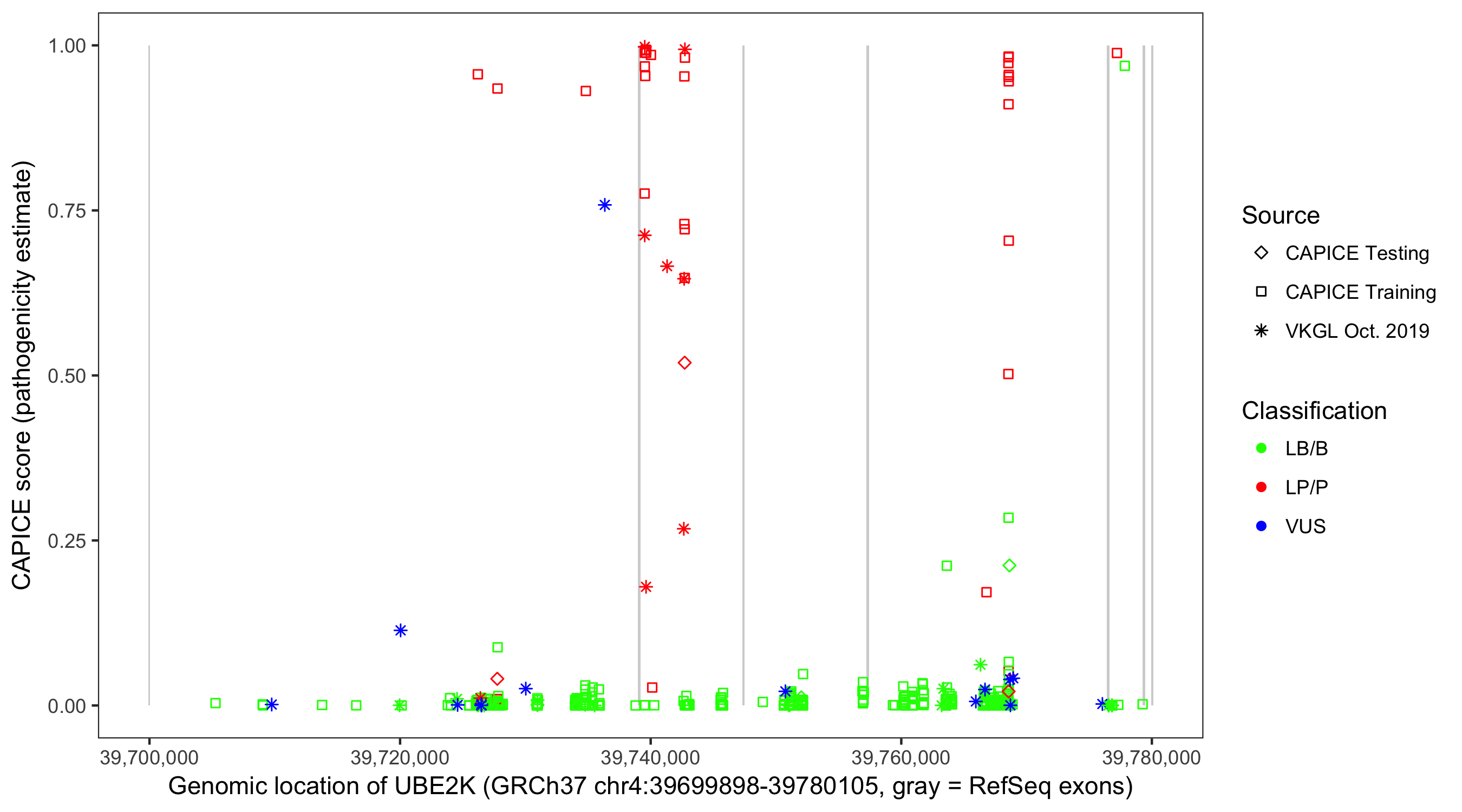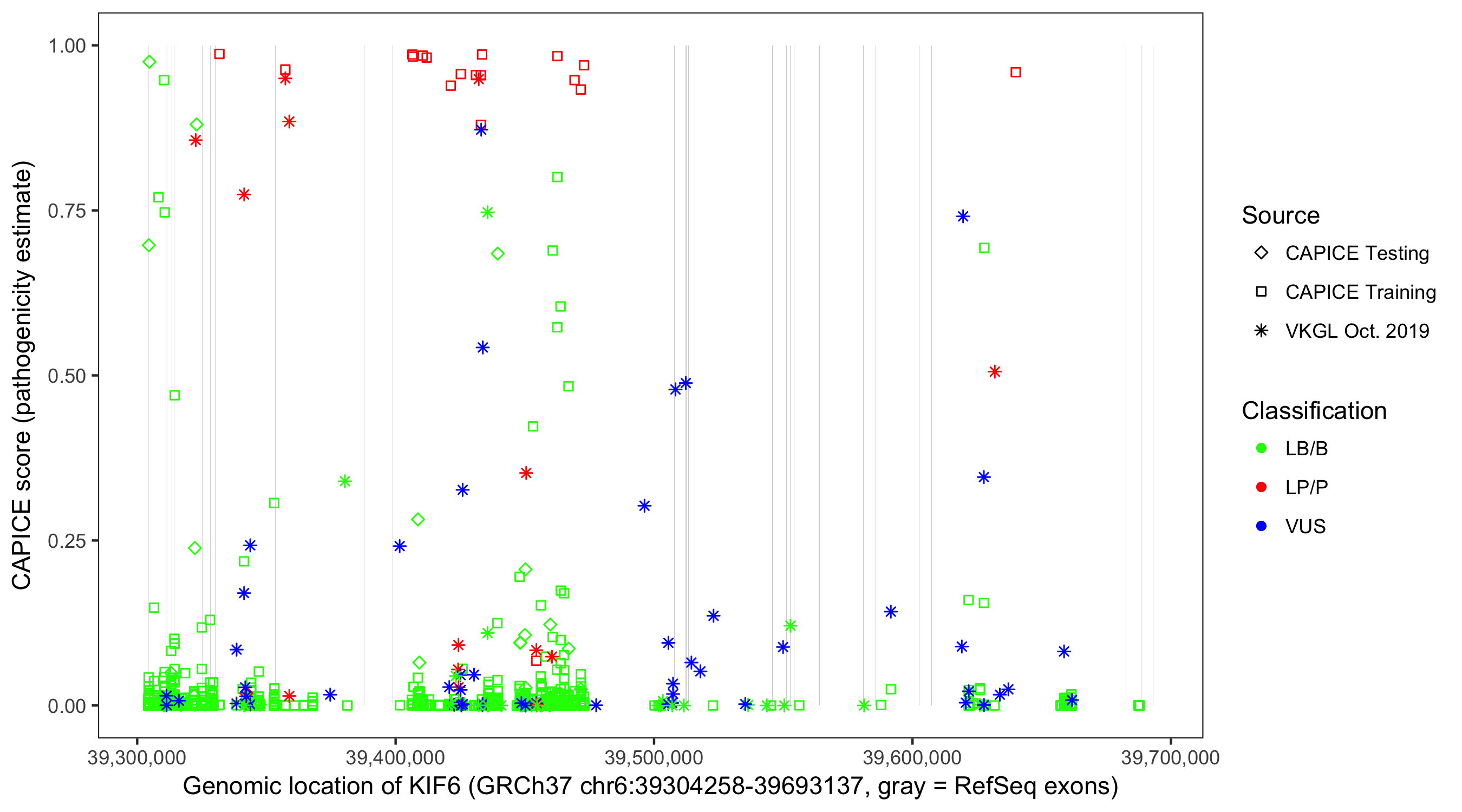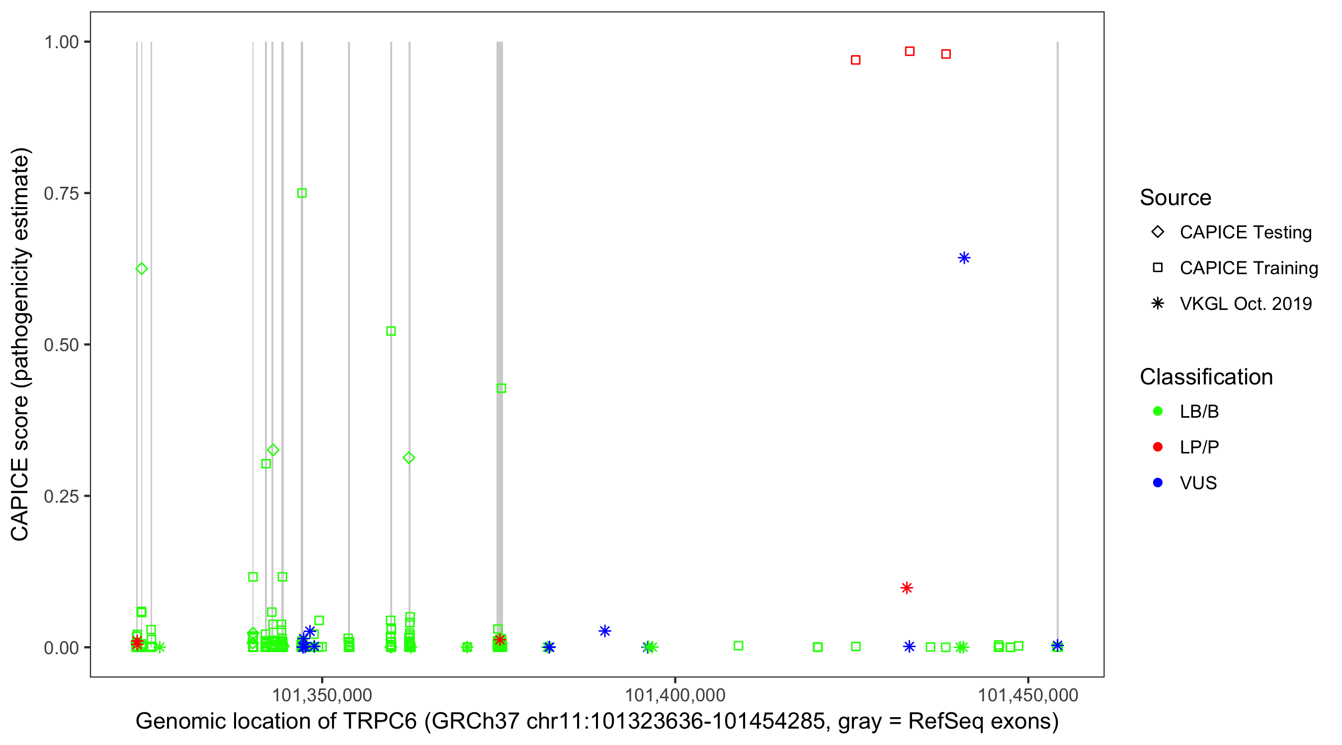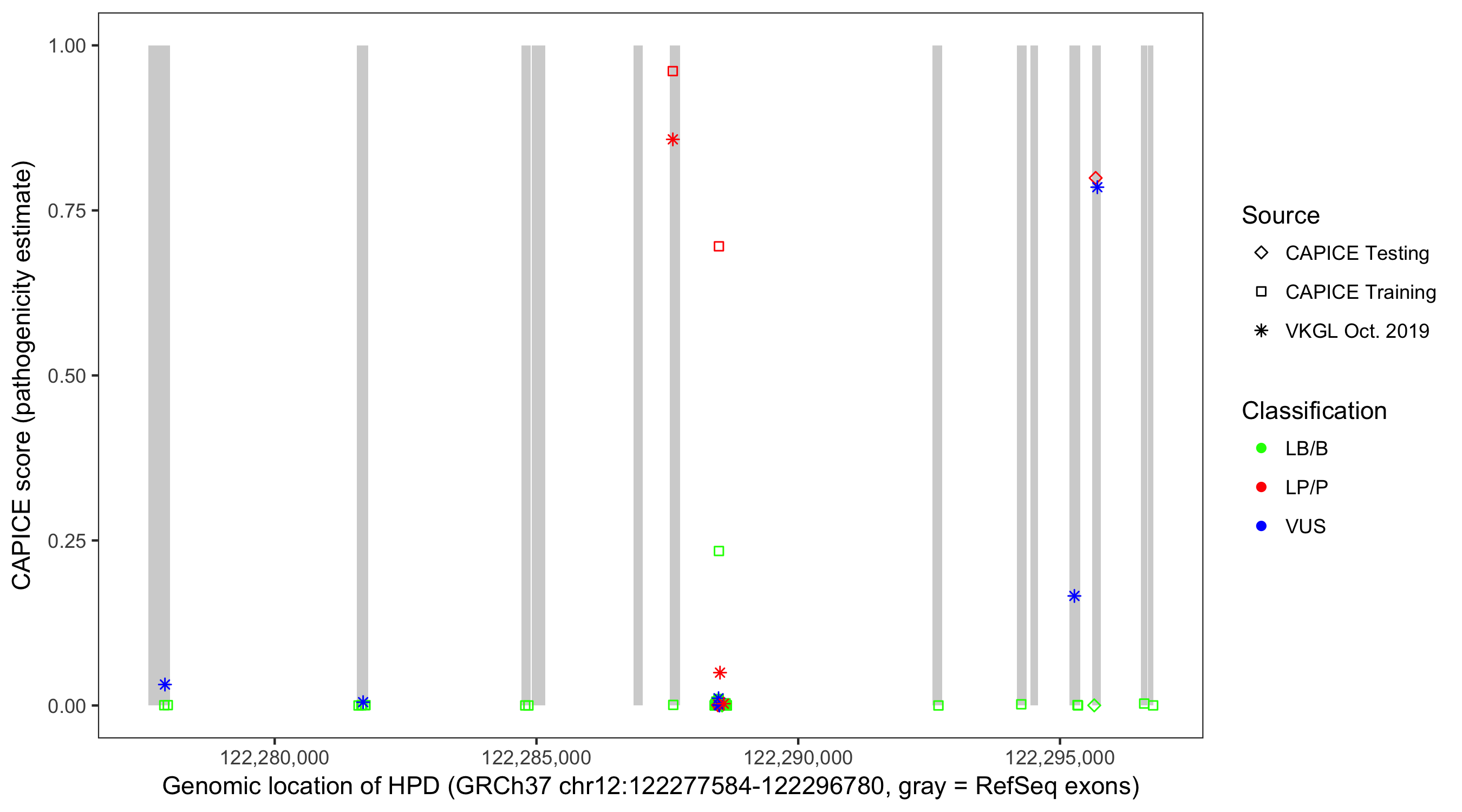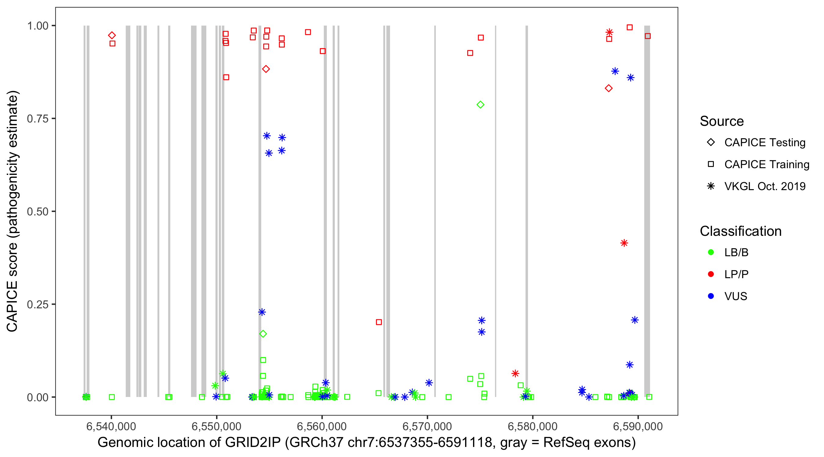 Shown are CAPICE train/test variants plus VKGL Oct 2019.