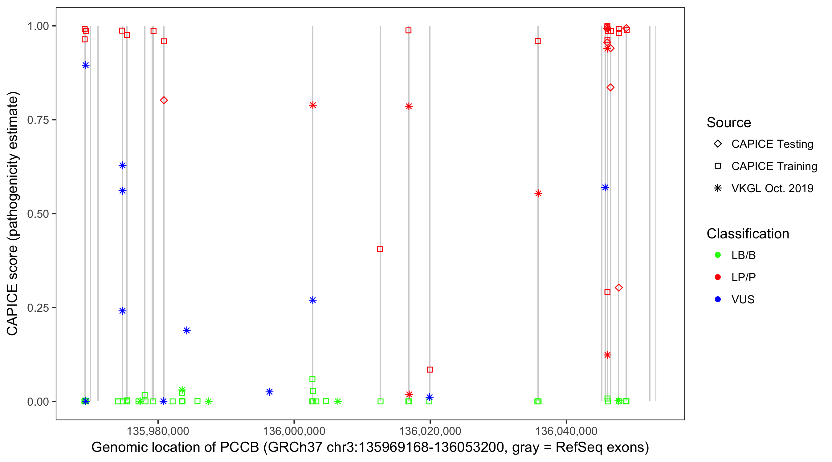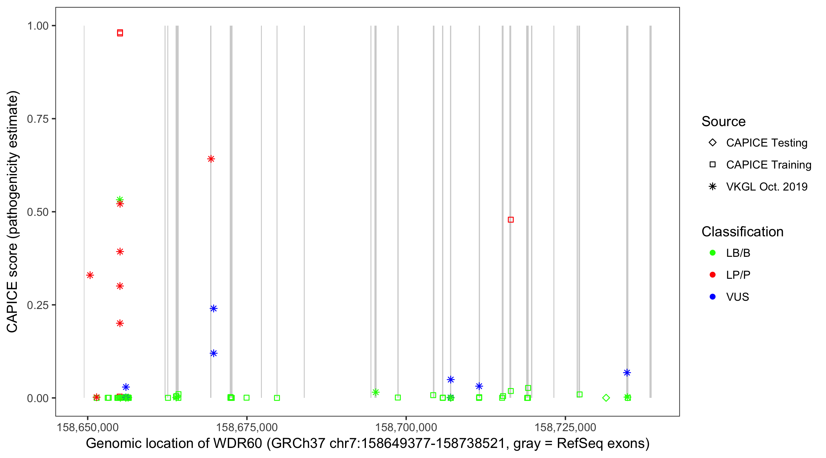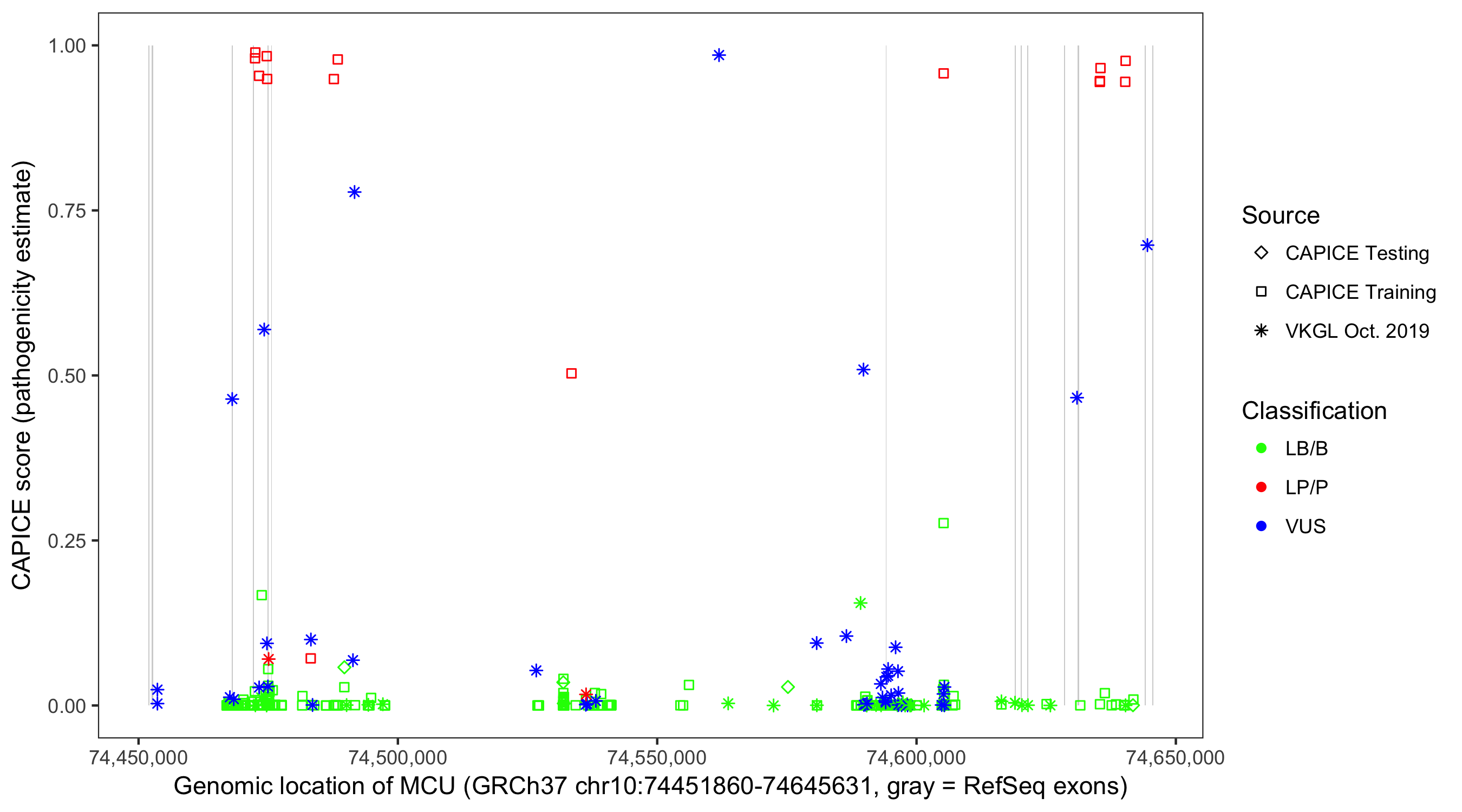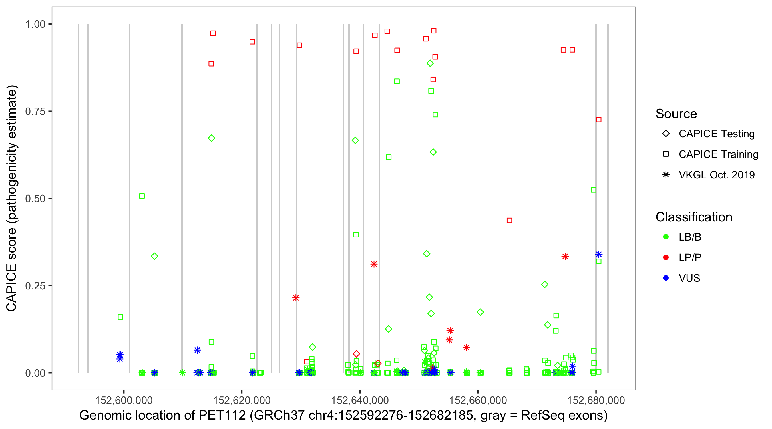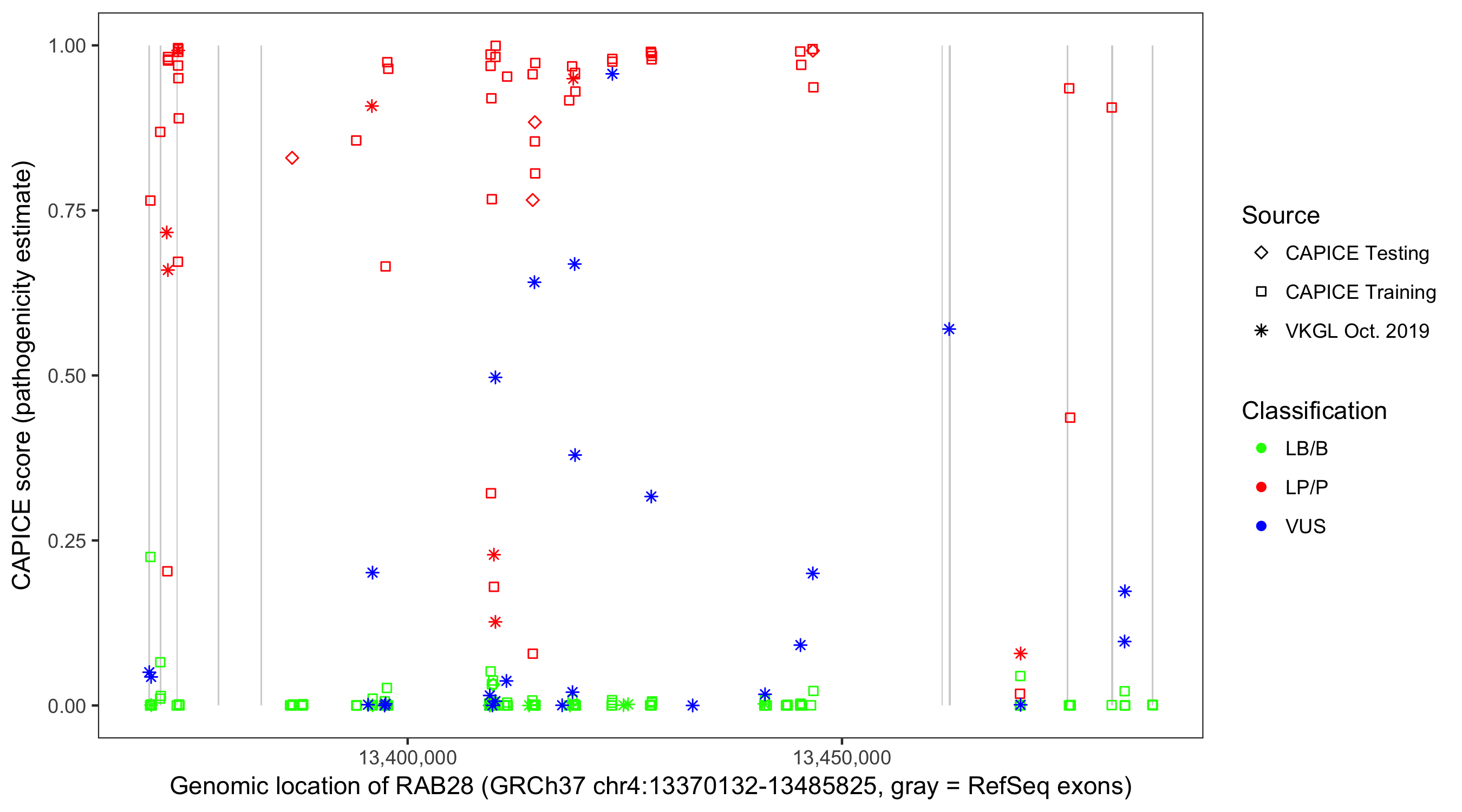 Shown are CAPICE train/test variants plus VKGL Oct 2019.