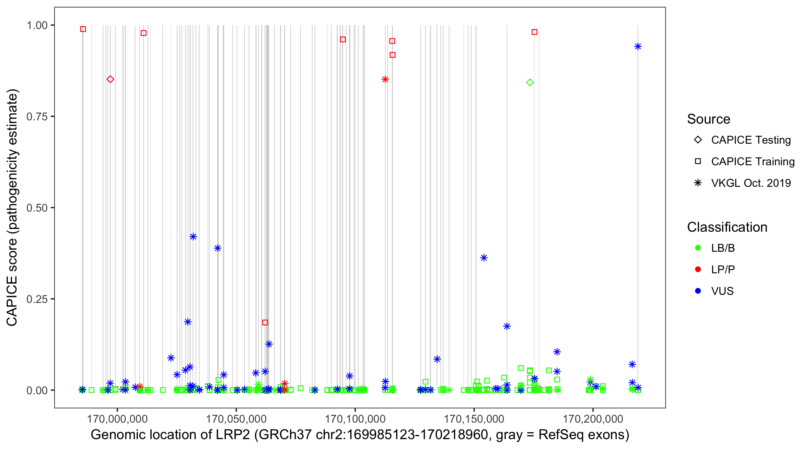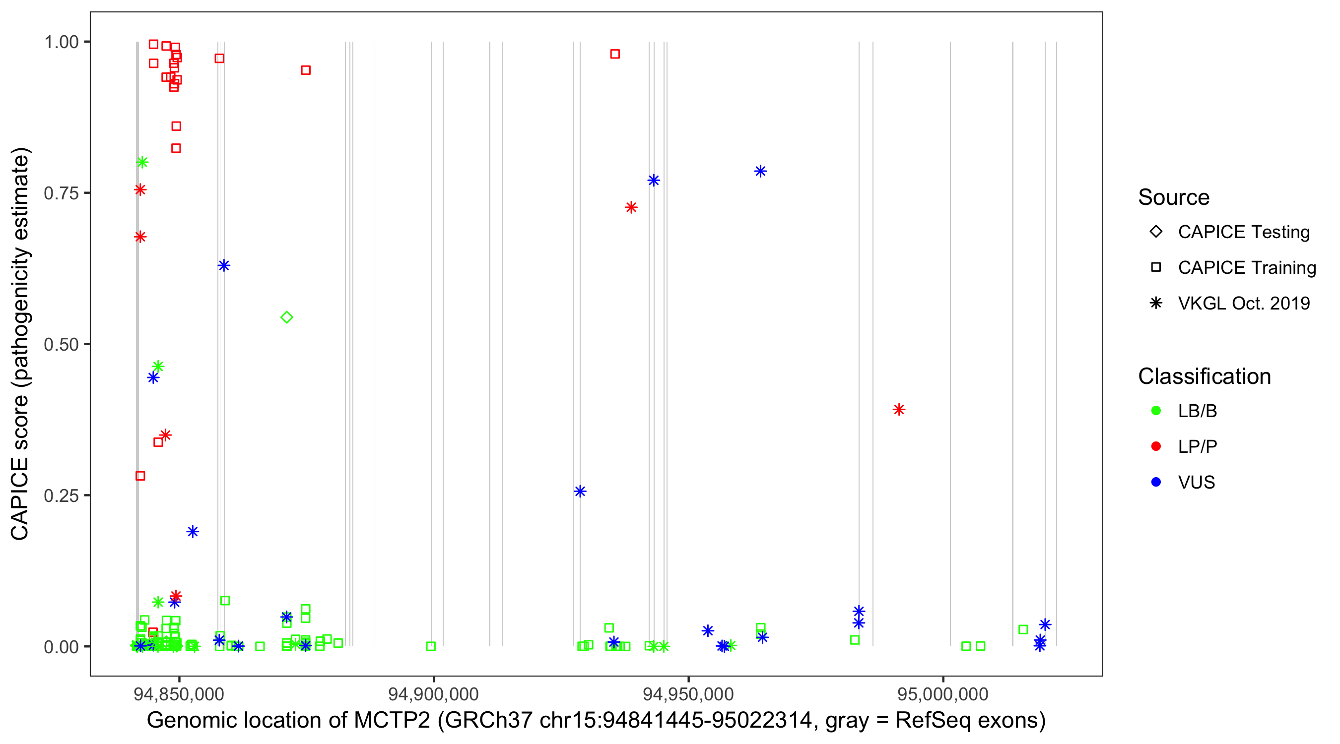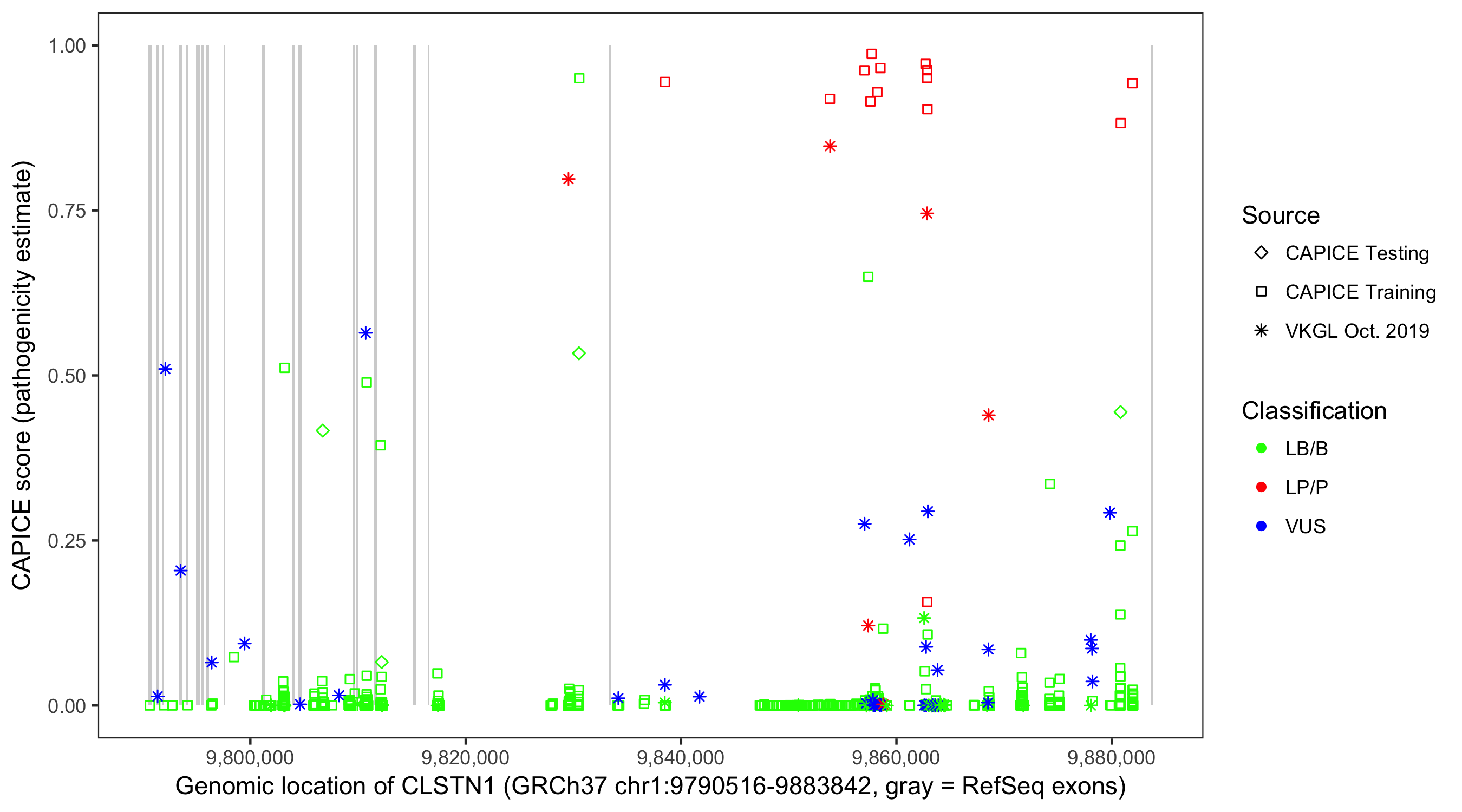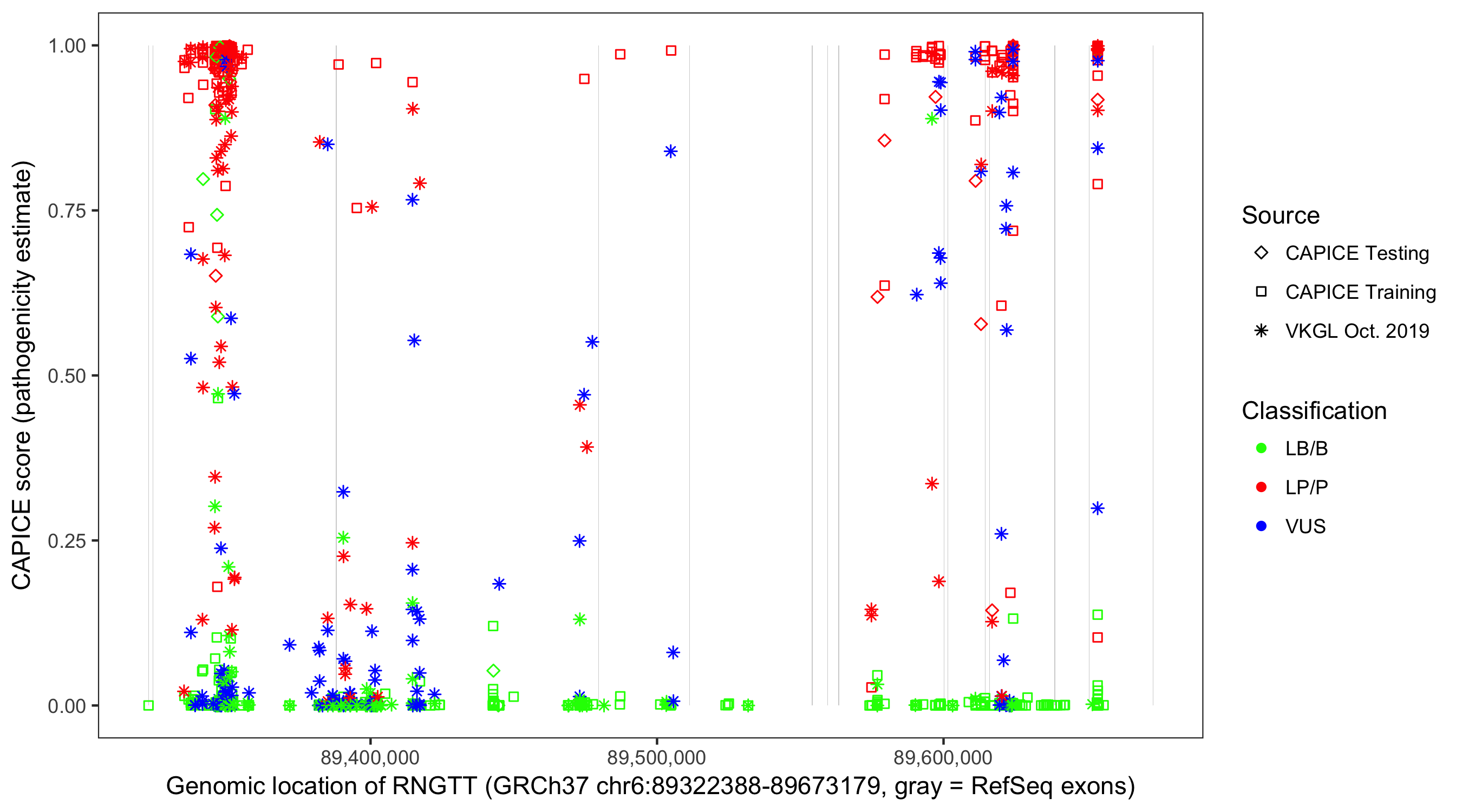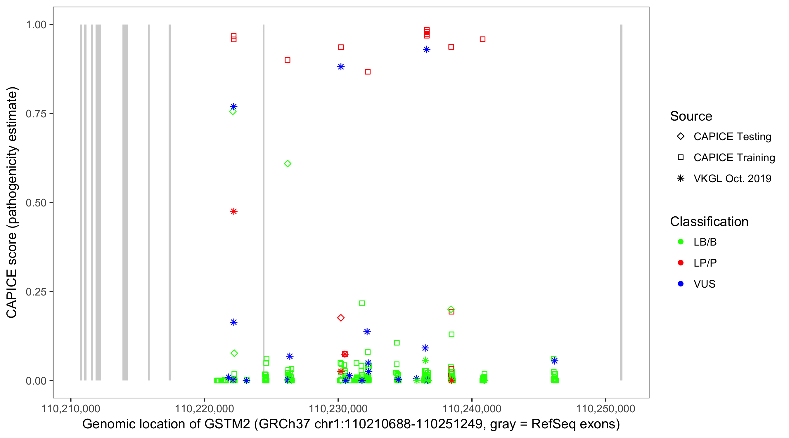 Shown are CAPICE train/test variants plus VKGL Oct 2019.