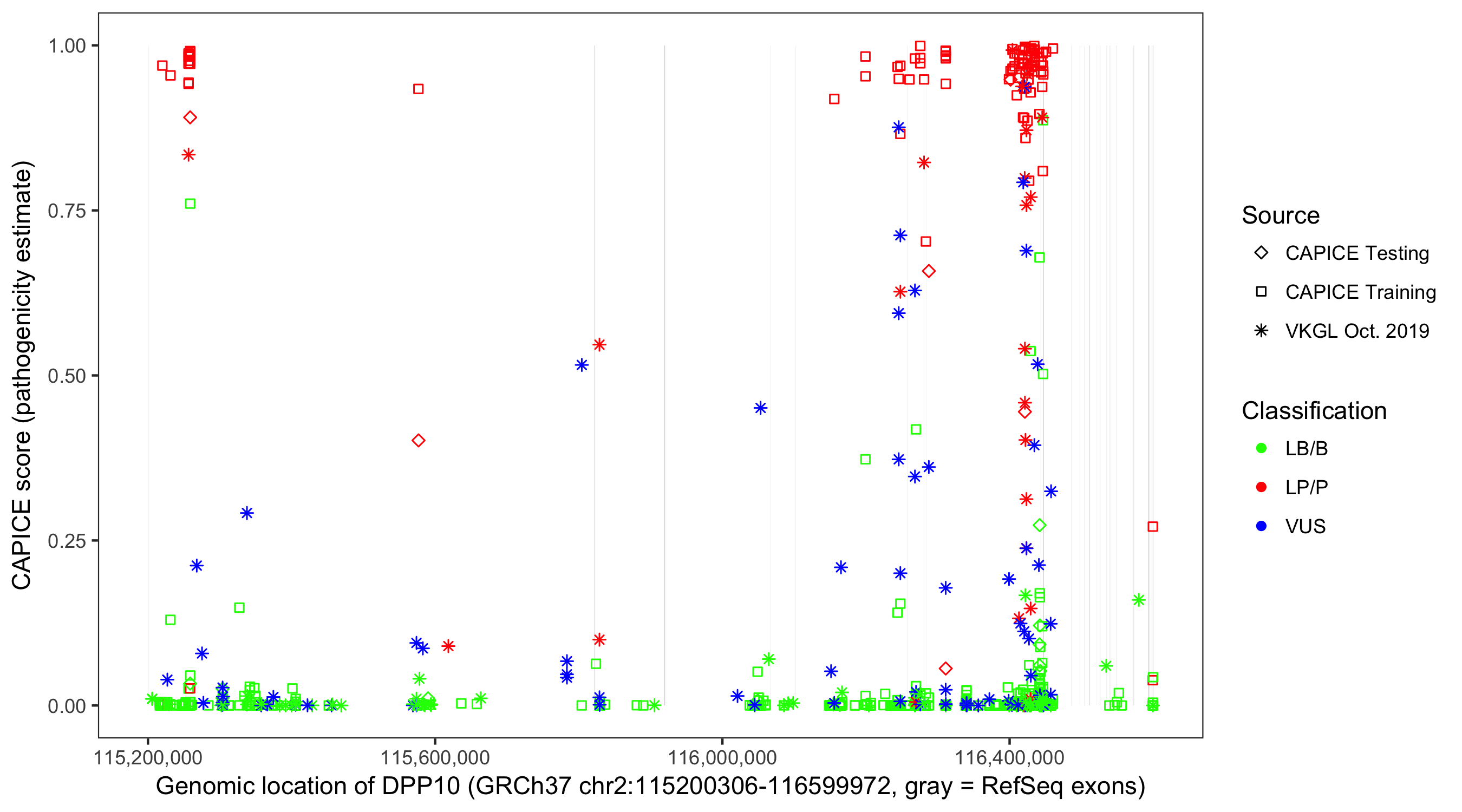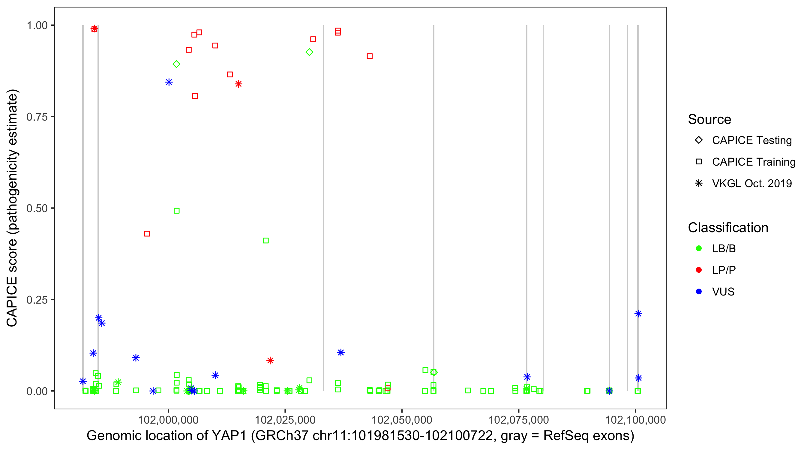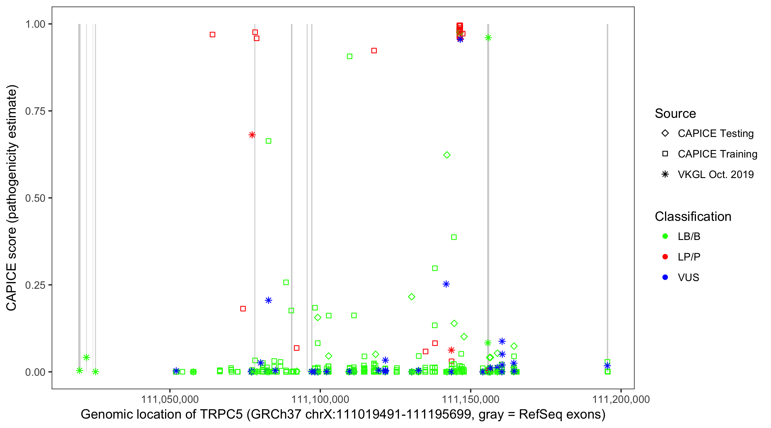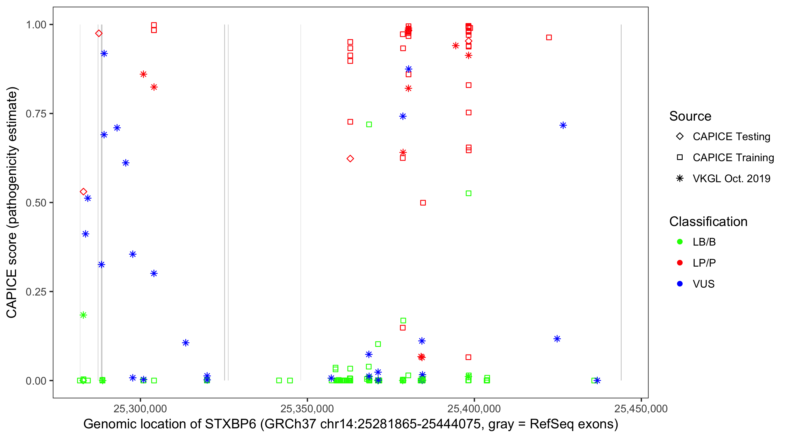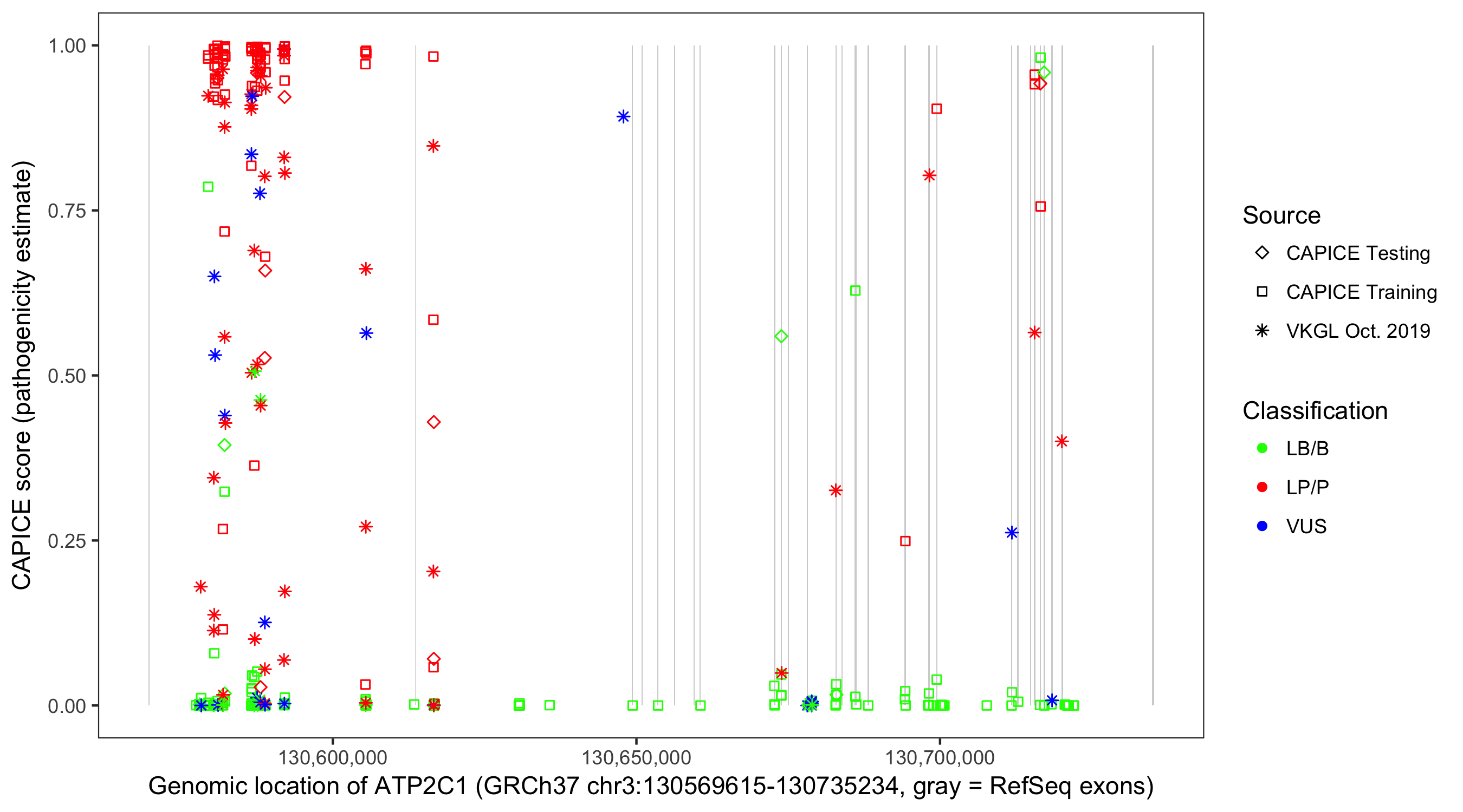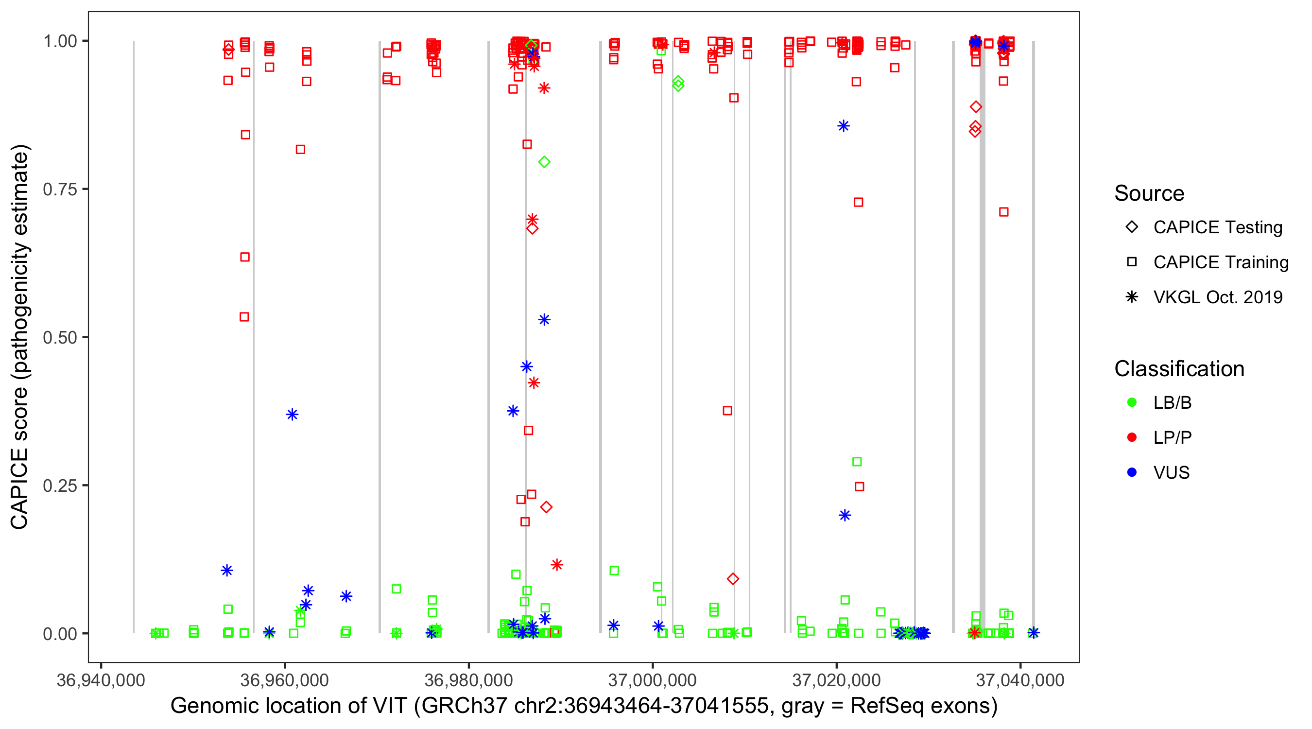 Shown are CAPICE train/test variants plus VKGL Oct 2019.