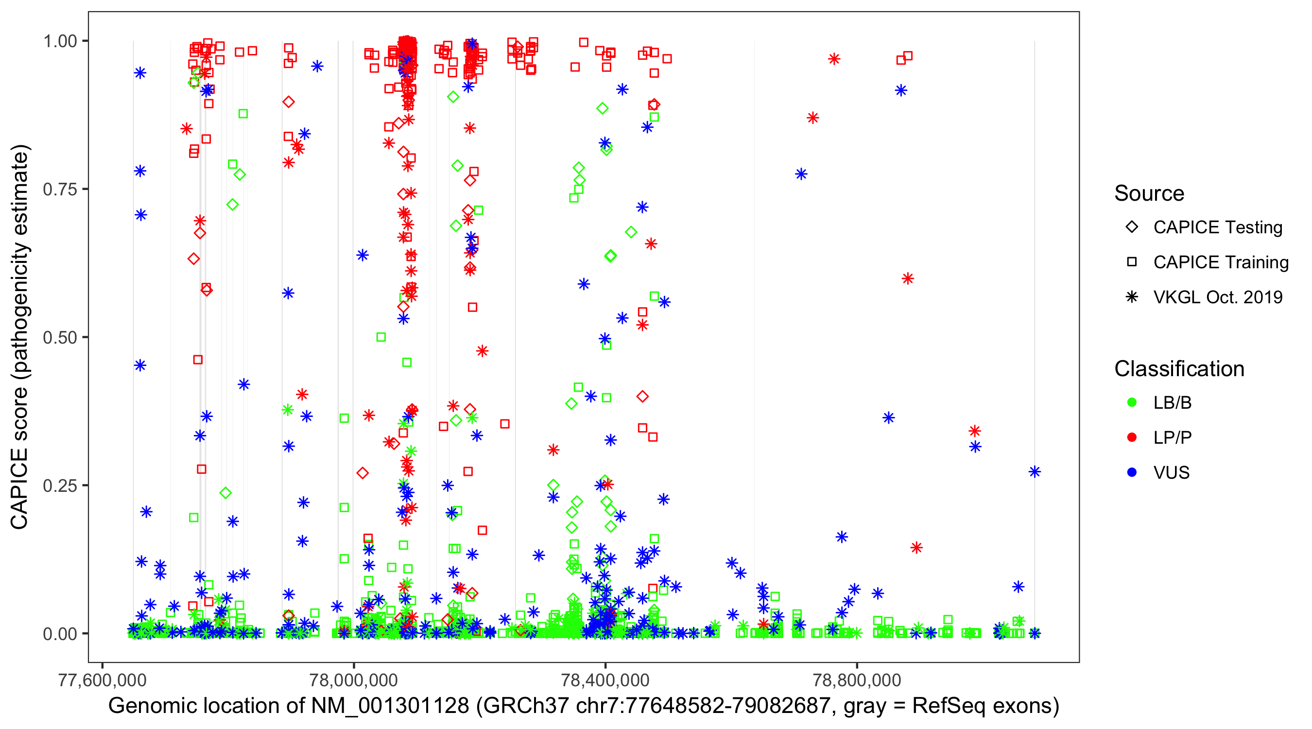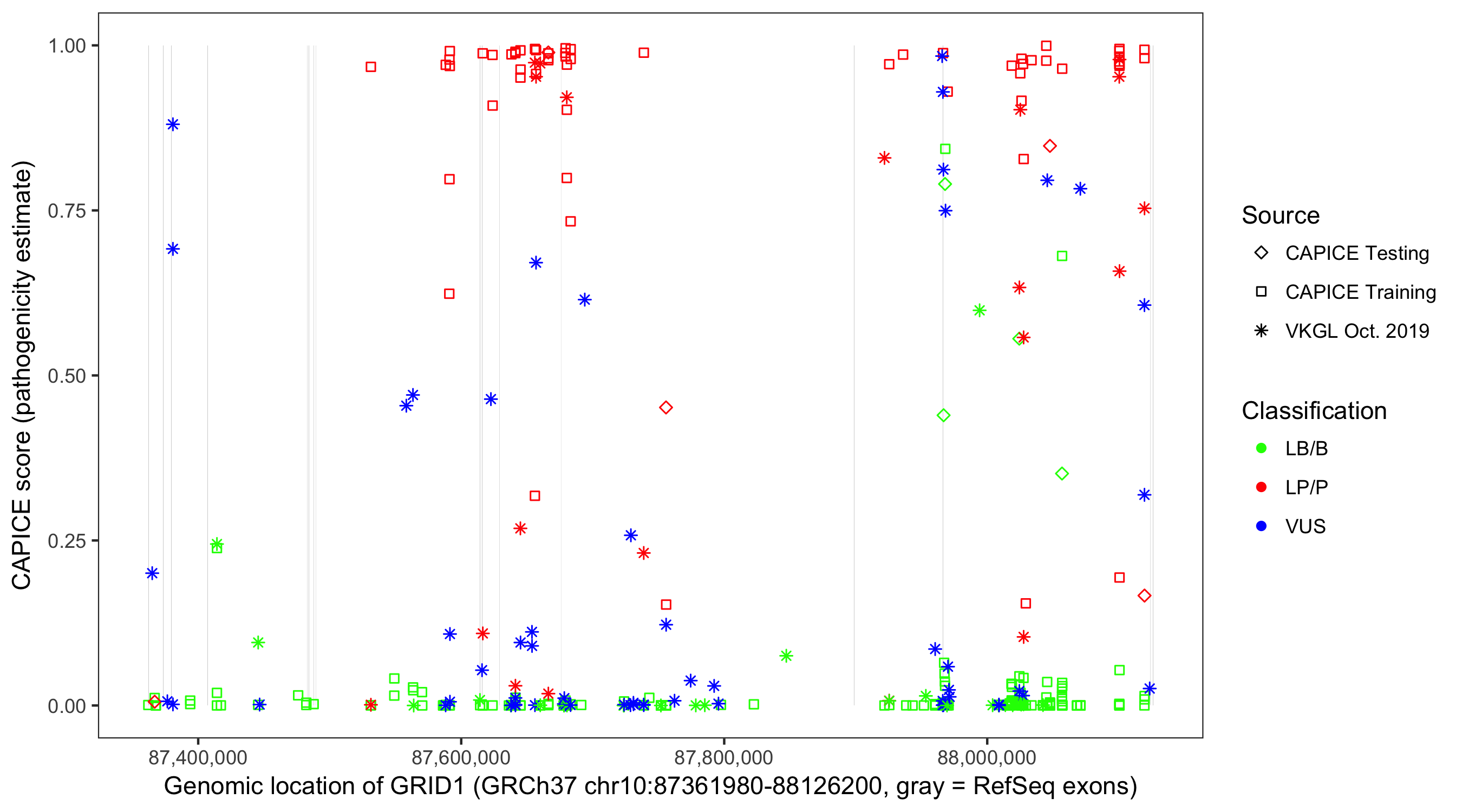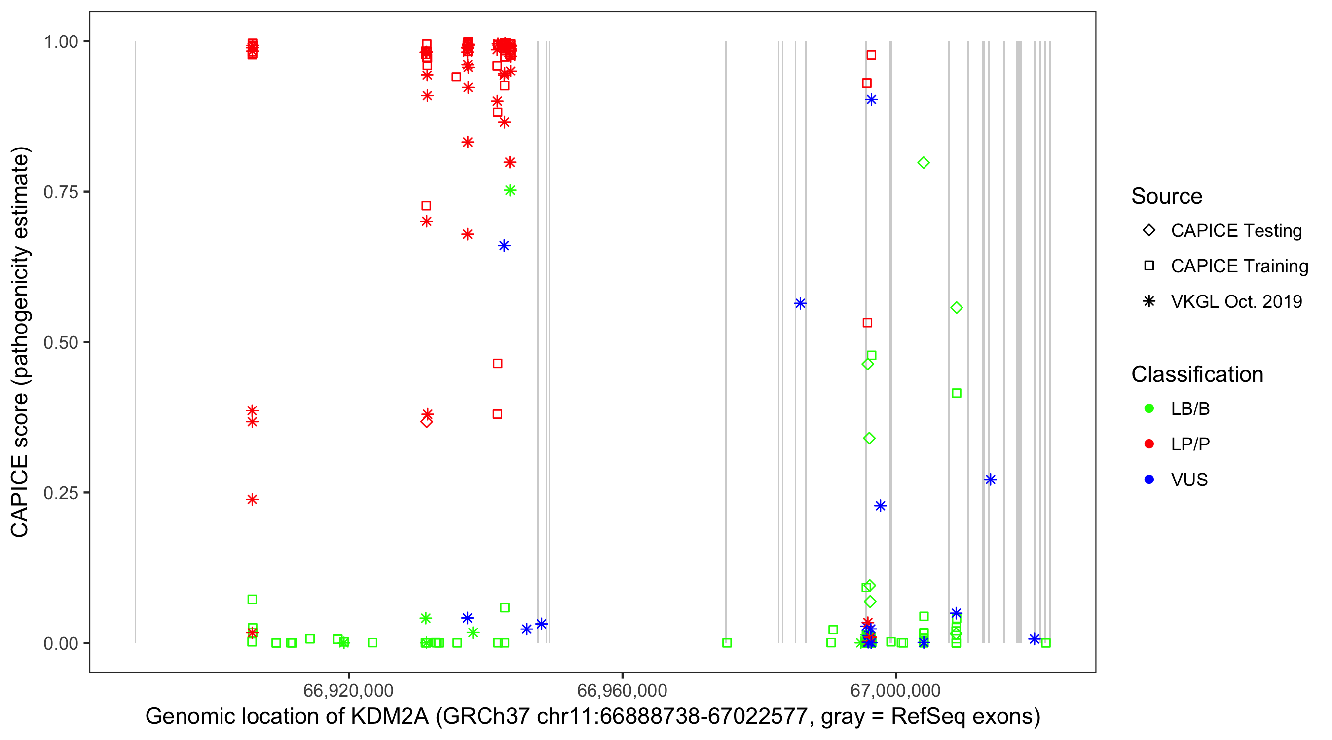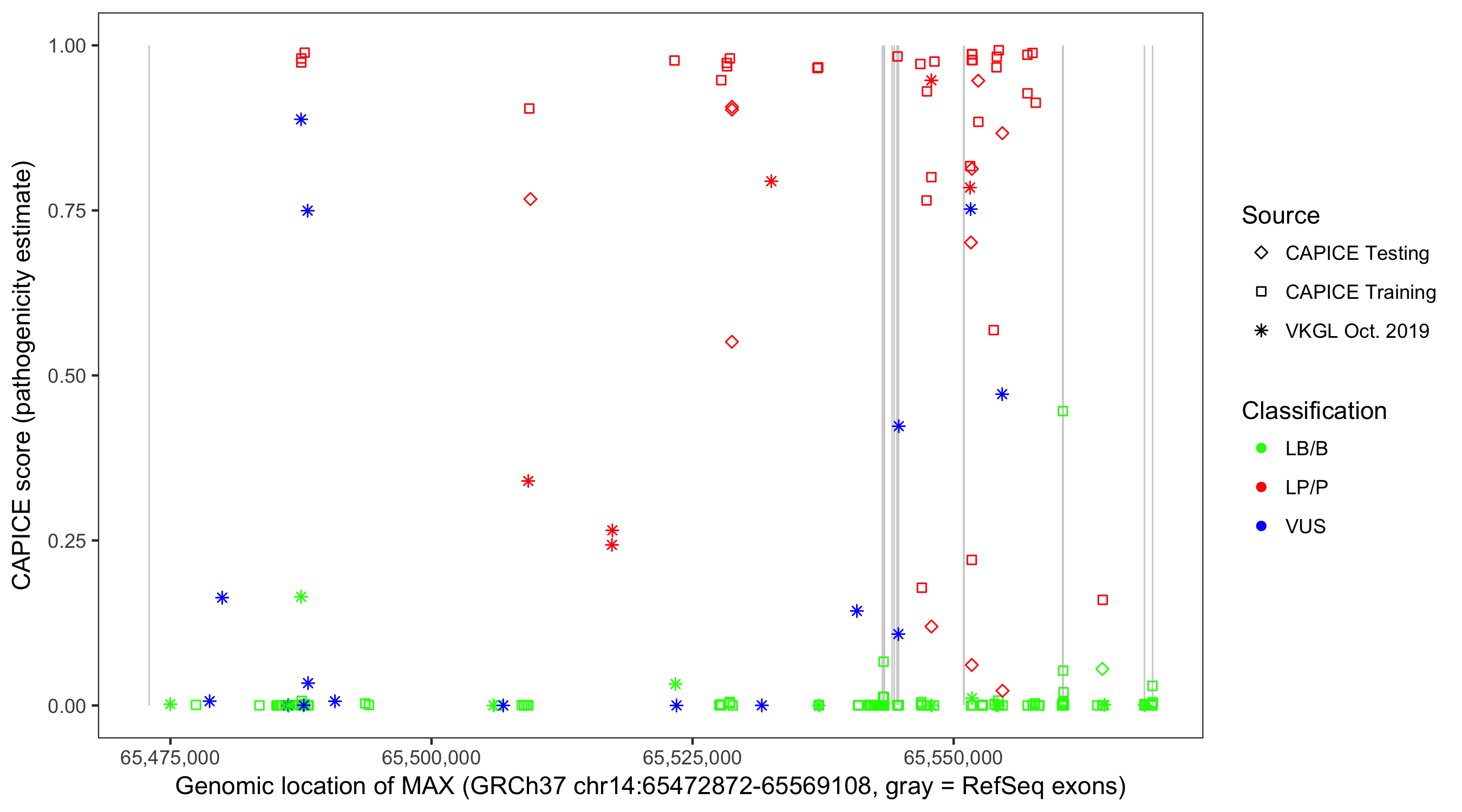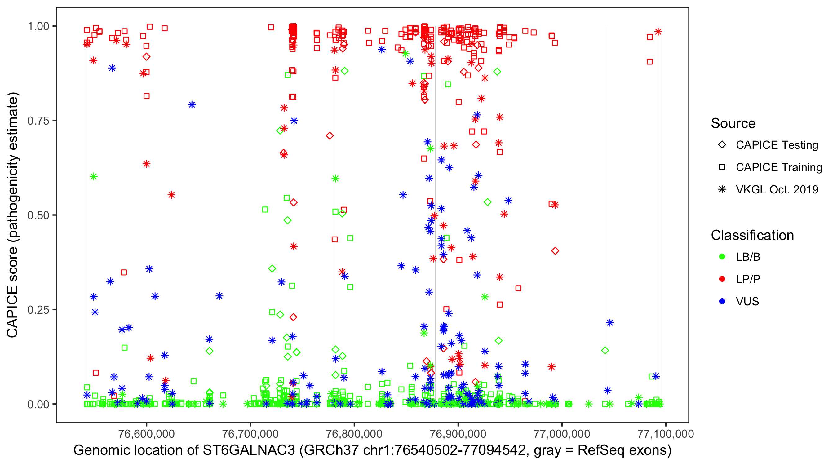 Shown are CAPICE train/test variants plus VKGL Oct 2019.