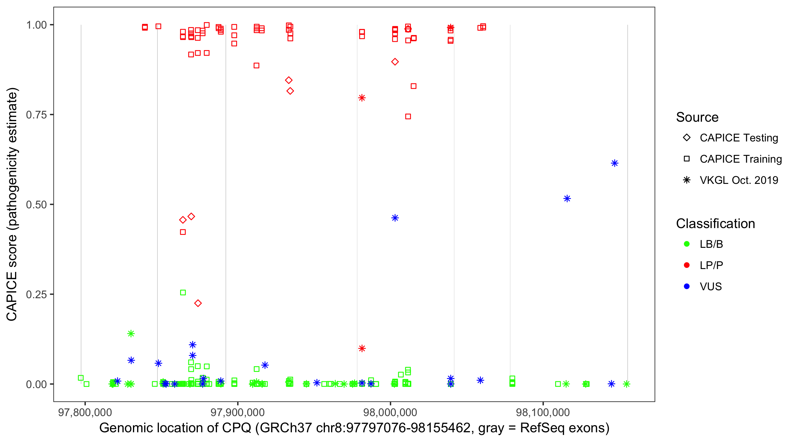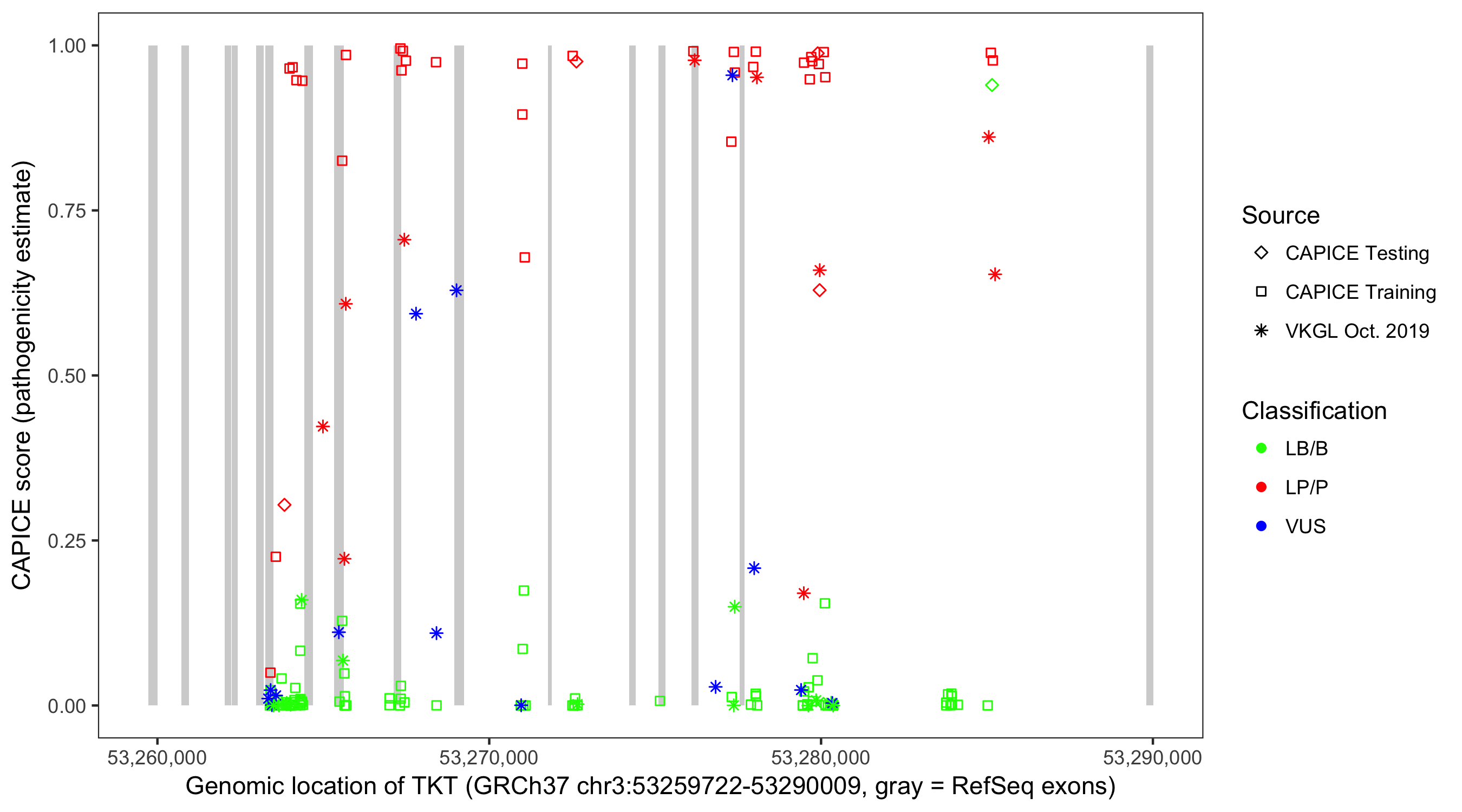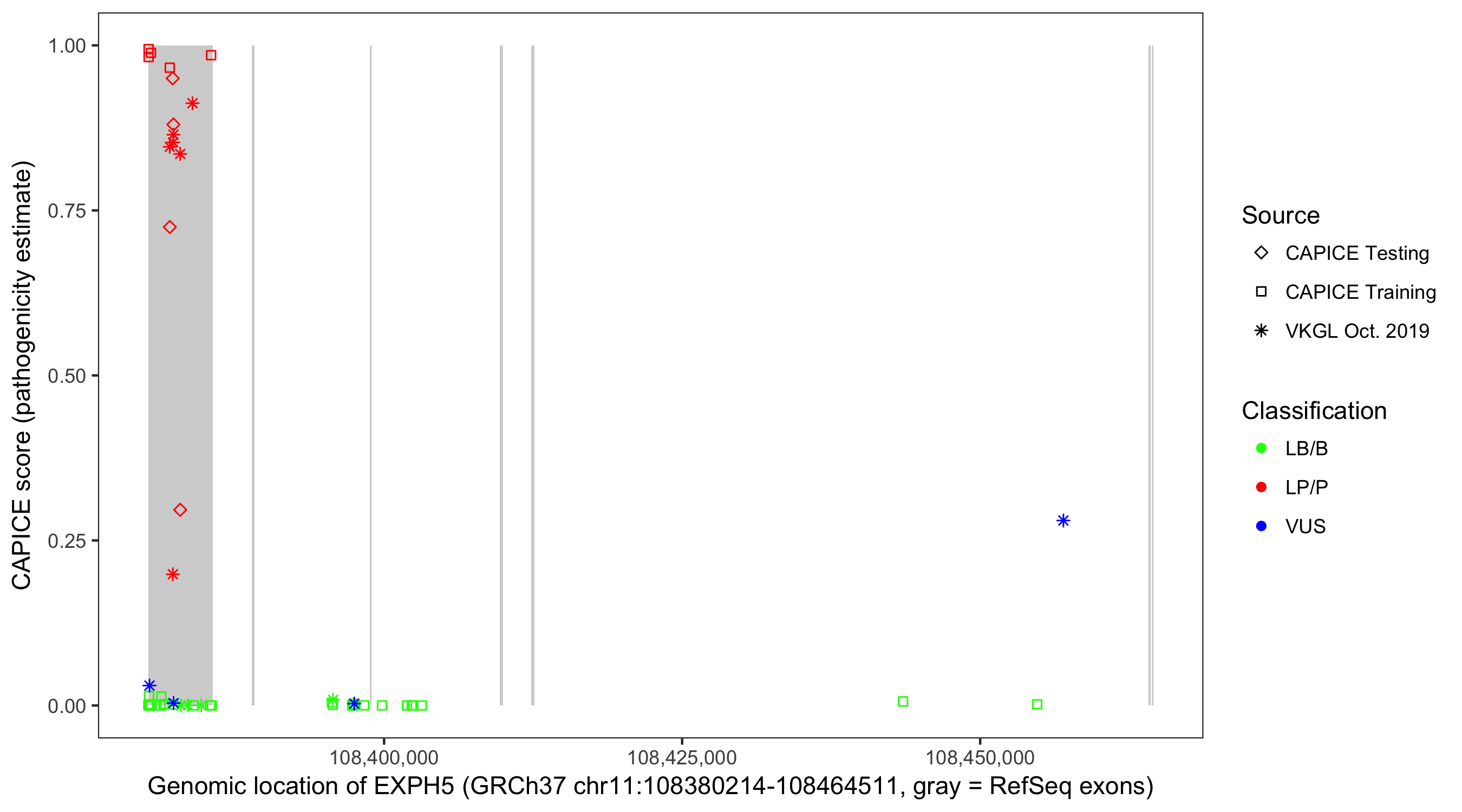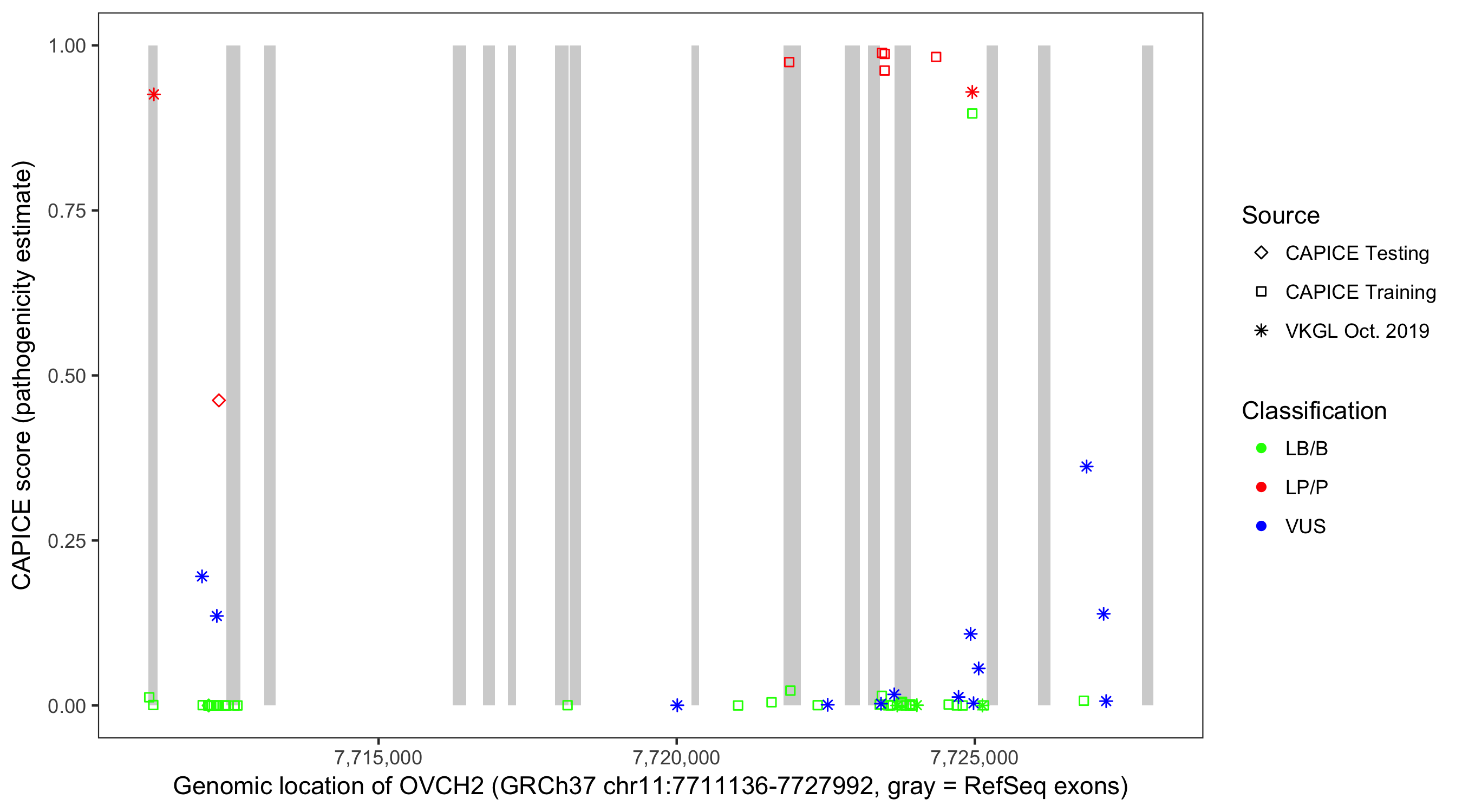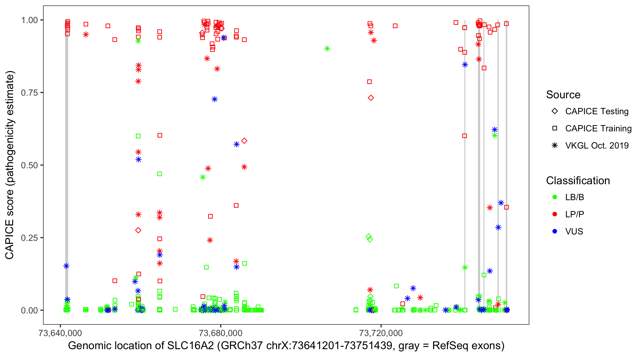 Shown are CAPICE train/test variants plus VKGL Oct 2019.