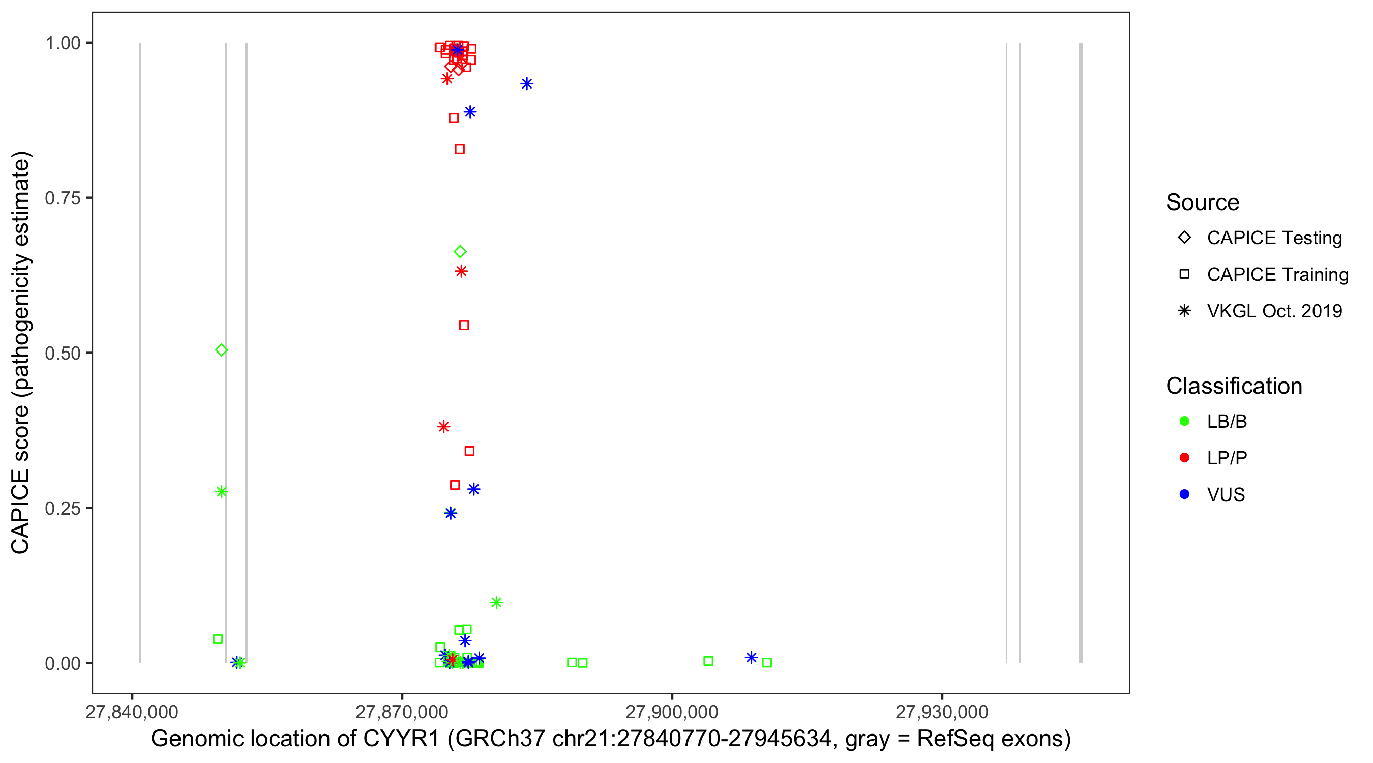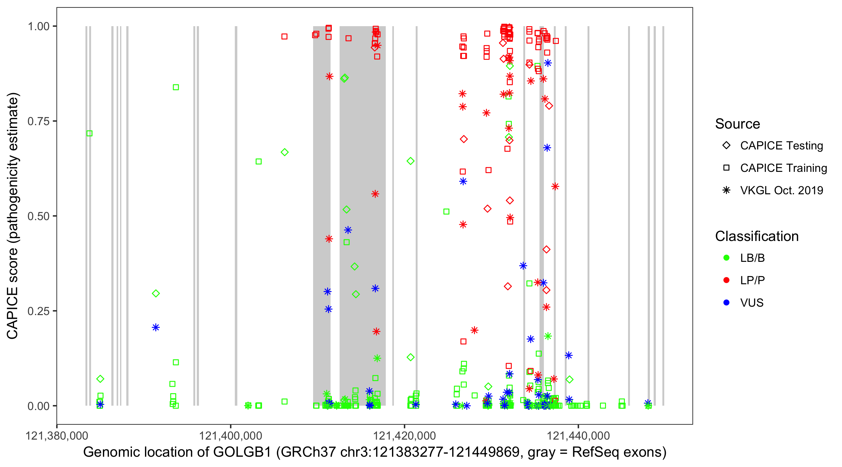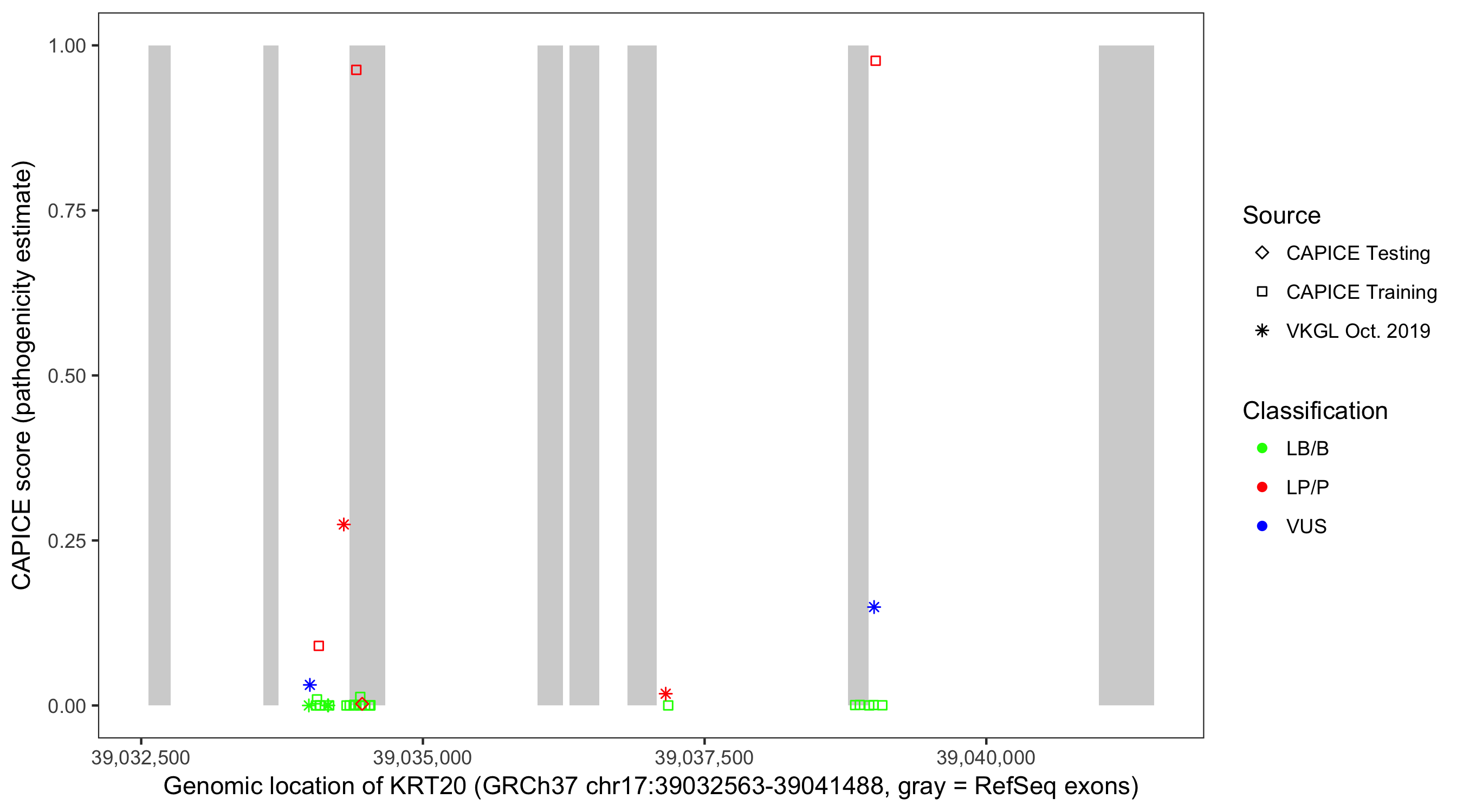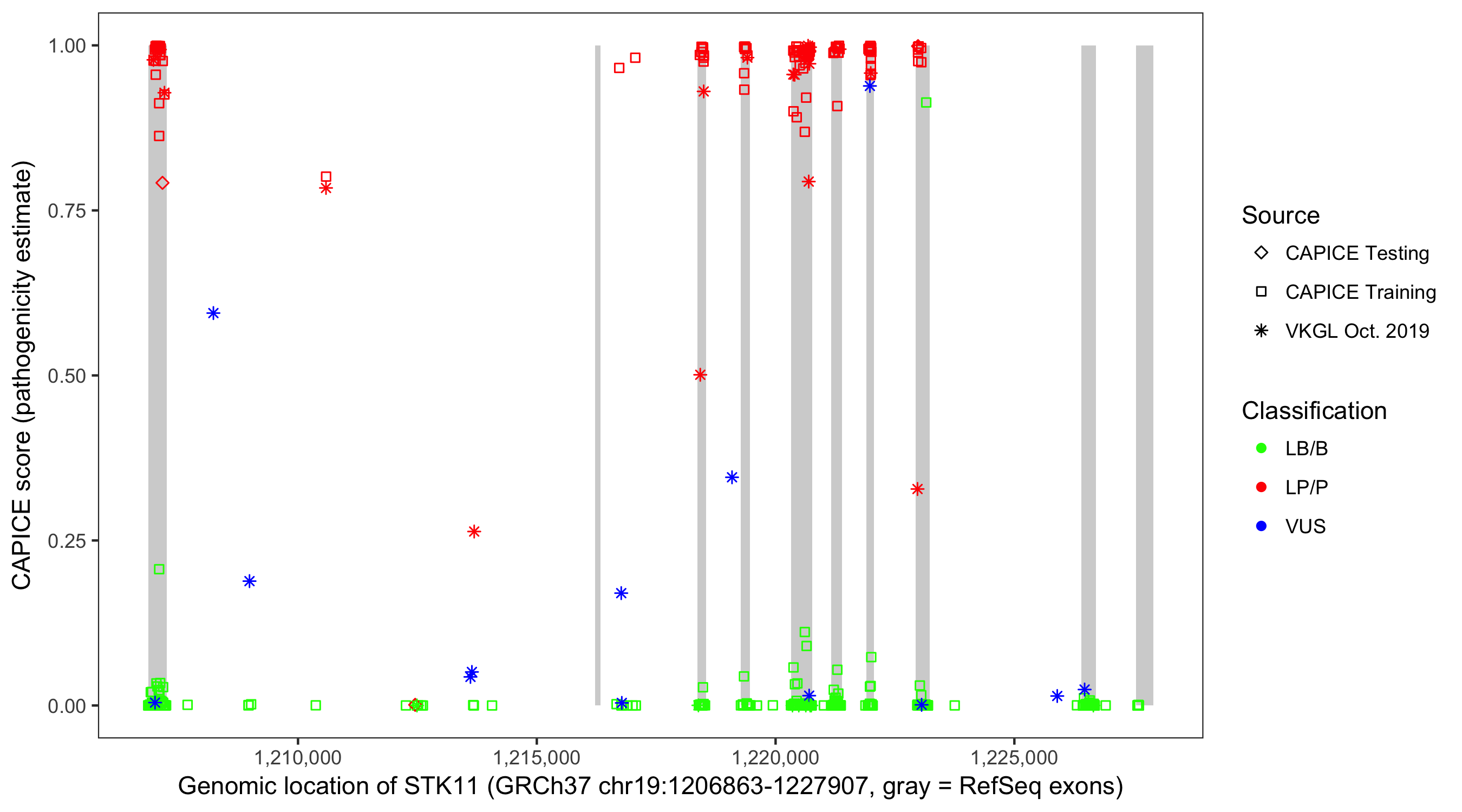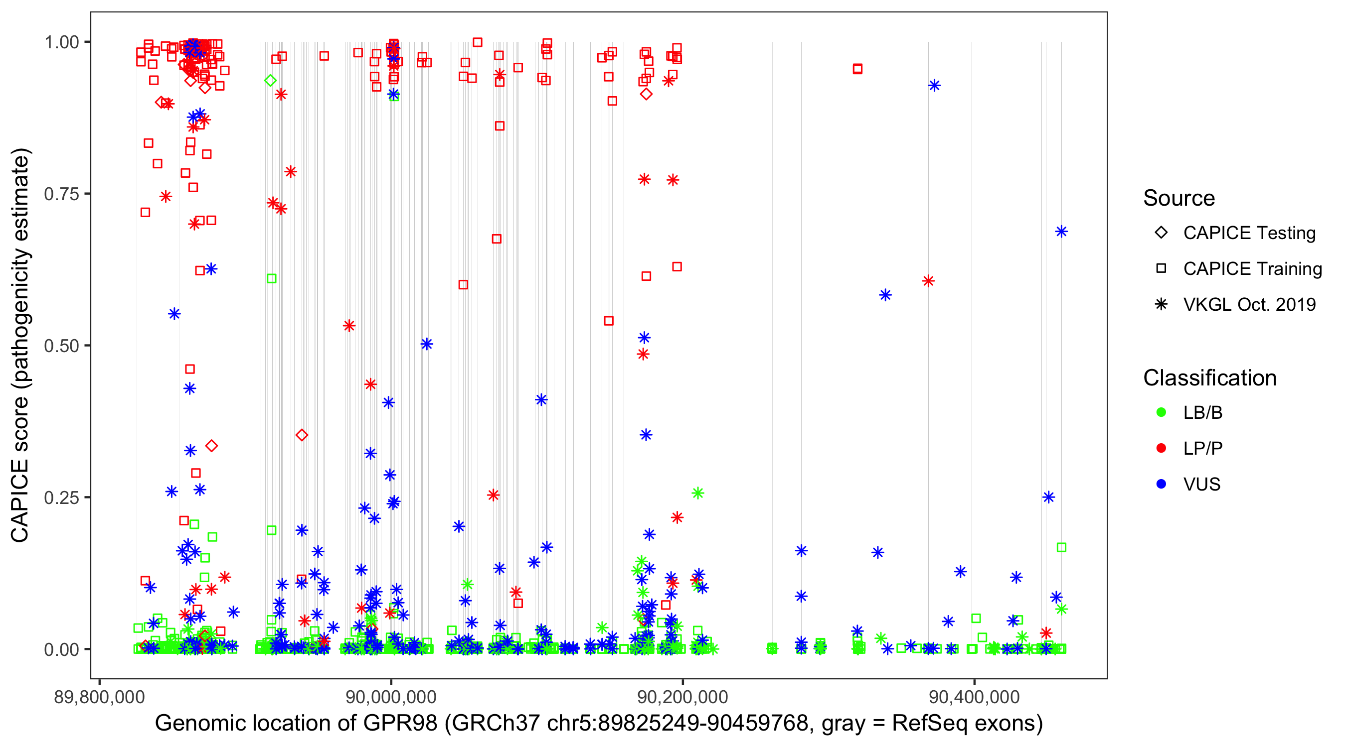 Shown are CAPICE train/test variants plus VKGL Oct 2019.