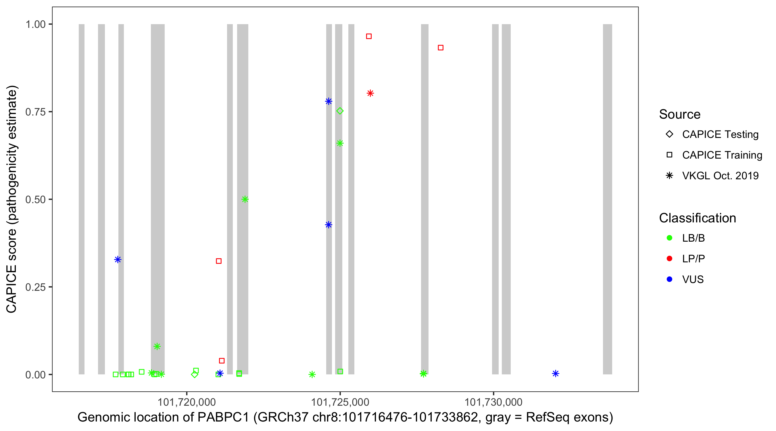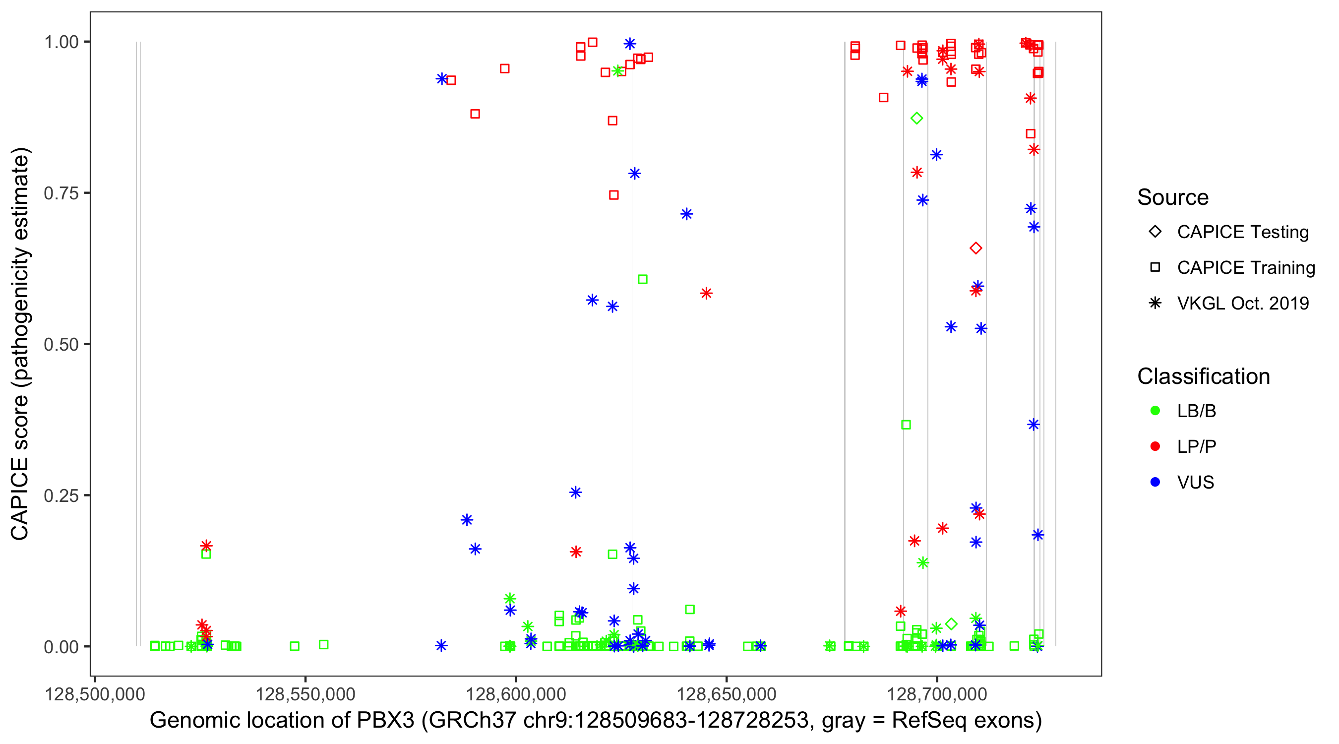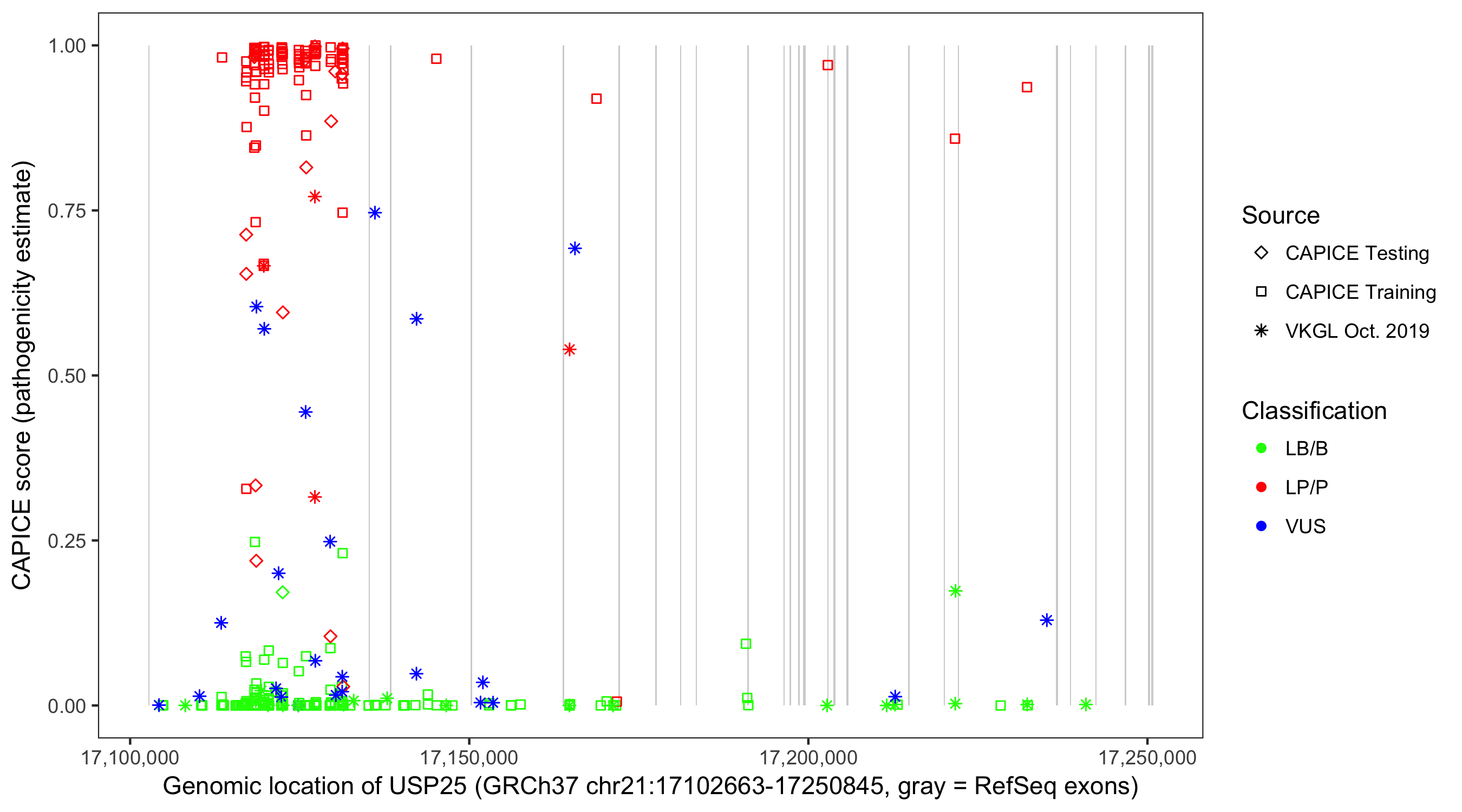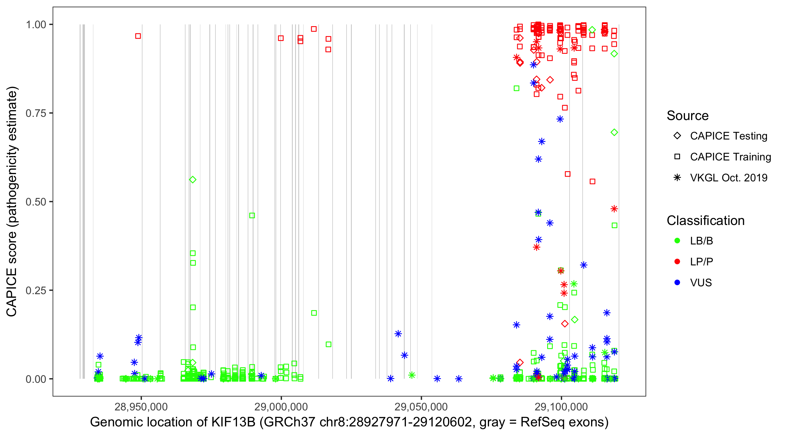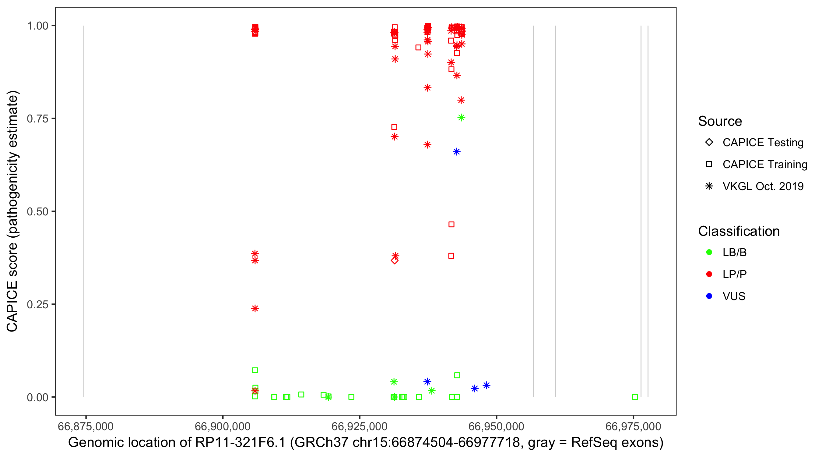 Shown are CAPICE train/test variants plus VKGL Oct 2019.