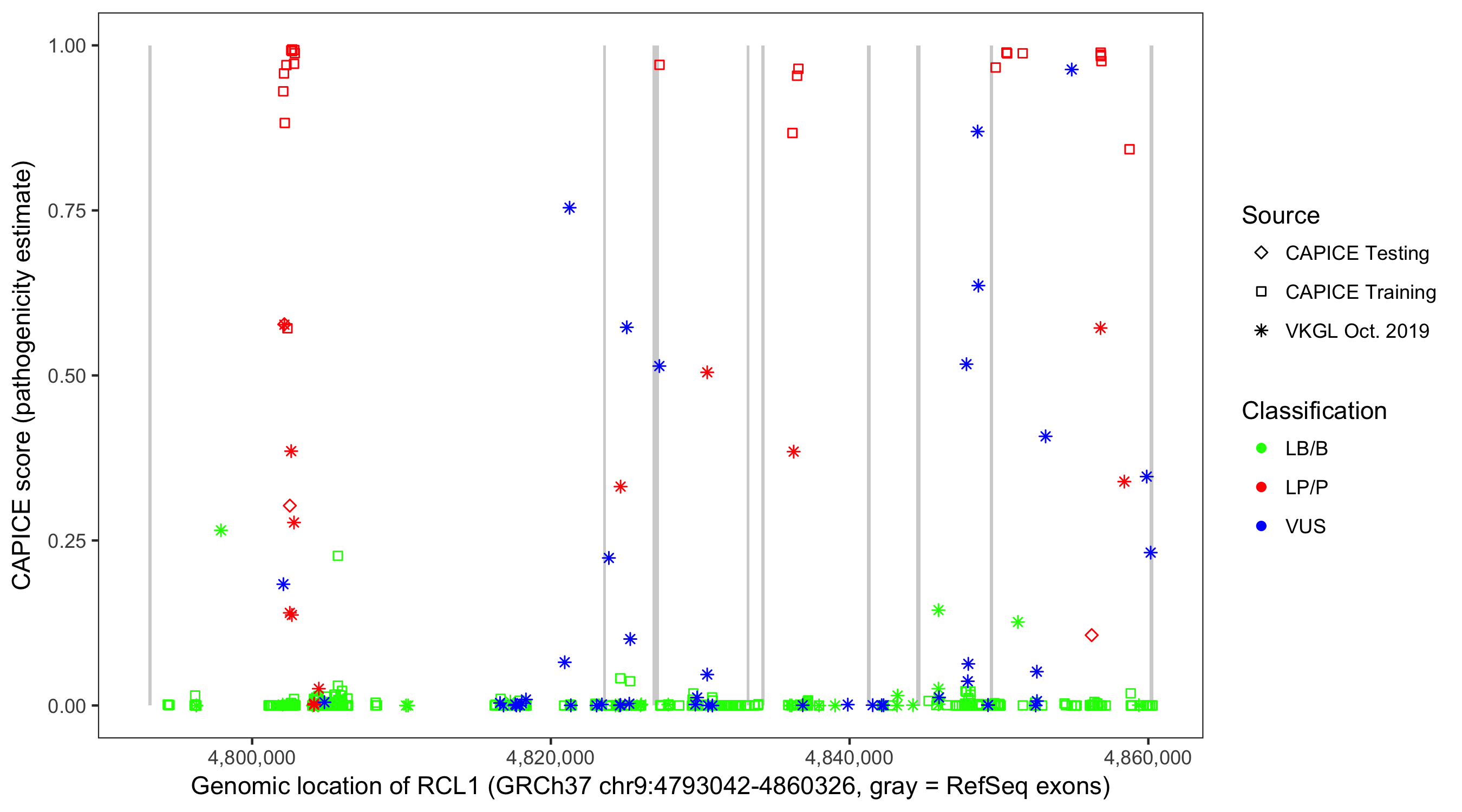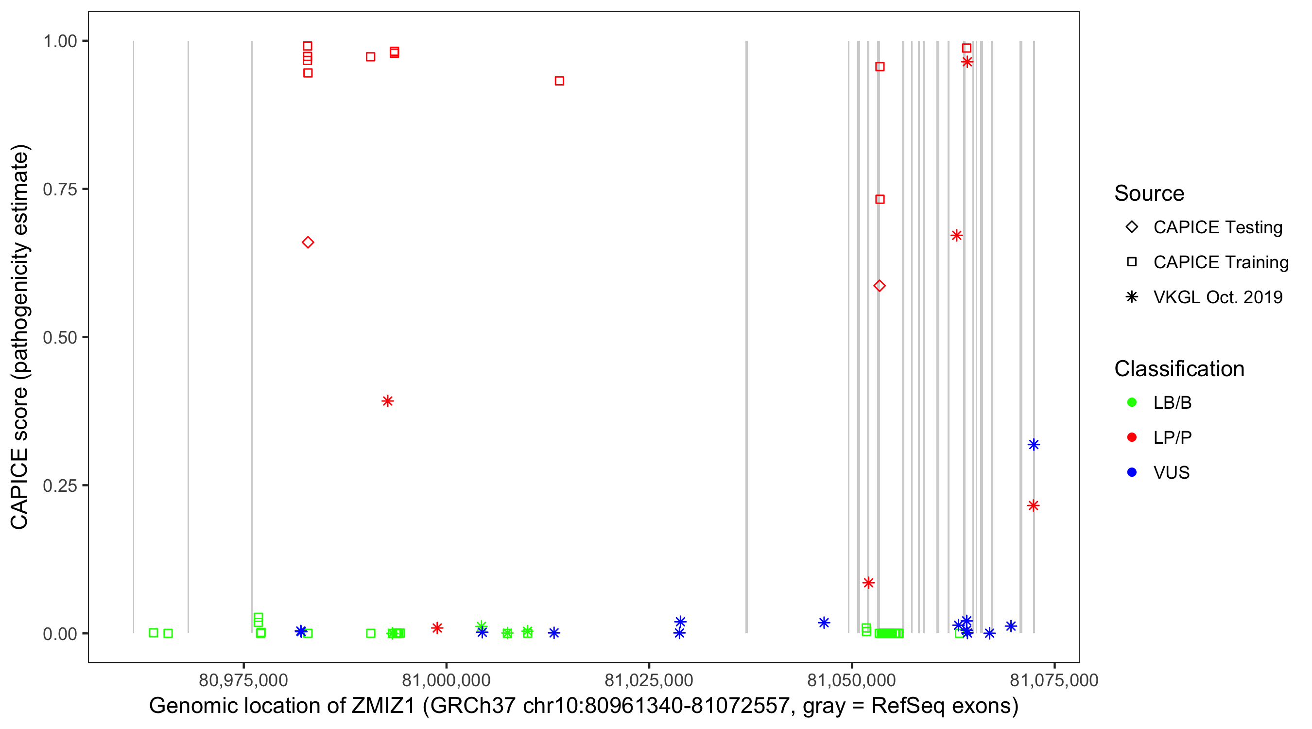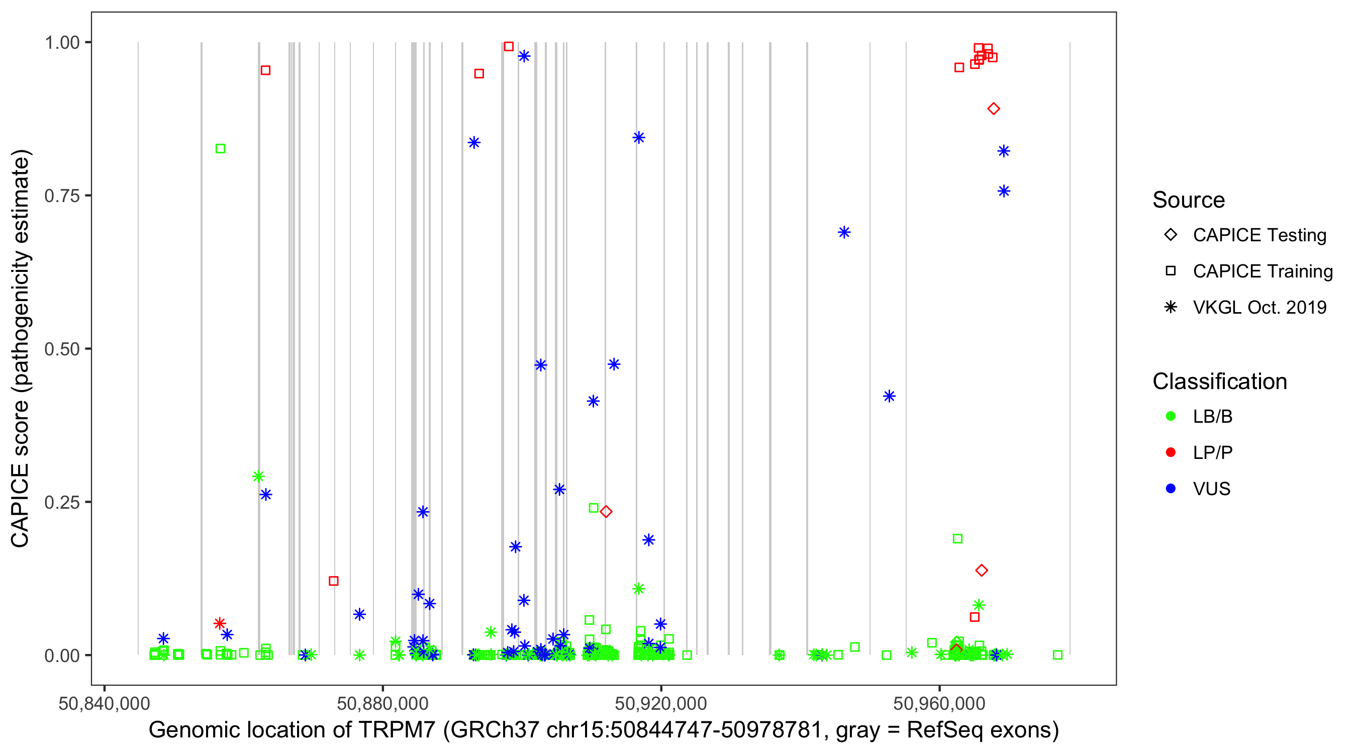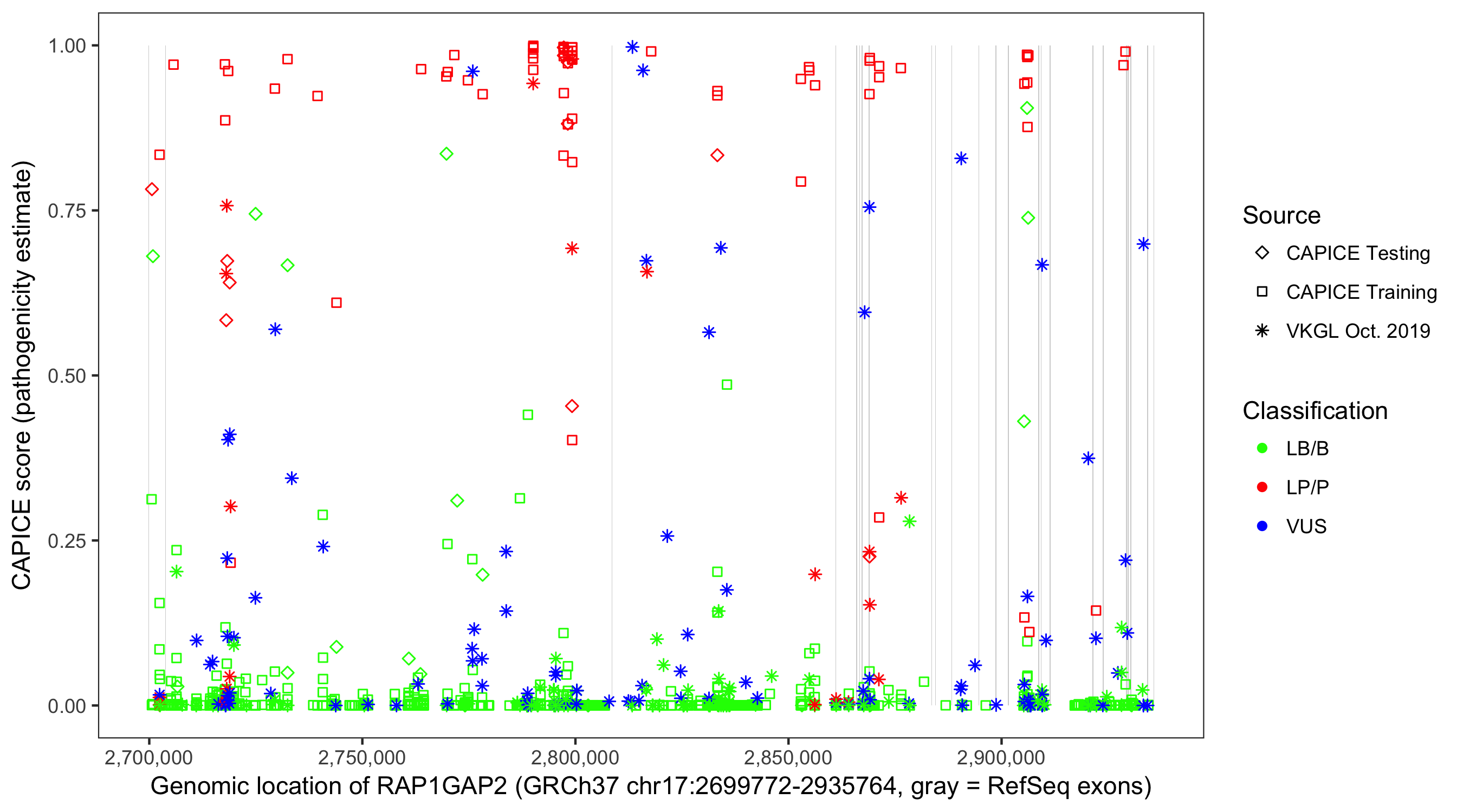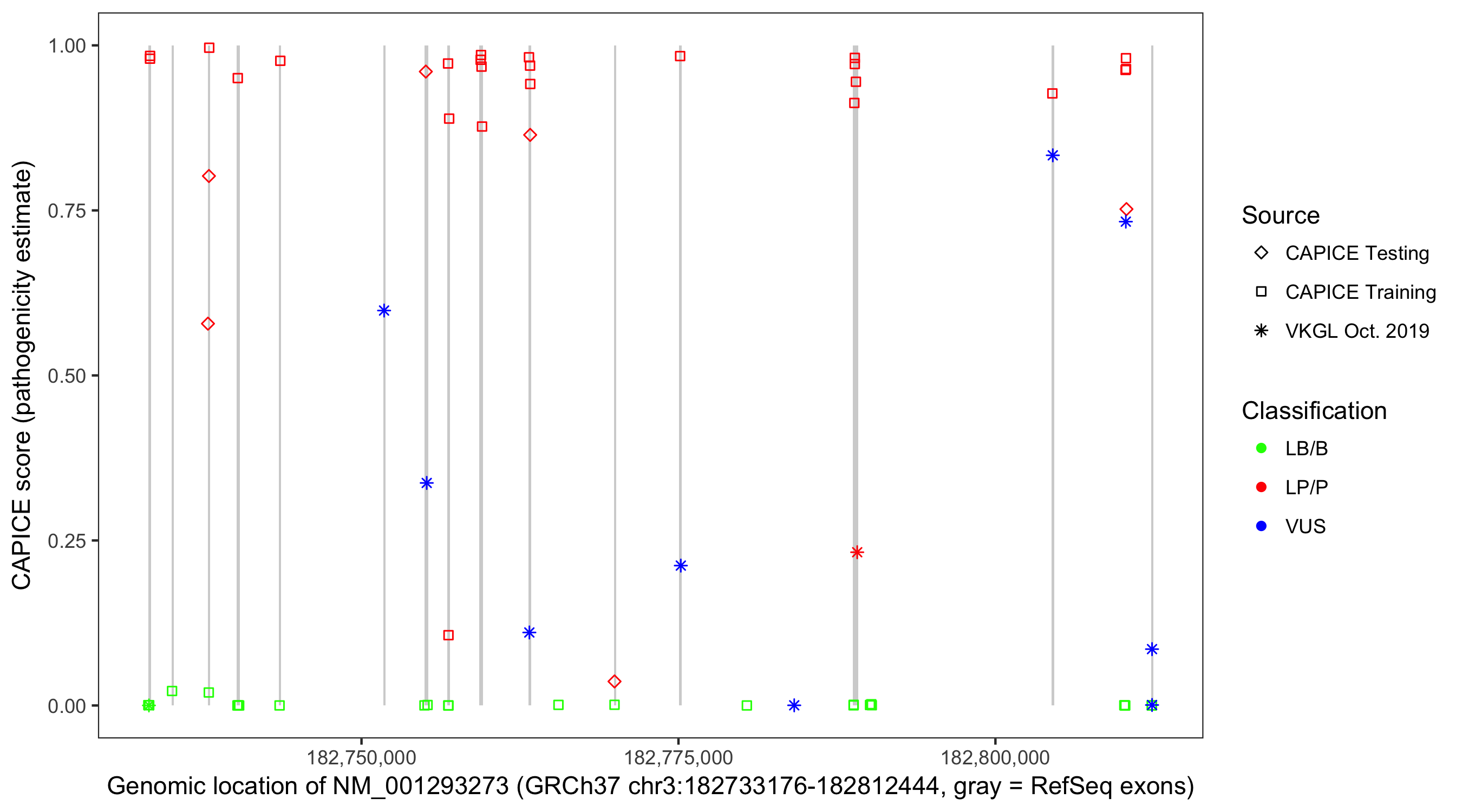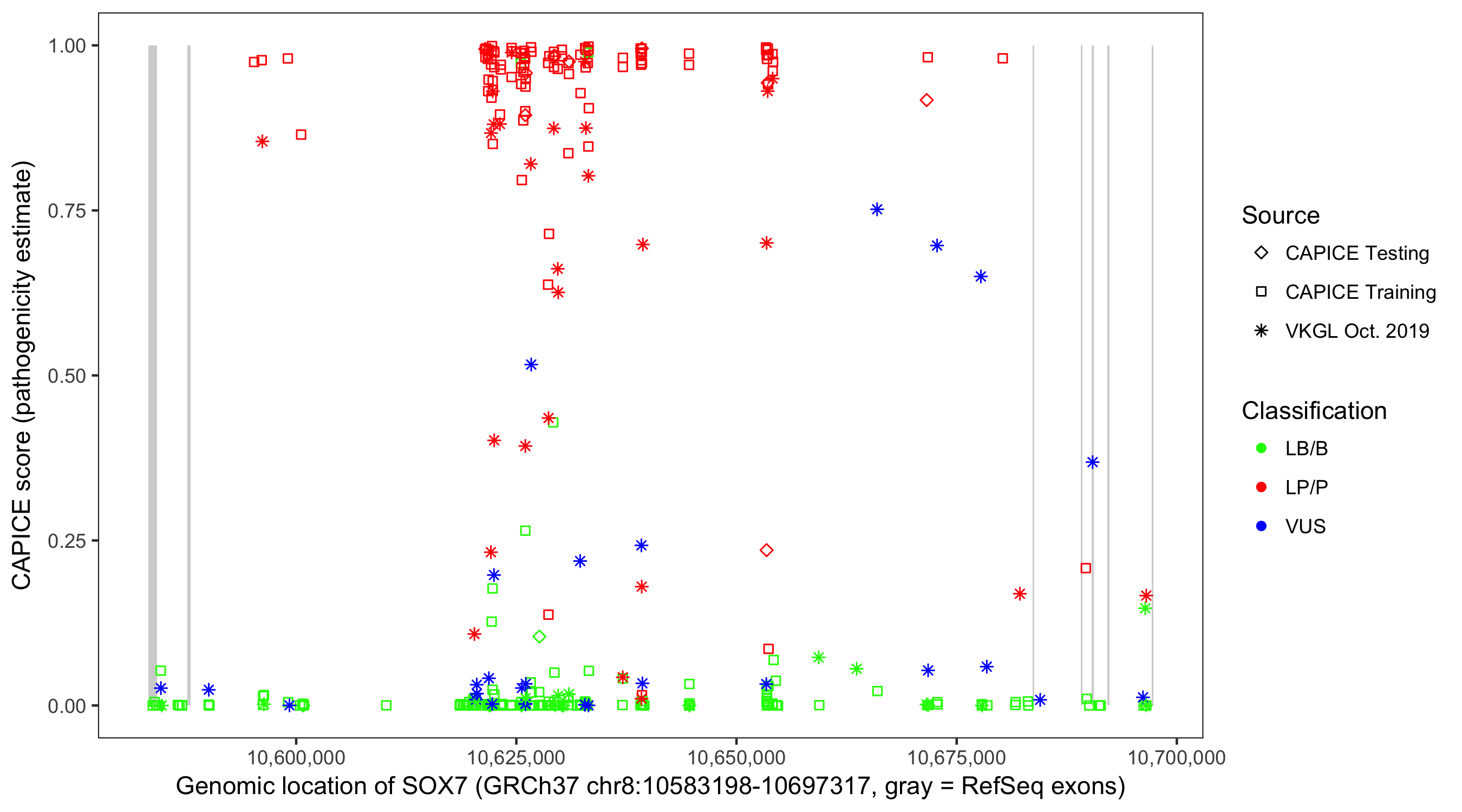 Shown are CAPICE train/test variants plus VKGL Oct 2019.