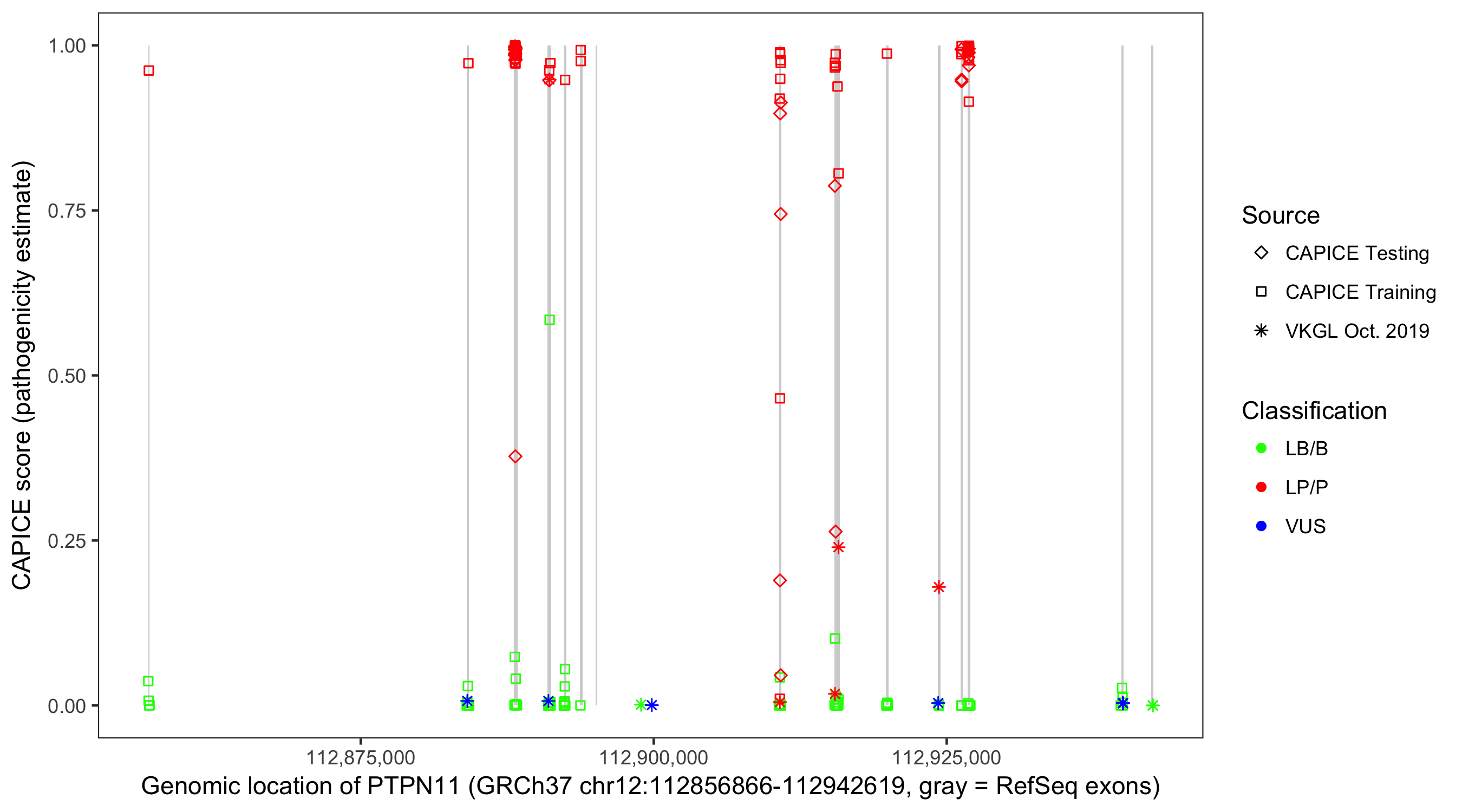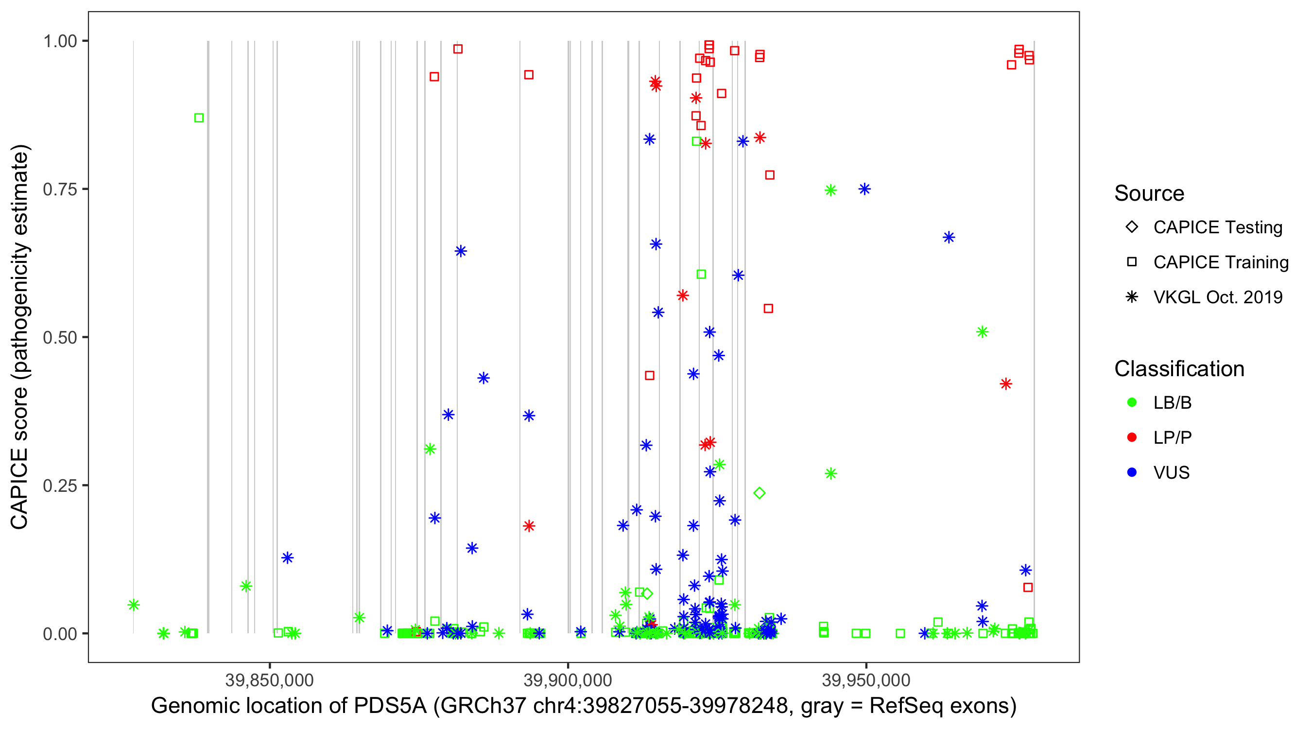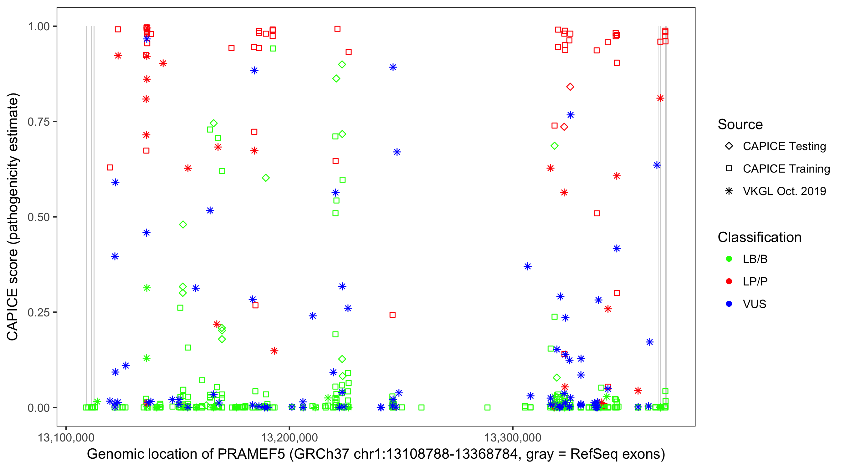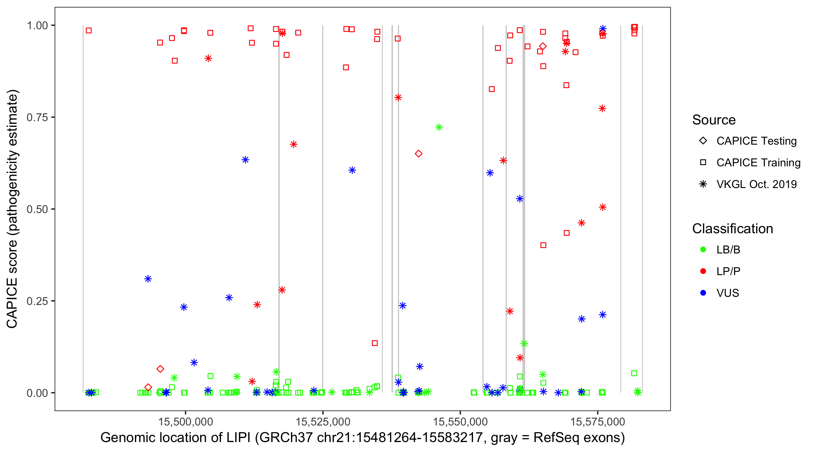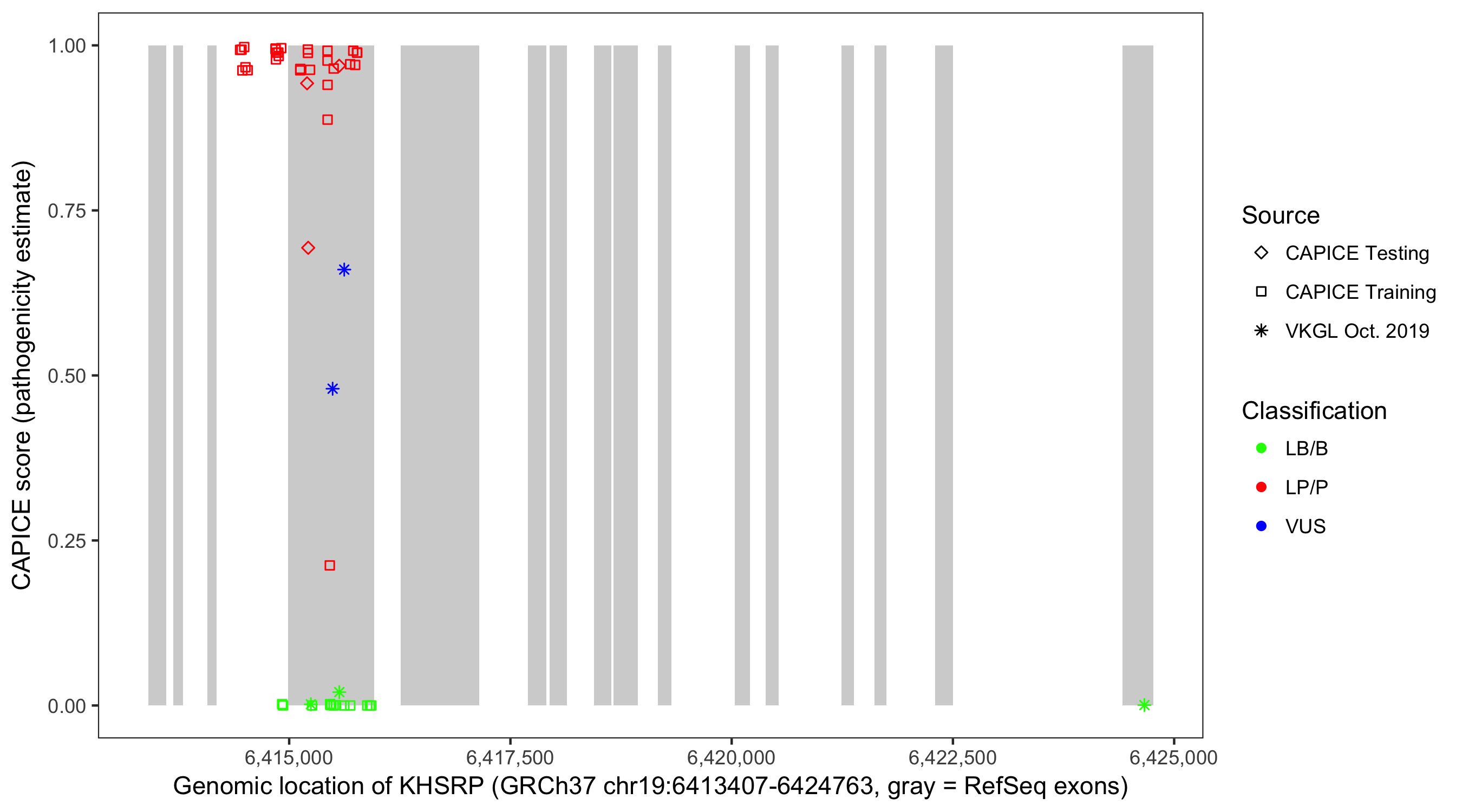 Shown are CAPICE train/test variants plus VKGL Oct 2019.