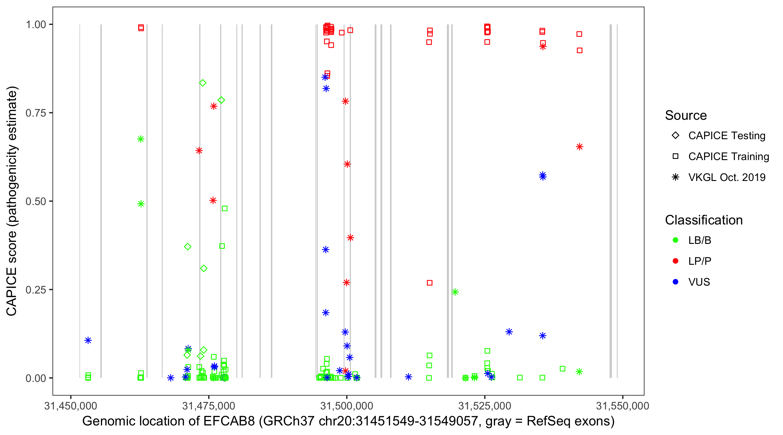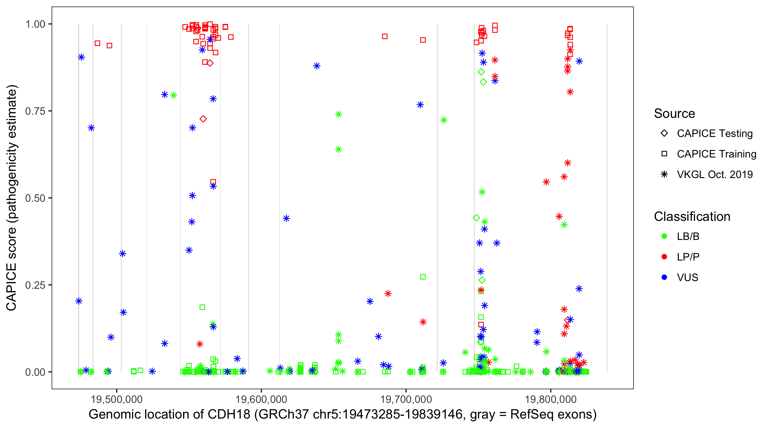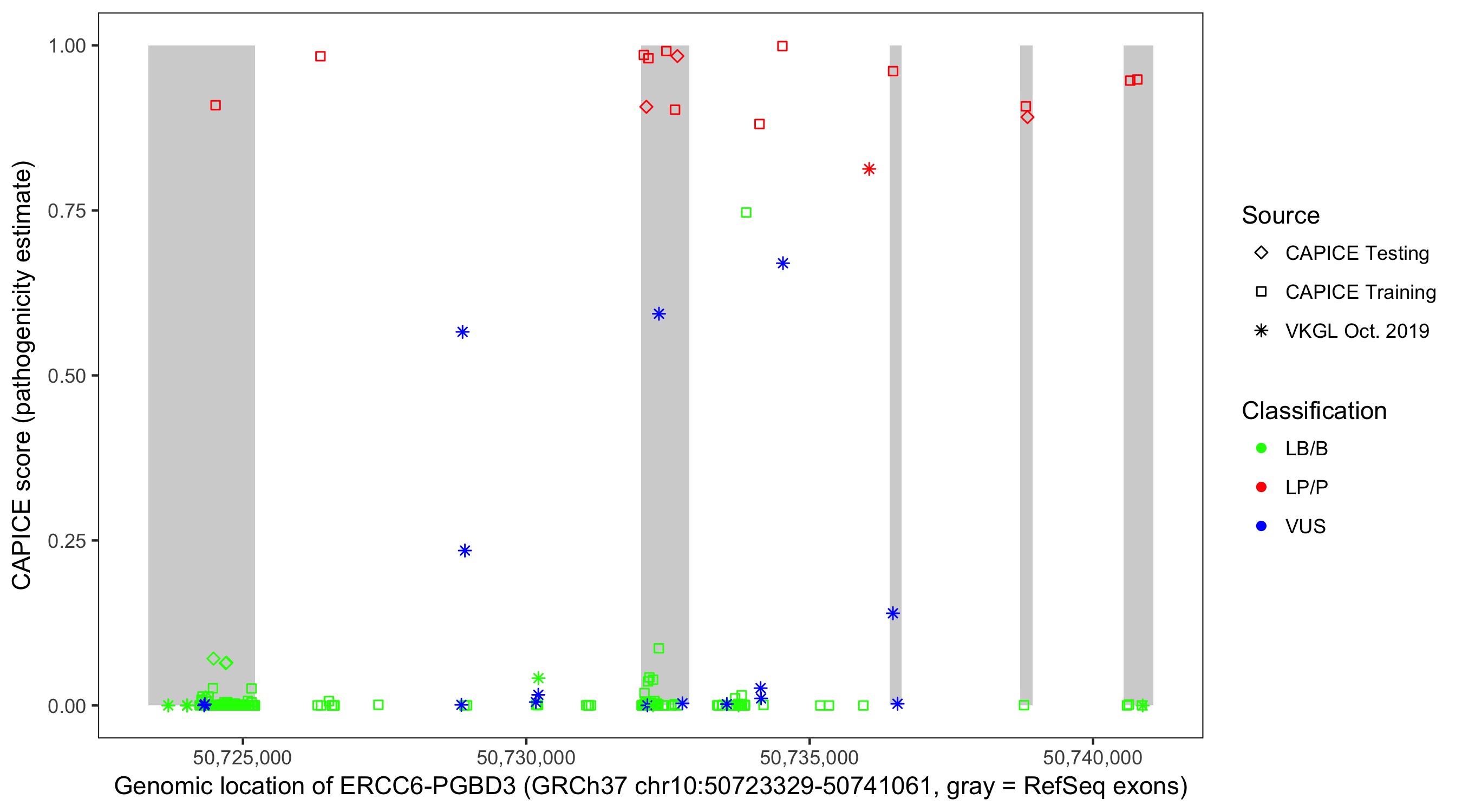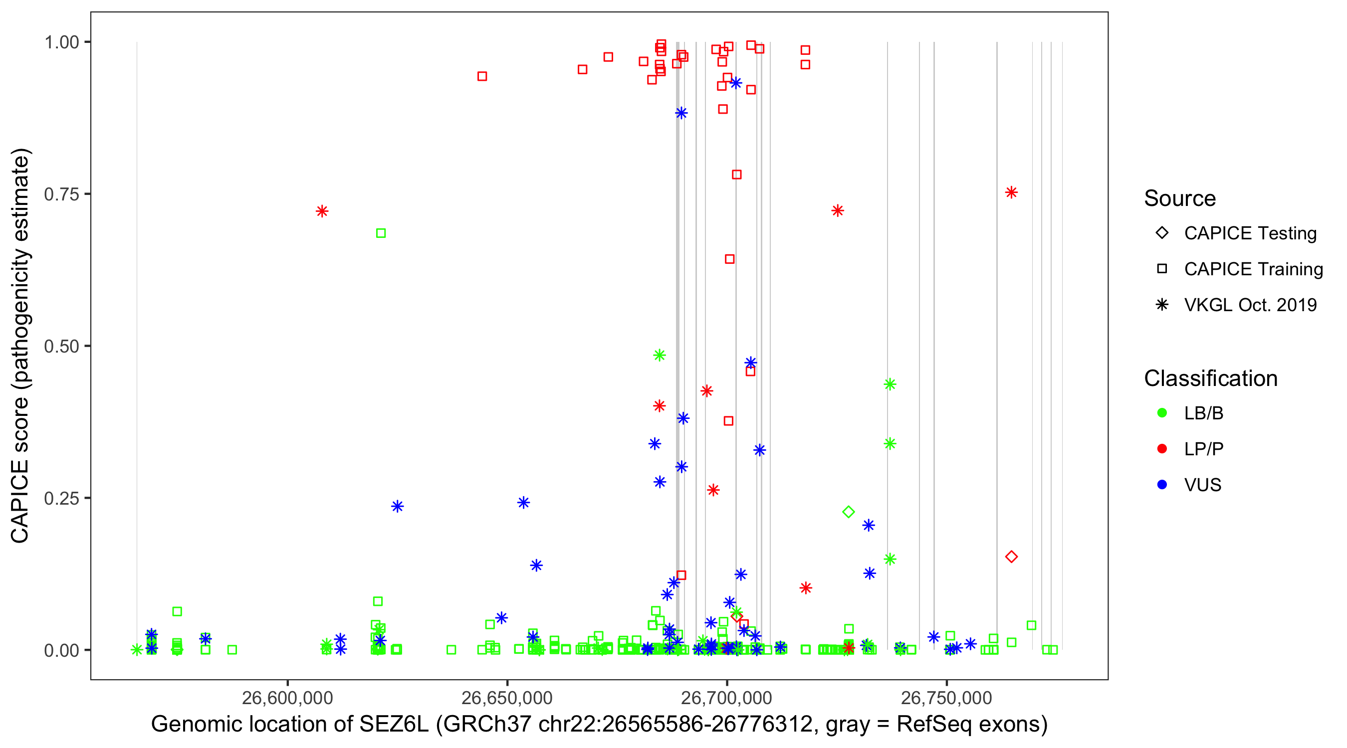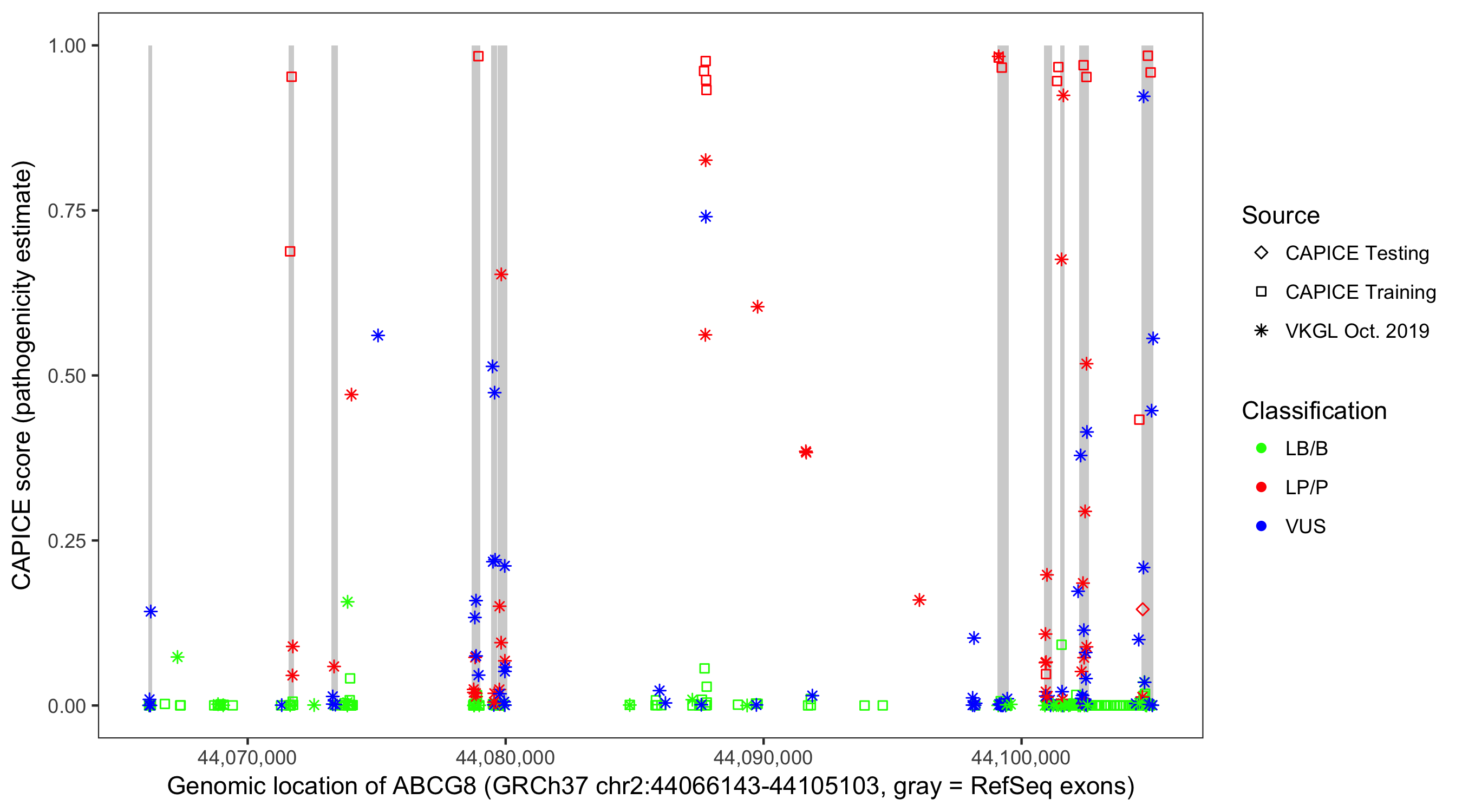 Shown are CAPICE train/test variants plus VKGL Oct 2019.