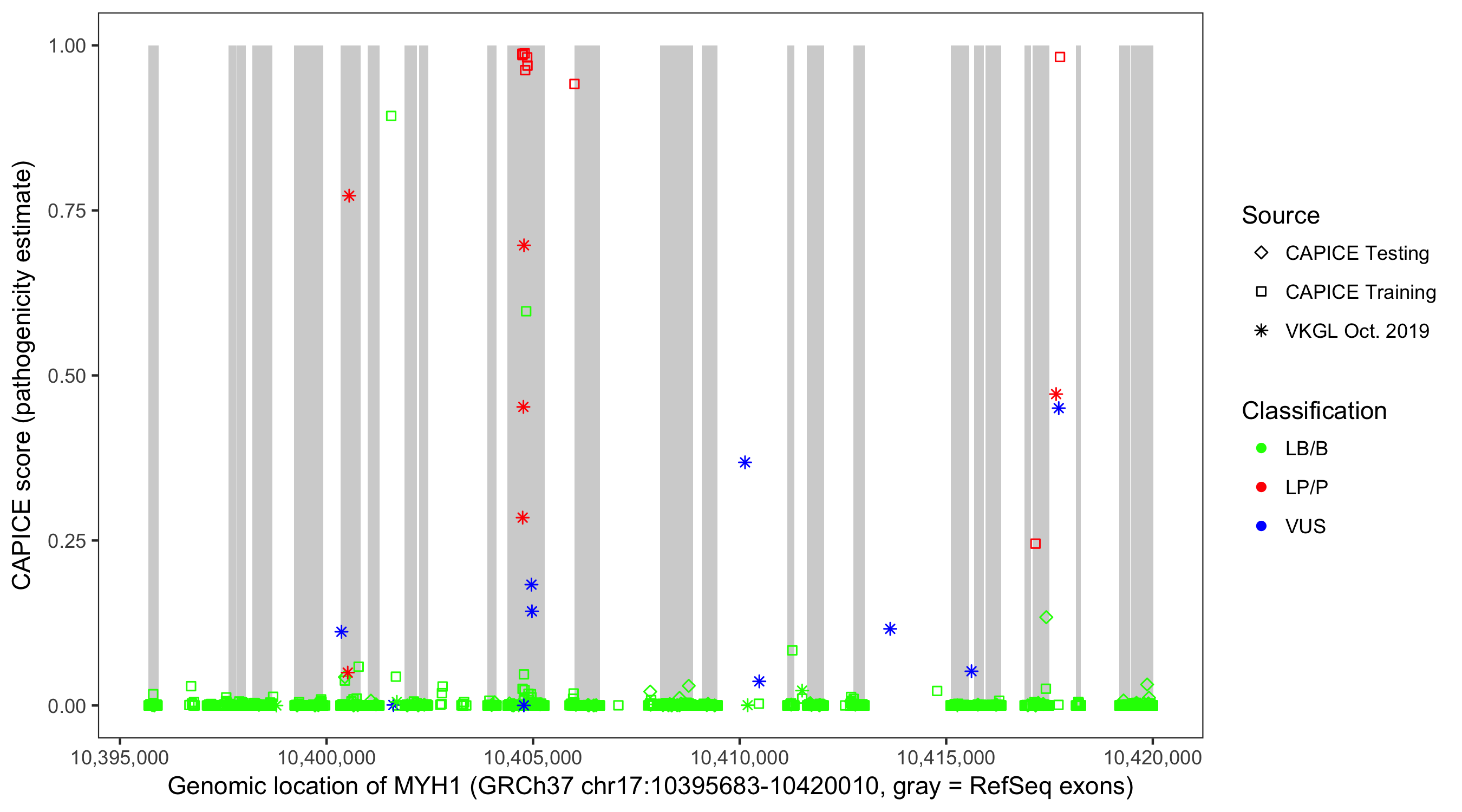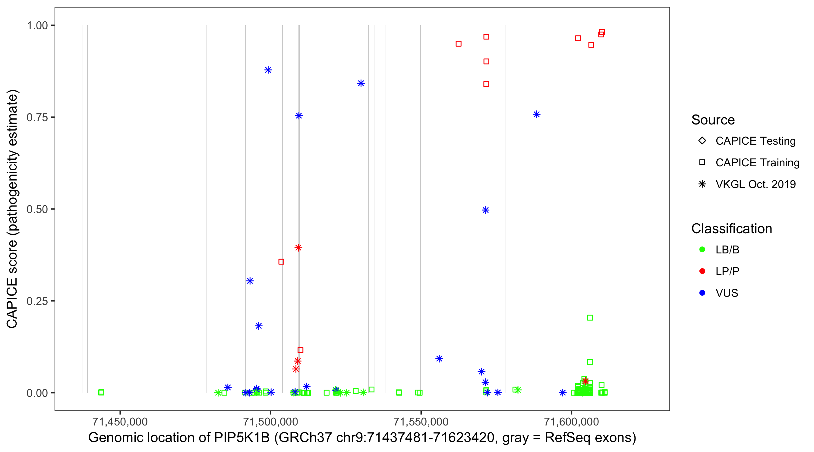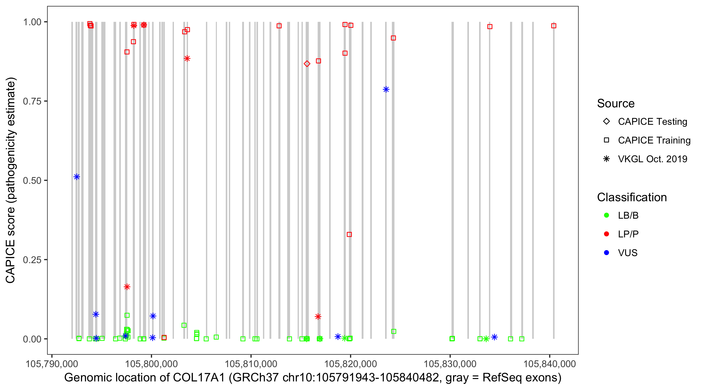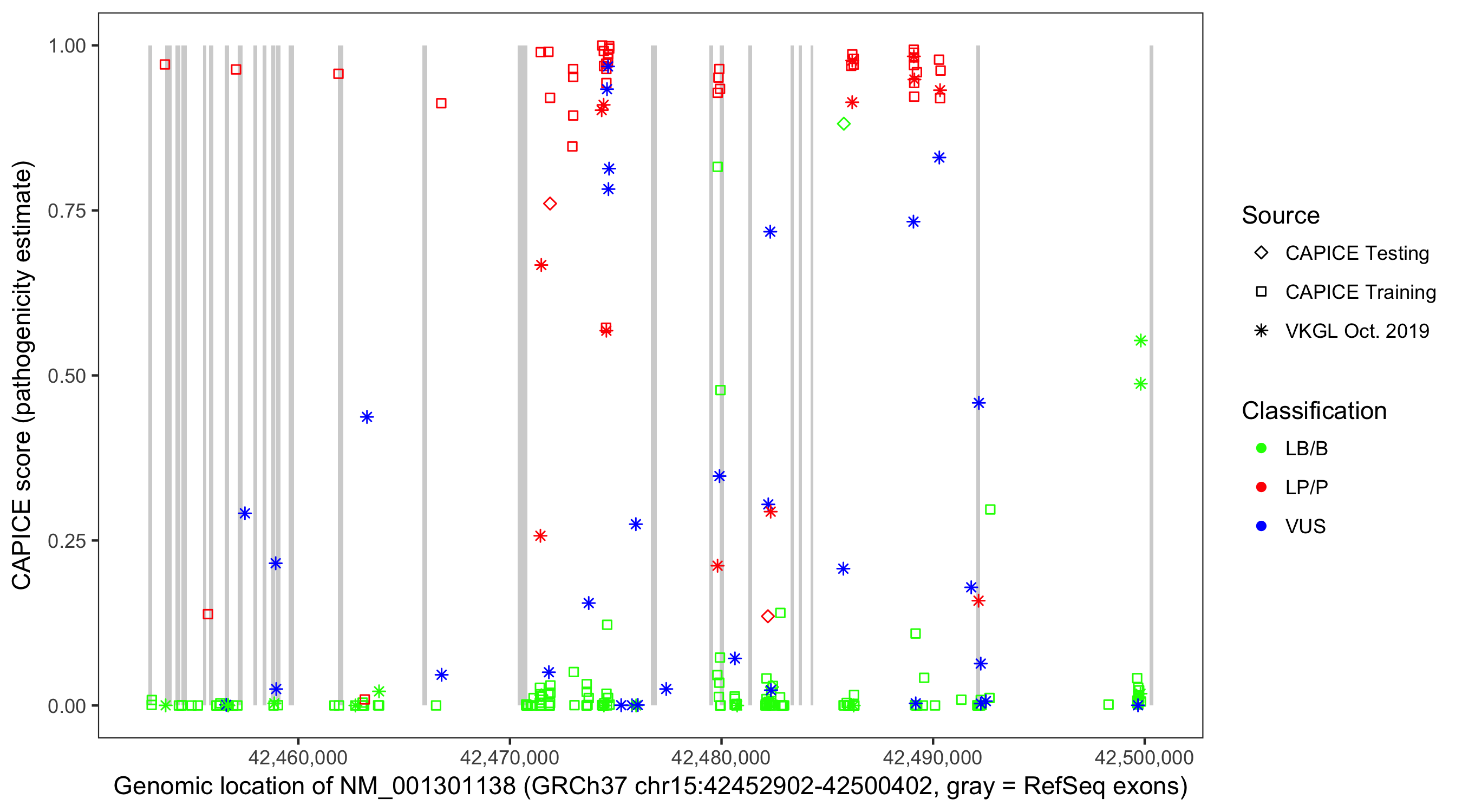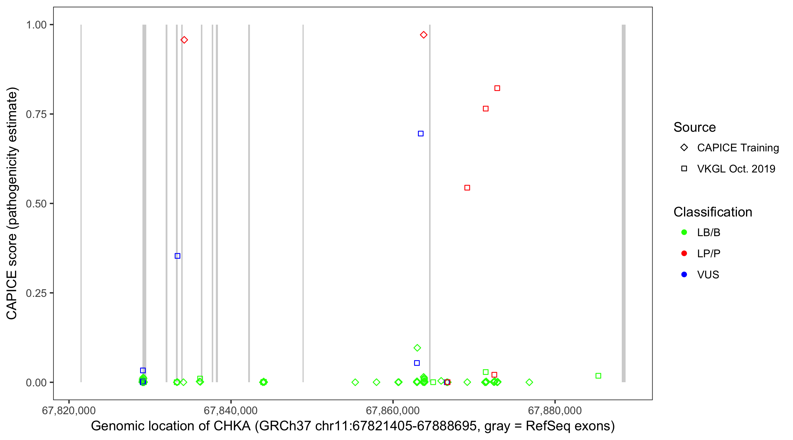 Shown are CAPICE train/test variants plus VKGL Oct 2019.