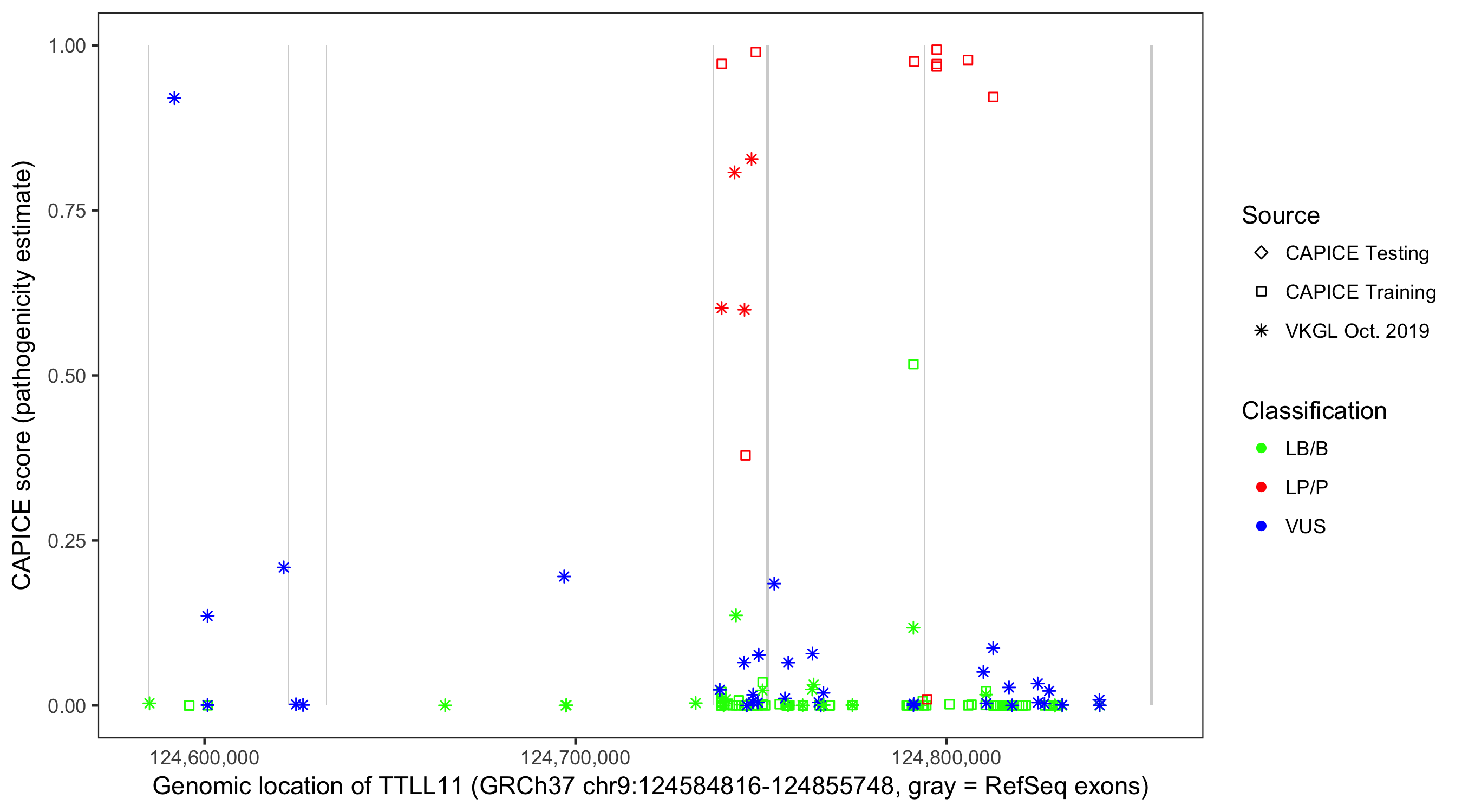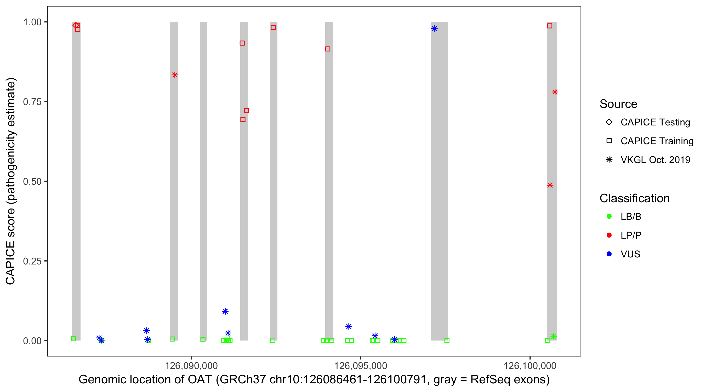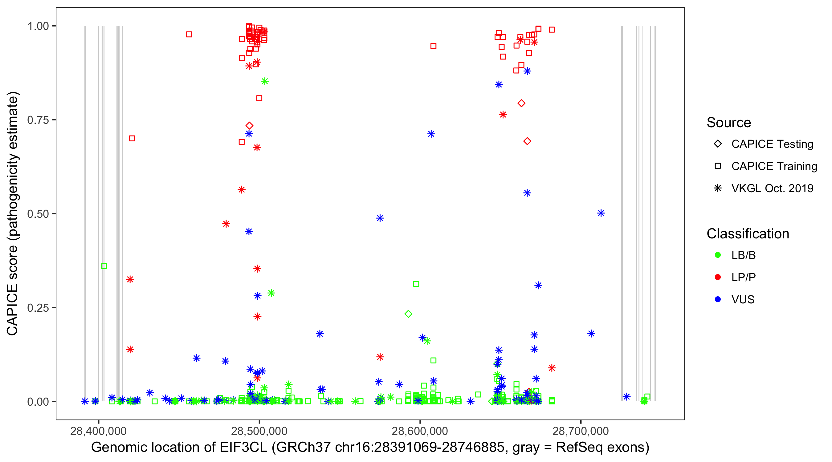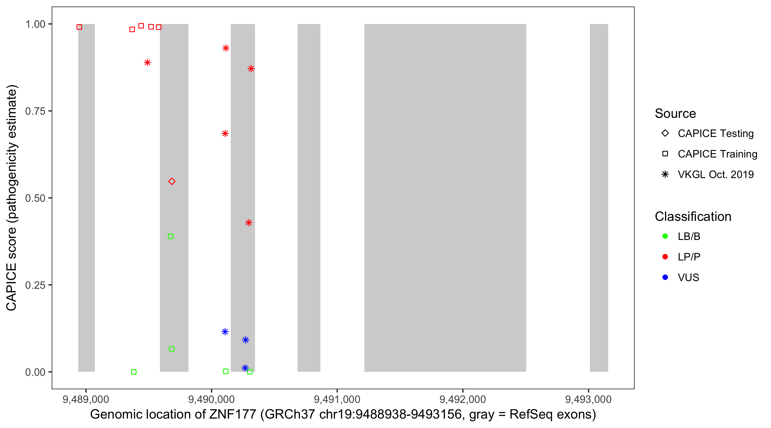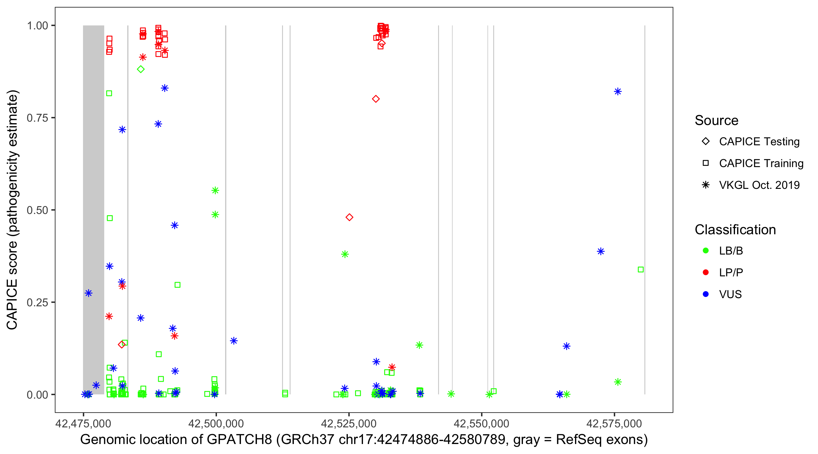 Shown are CAPICE train/test variants plus VKGL Oct 2019.