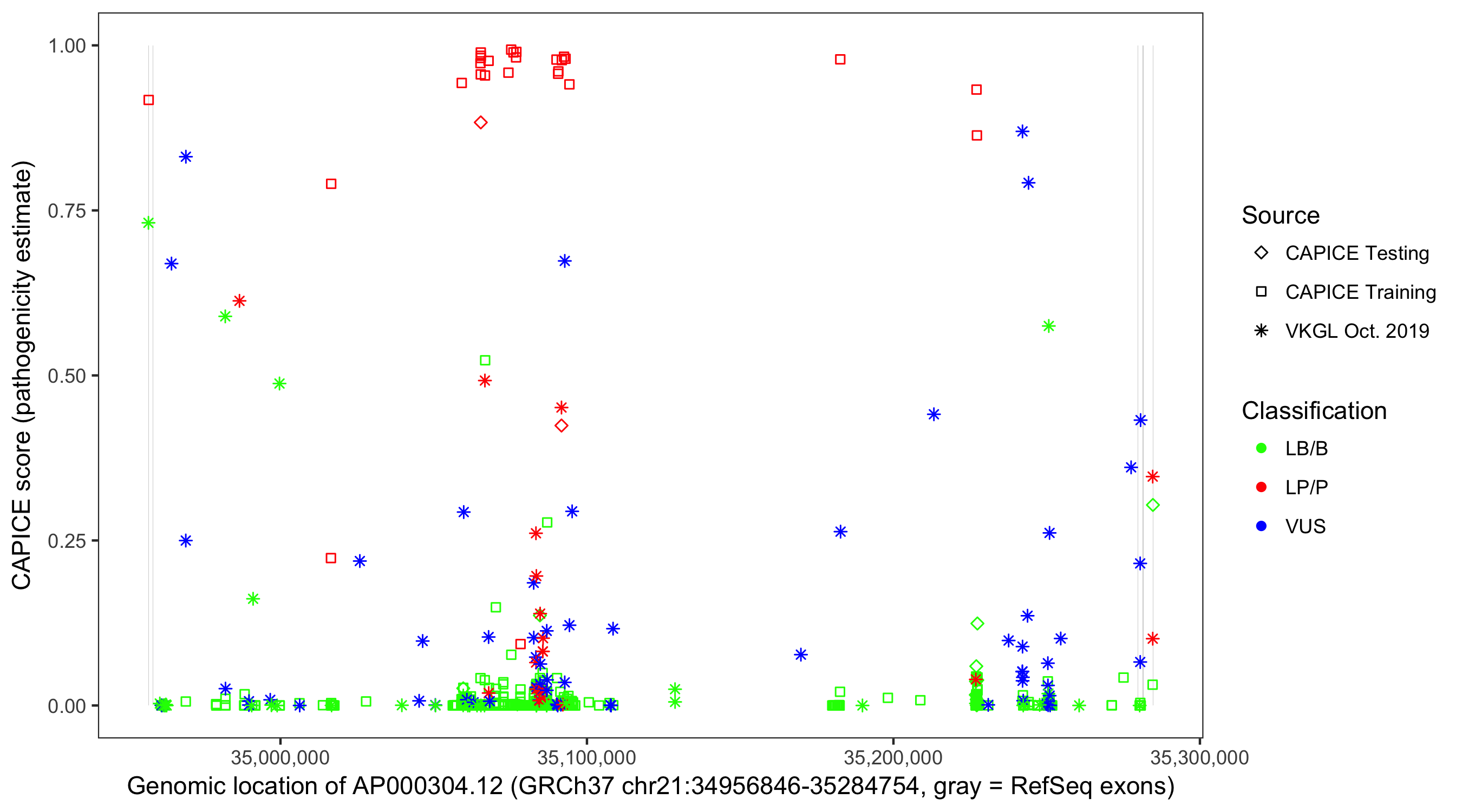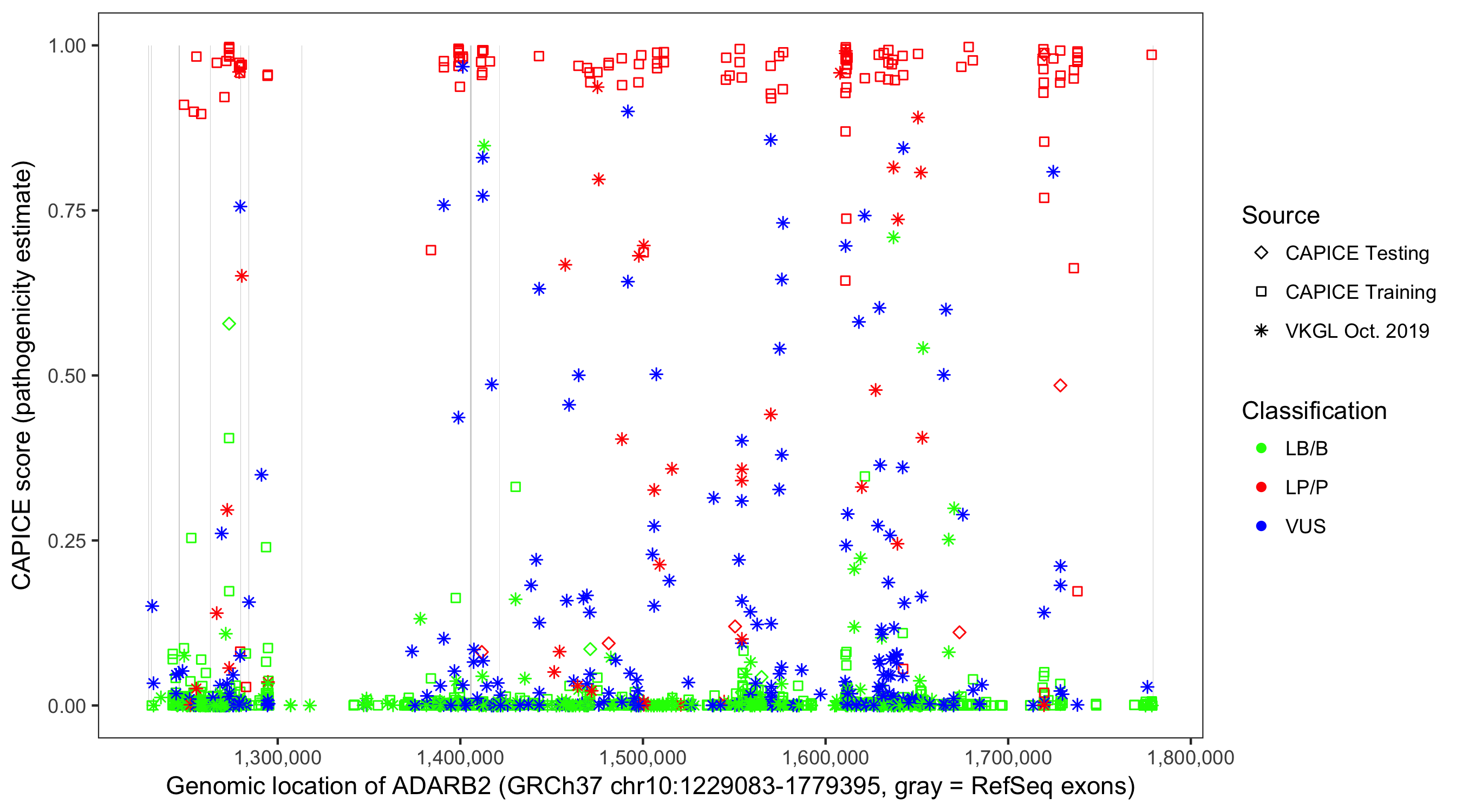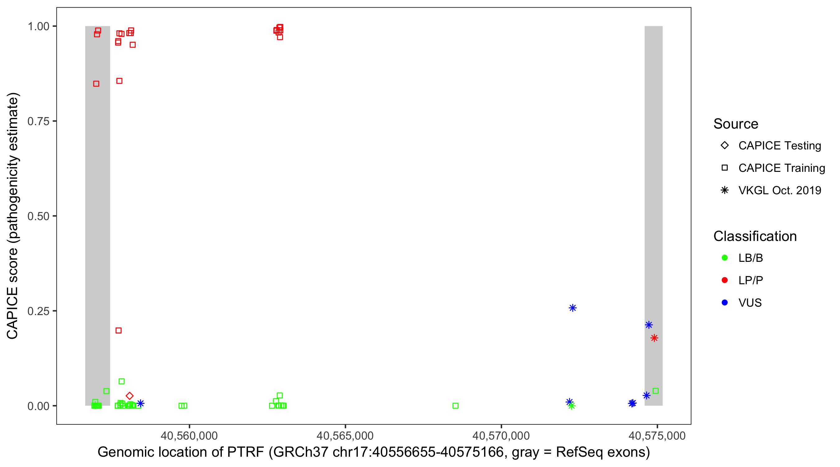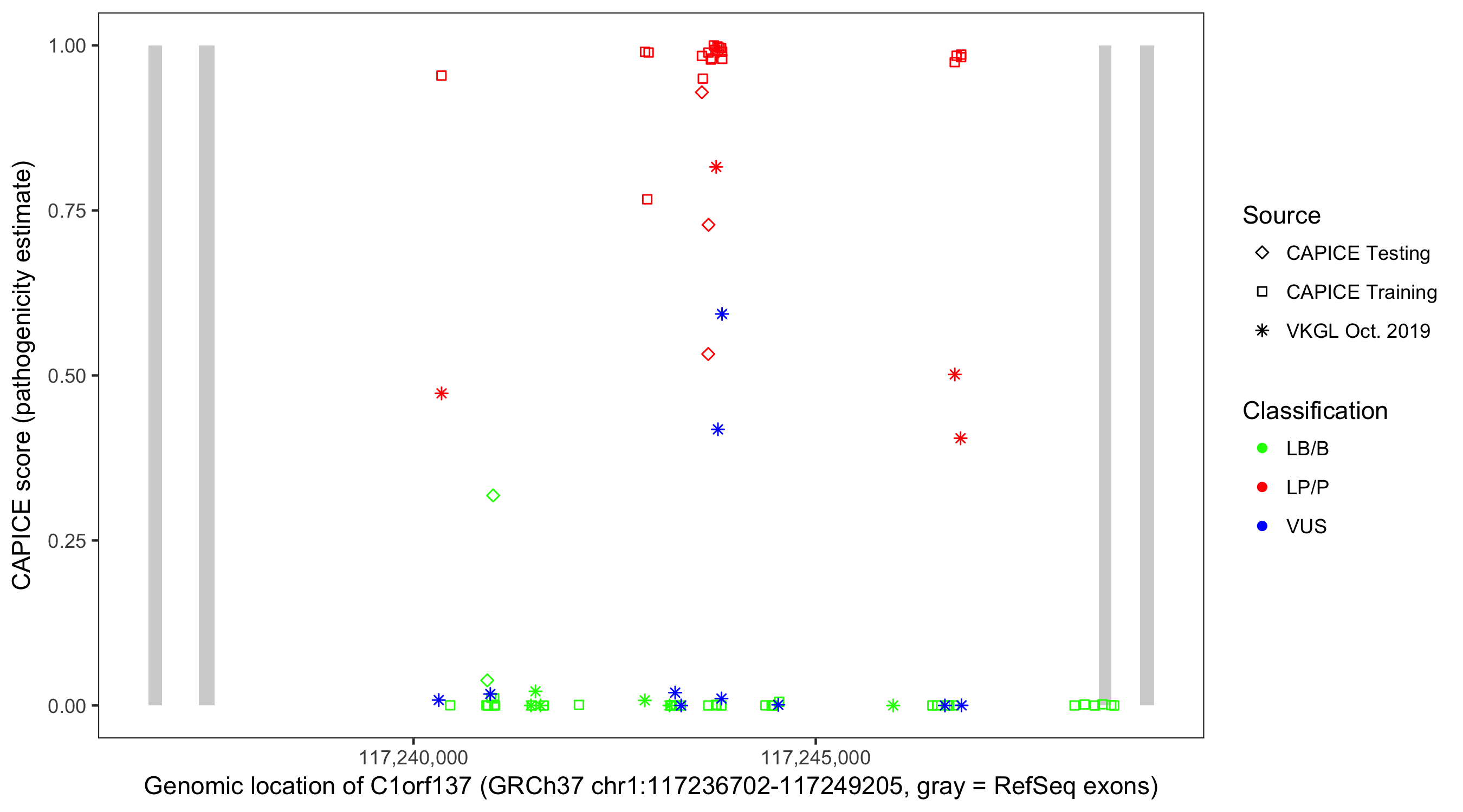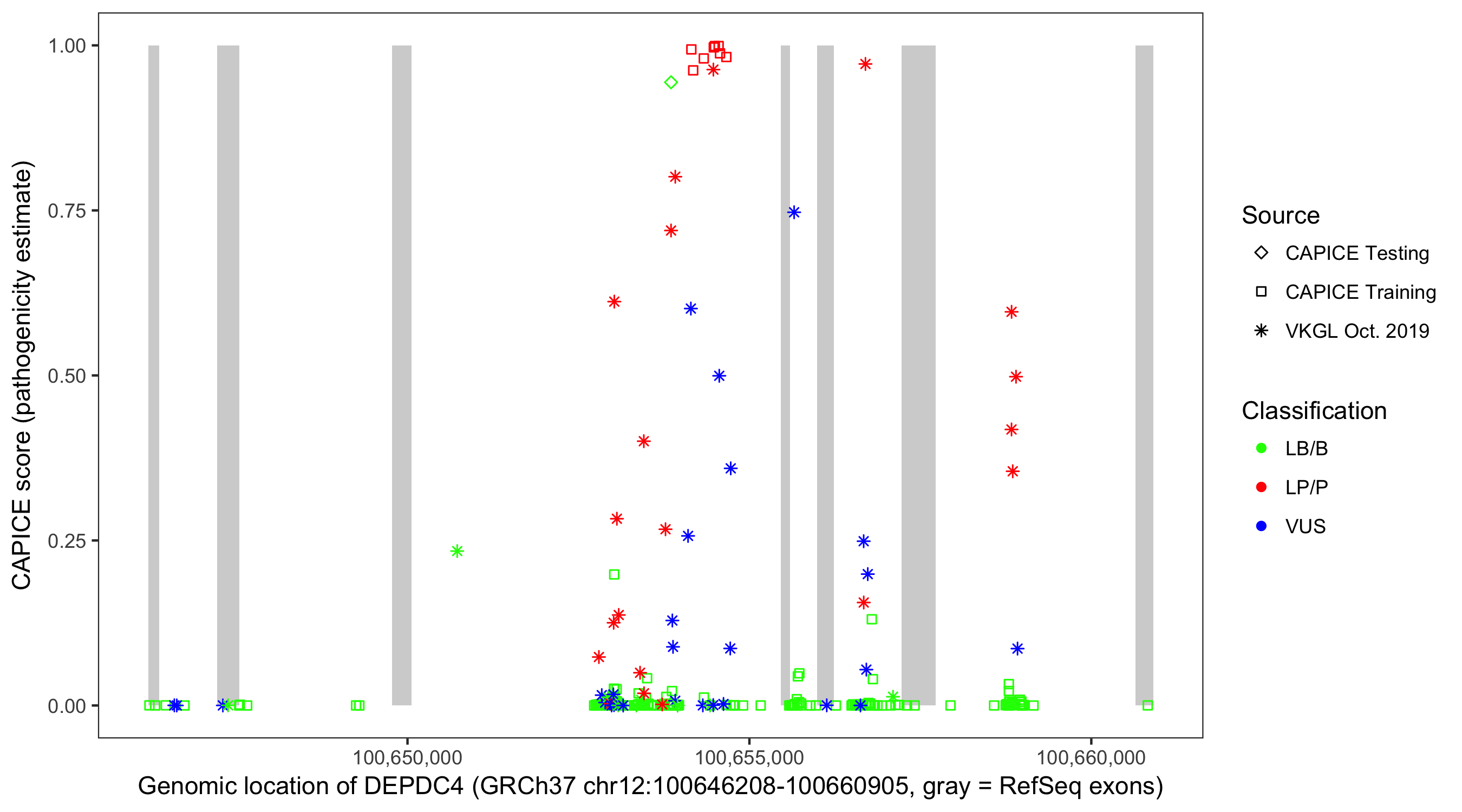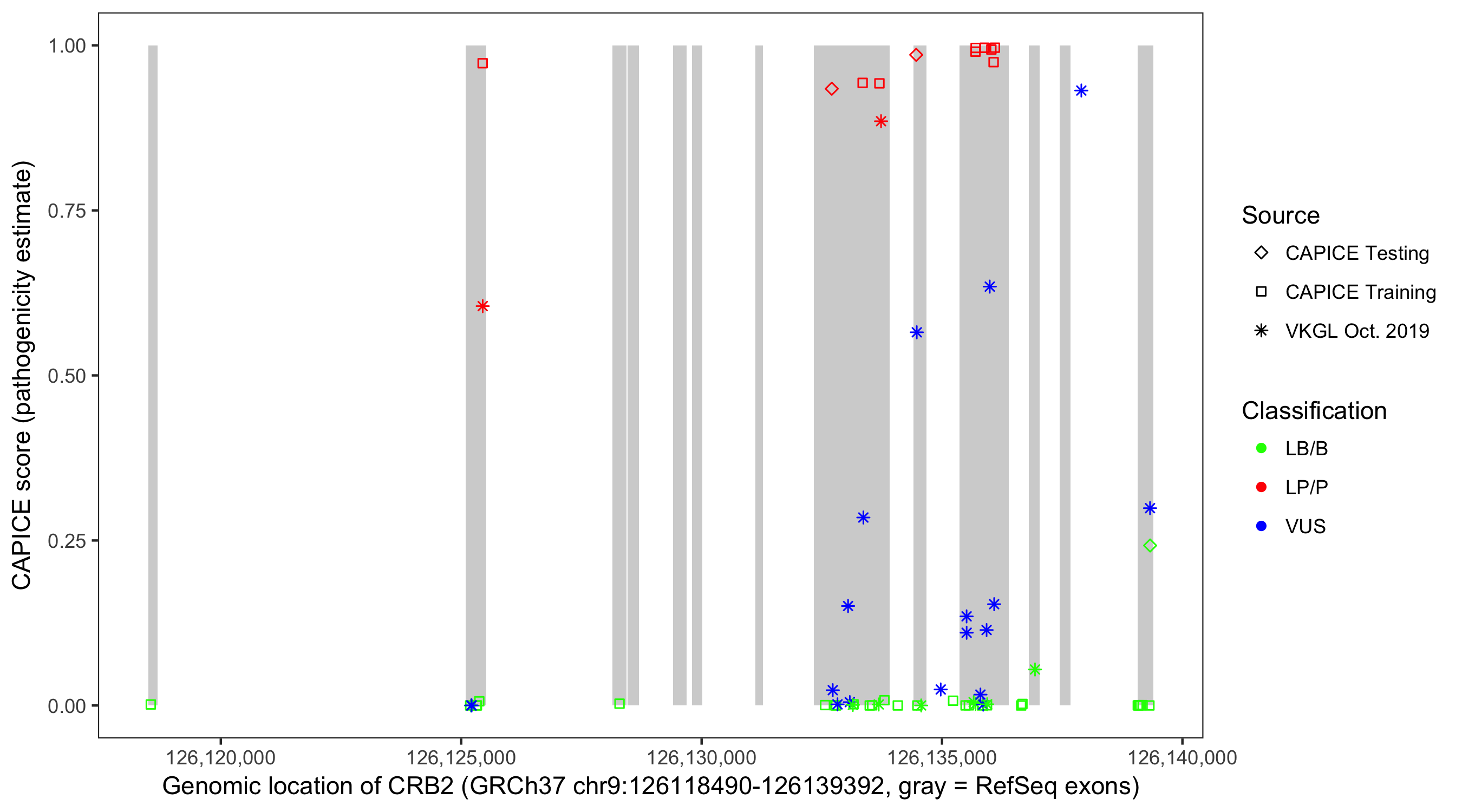 Shown are CAPICE train/test variants plus VKGL Oct 2019.