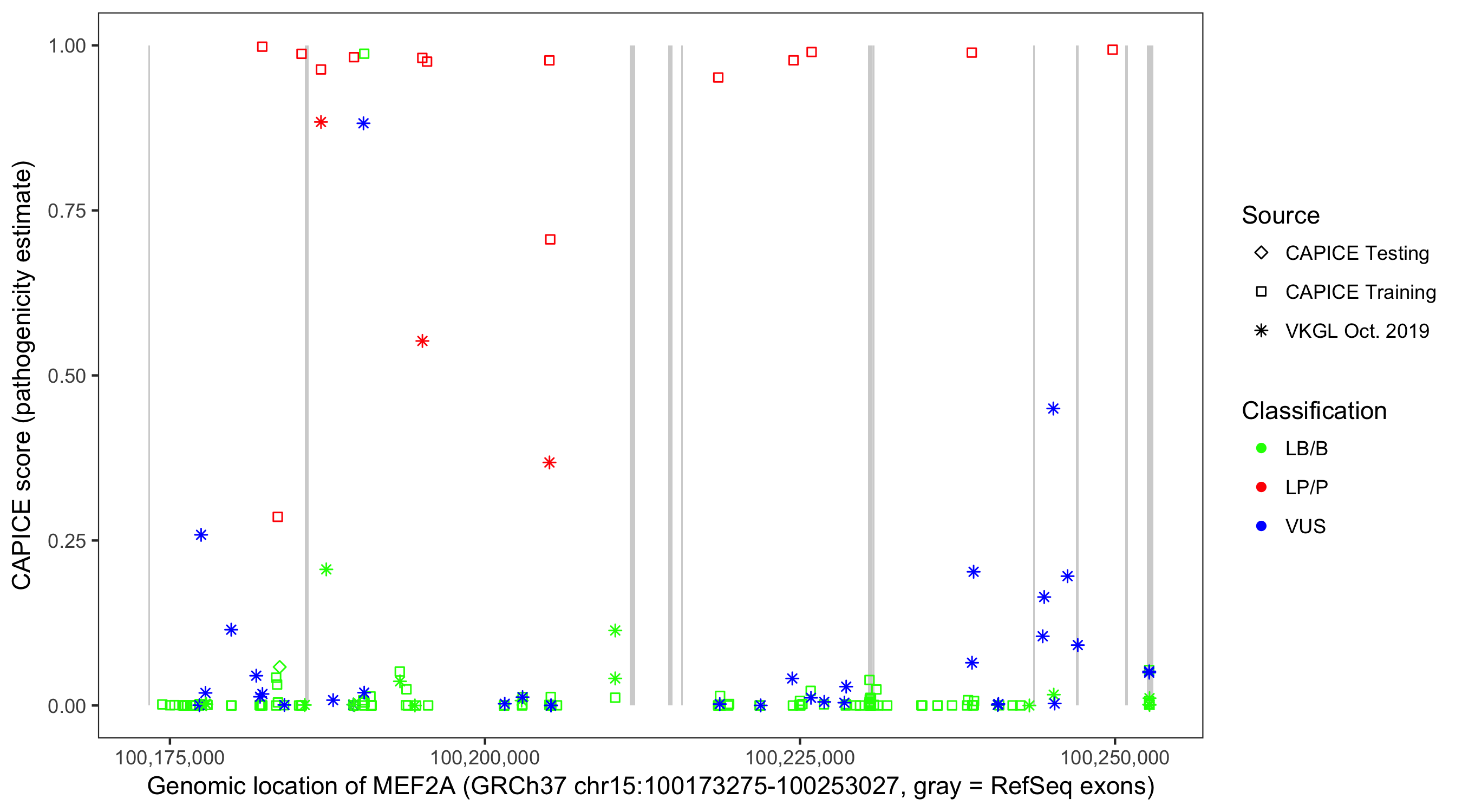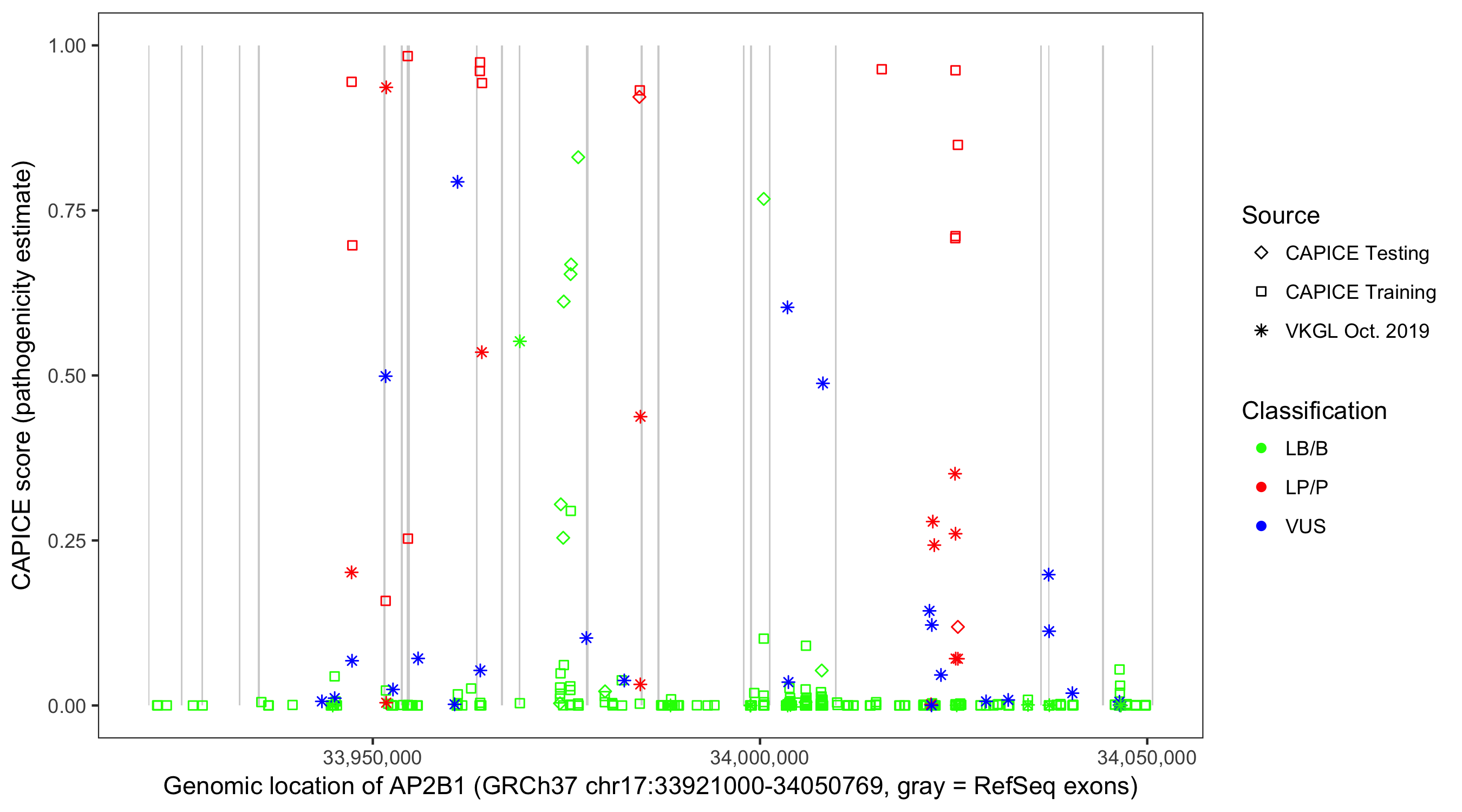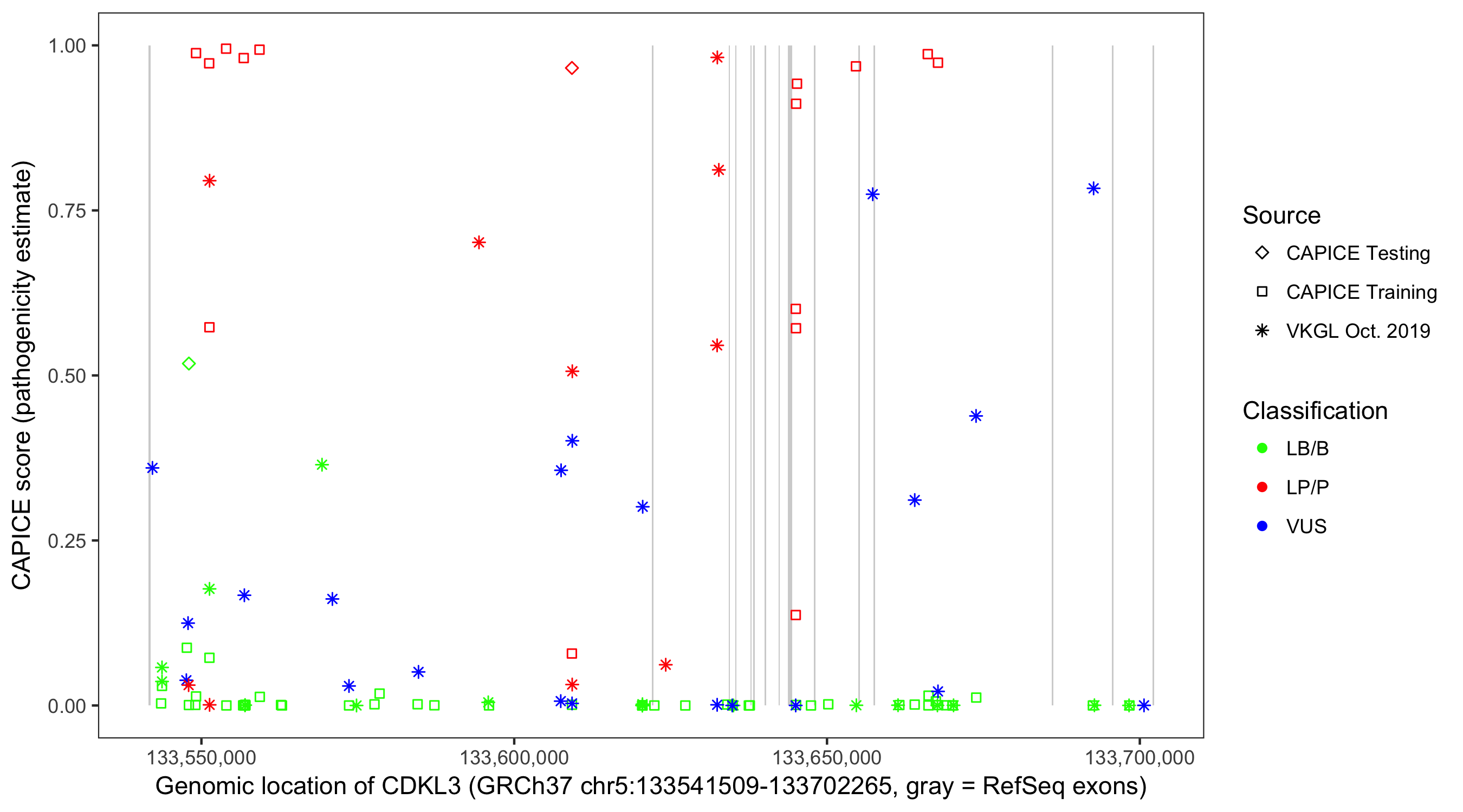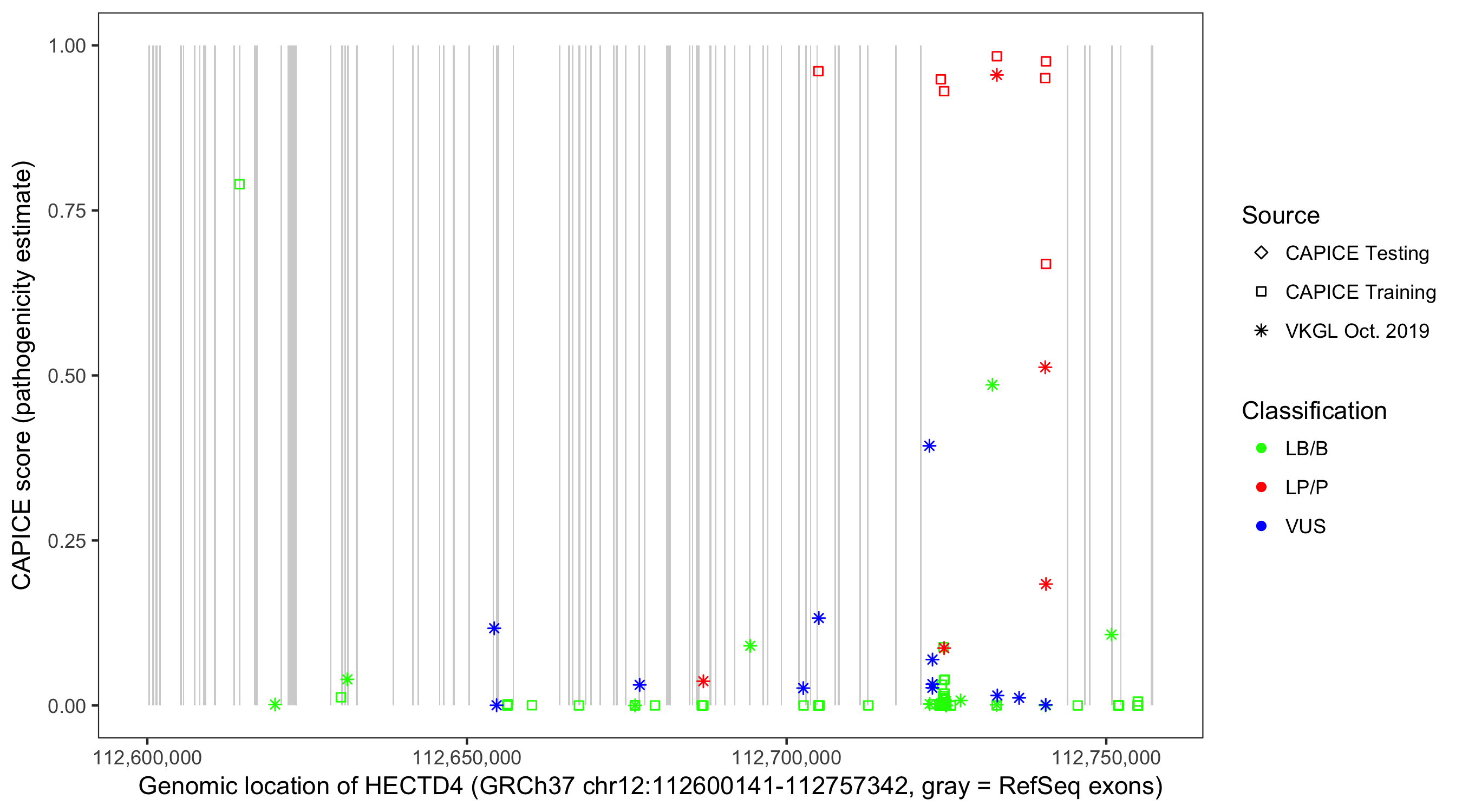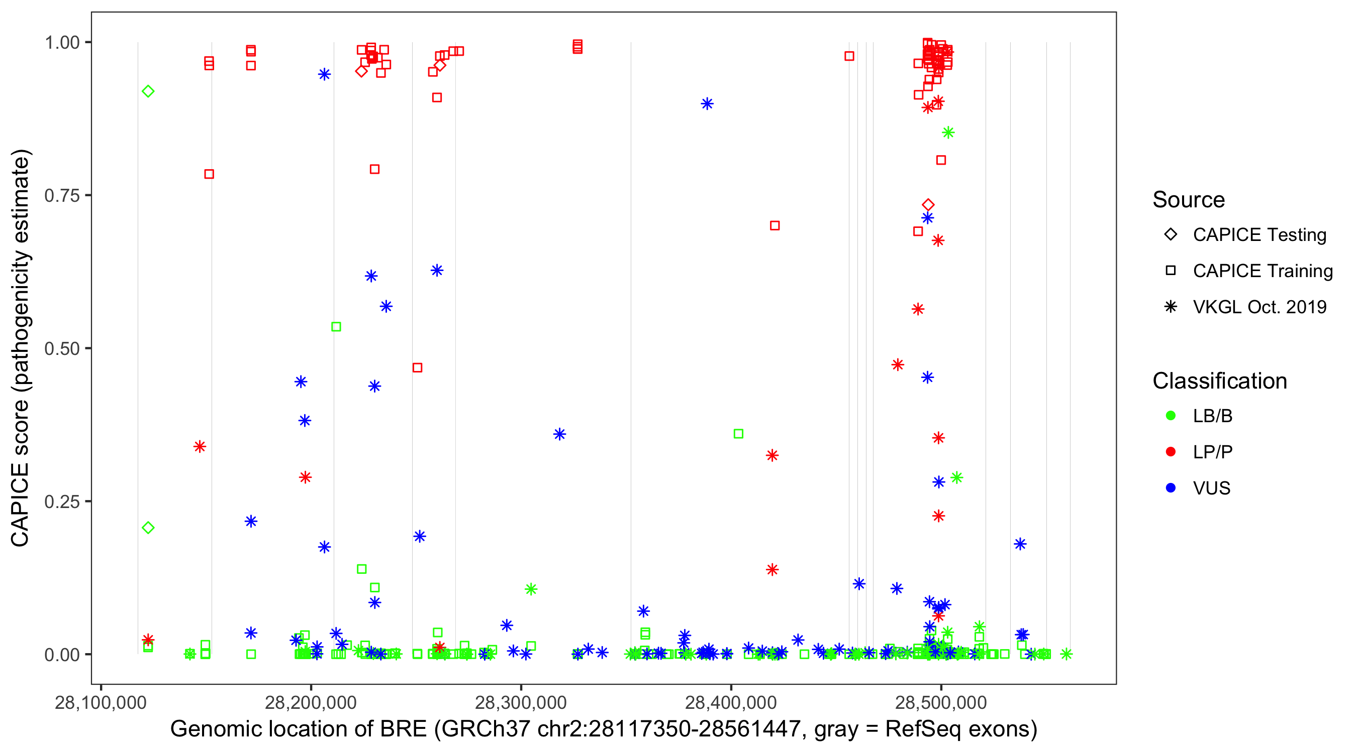 Shown are CAPICE train/test variants plus VKGL Oct 2019.