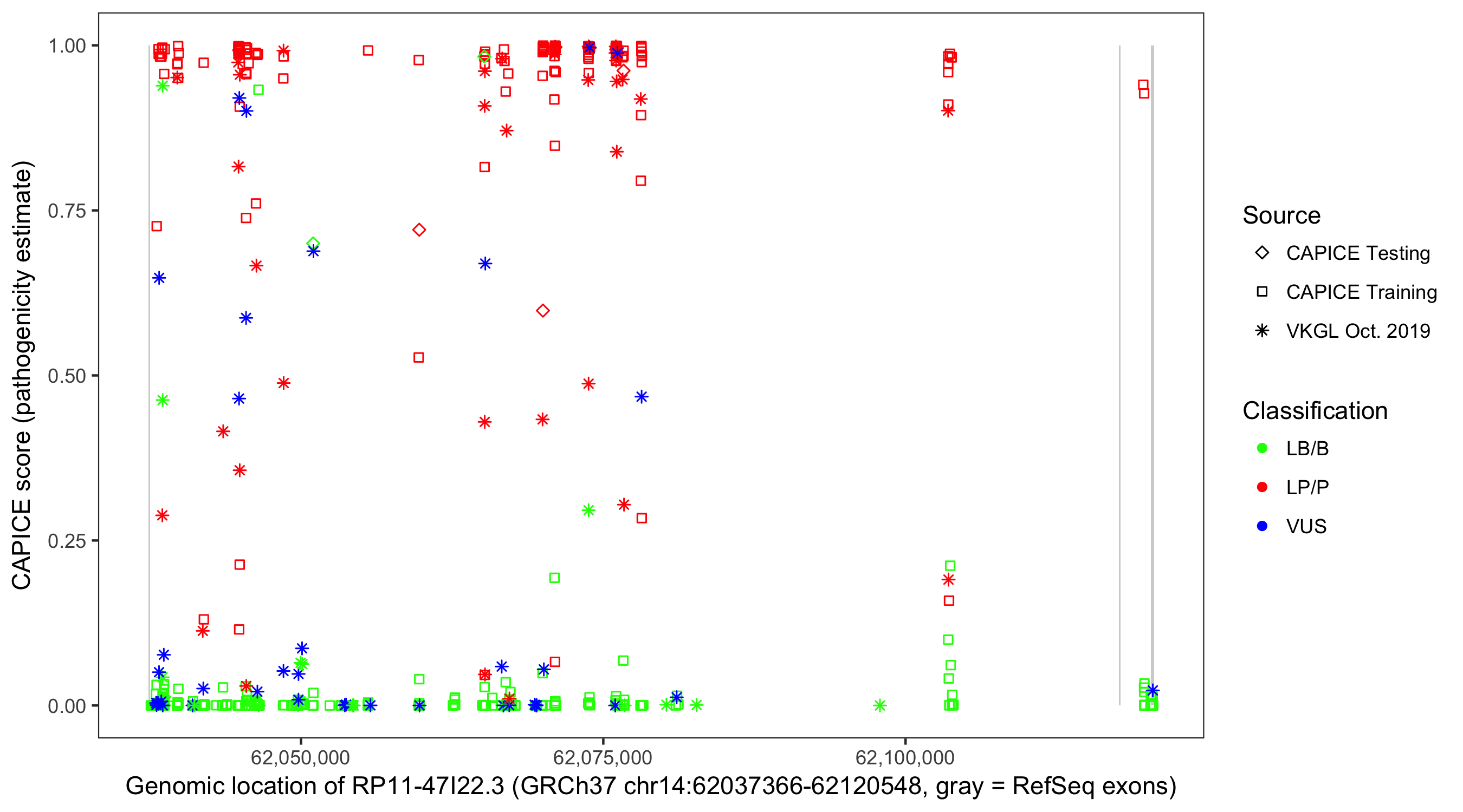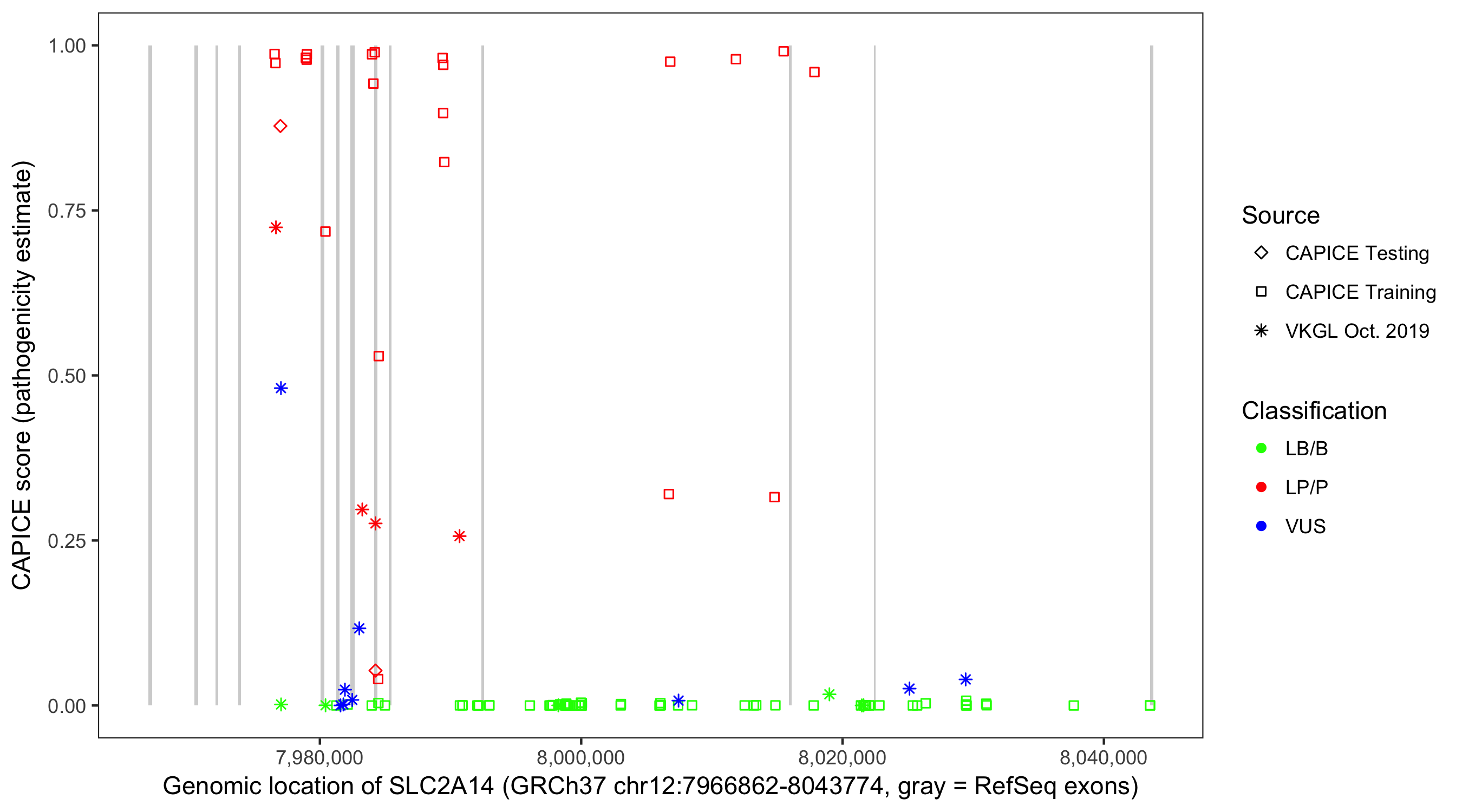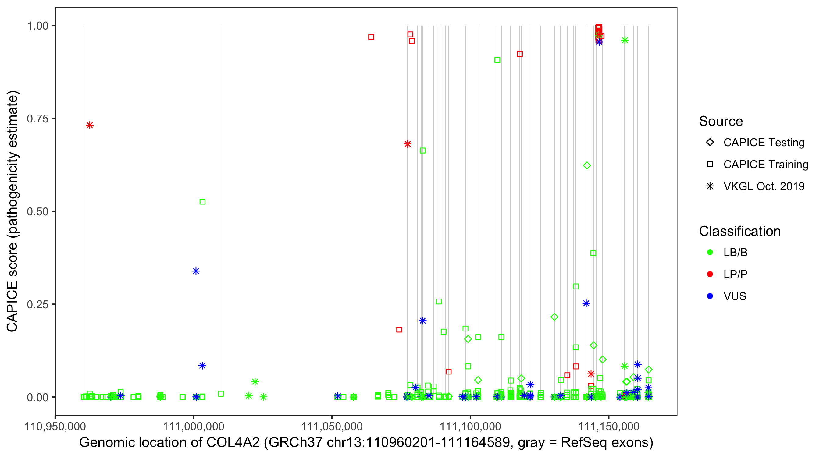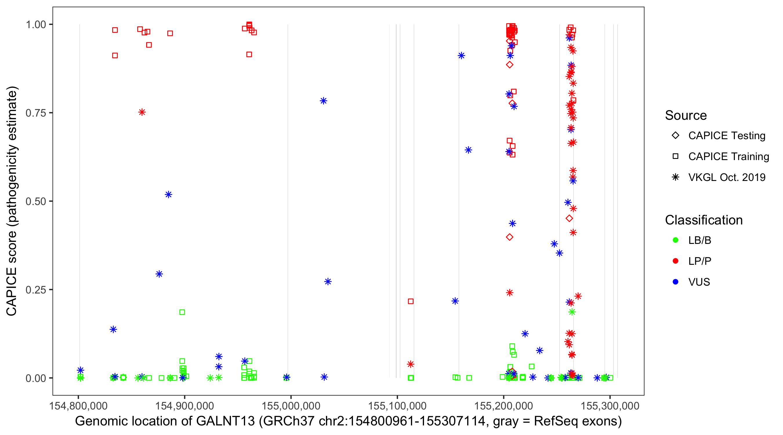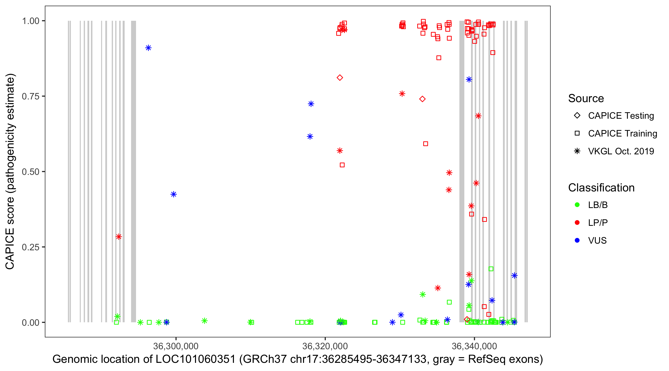 Shown are CAPICE train/test variants plus VKGL Oct 2019.