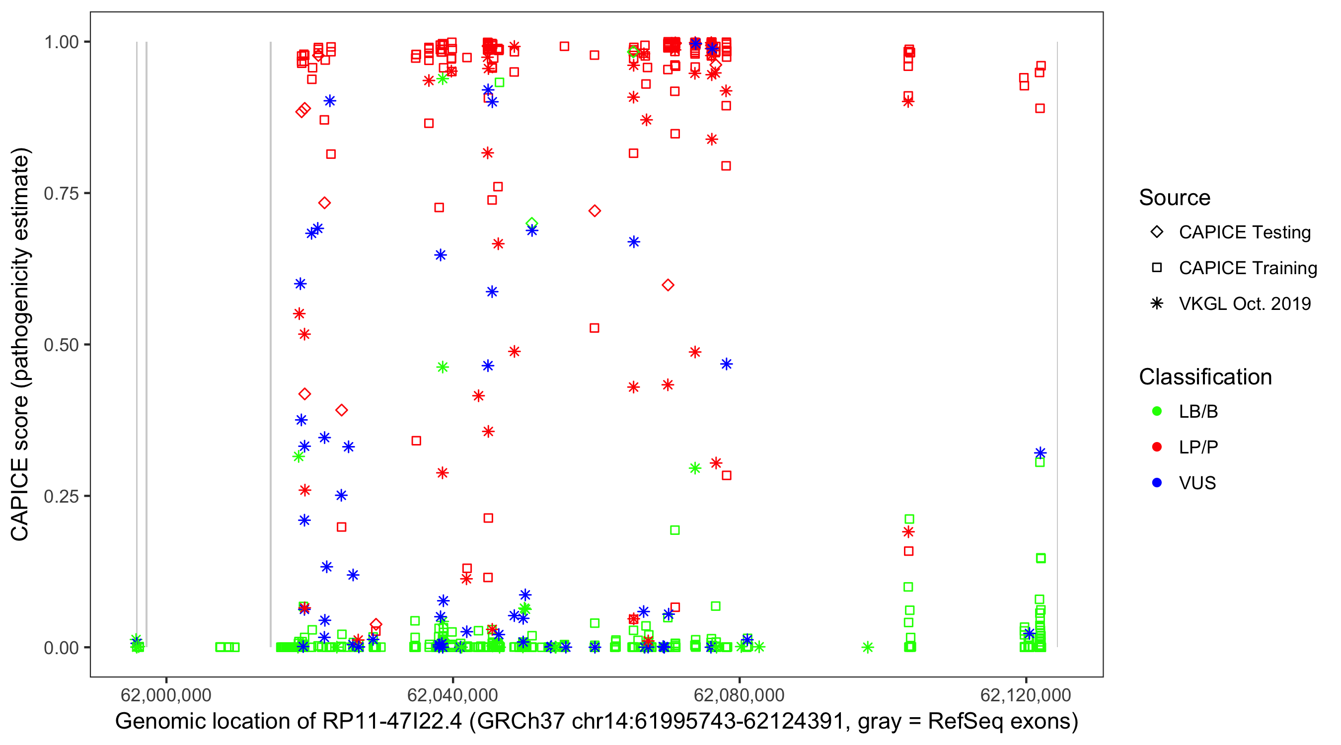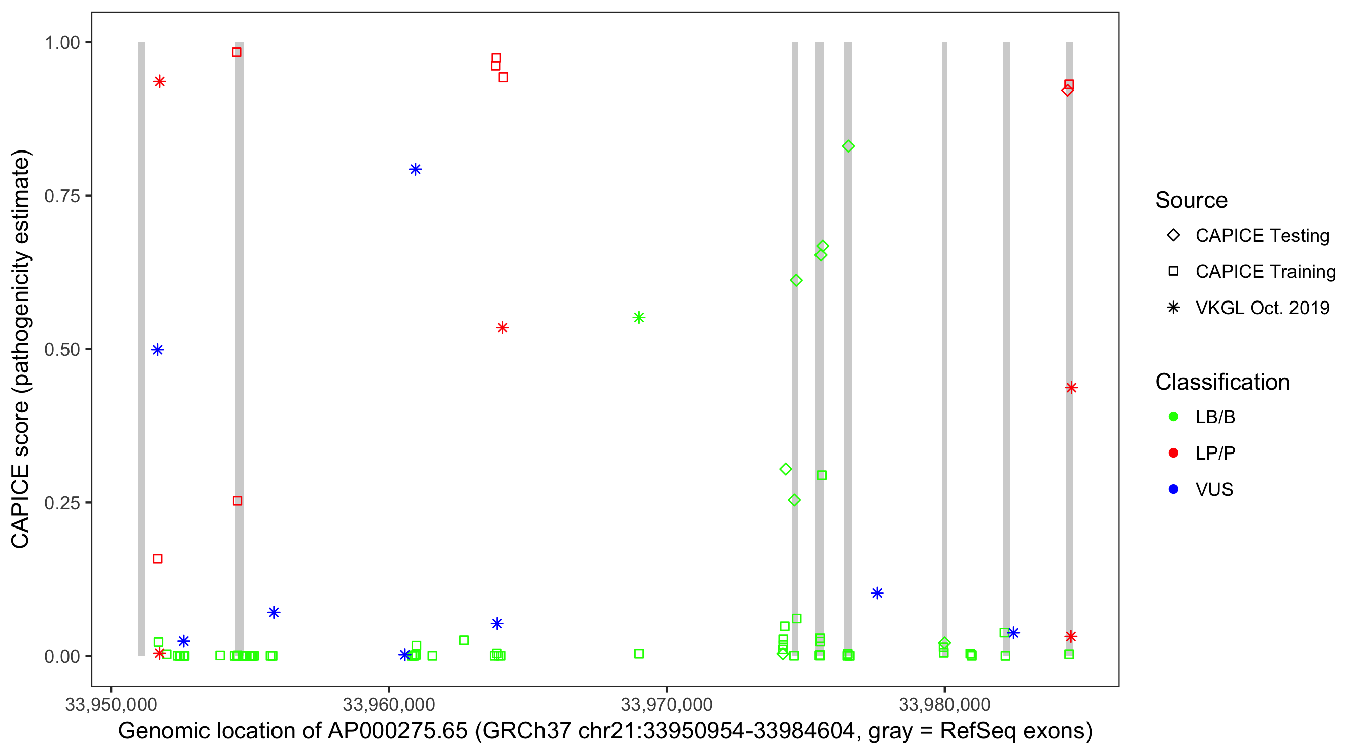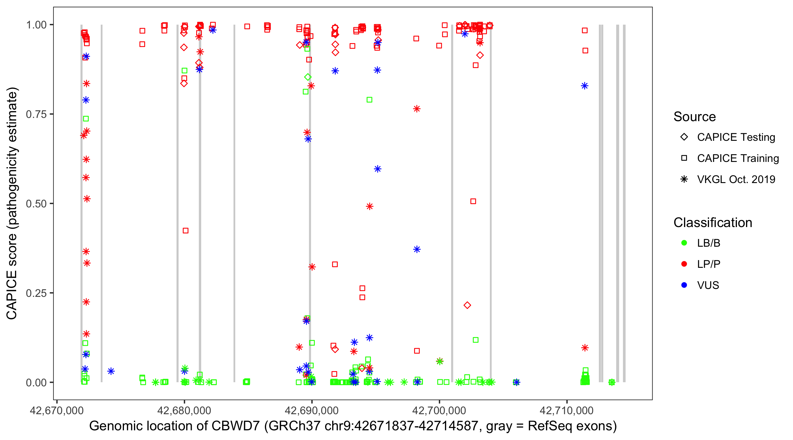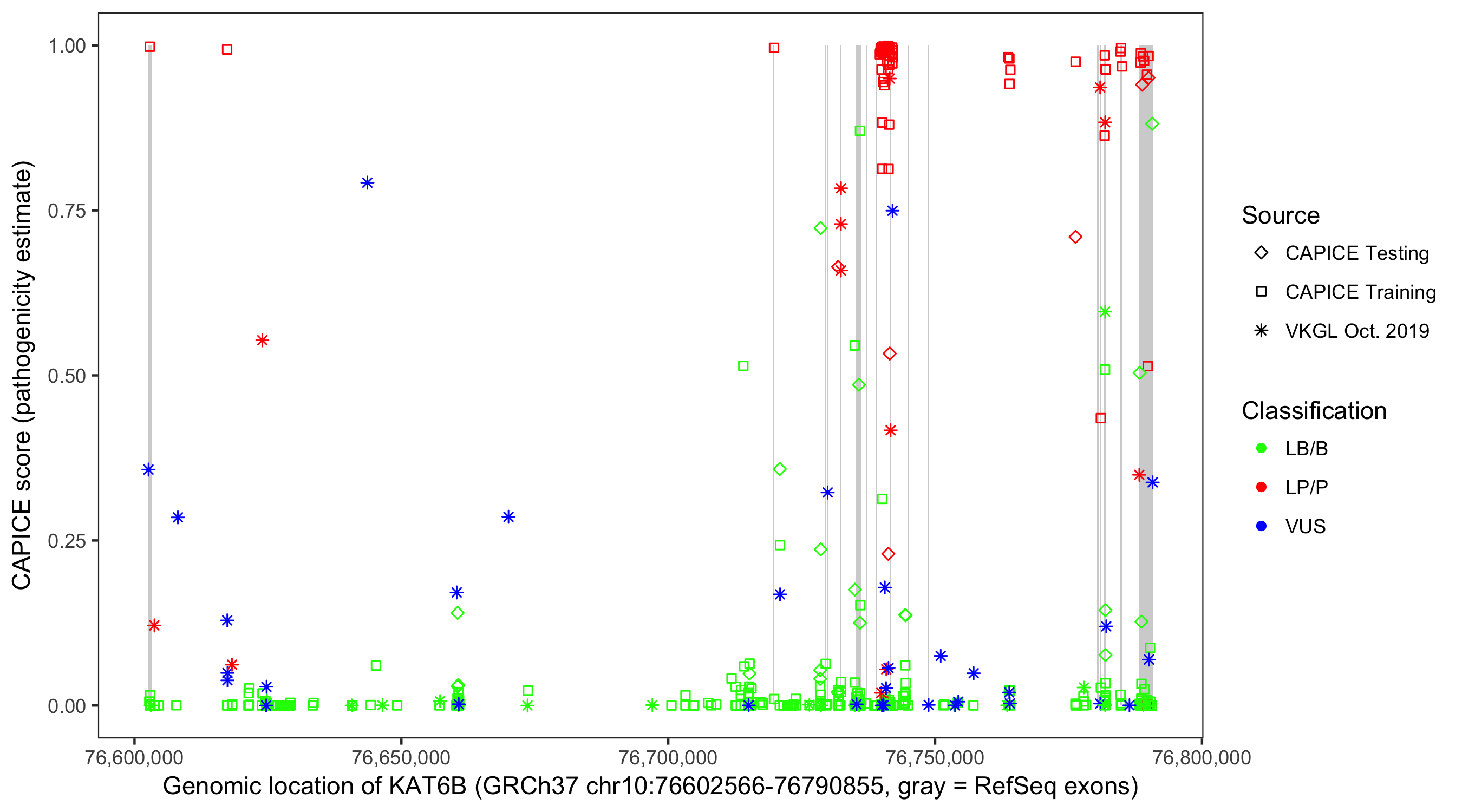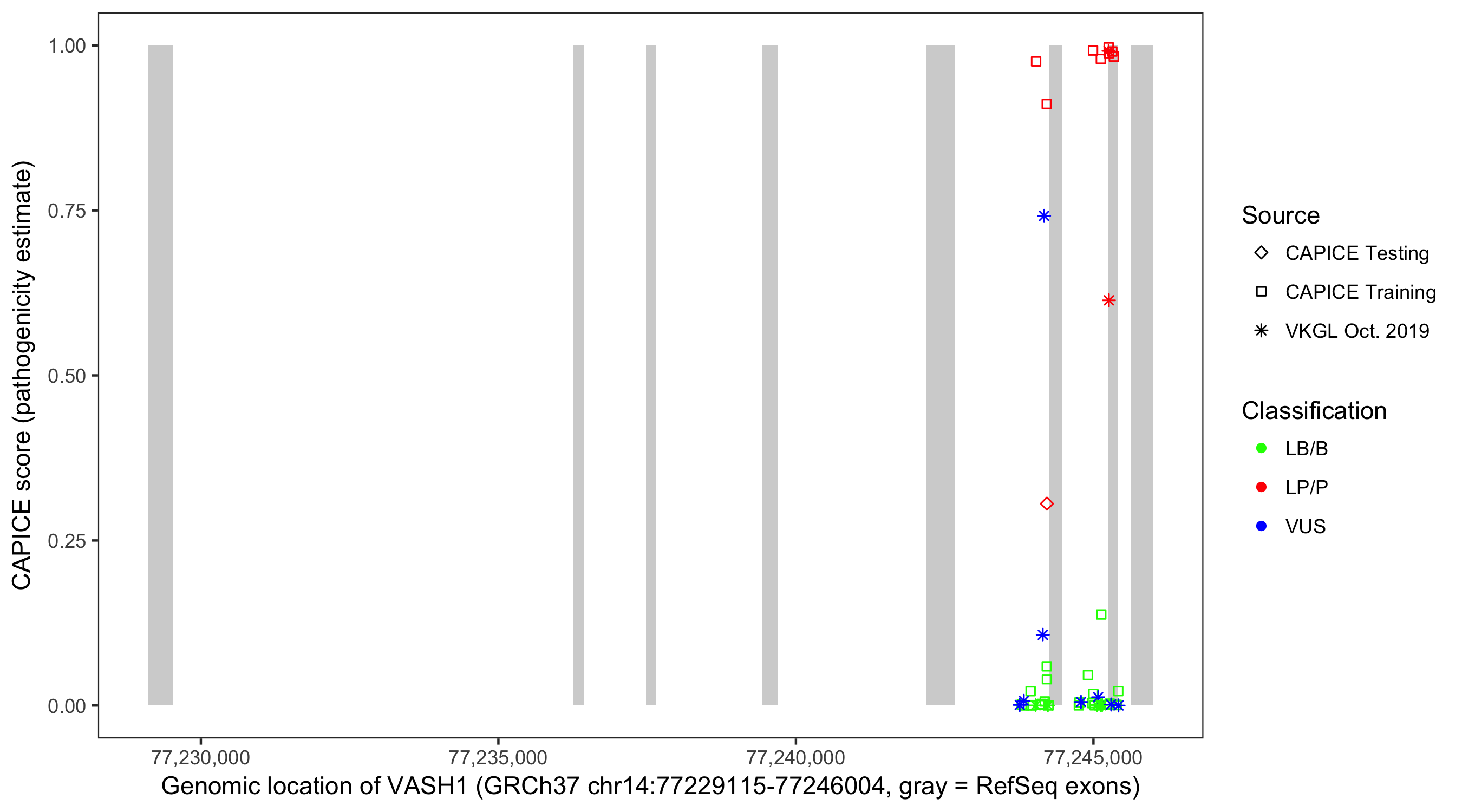 Shown are CAPICE train/test variants plus VKGL Oct 2019.