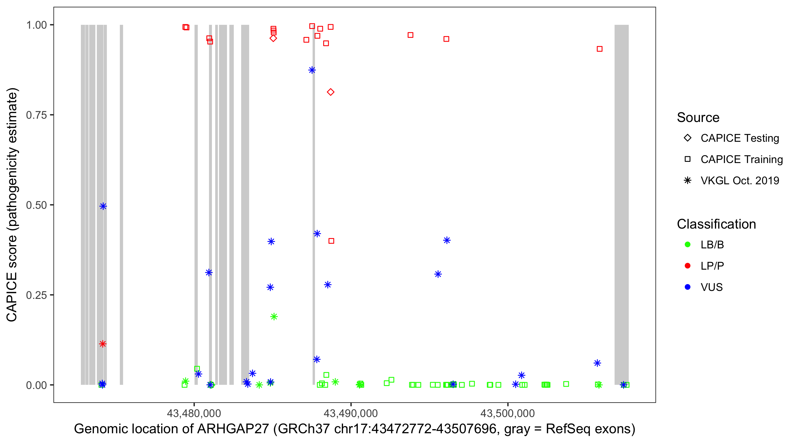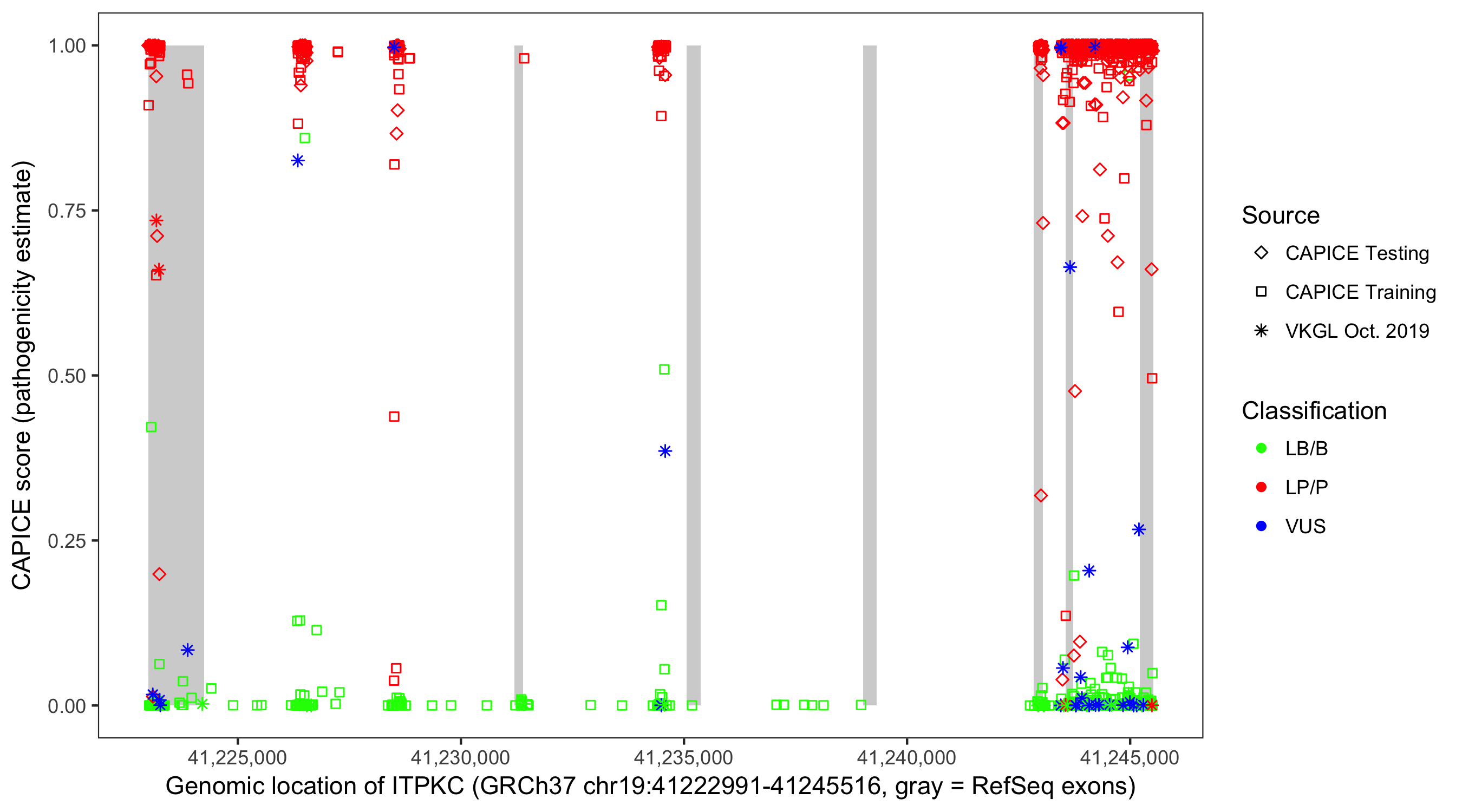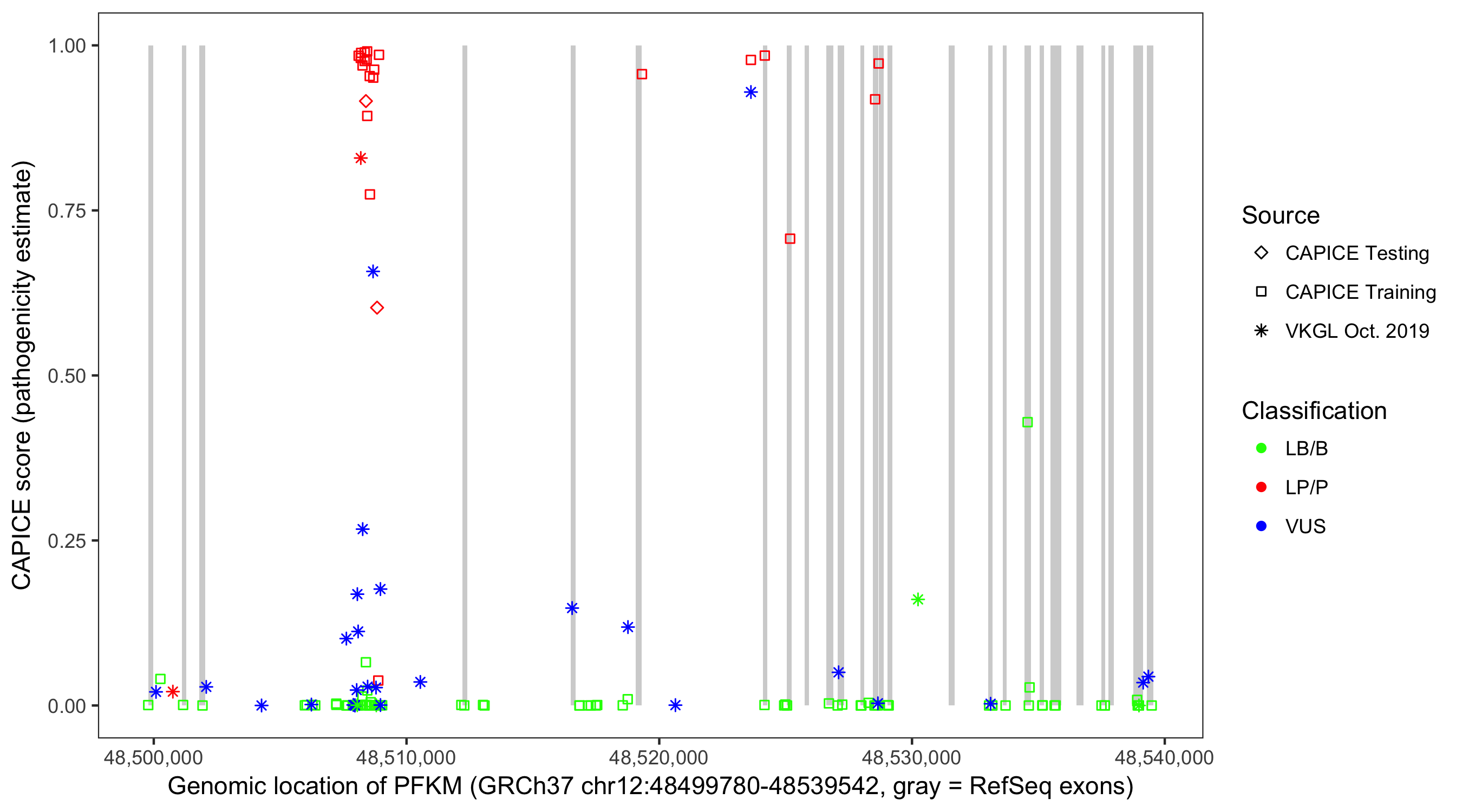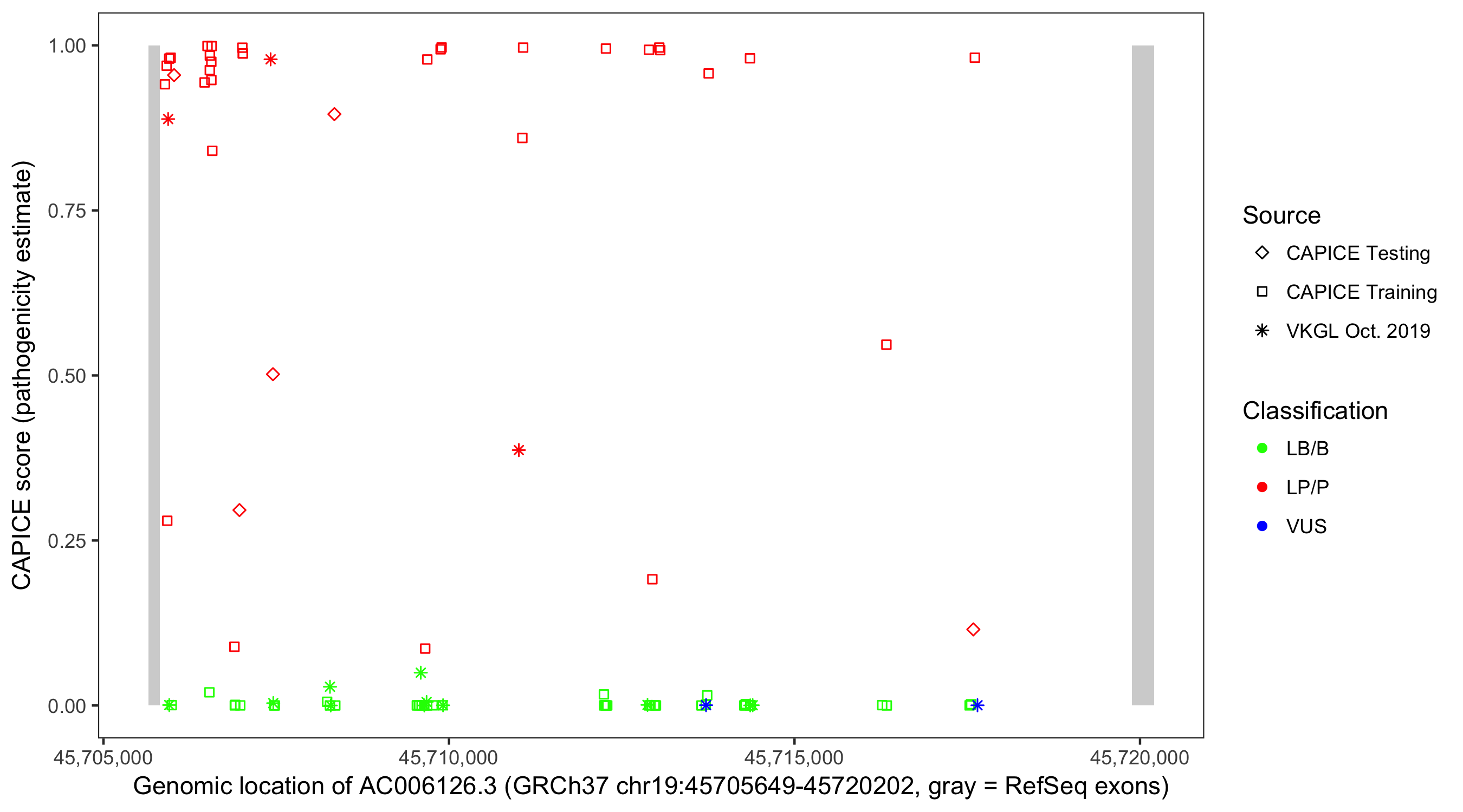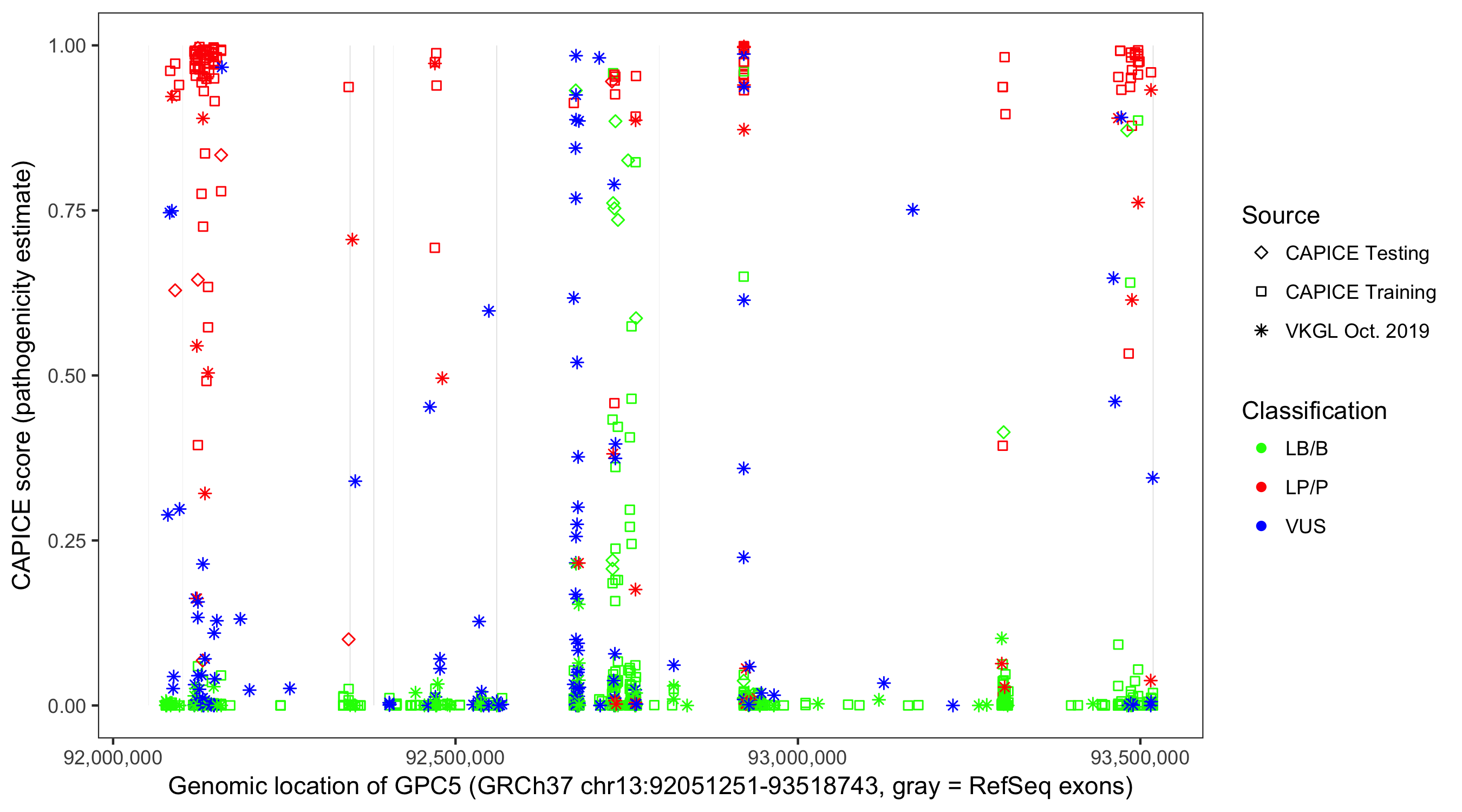 Shown are CAPICE train/test variants plus VKGL Oct 2019.
