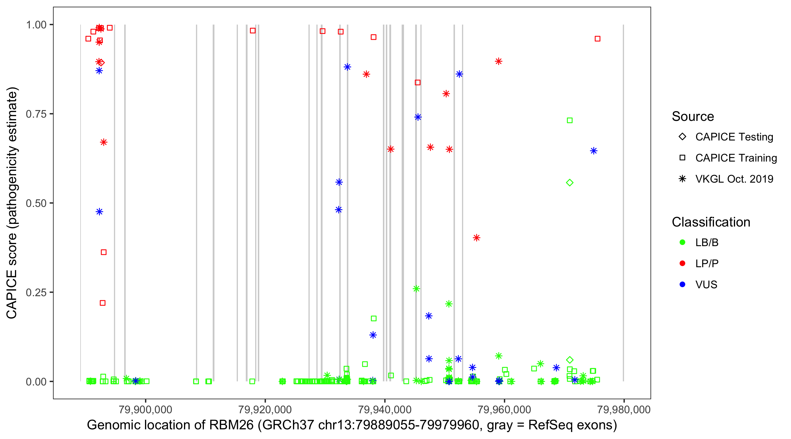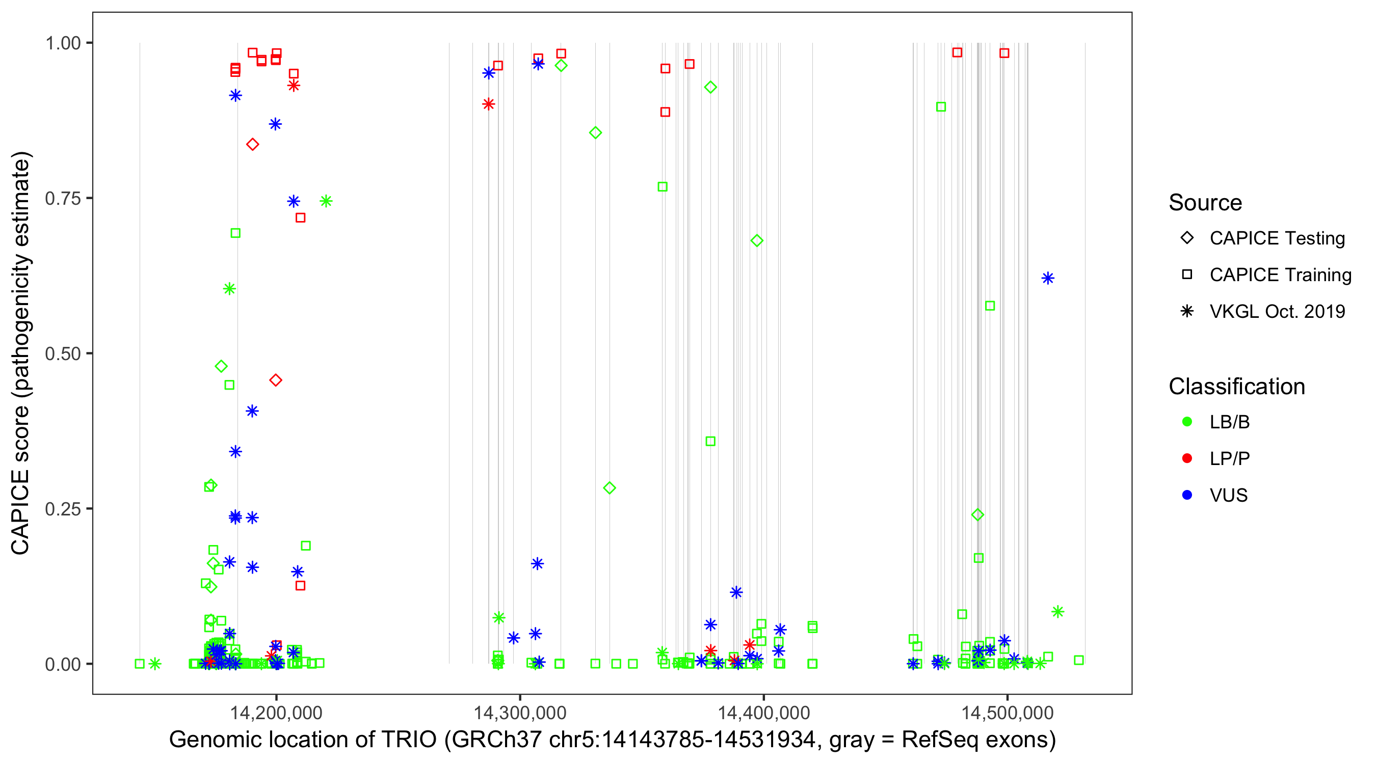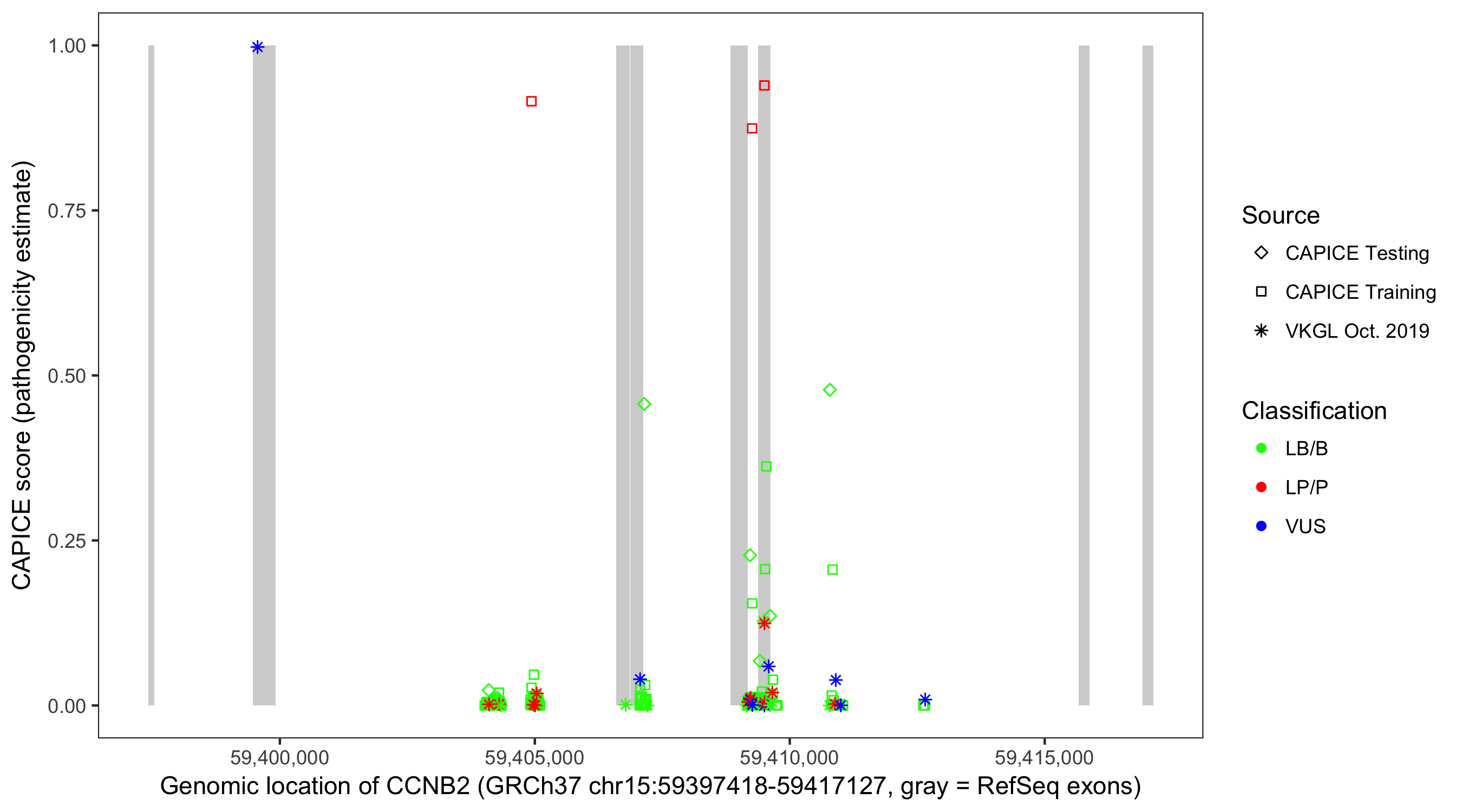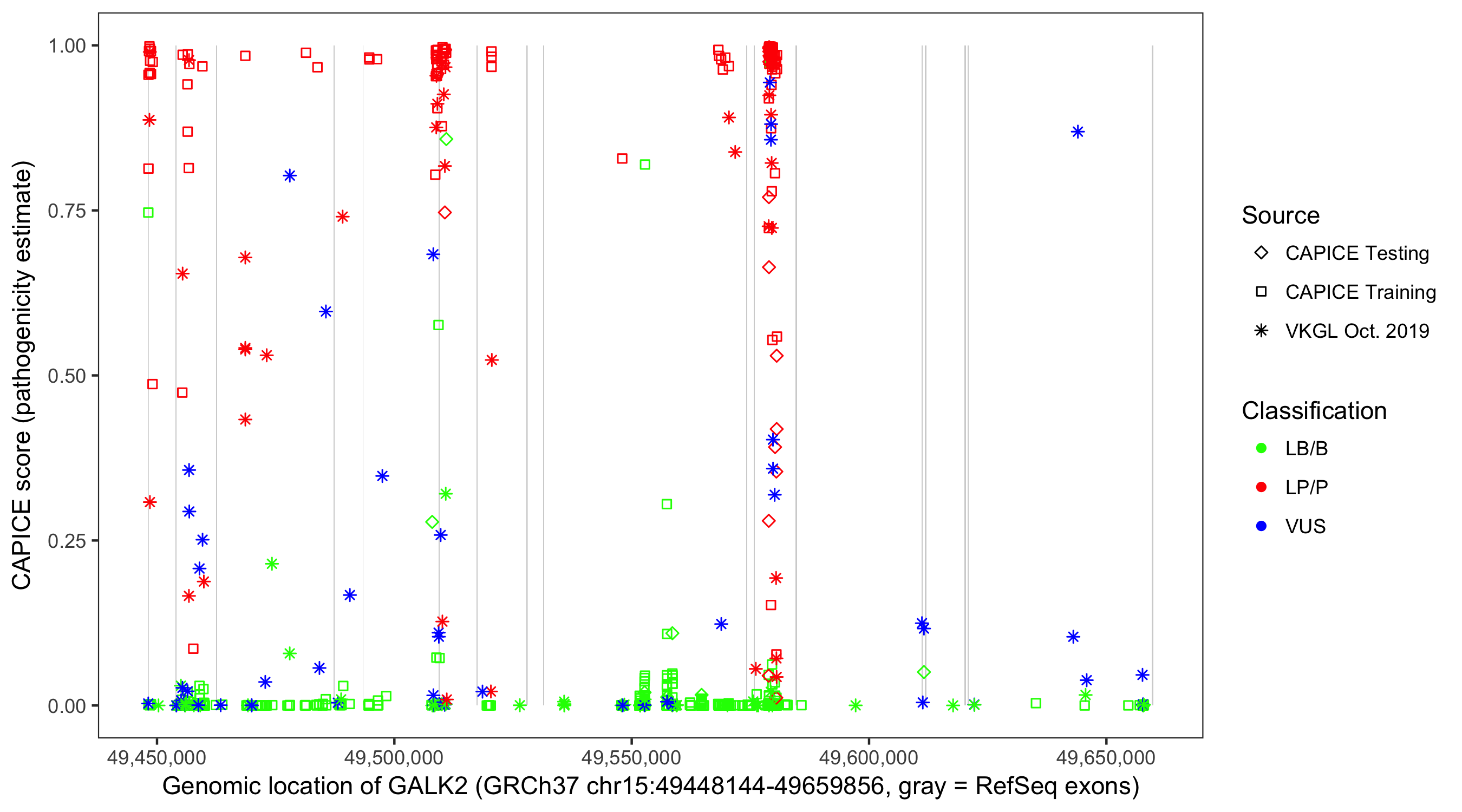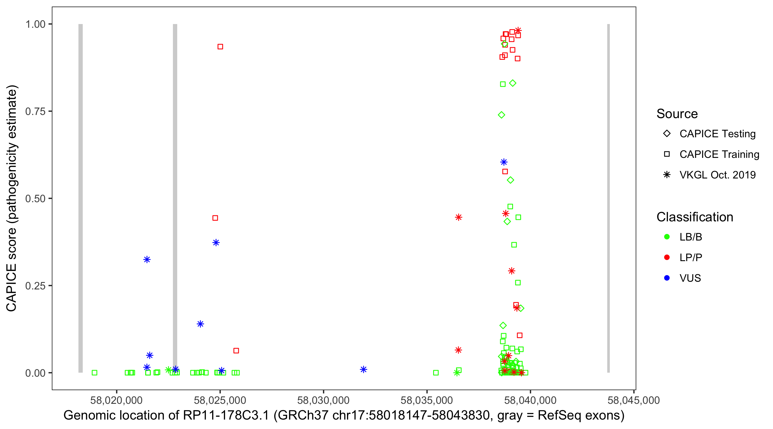 Shown are CAPICE train/test variants plus VKGL Oct 2019.