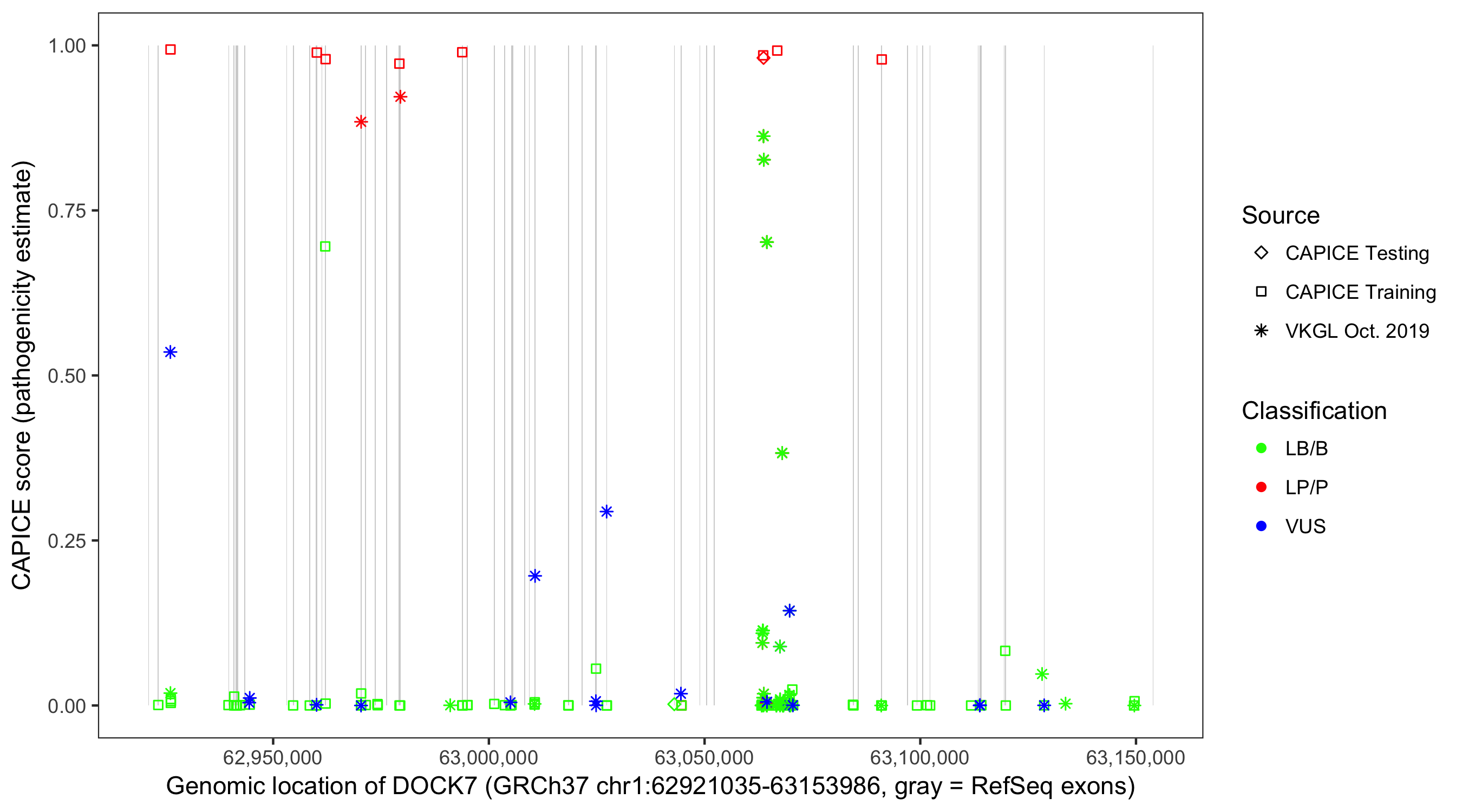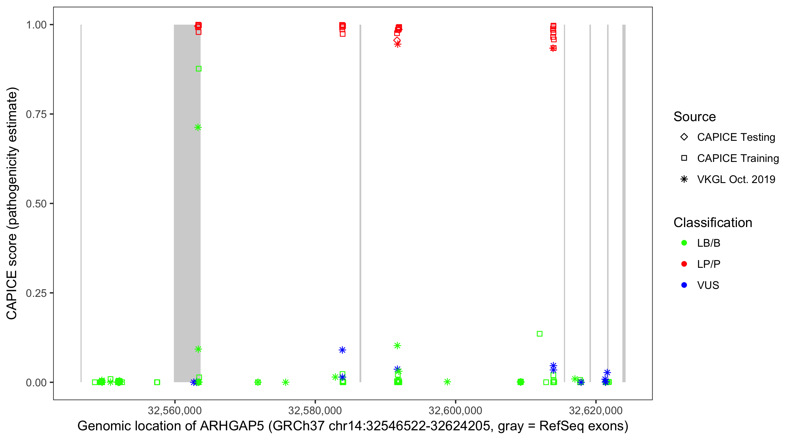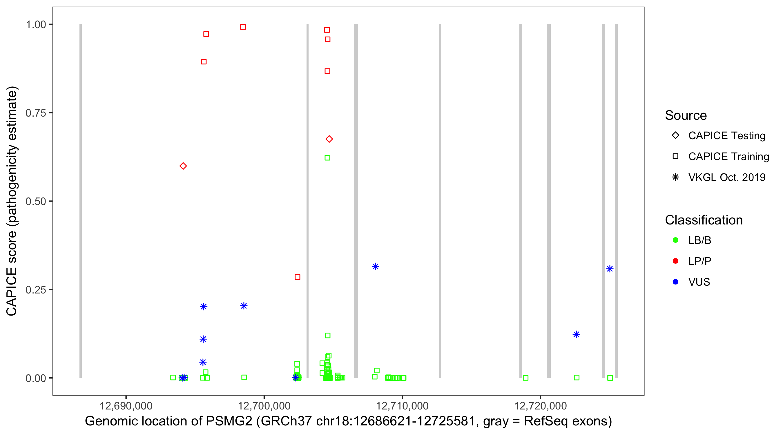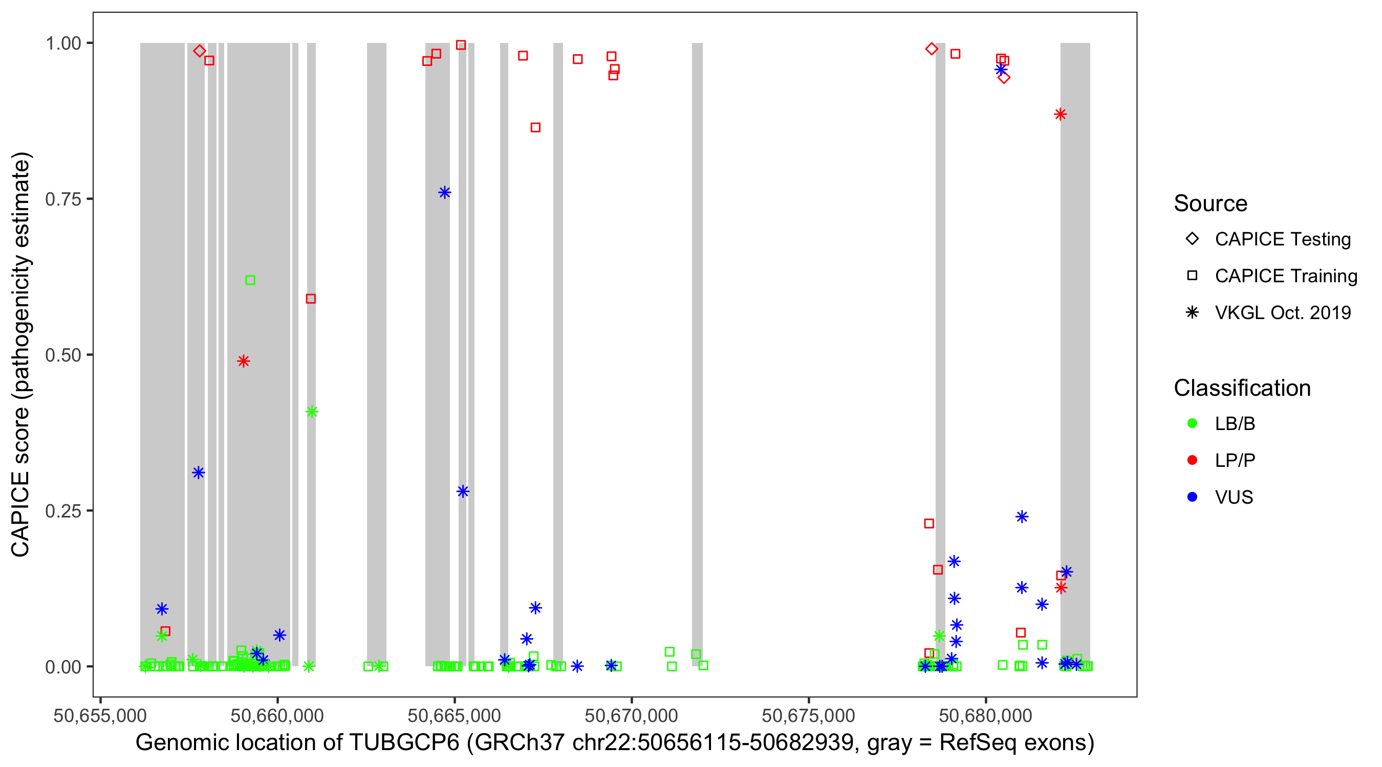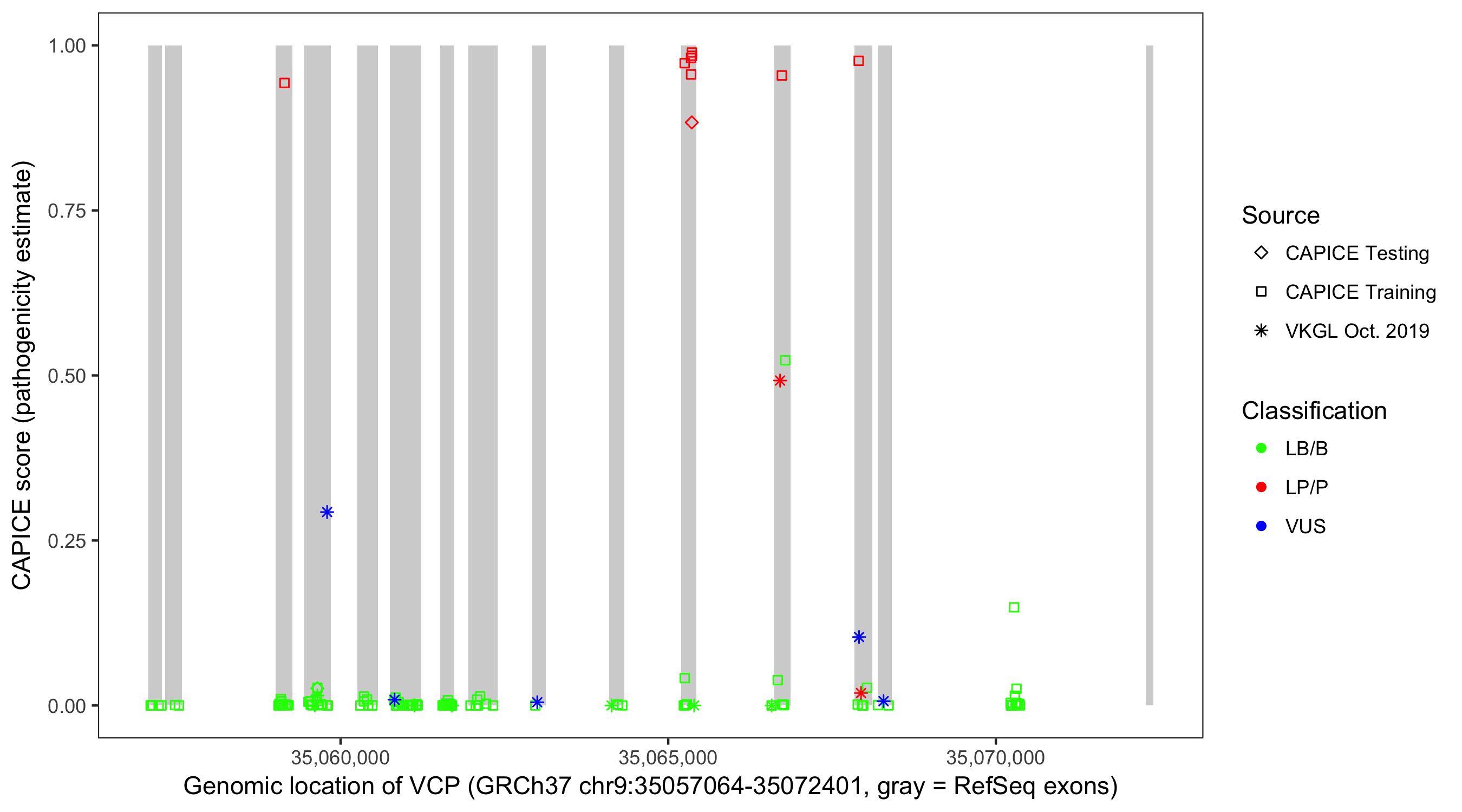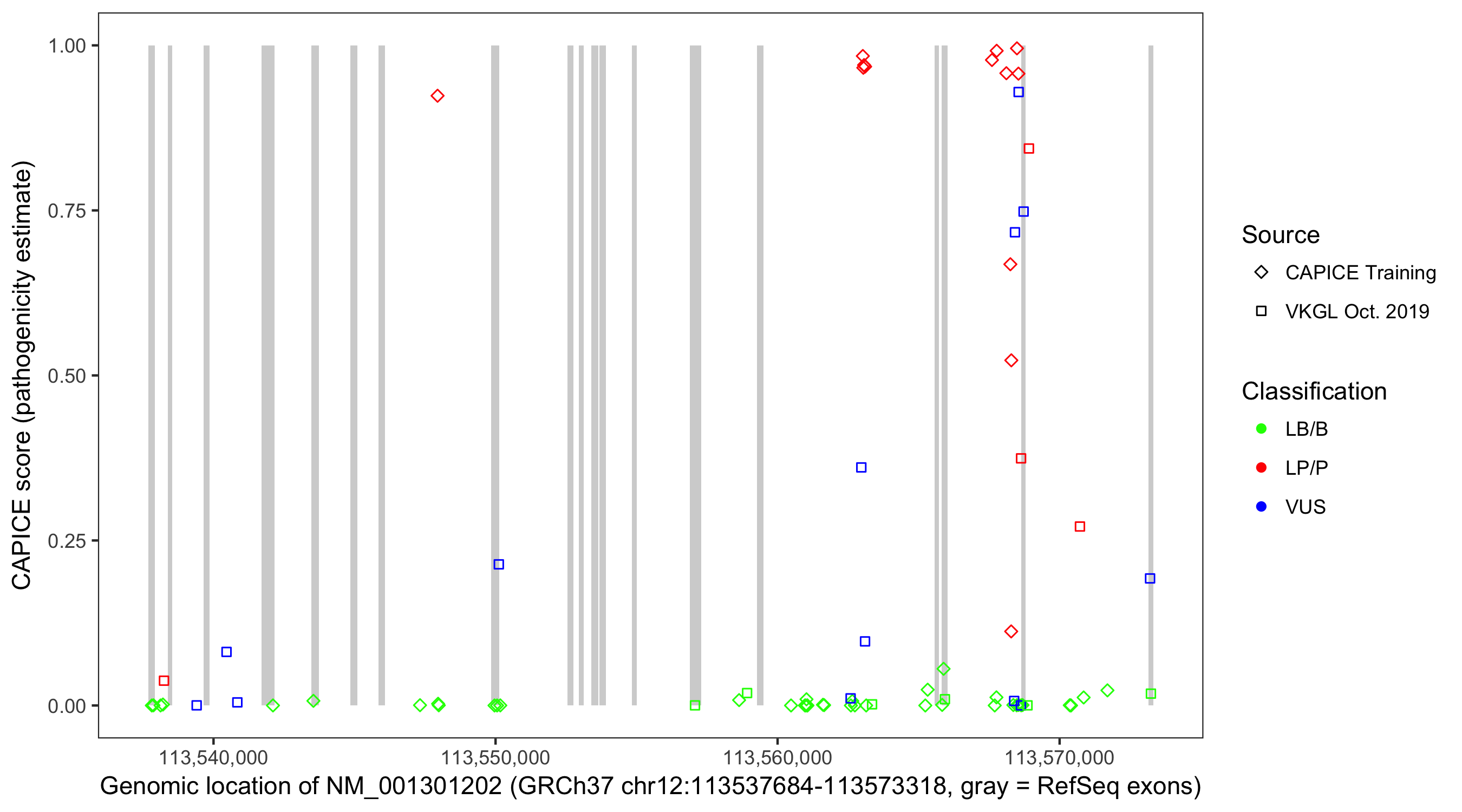 Shown are CAPICE train/test variants plus VKGL Oct 2019.