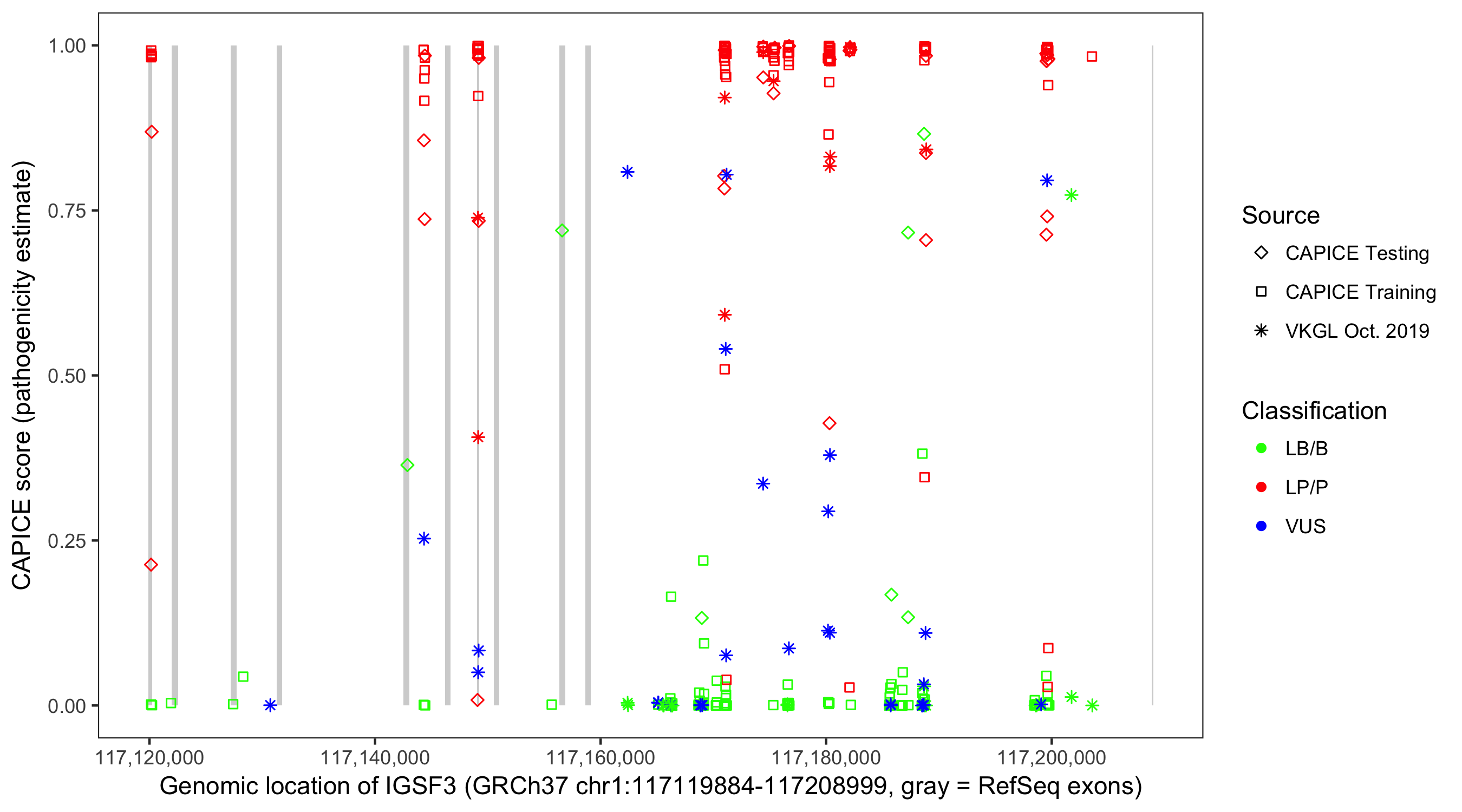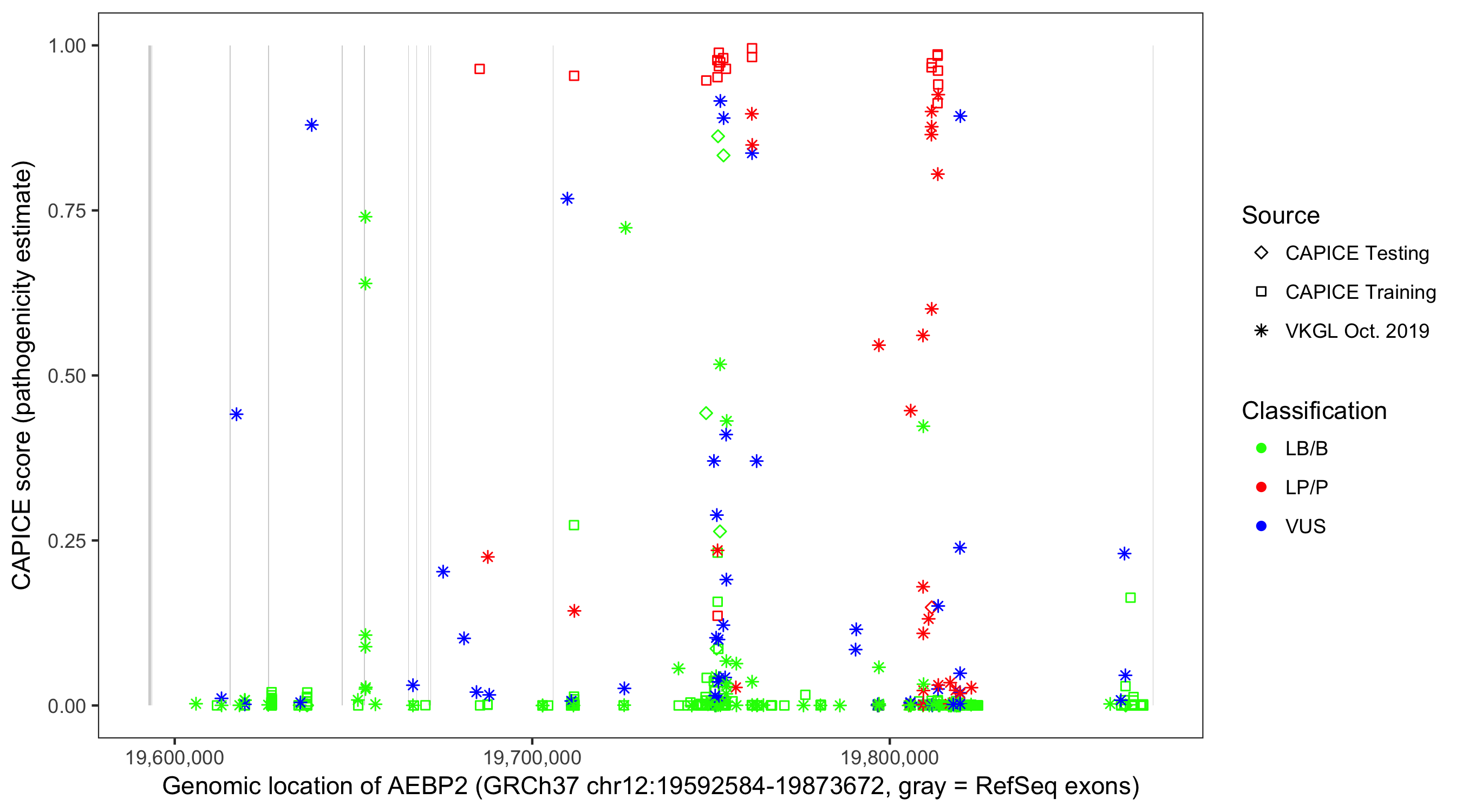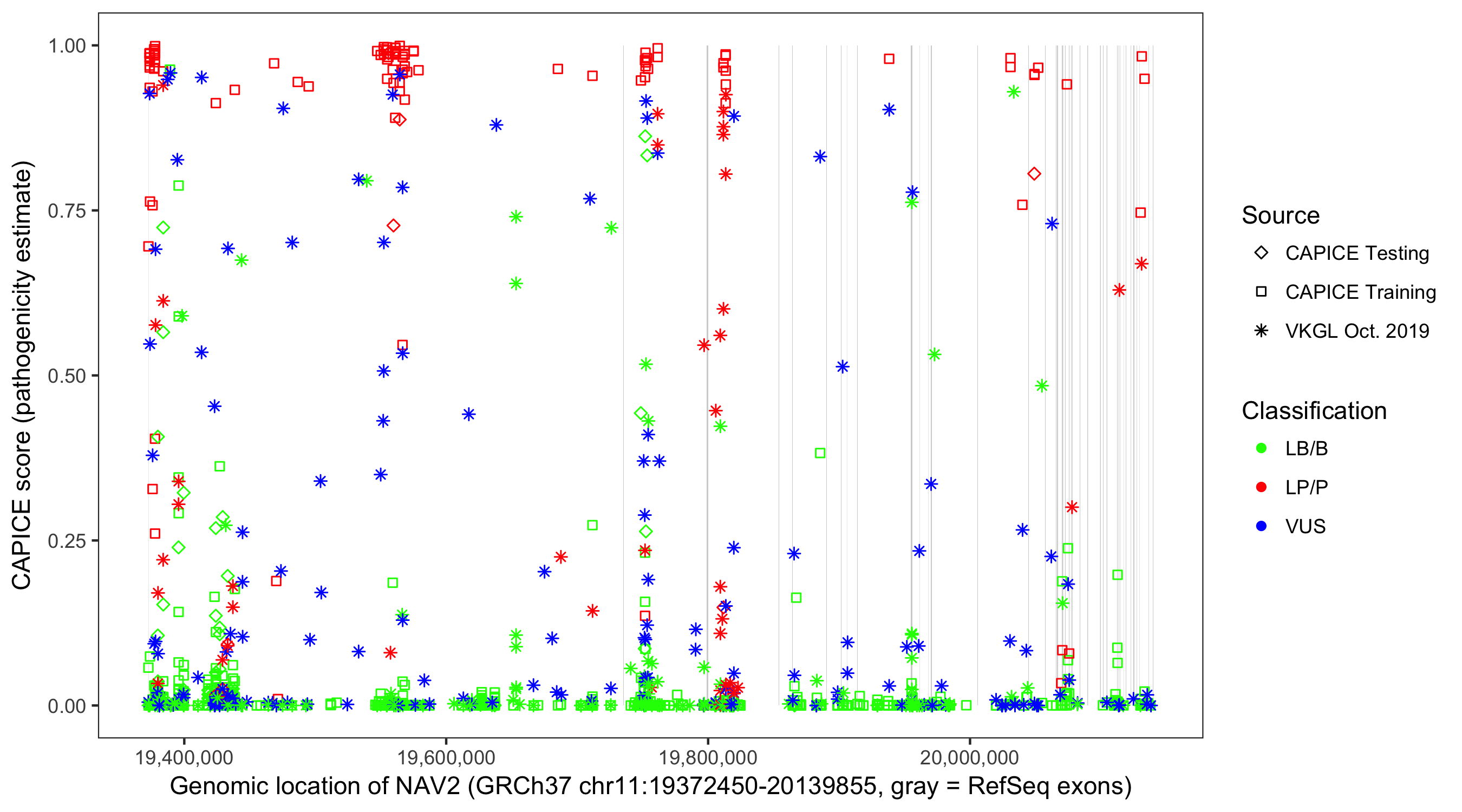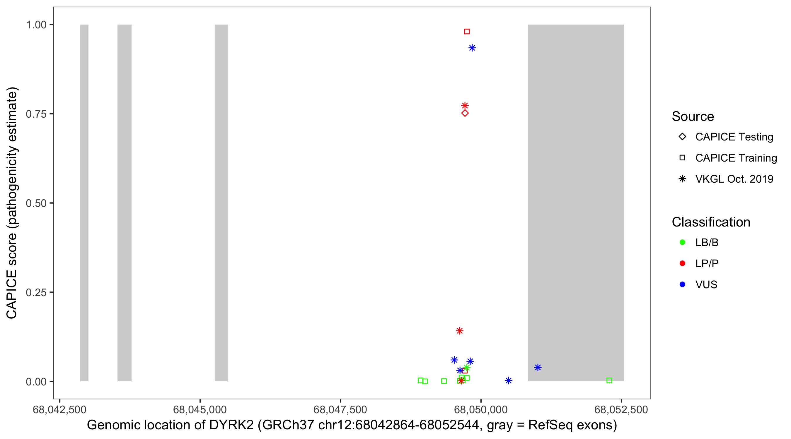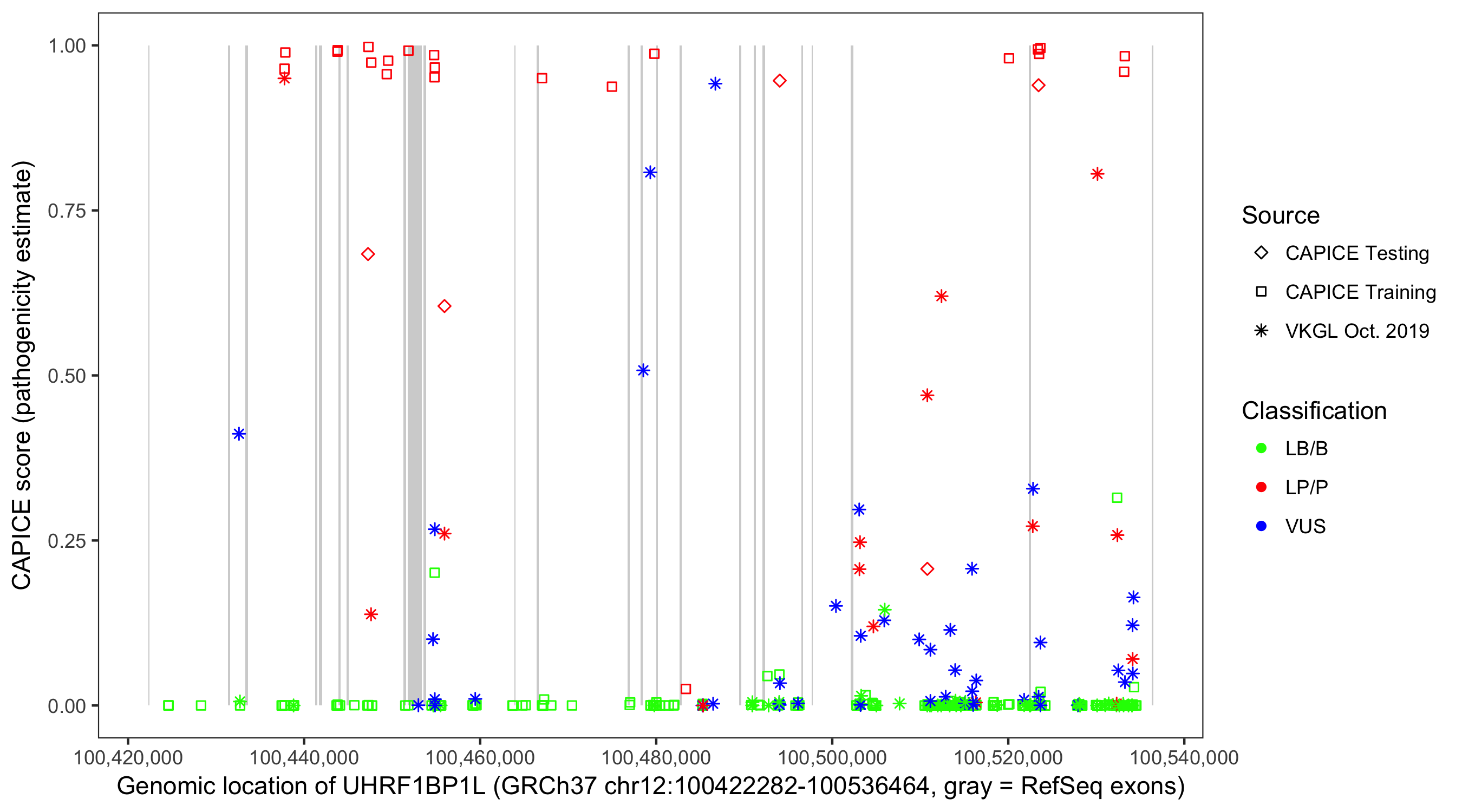 Shown are CAPICE train/test variants plus VKGL Oct 2019.