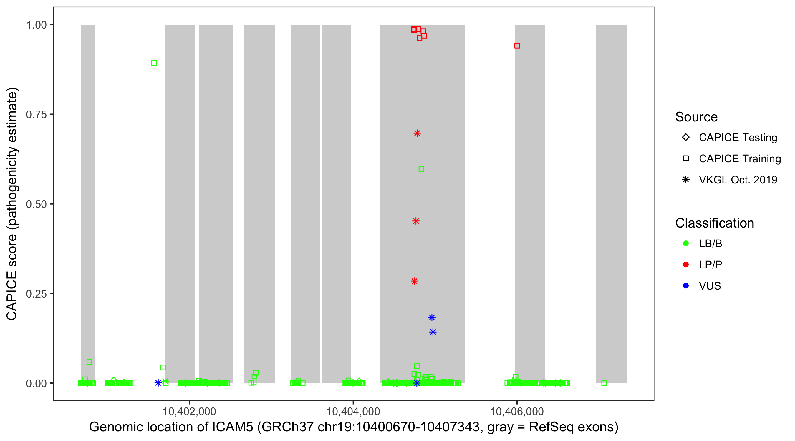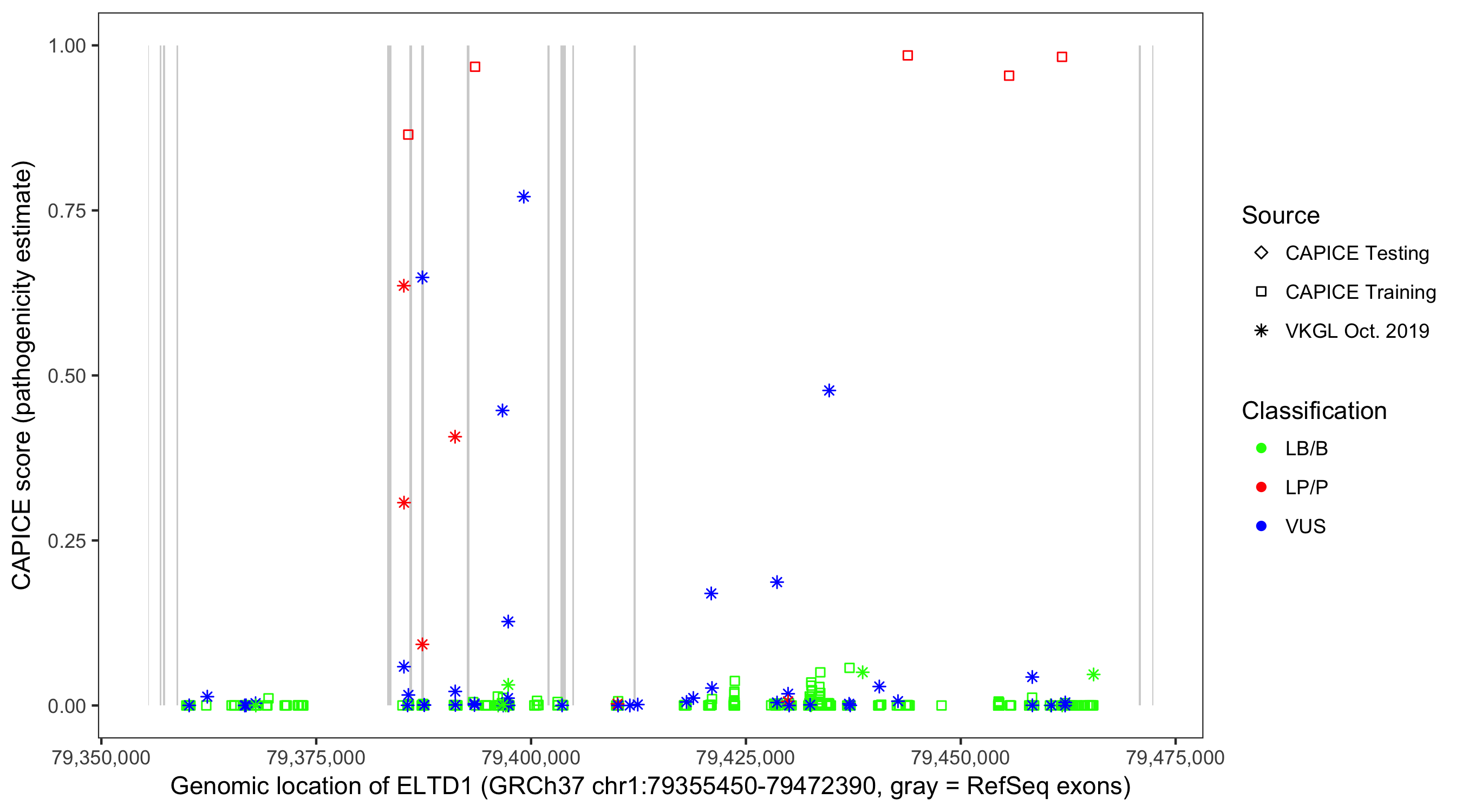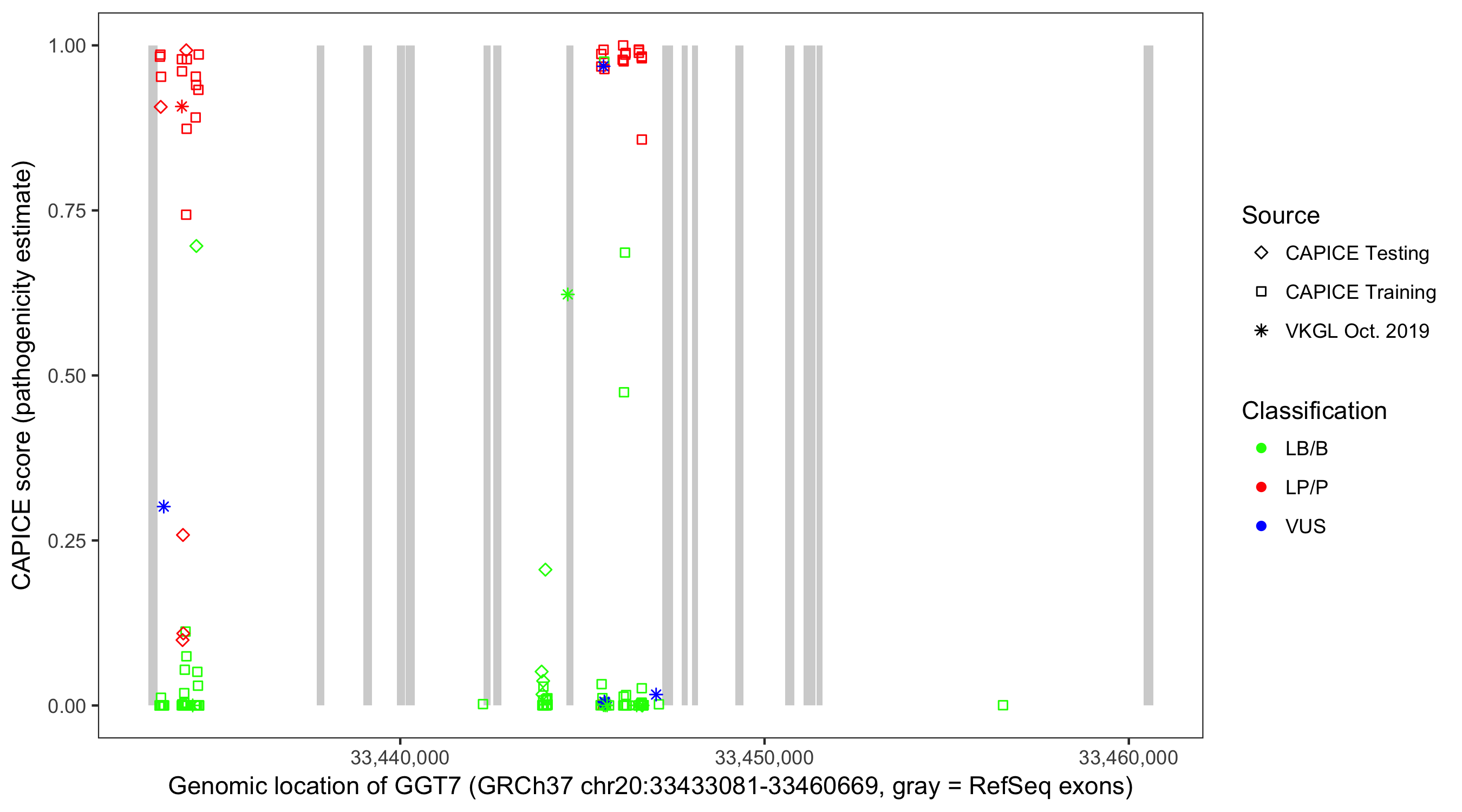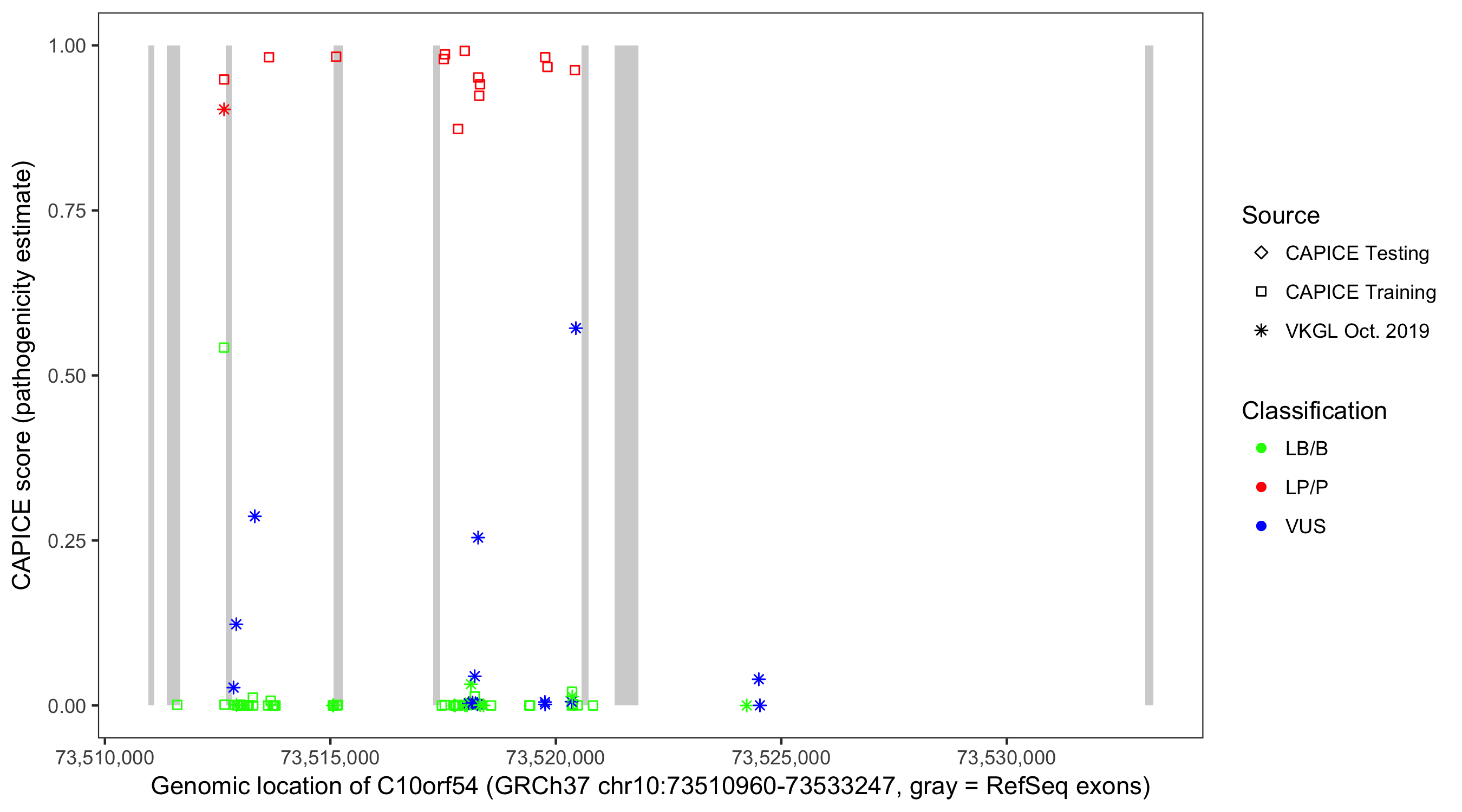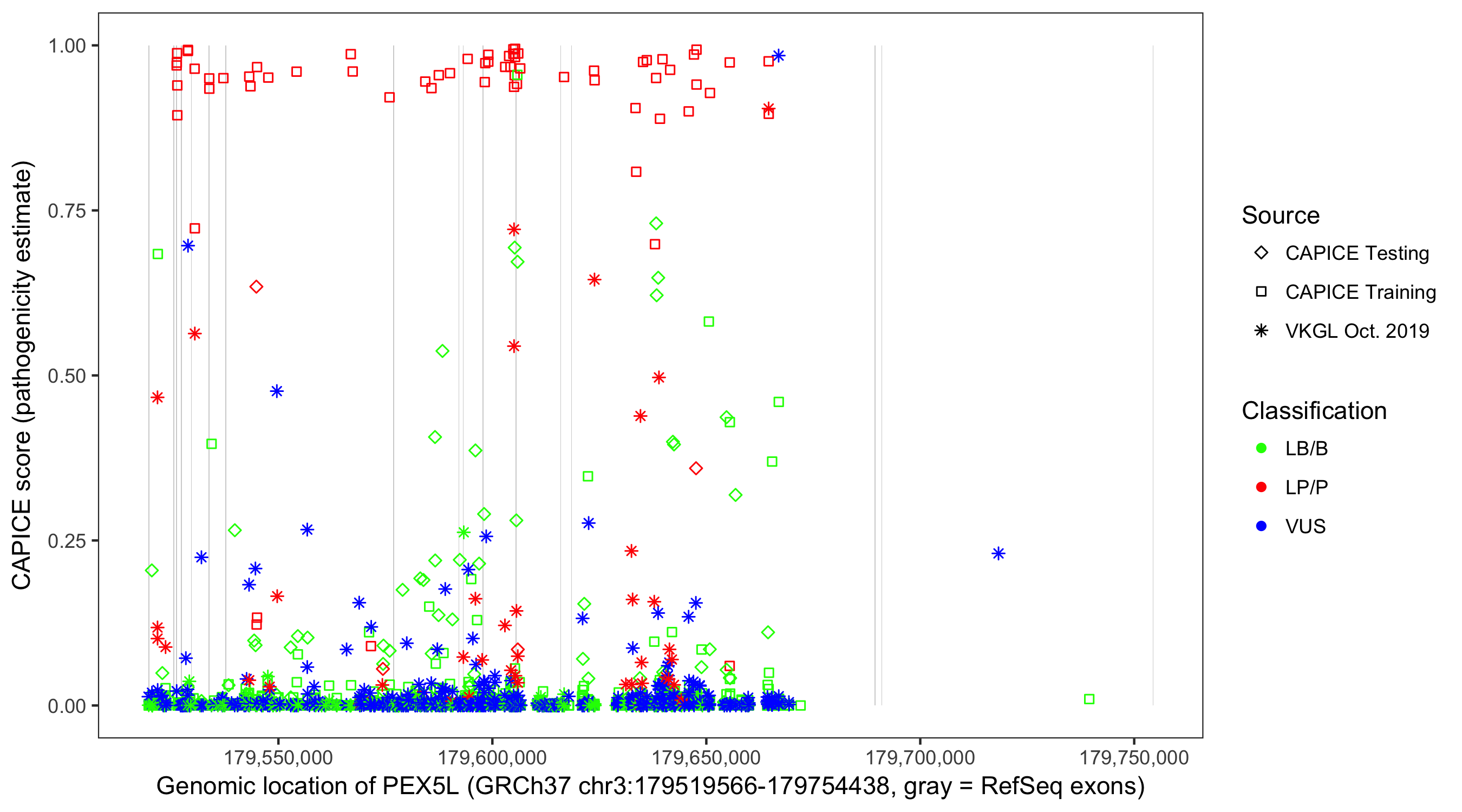Shown are CAPICE train/test variants plus VKGL Oct 2019.