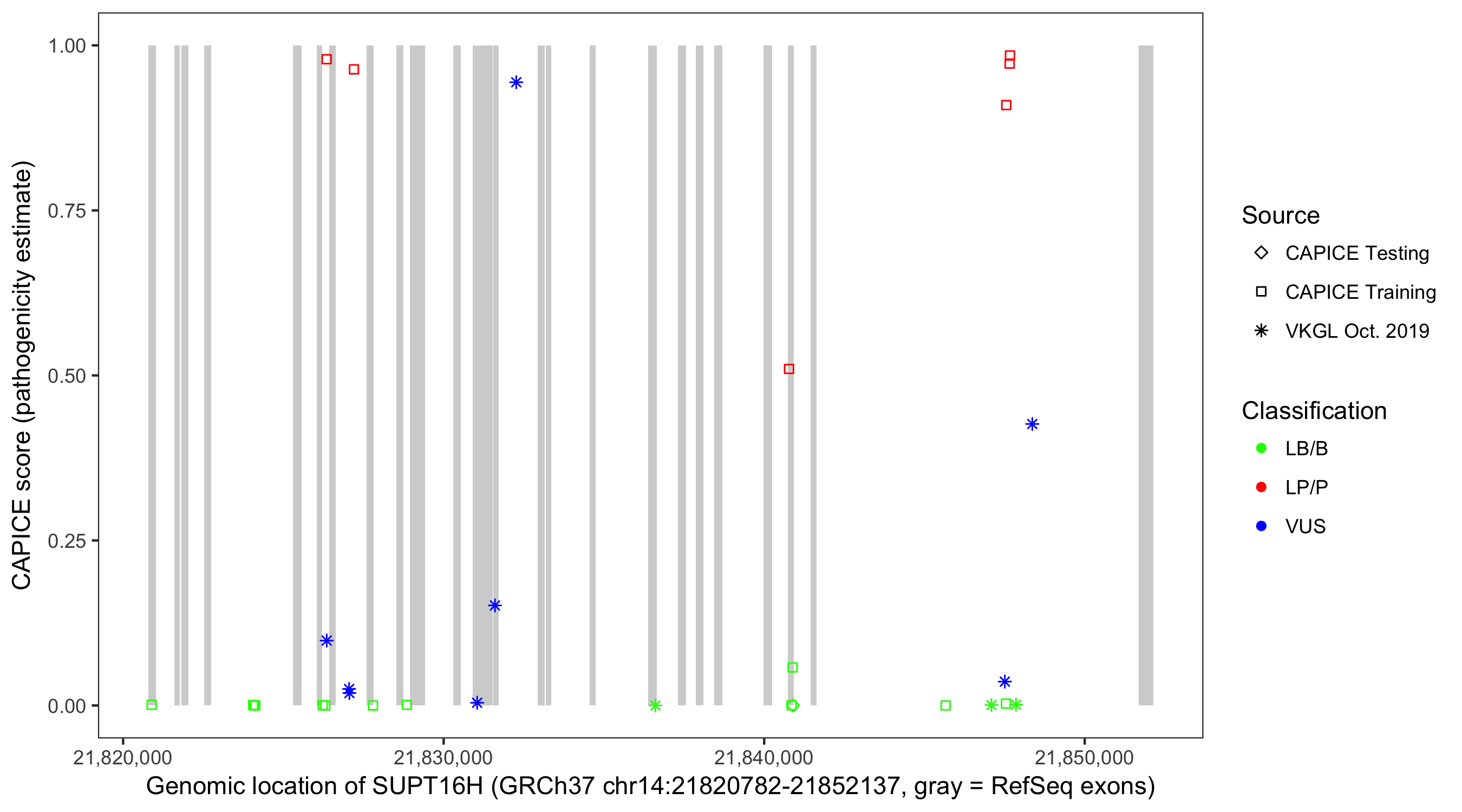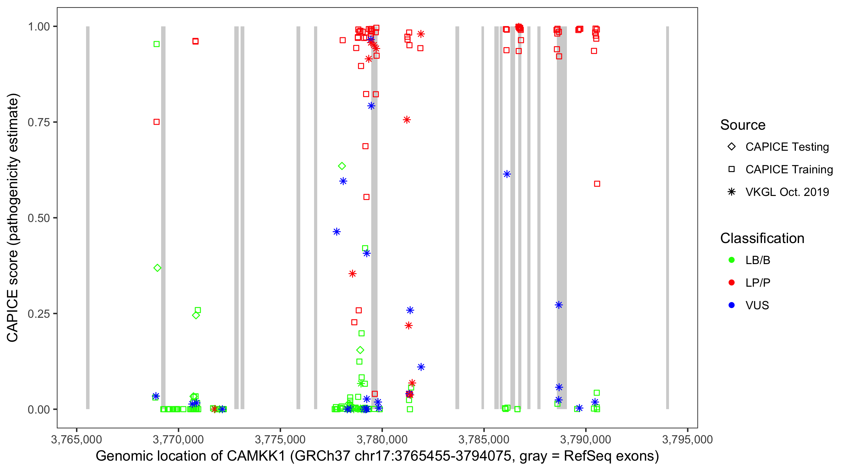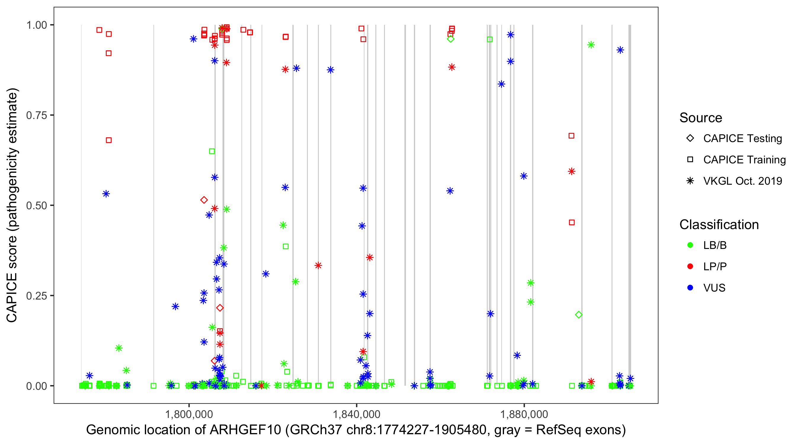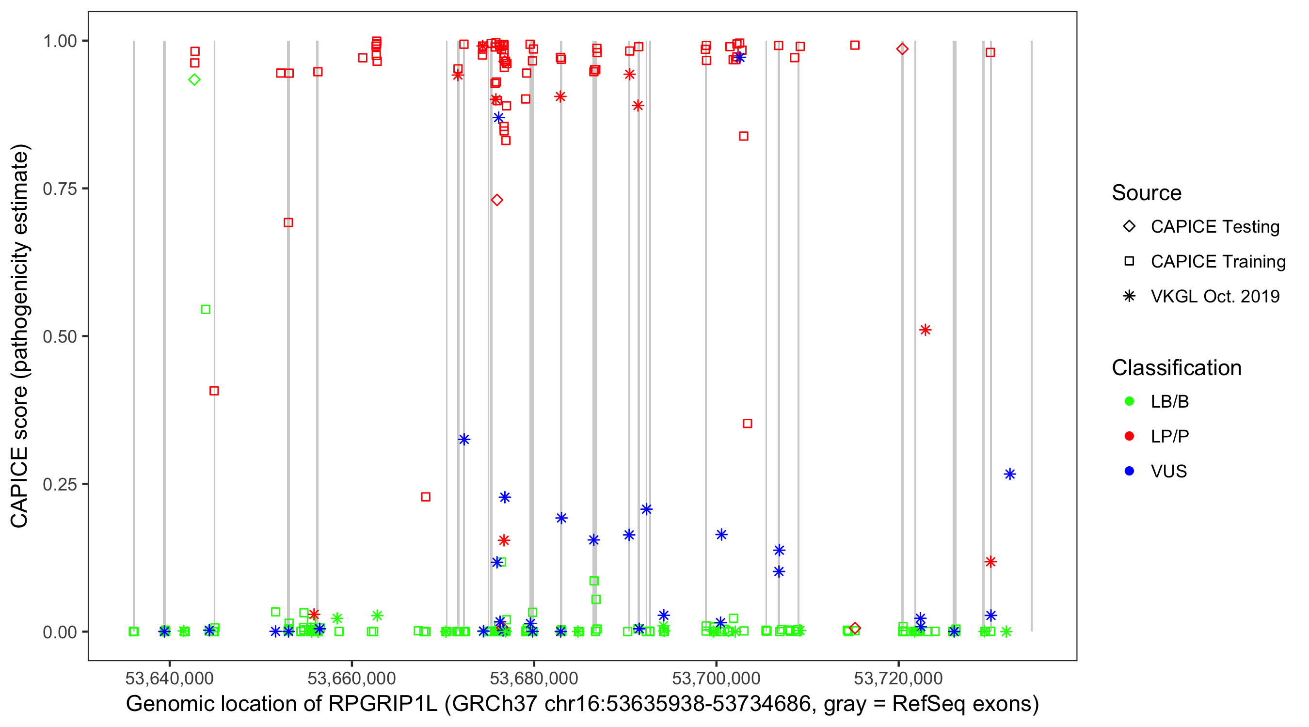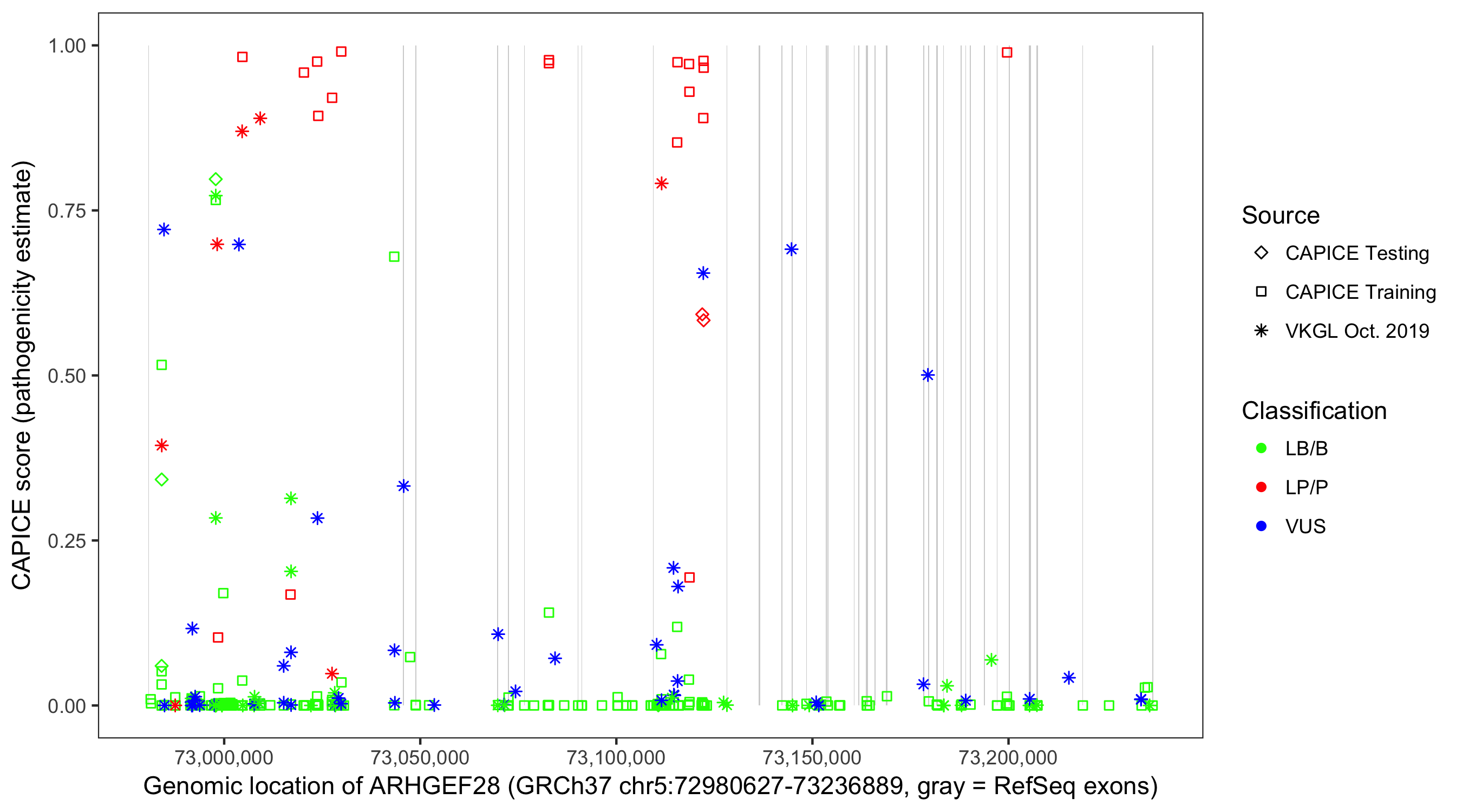 Shown are CAPICE train/test variants plus VKGL Oct 2019.