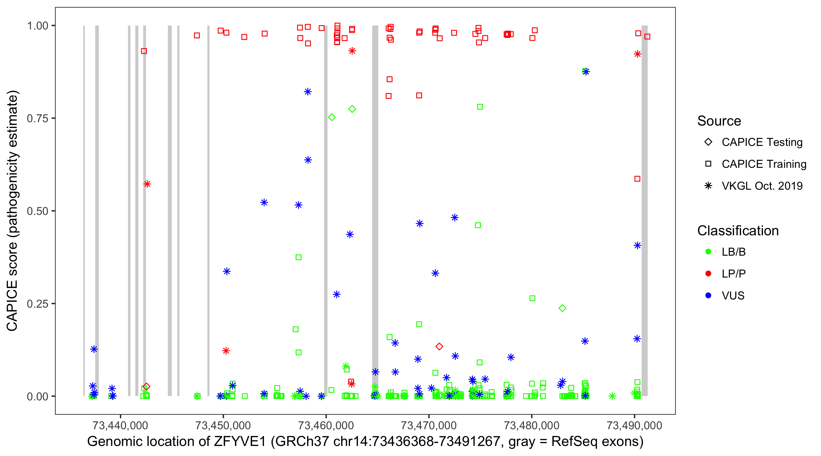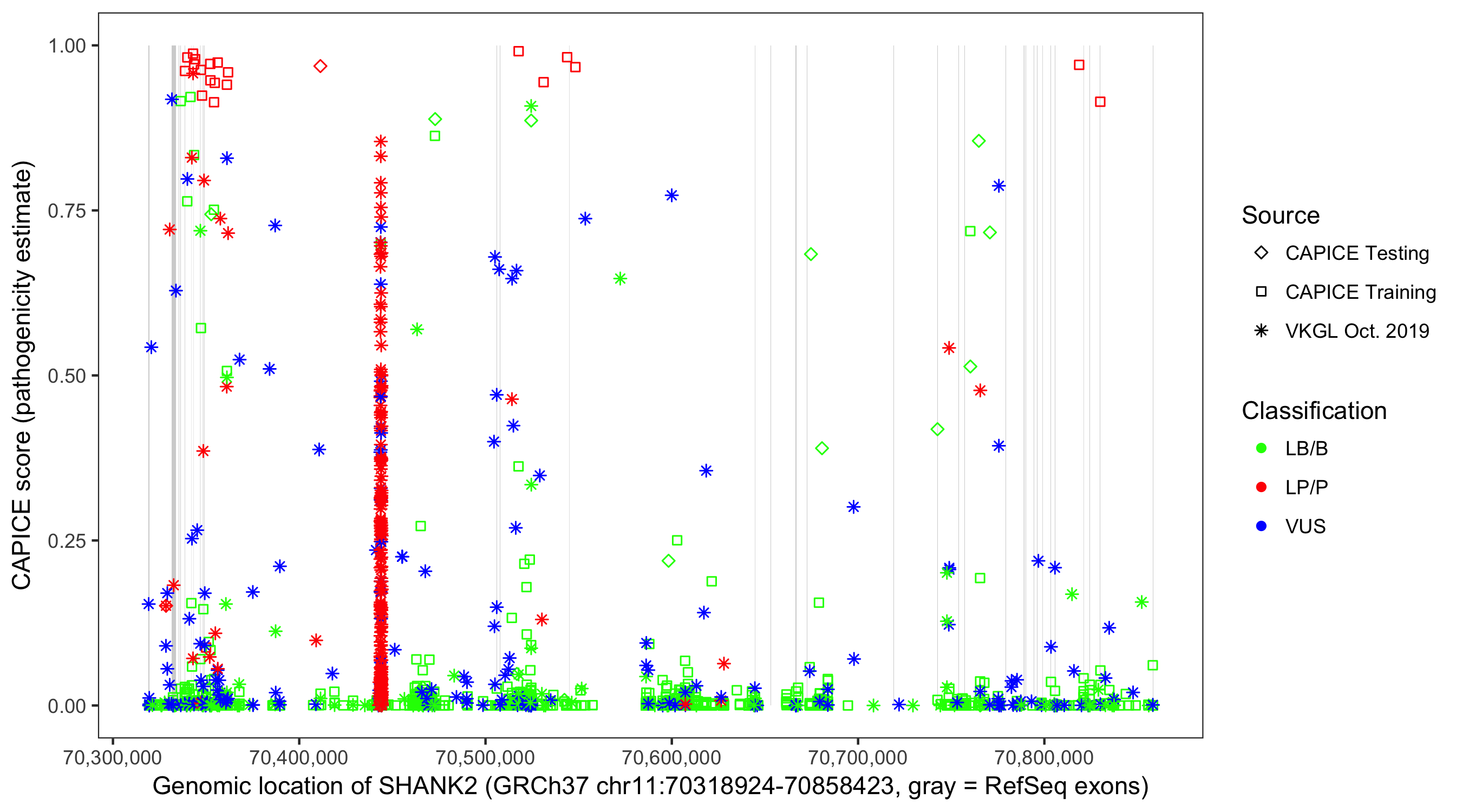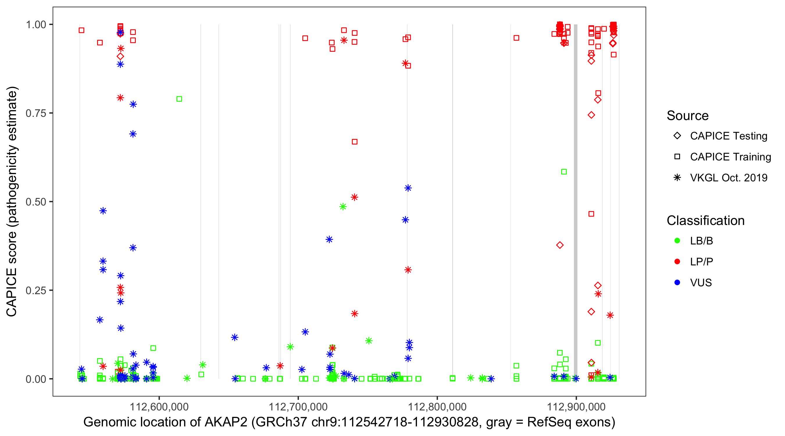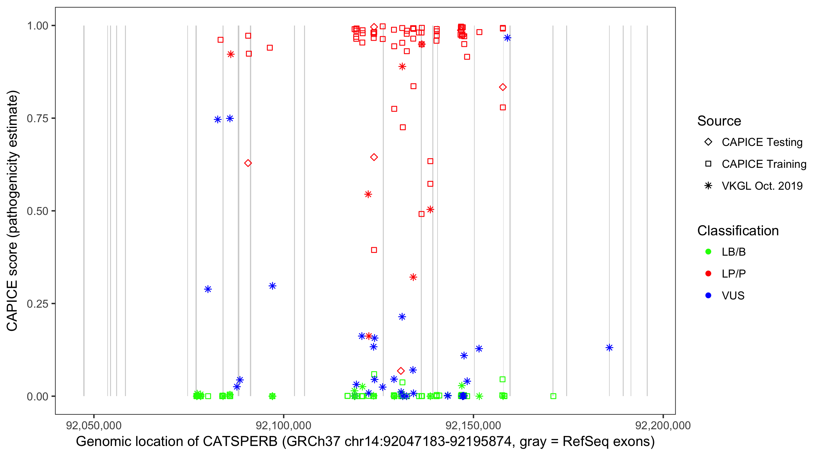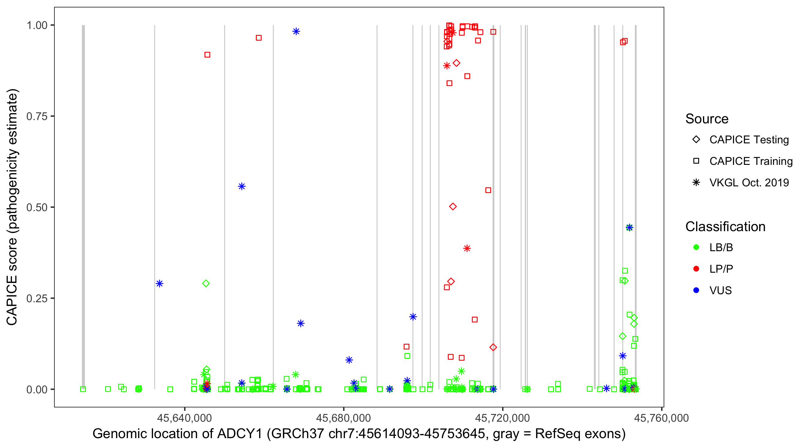 Shown are CAPICE train/test variants plus VKGL Oct 2019.