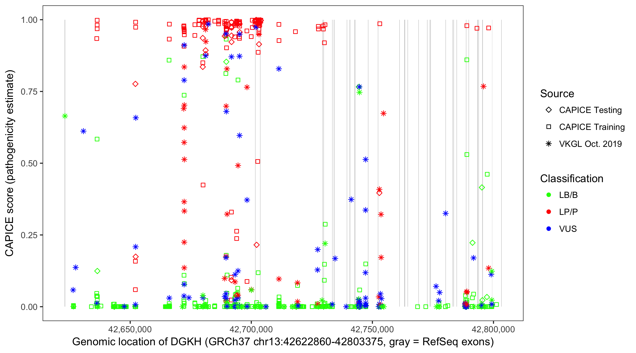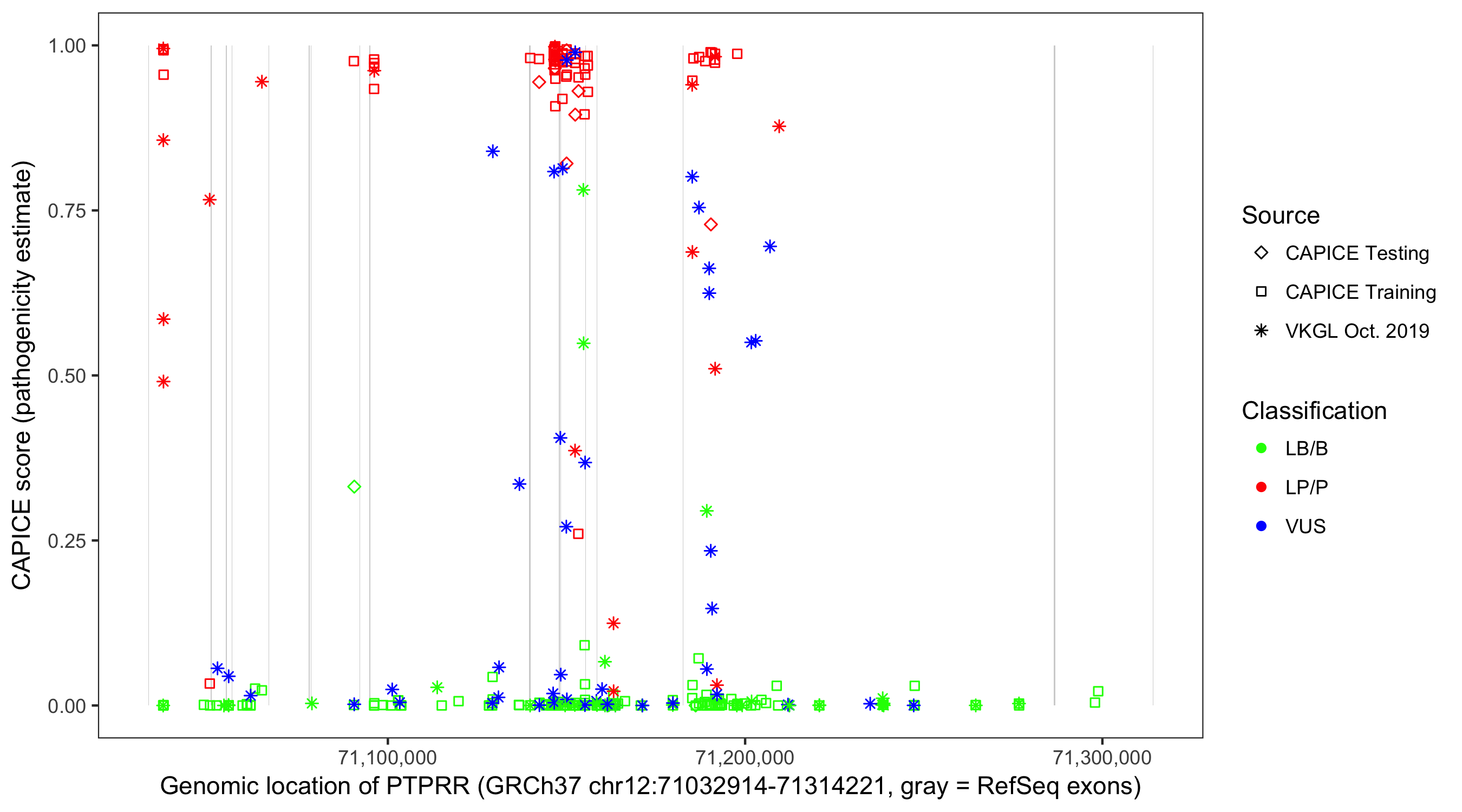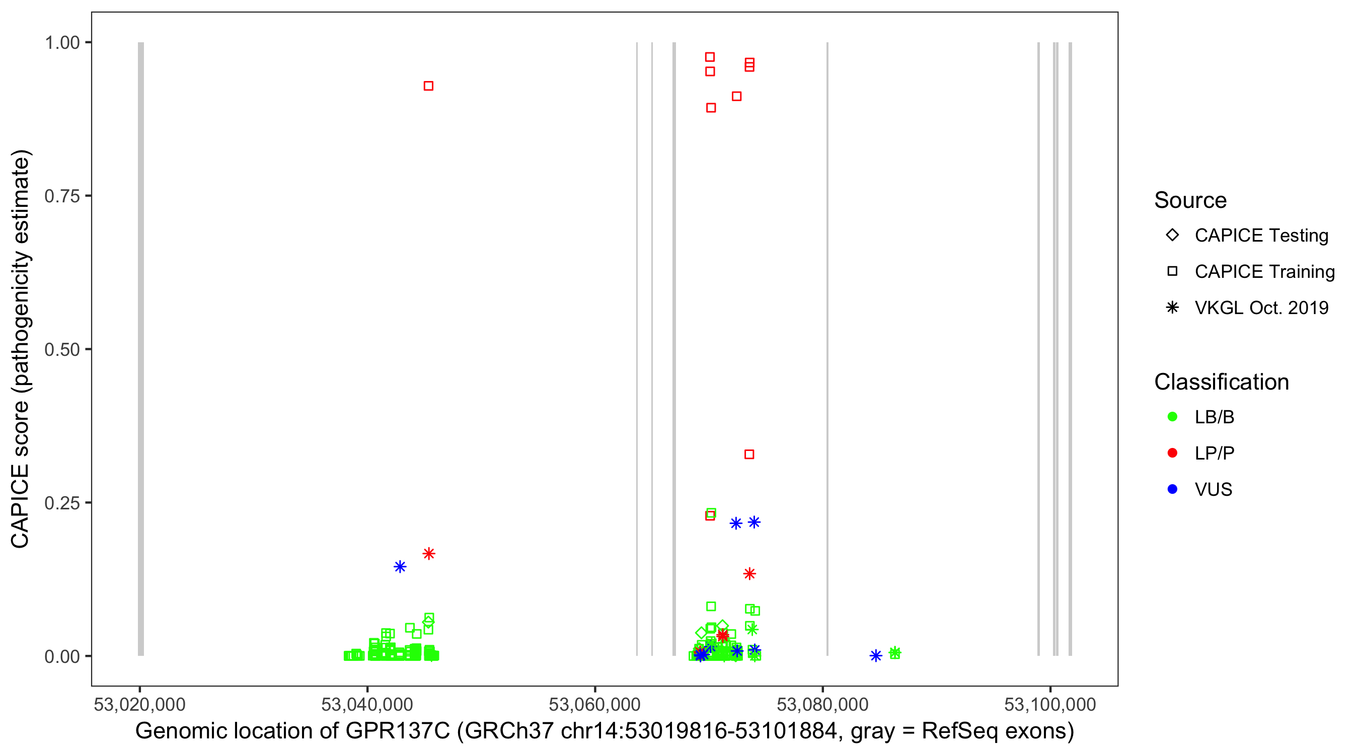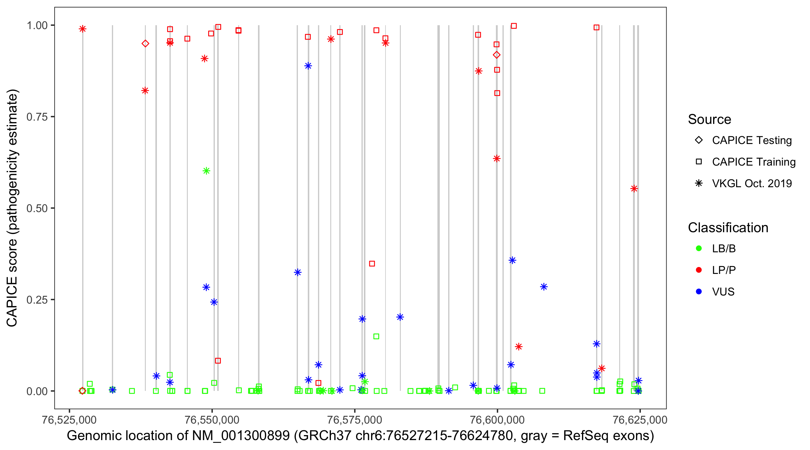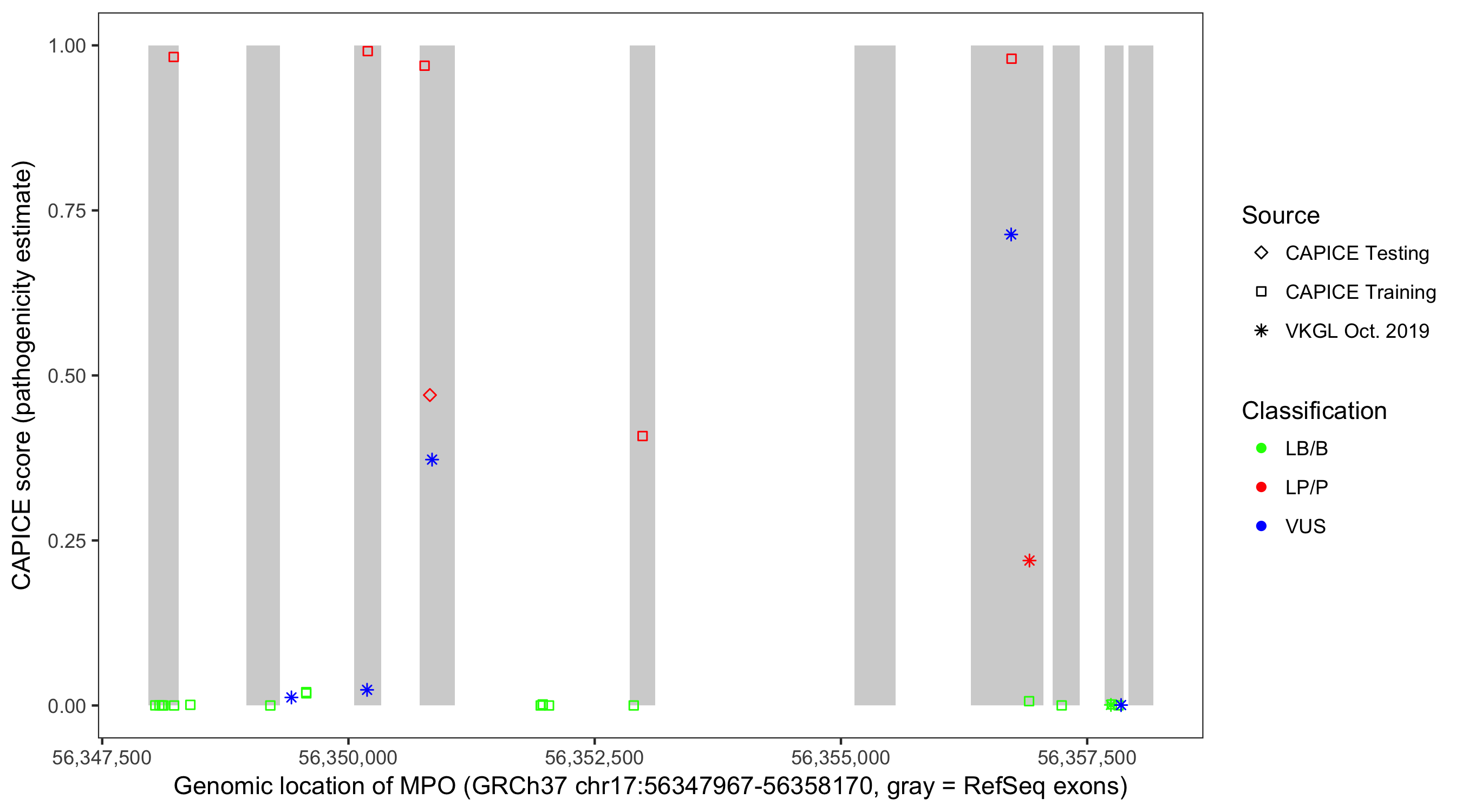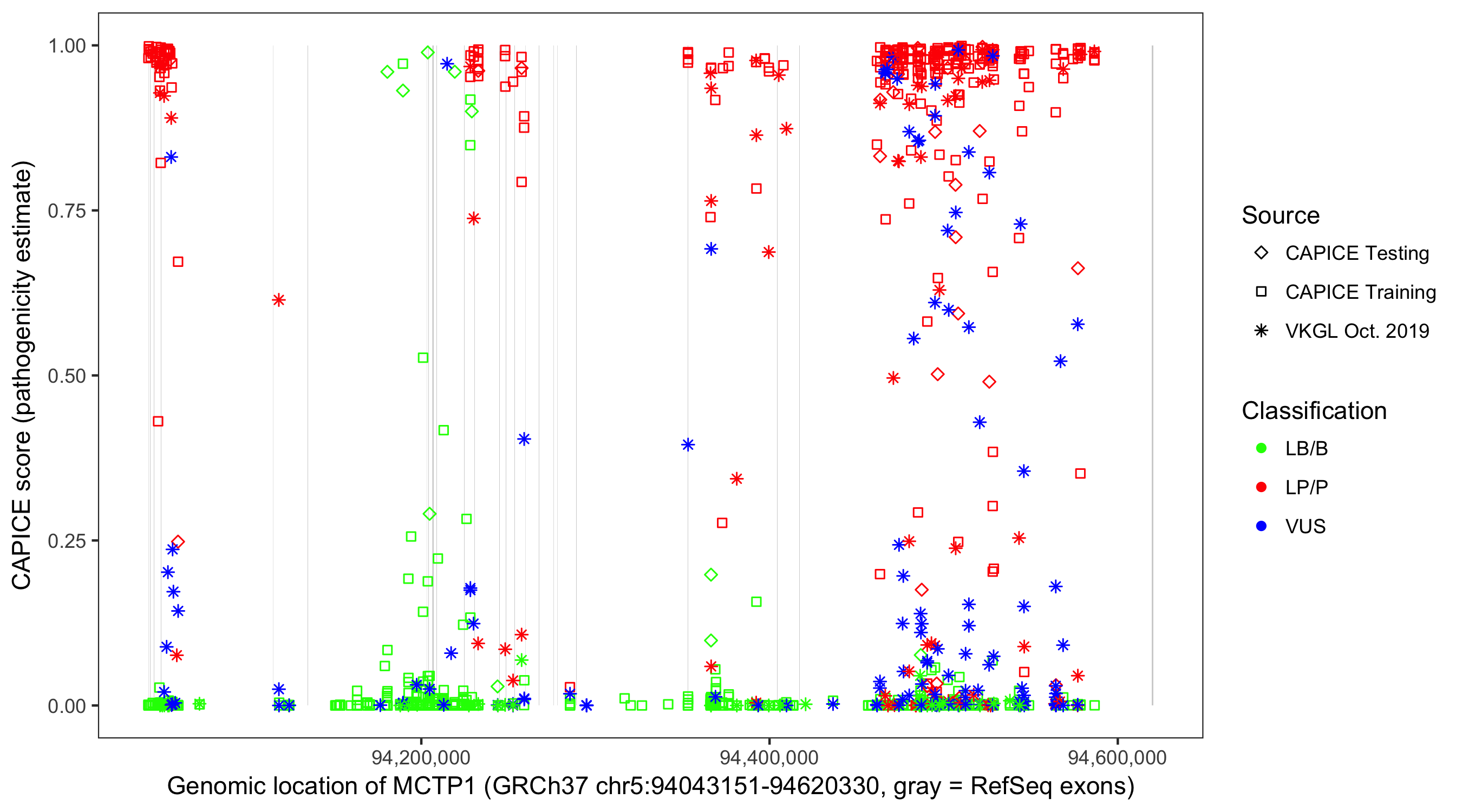 Shown are CAPICE train/test variants plus VKGL Oct 2019.